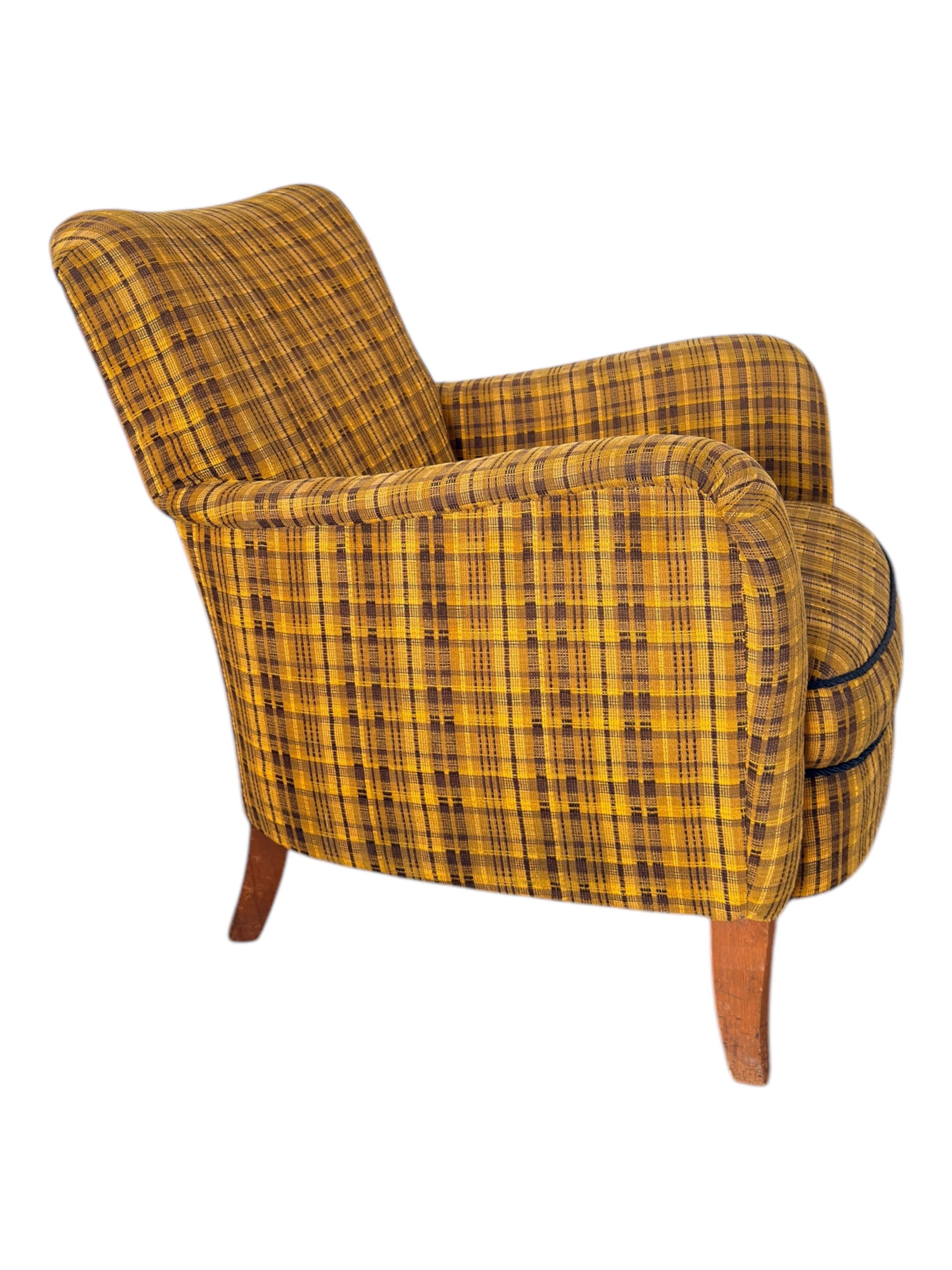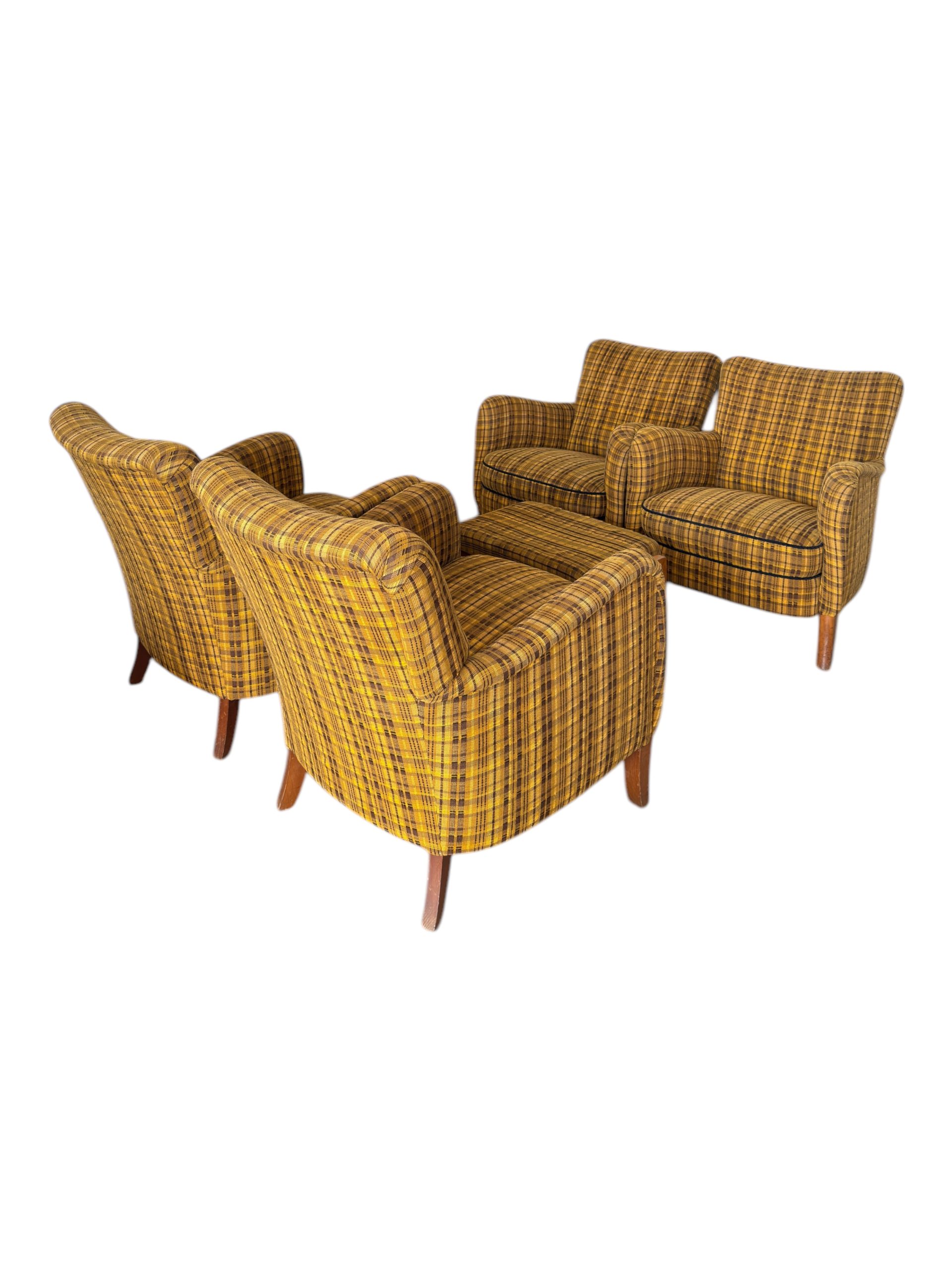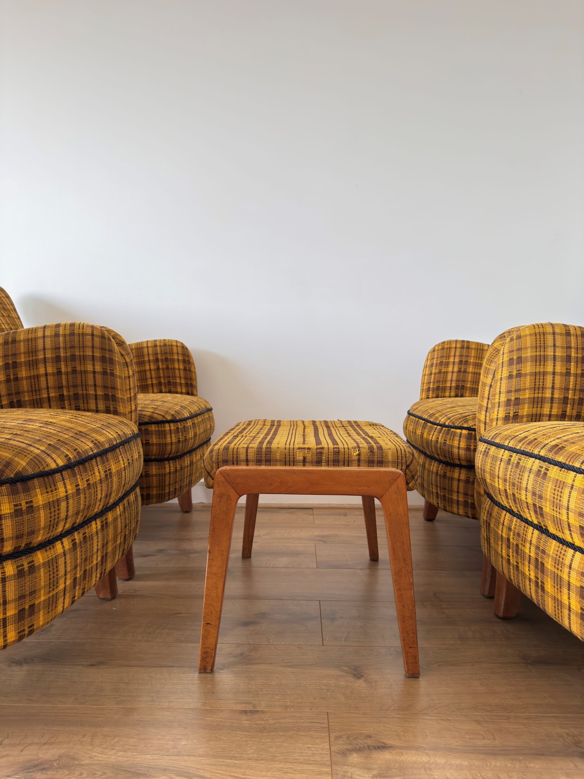 Produit venduVintage set produced in the 1950s by Möbelindustries Oelsa. Includes four generously sized armchairs and a matching ottoman from the Rabeneau PS 28 line. Upholstered in yellow-brown tartan with black piping and set on beech wood frames.