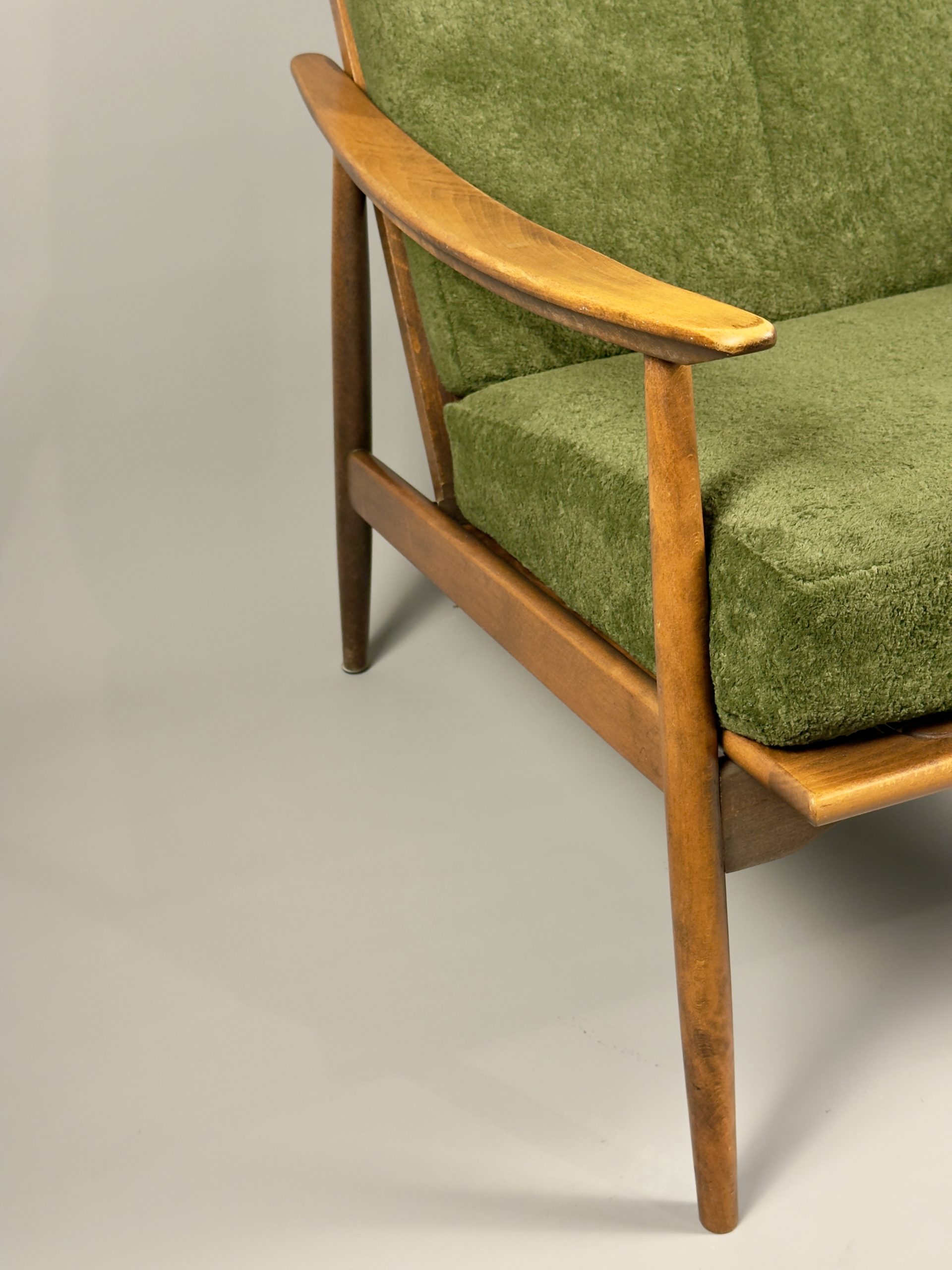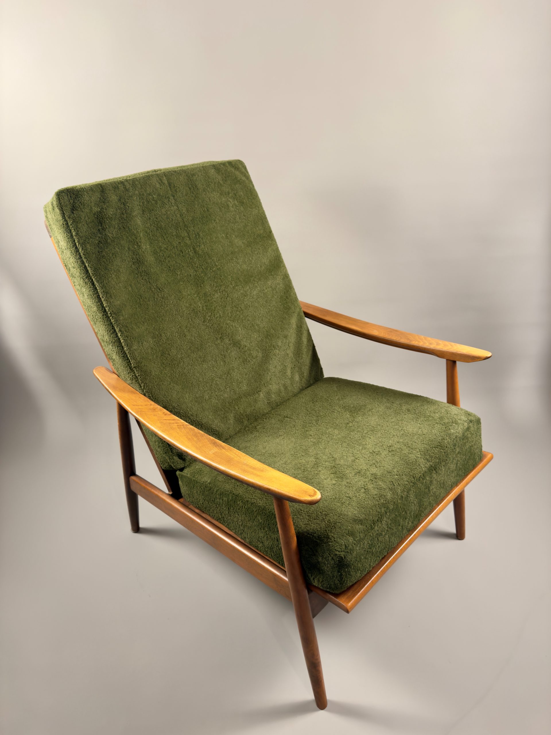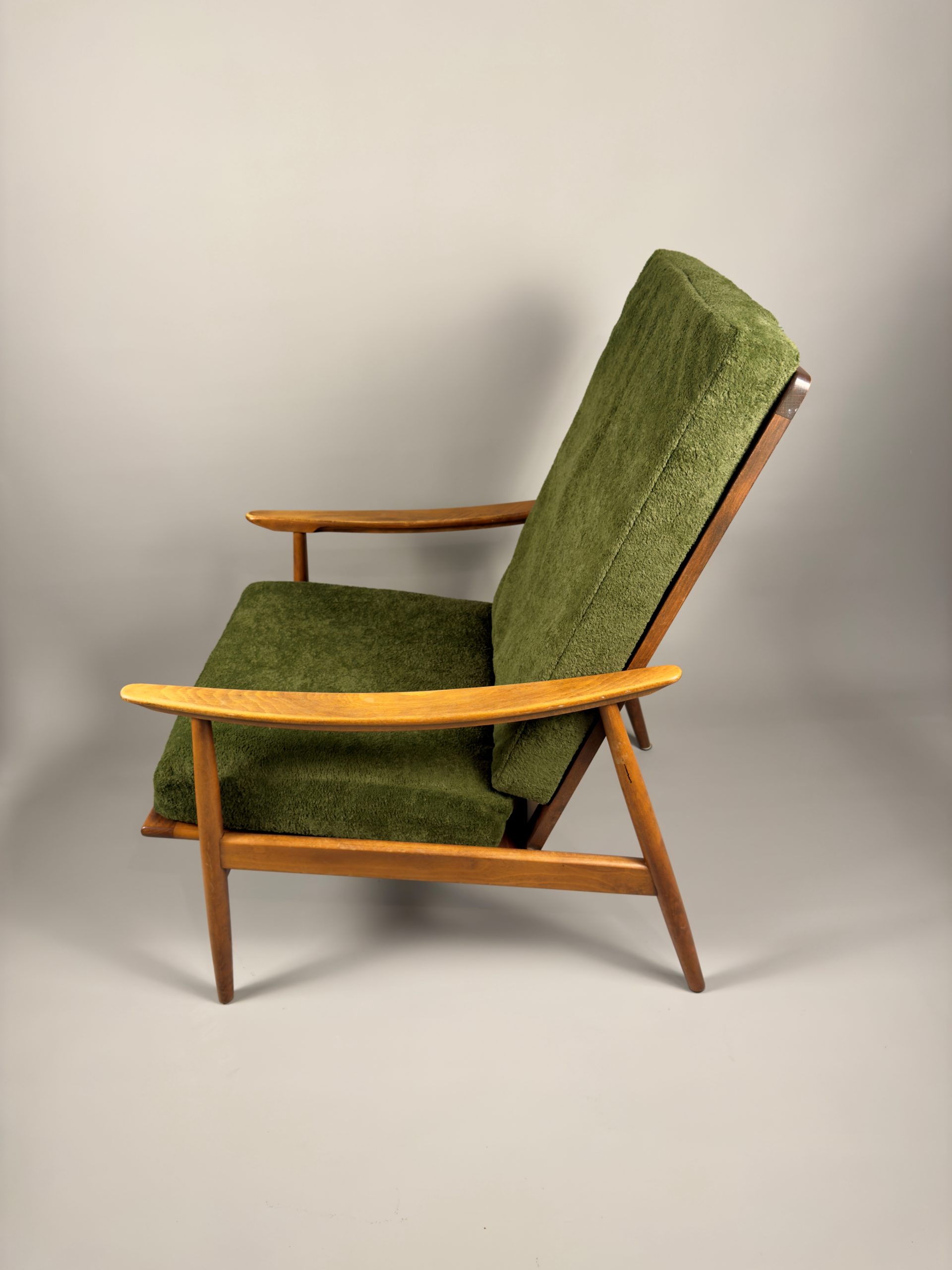 A vintage Scandinavian lounge chair featuring a warm beech wood frame and newly upholstered green fabric. With its minimal lines and gently reclined back, it captures the essence of Nordic comfort.