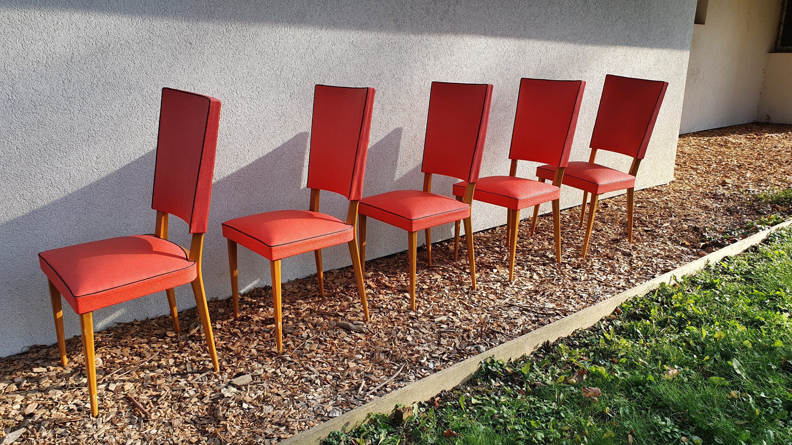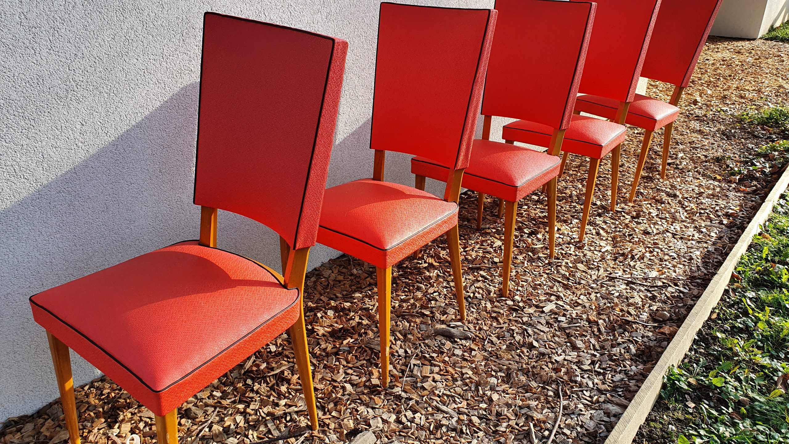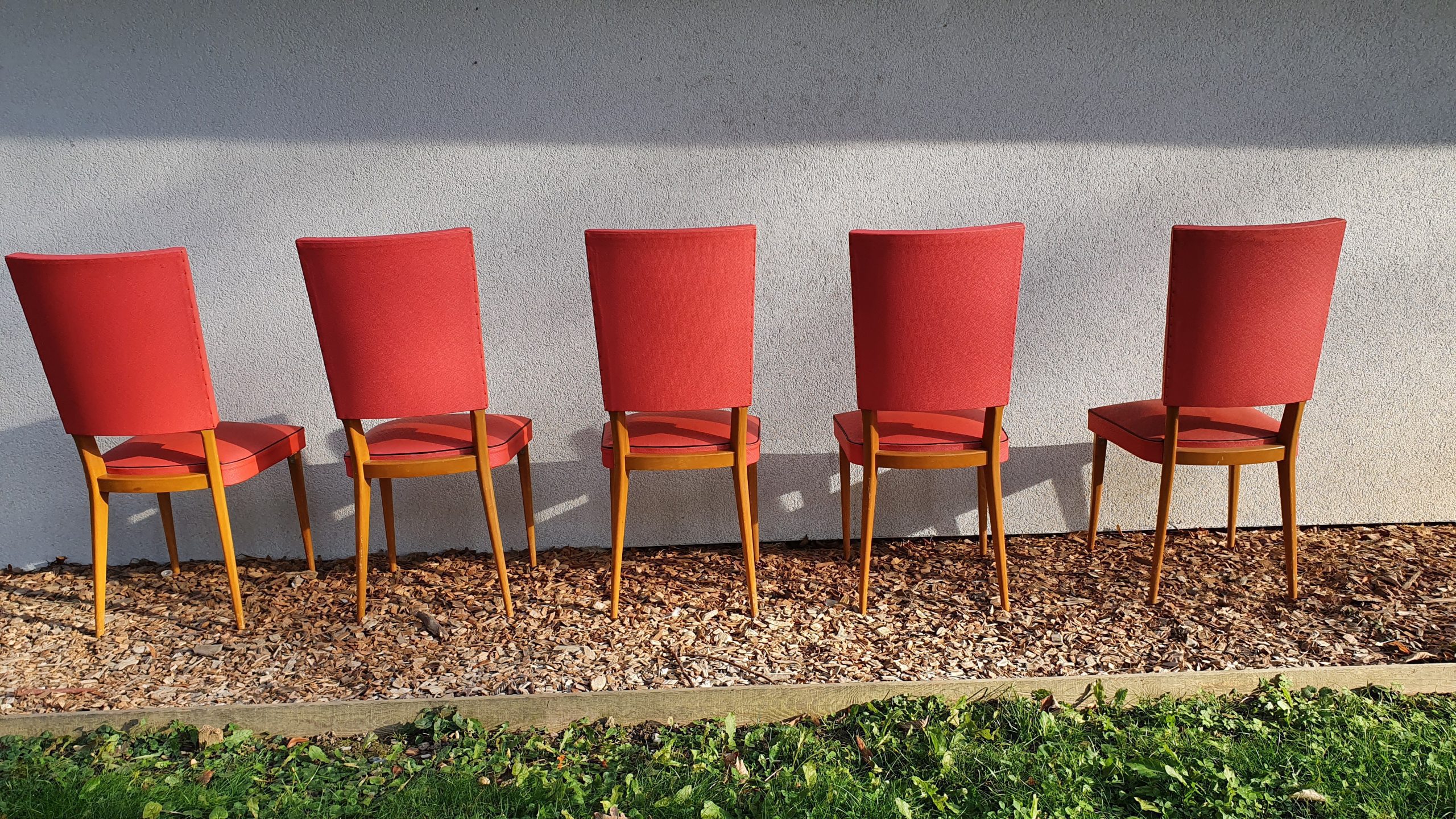 Produit vendu5 Chaises en skai rose, années 60, qui se trouvaient dans un bistrot de la région nyonnaise. Skai rose, dessous en tissus, pieds compas en bois, quelques marques de leur vie dans un lieu public. Bon état général.
