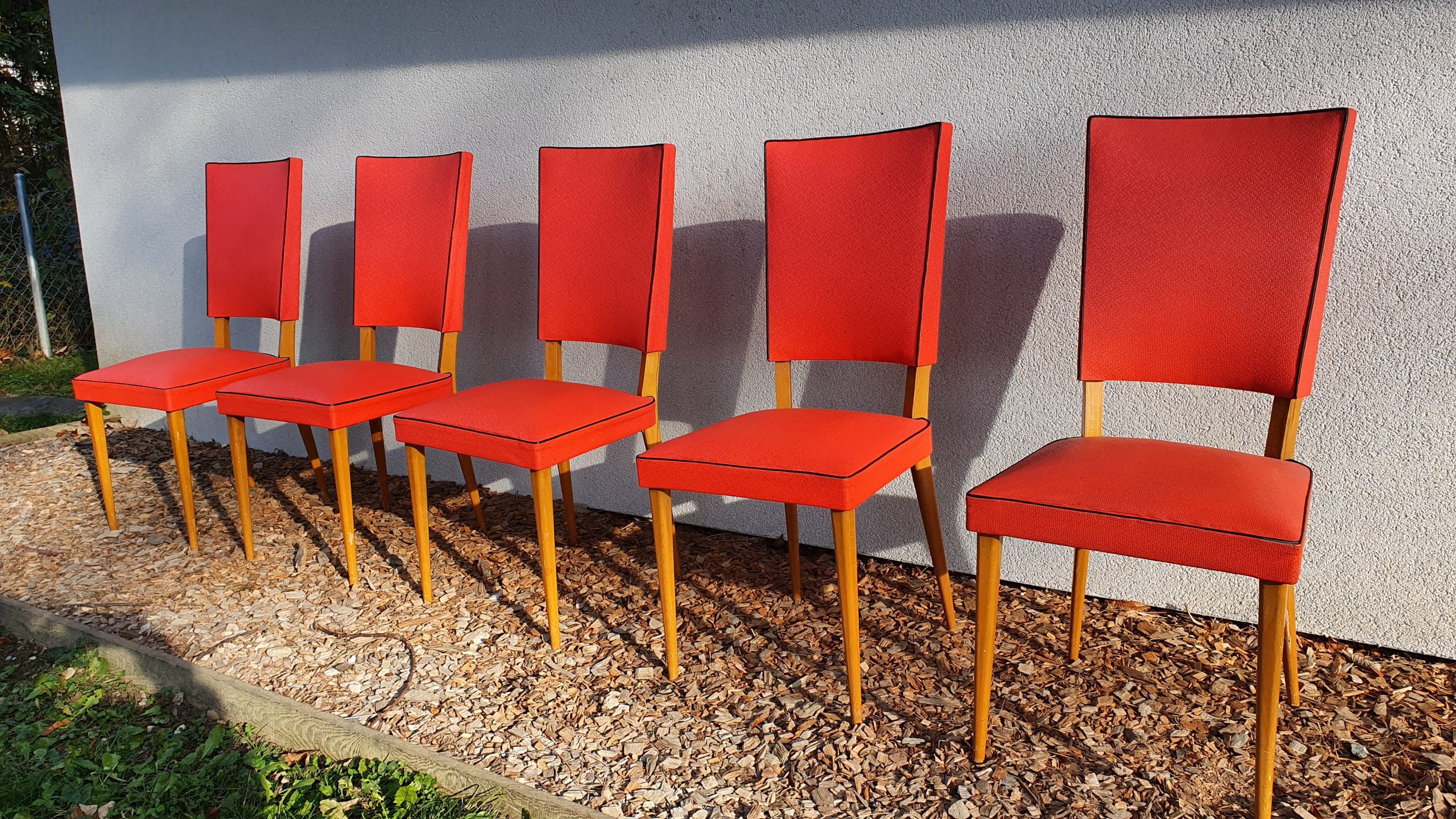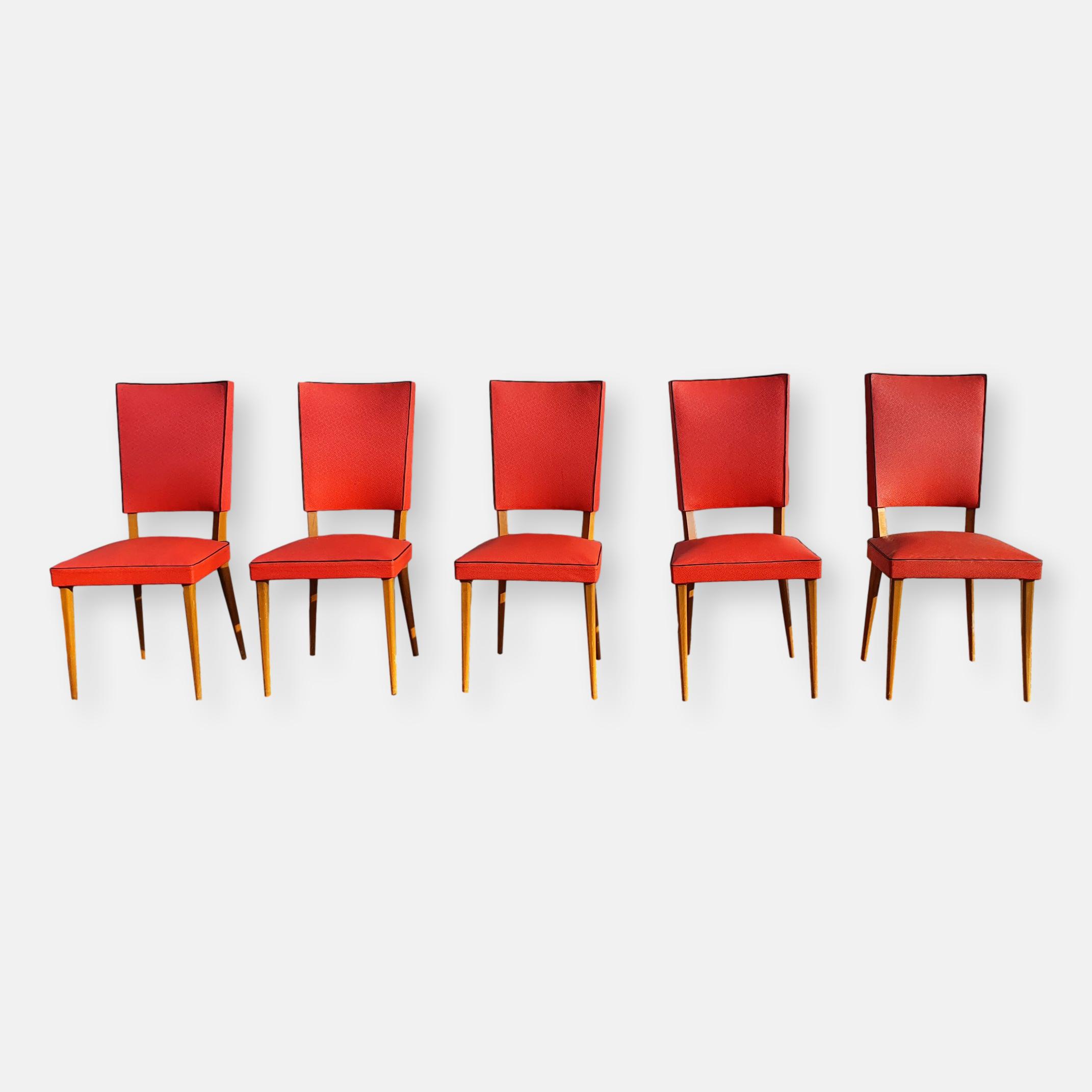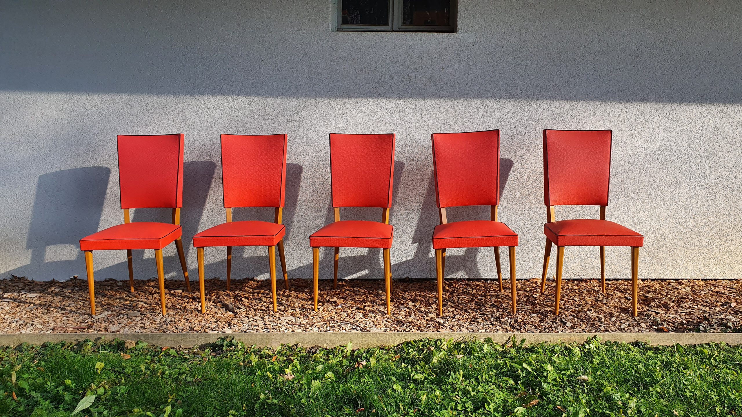 Produit vendu5 Chaises en skai rose, années 60, qui se trouvaient dans un bistrot de la région nyonnaise. Skai rose, dessous en tissus, pieds compas en bois, quelques marques de leur vie dans un lieu public. Bon état général.