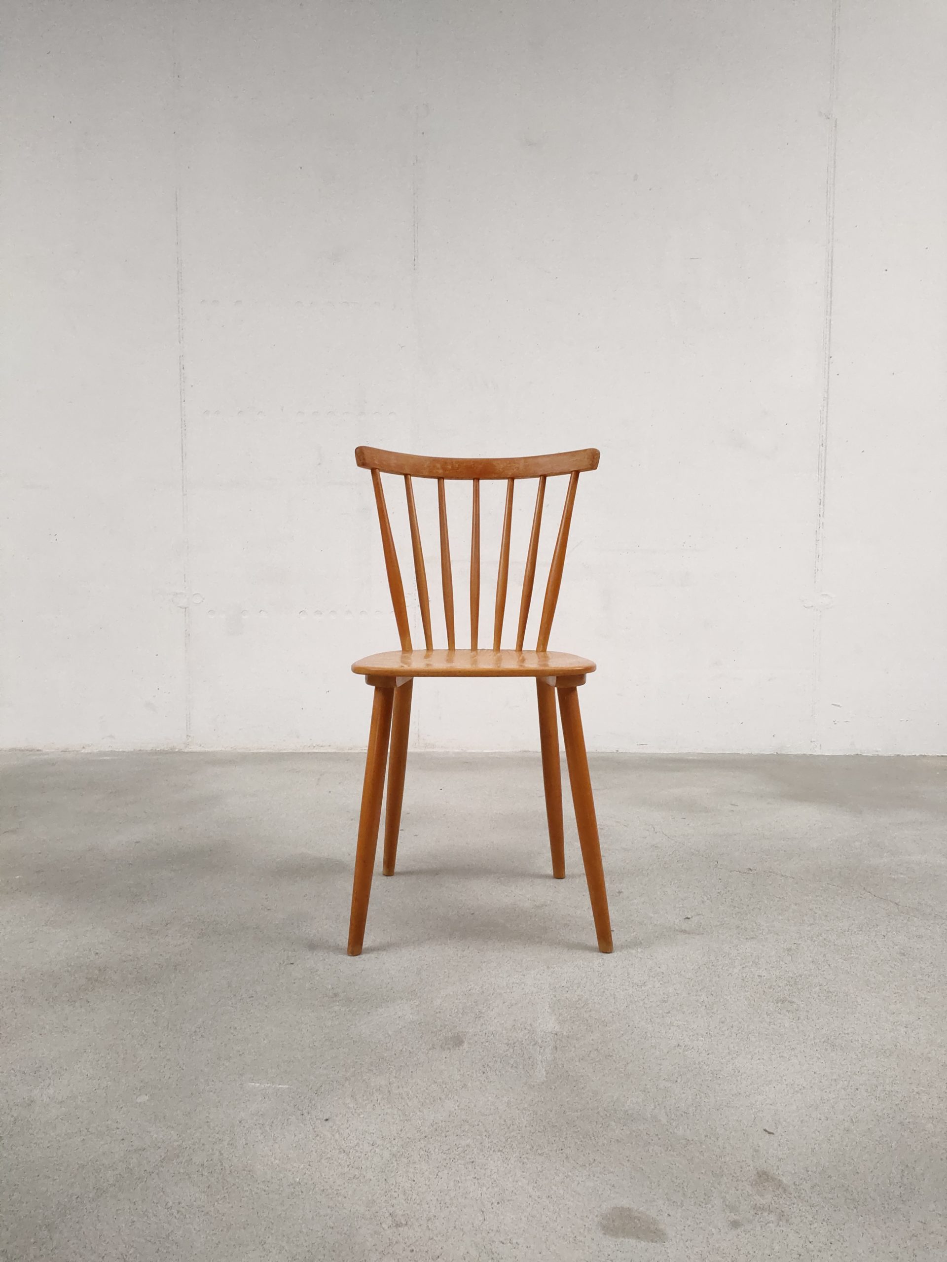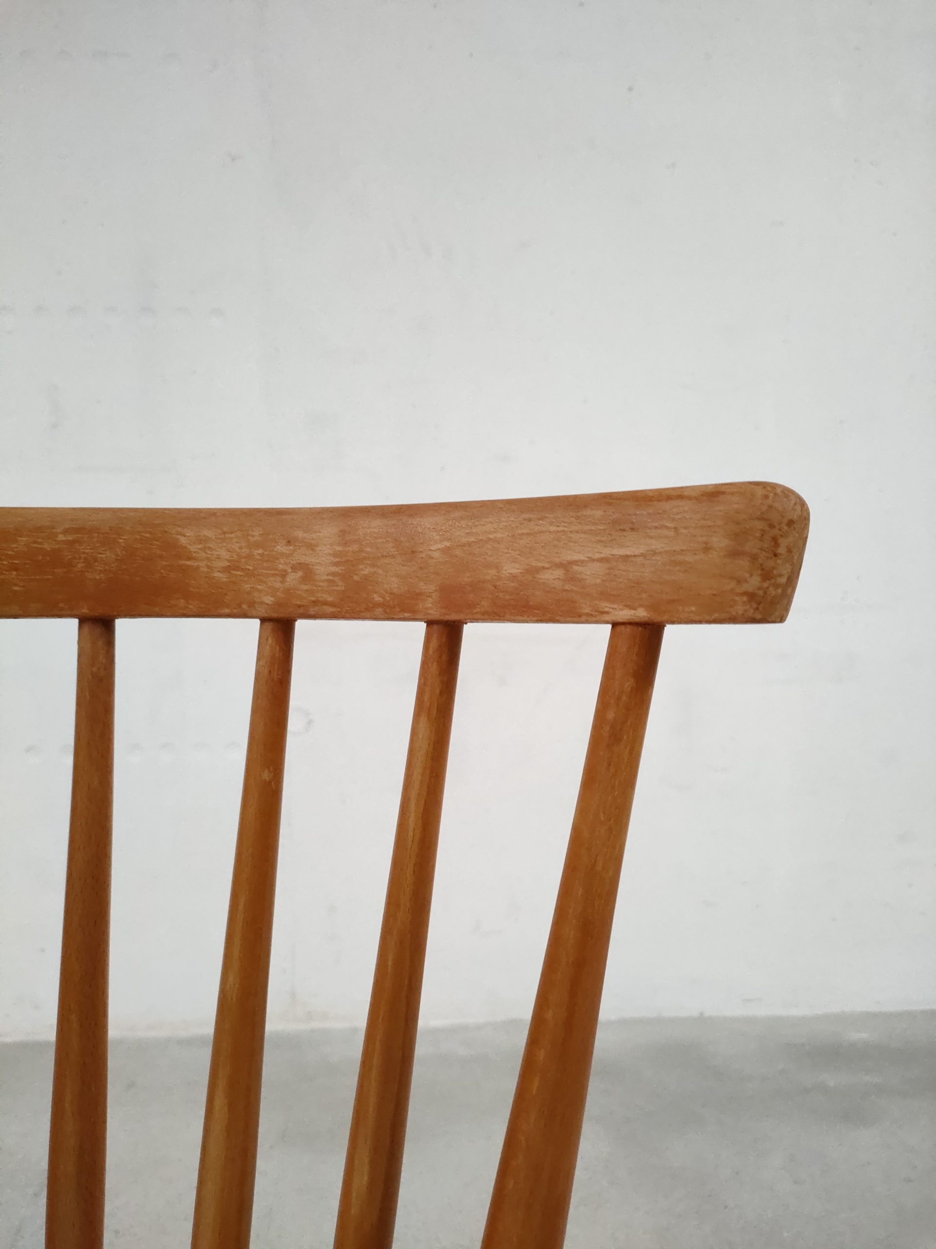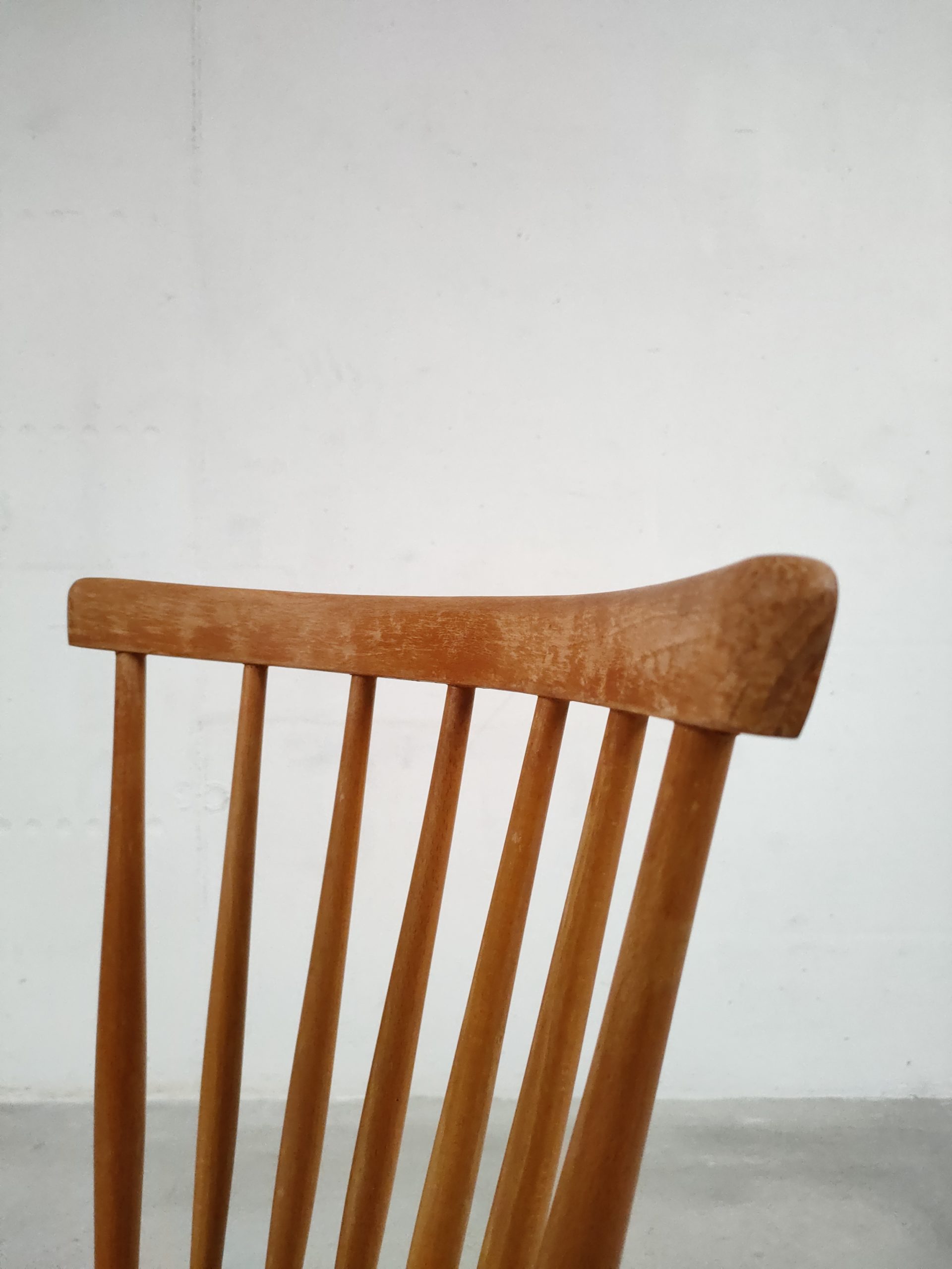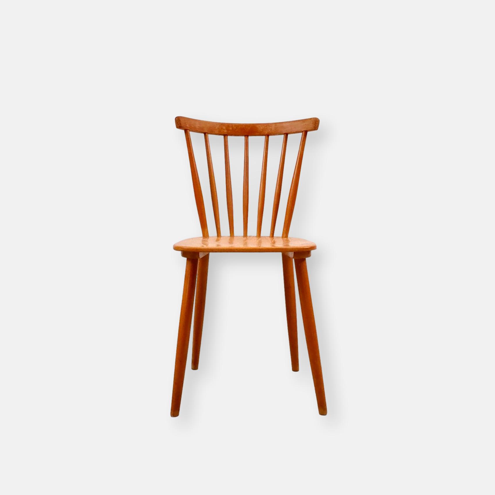 Produit venduChaise à barreaux vintage en bois avec des traces d’usure en particulier sur la partie supérieure du dossier et sur l’assise. La chaise est stable et solide. Hauteur de l’assise: 45 cm.