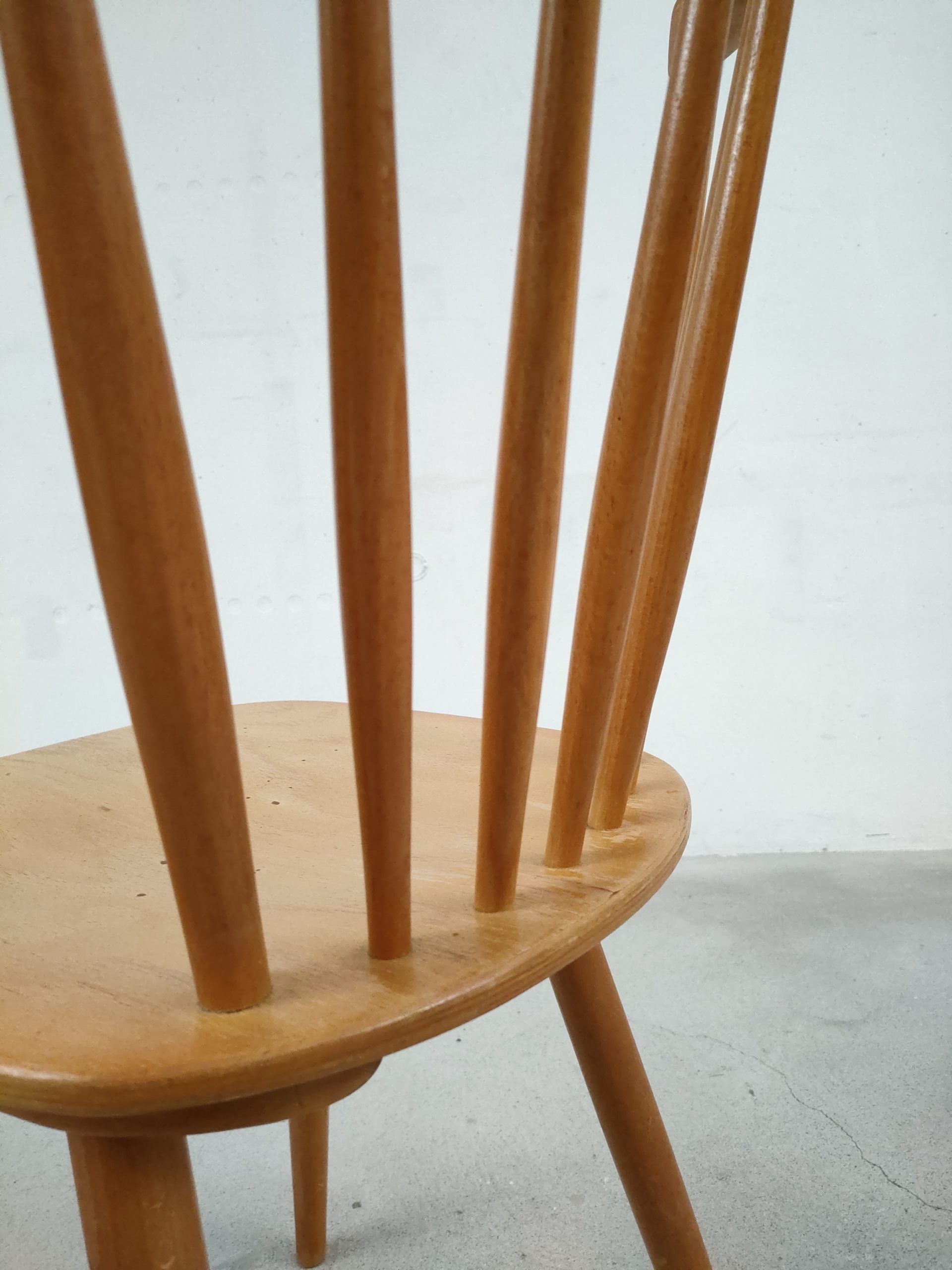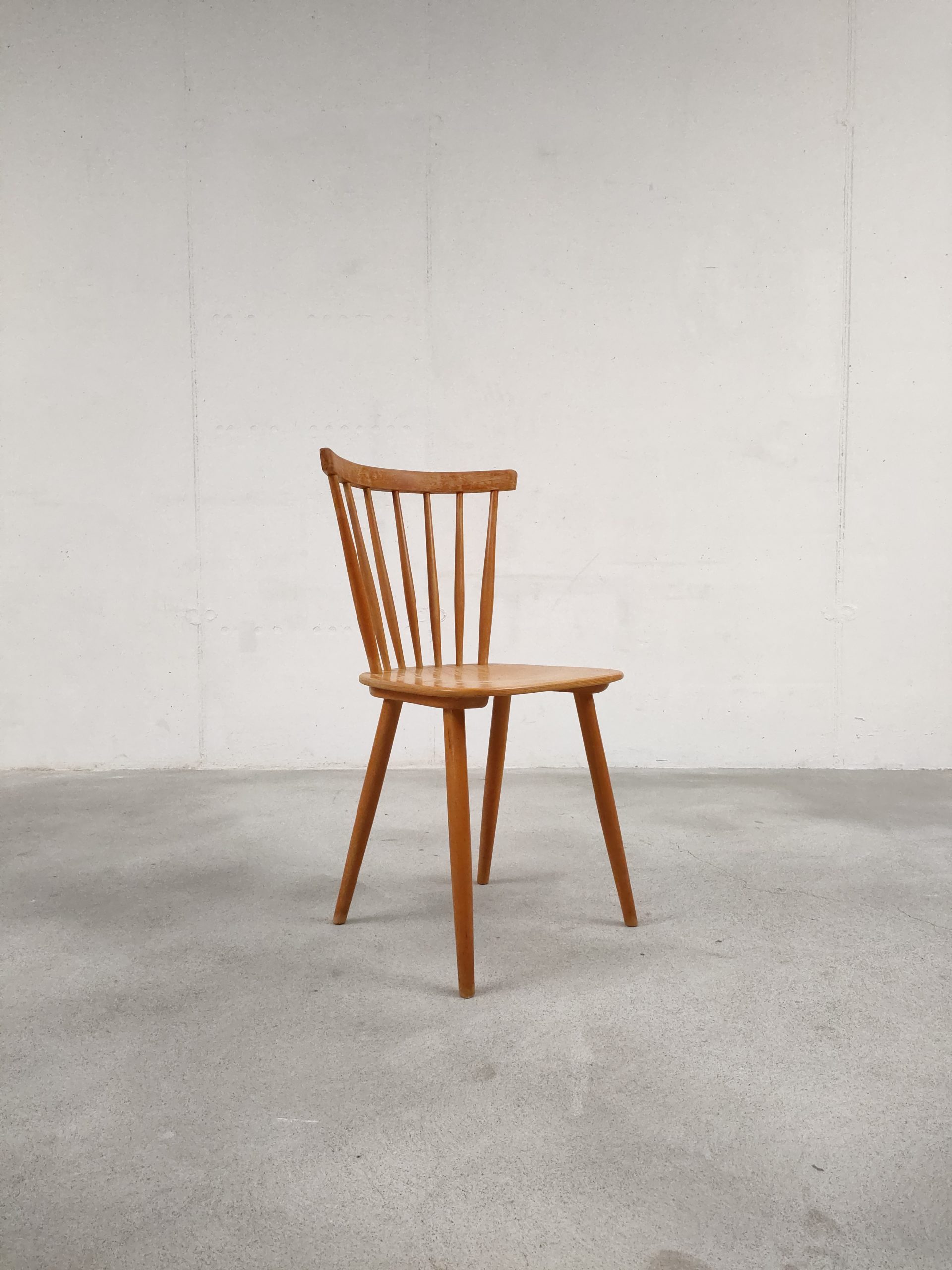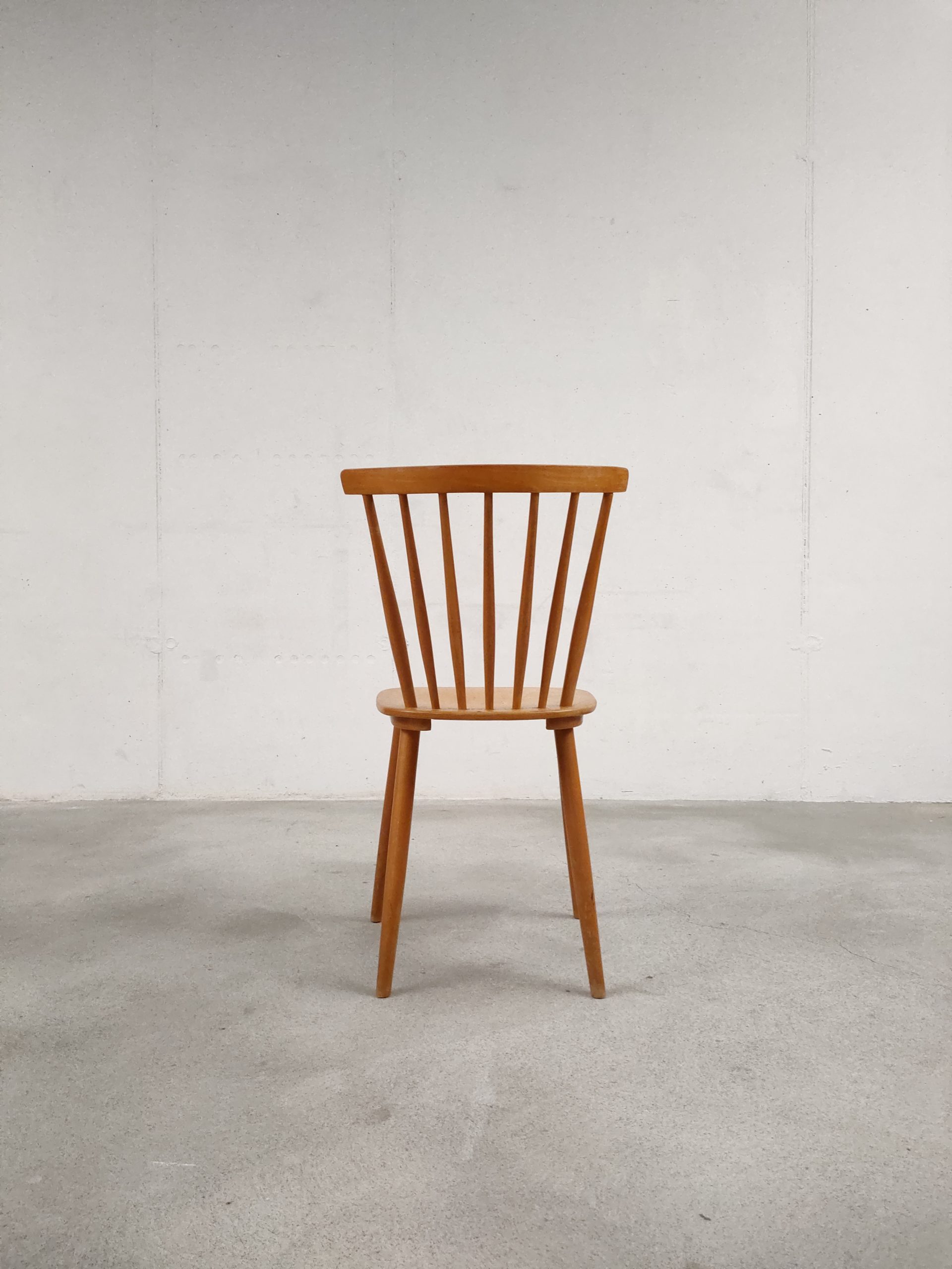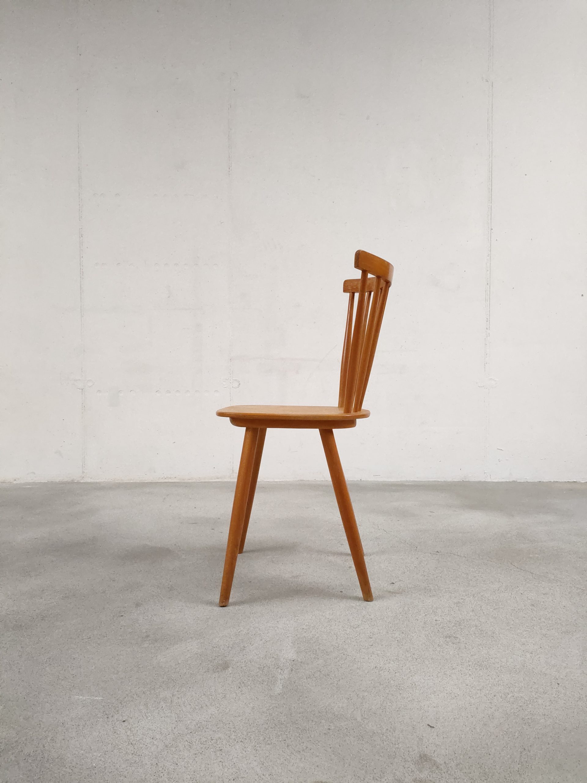 Produit venduChaise à barreaux vintage en bois avec des traces d’usure en particulier sur la partie supérieure du dossier et sur l’assise. La chaise est stable et solide. Hauteur de l’assise: 45 cm.