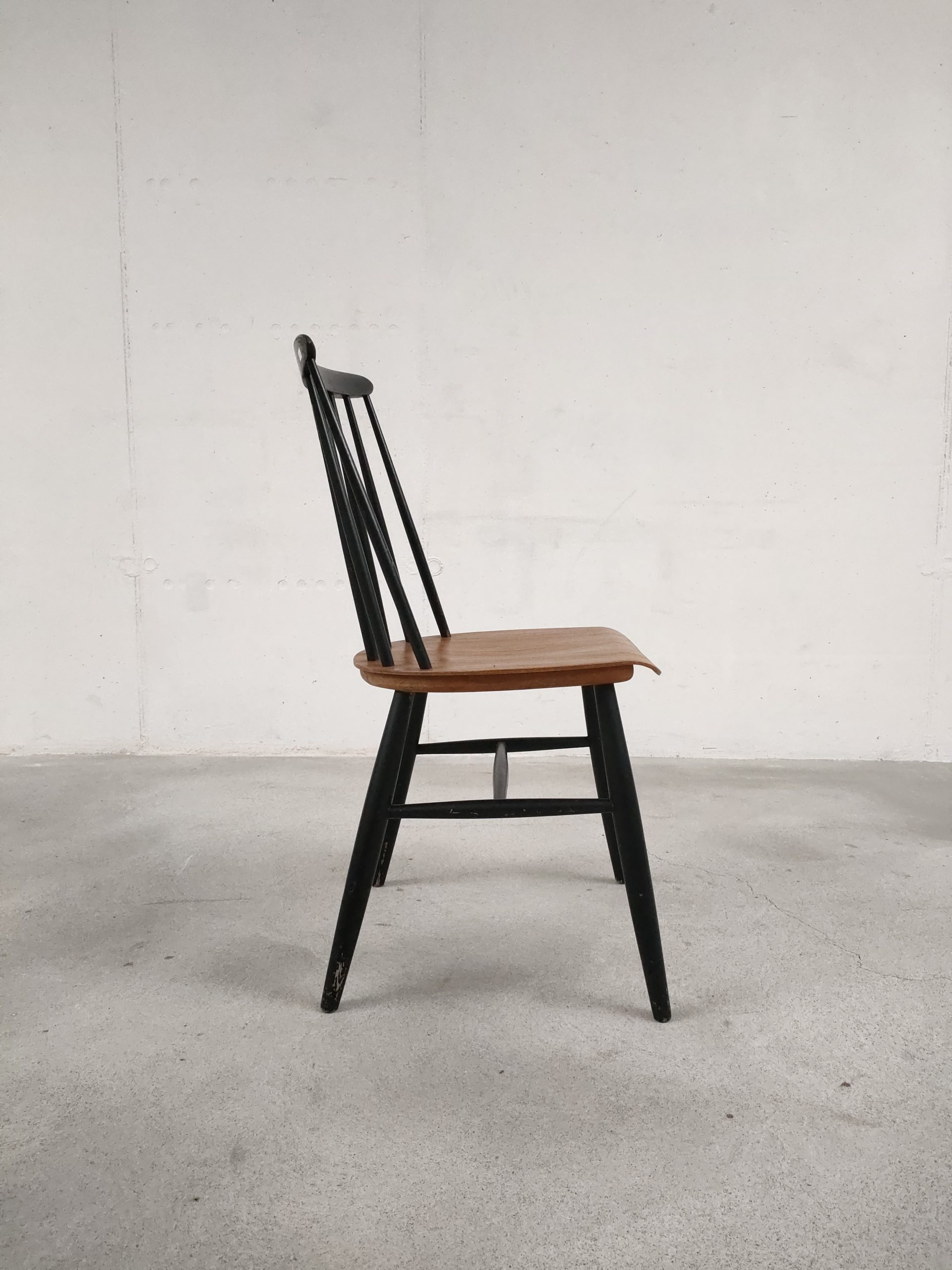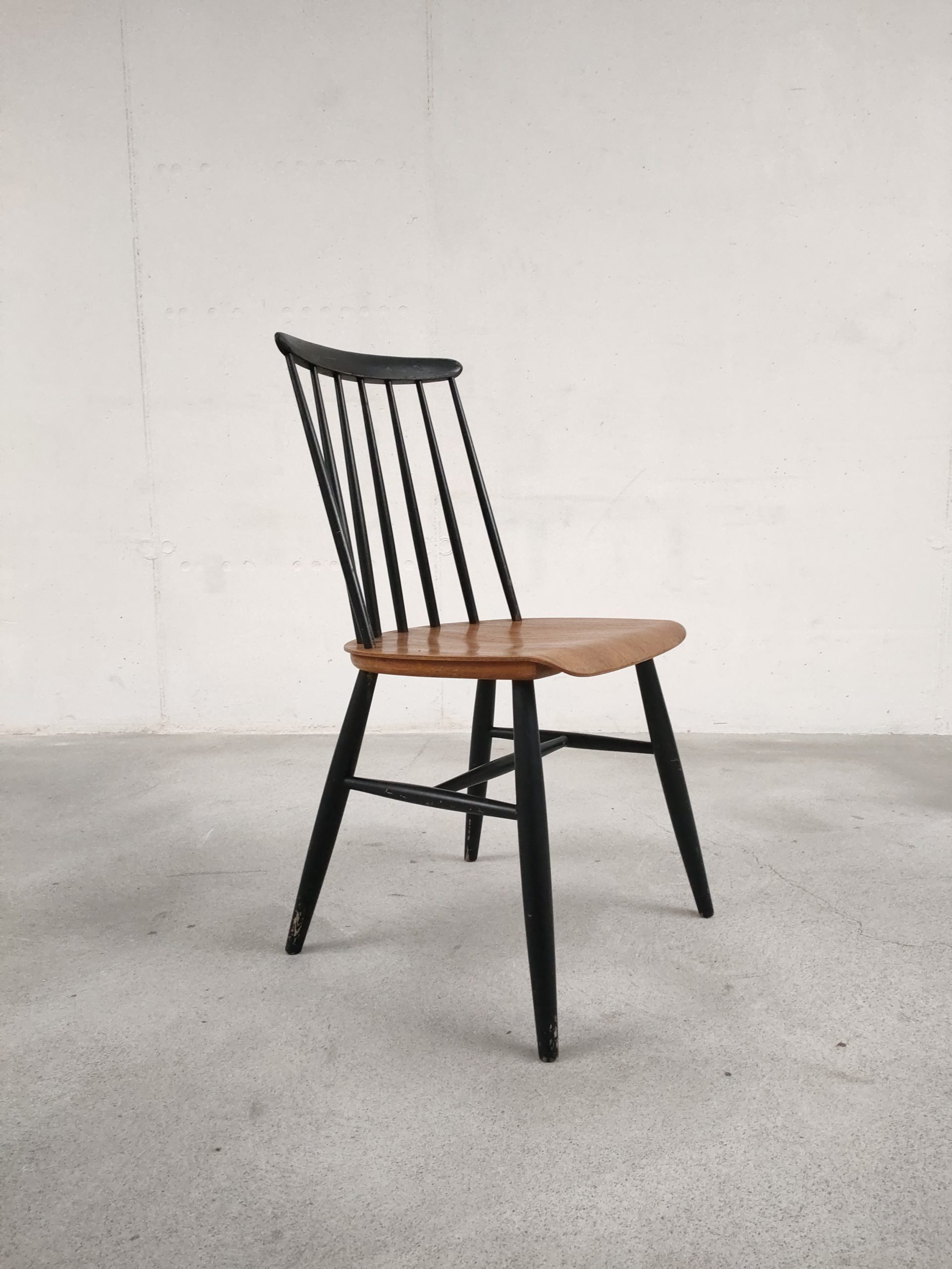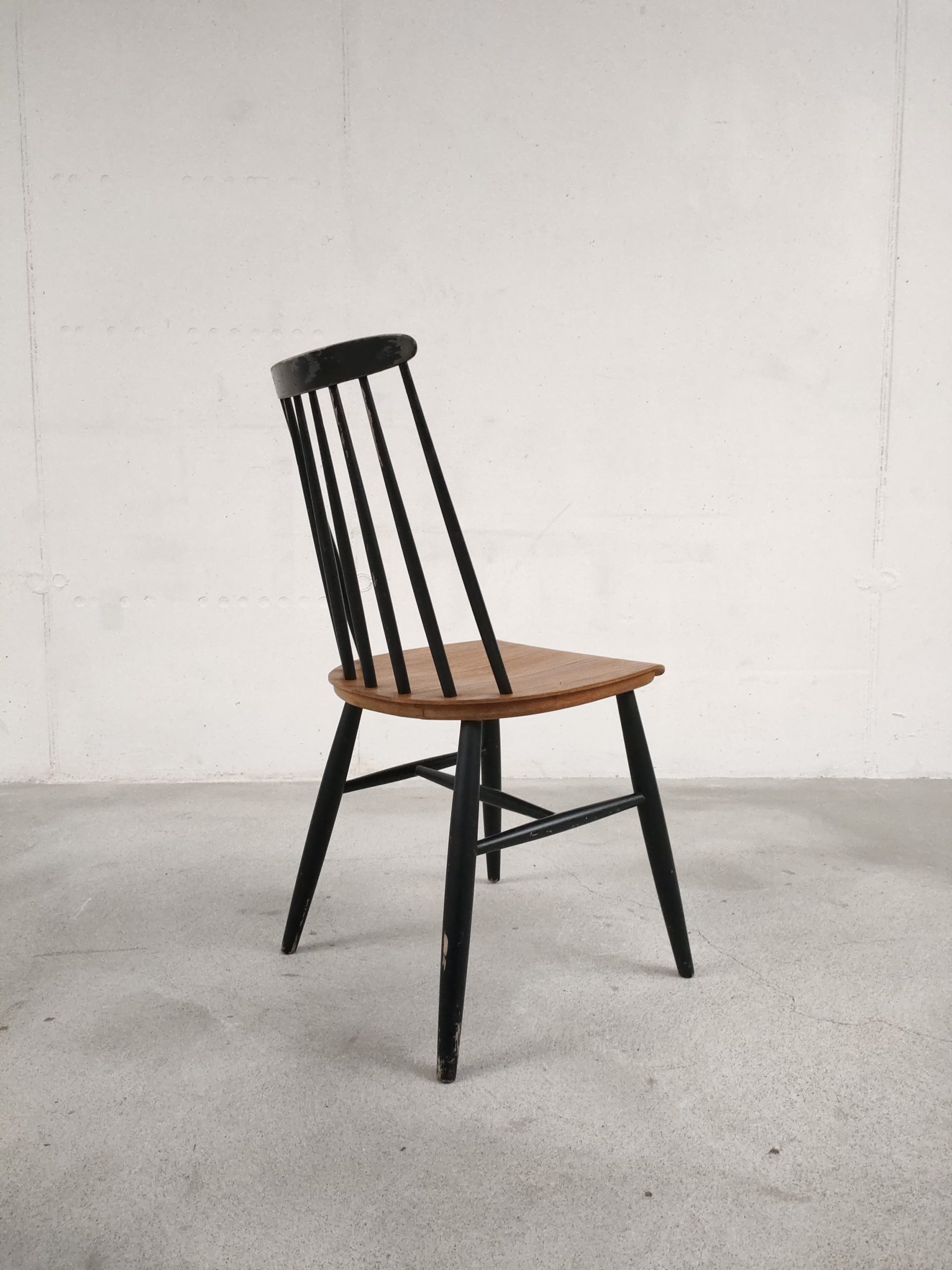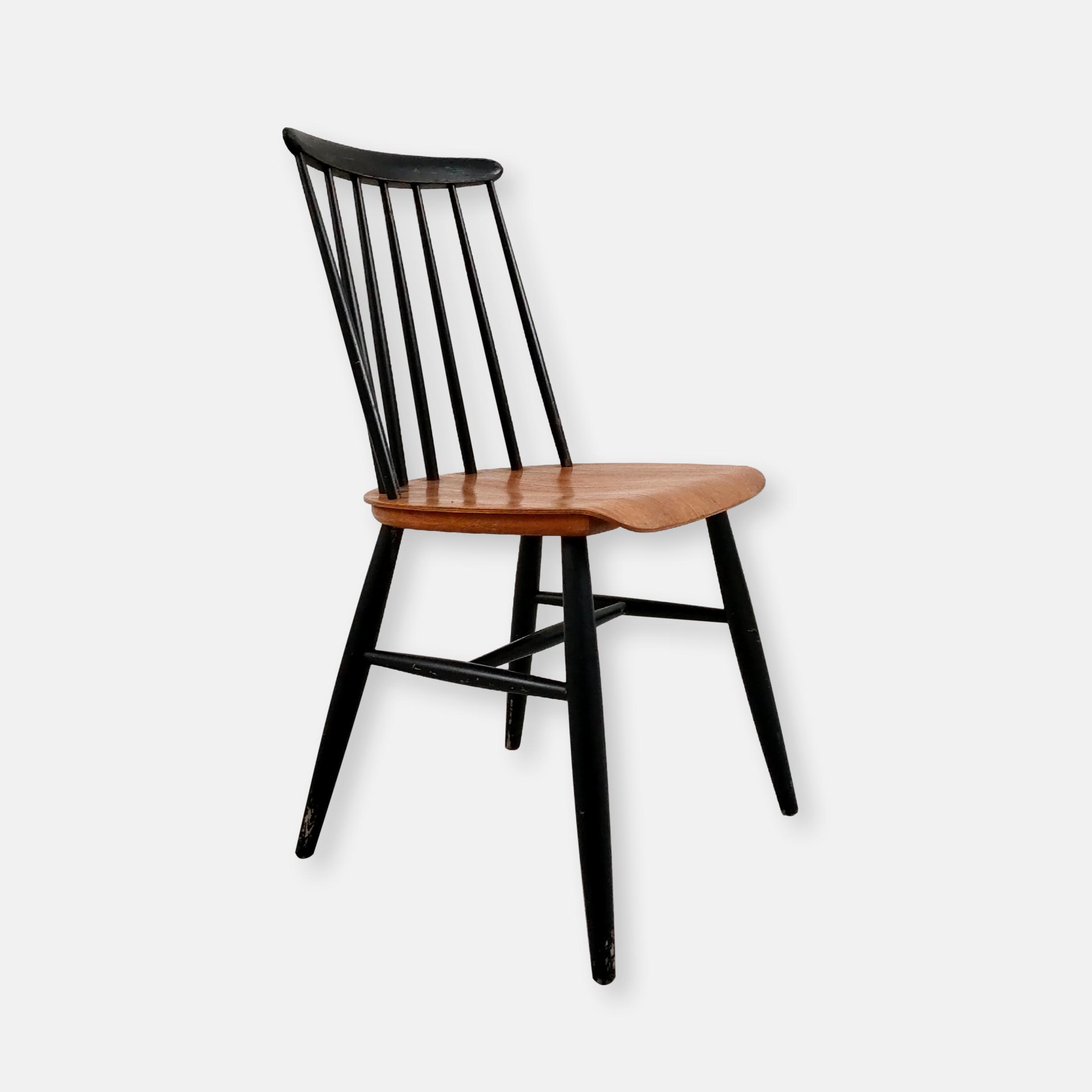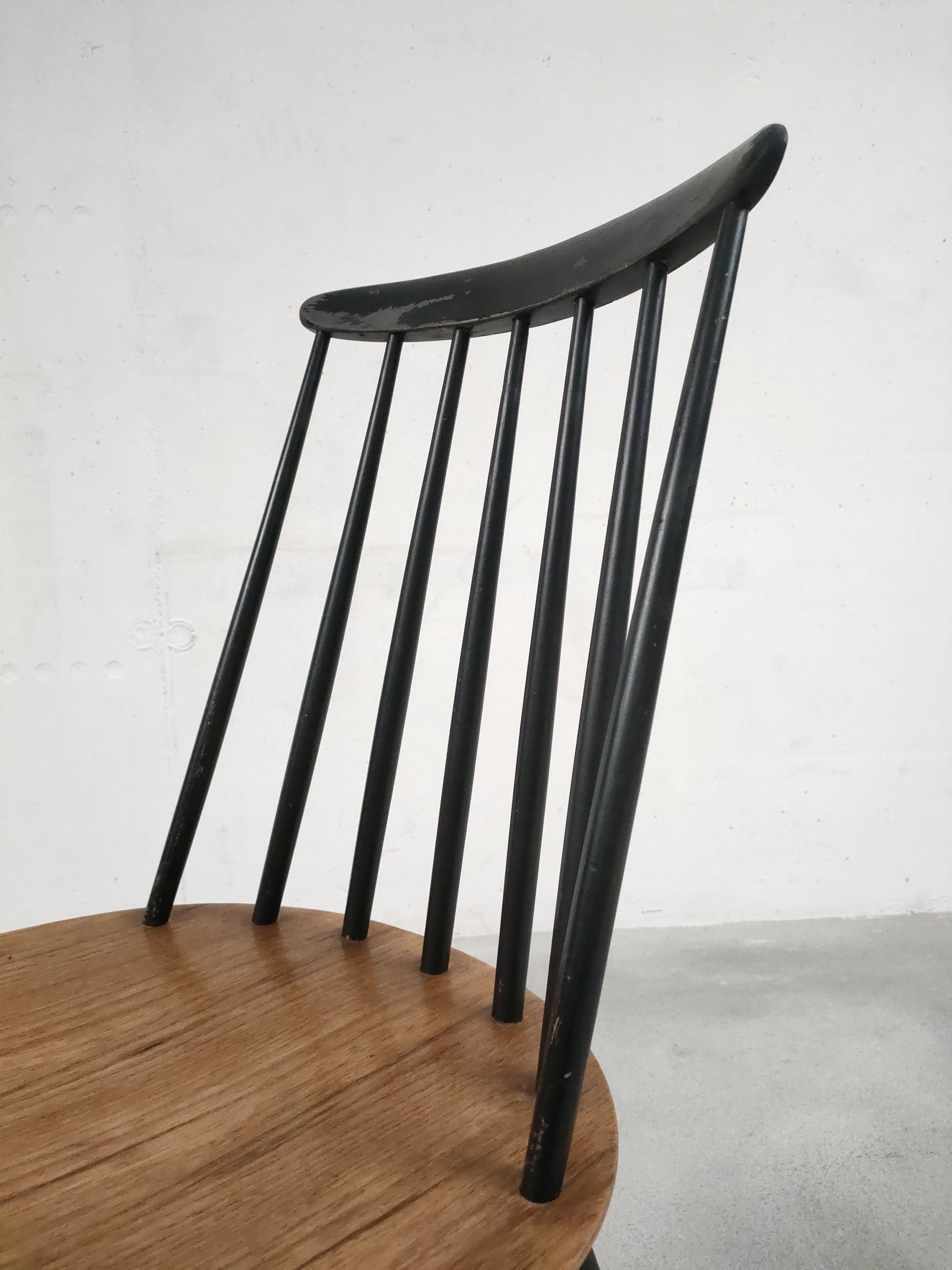 Produit venduChaise à barreaux en bois dans le style des chaises Fanett de Tapiovaara (pas d’étiquettes ni de gravures dans le bois). Des manques de peinture sont présentes sur le dossier et le piétement. Légèrement bancale, elle est parfaitement stable et solide quand on est assis.