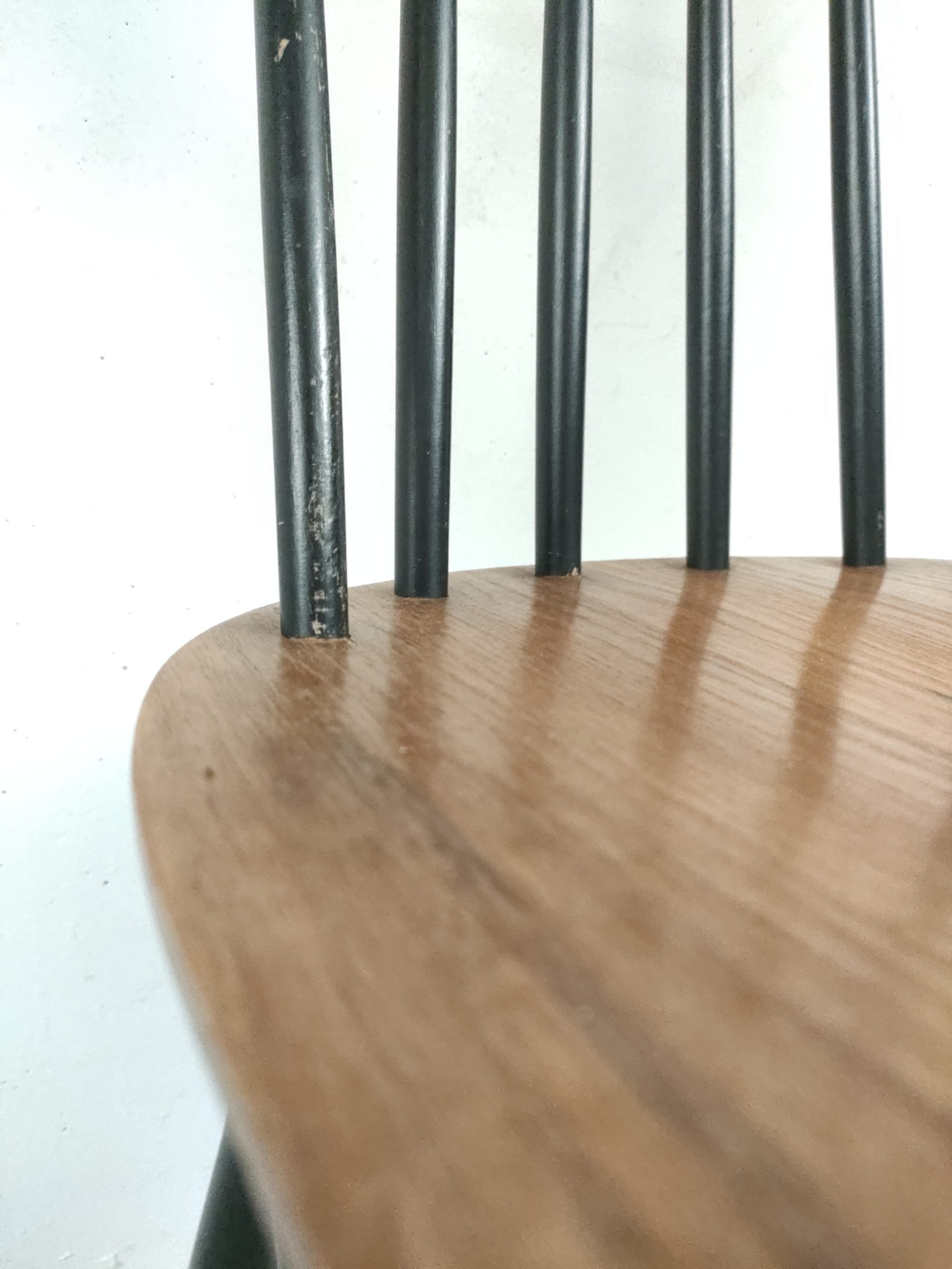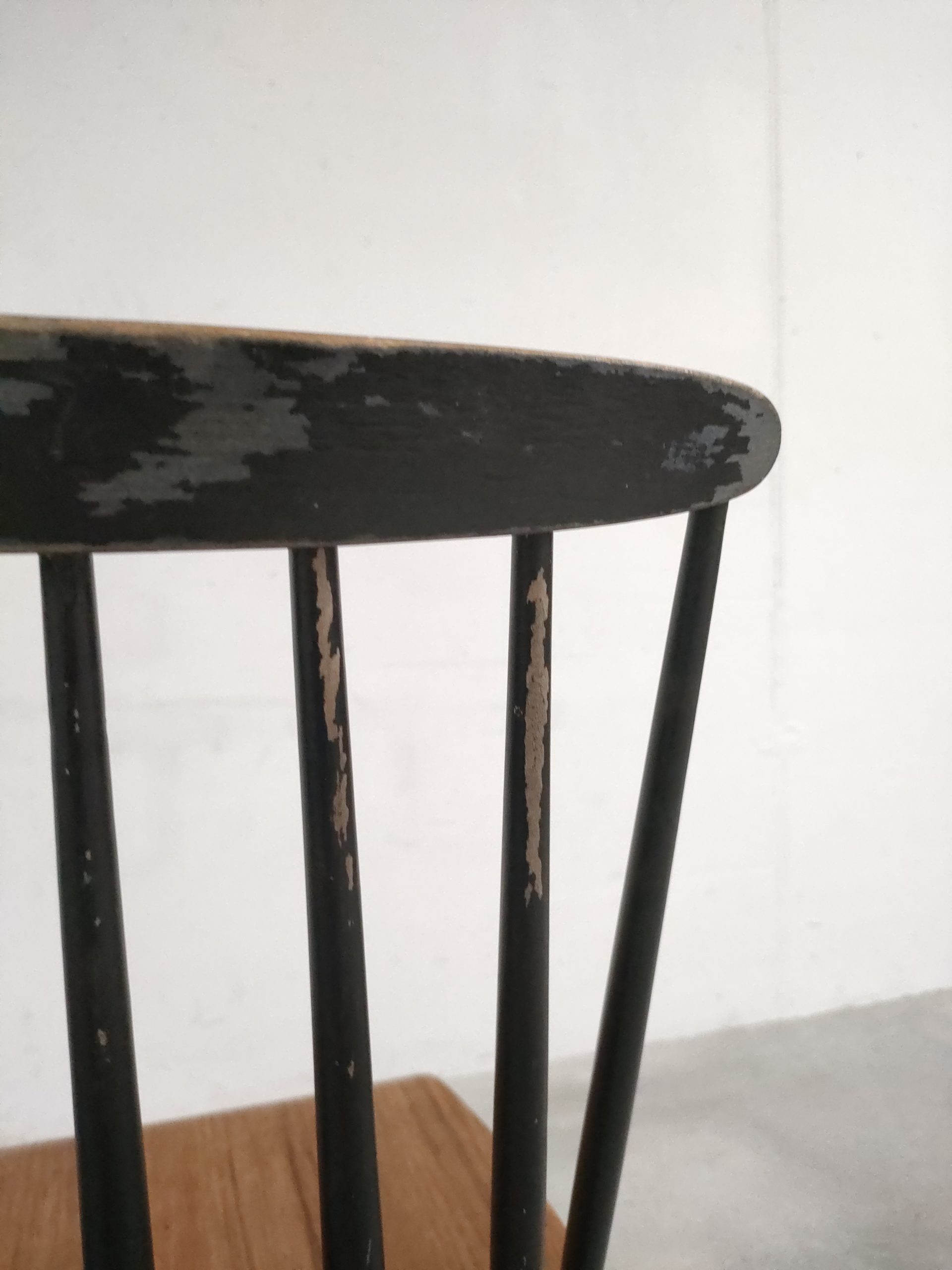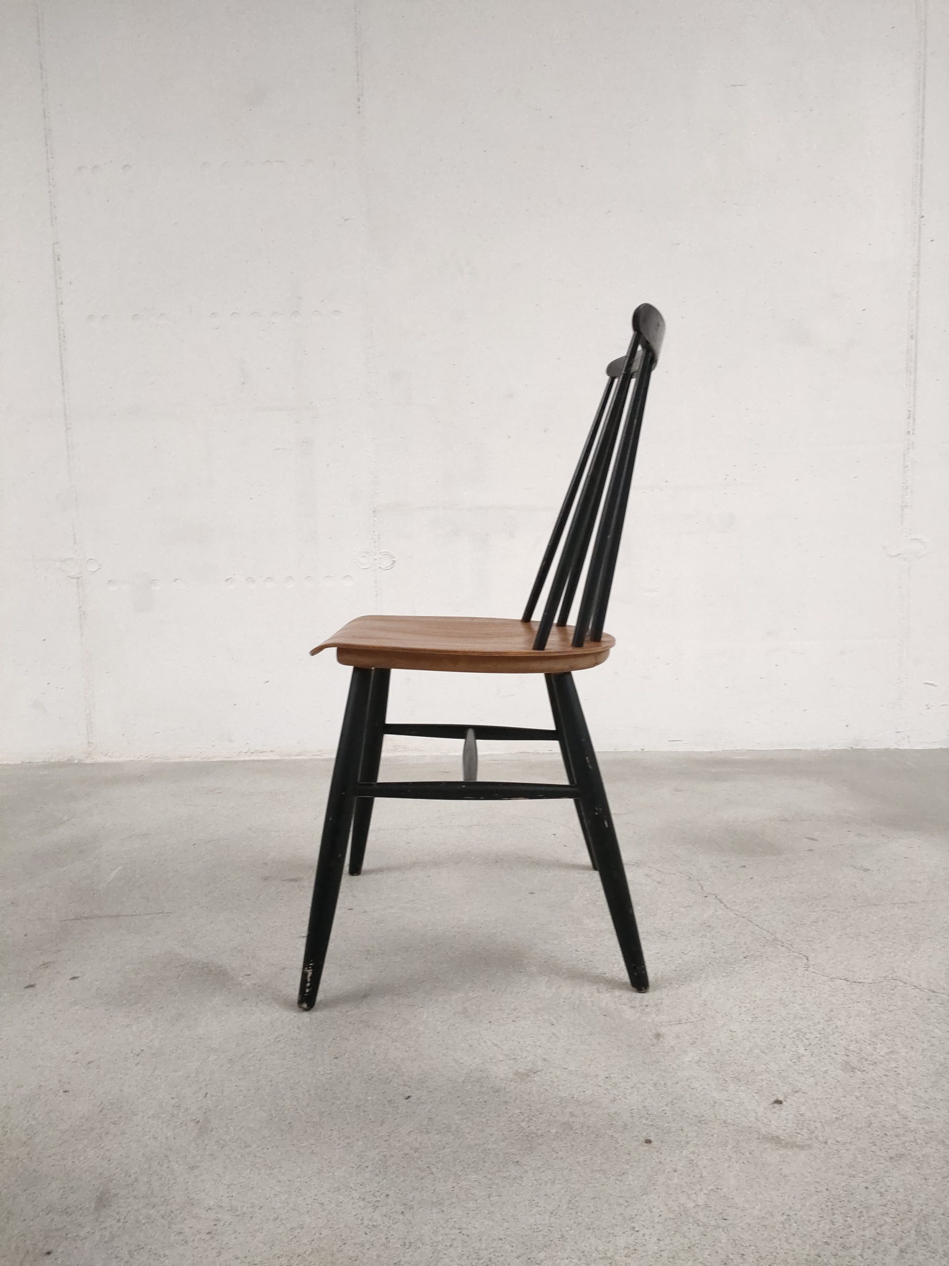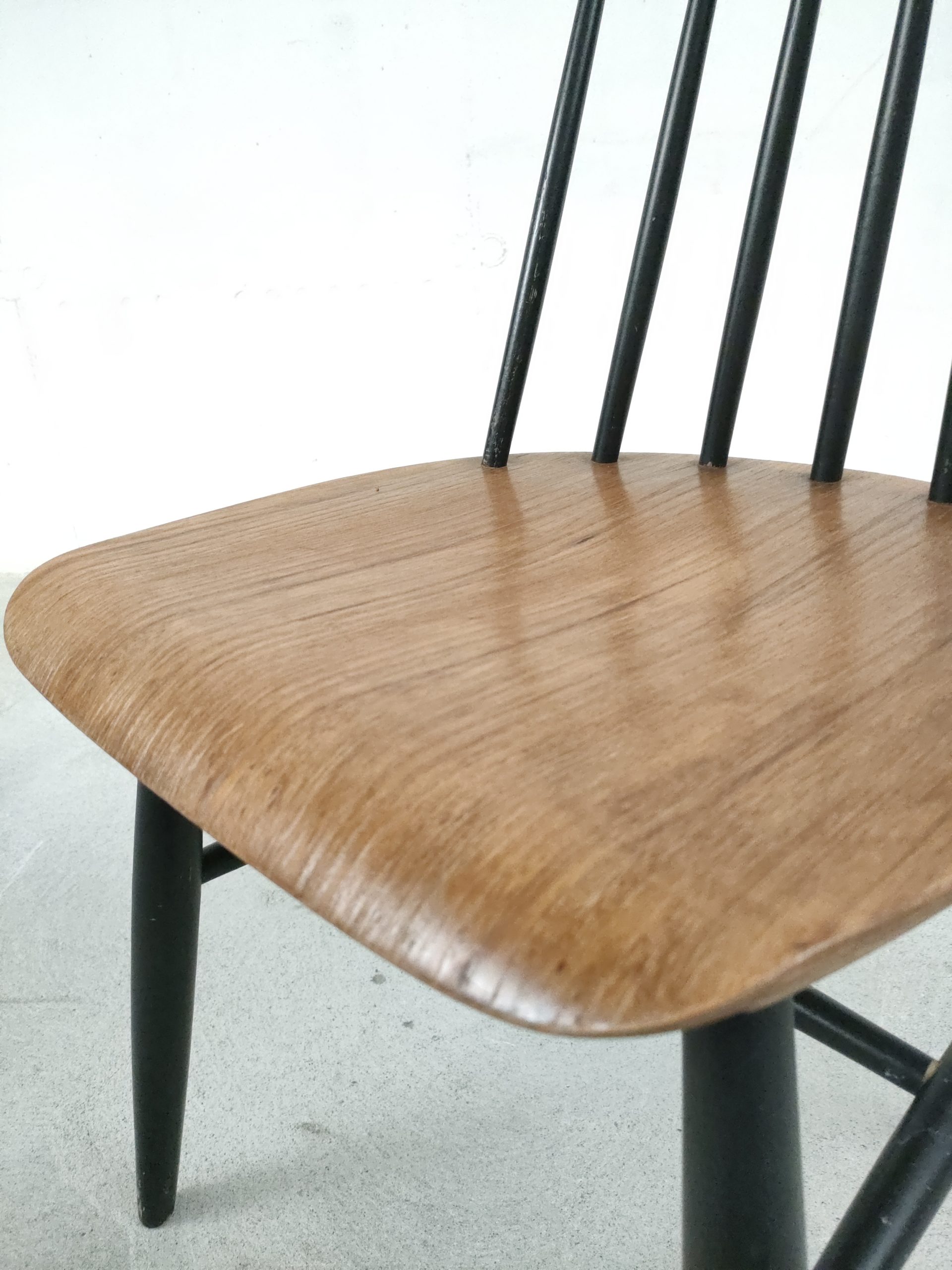 Produit venduChaise à barreaux en bois dans le style des chaises Fanett de Tapiovaara (pas d’étiquettes ni de gravures dans le bois). Des manques de peinture sont présentes sur le dossier et le piétement. Légèrement bancale, elle est parfaitement stable et solide quand on est assis.