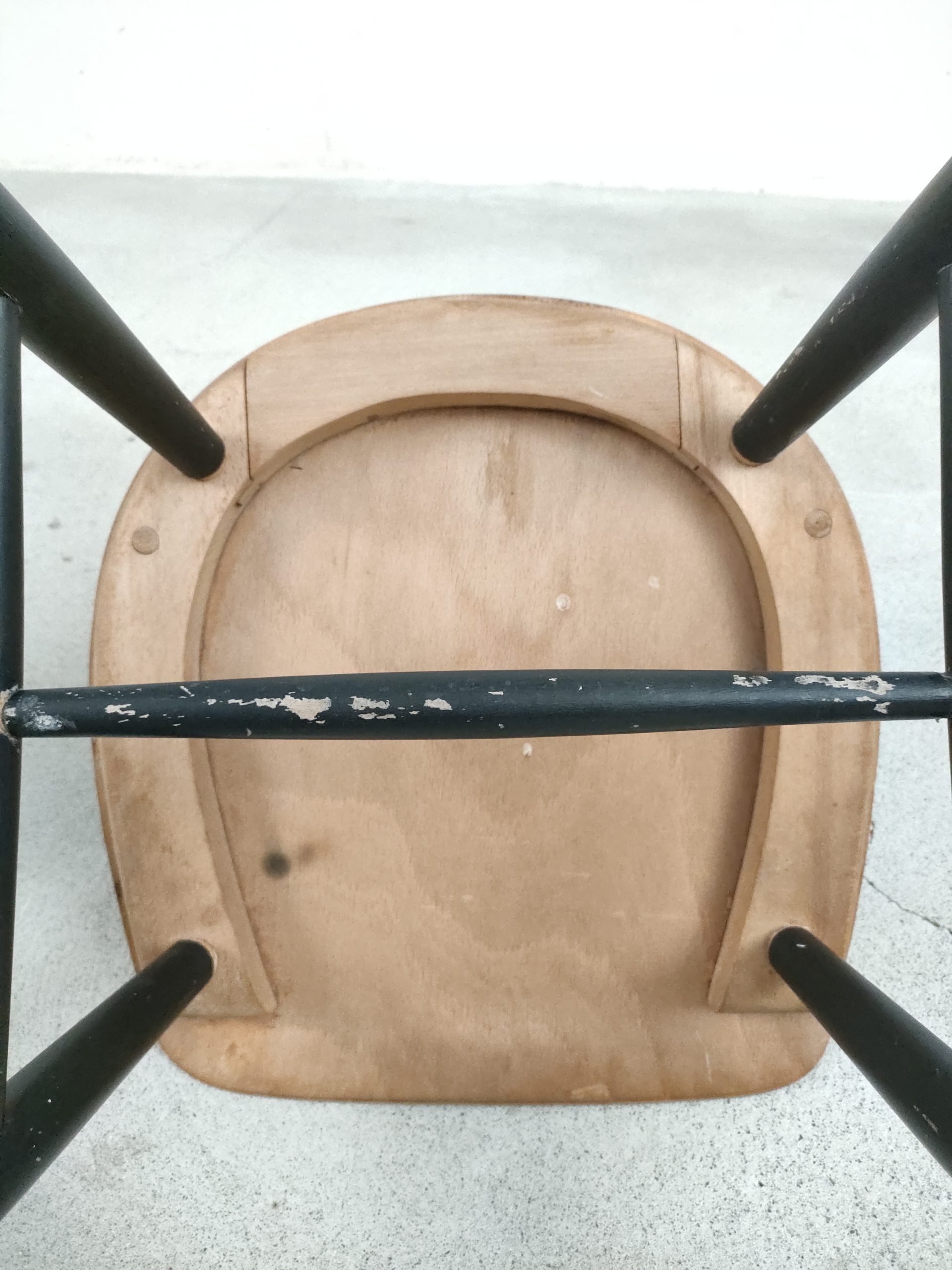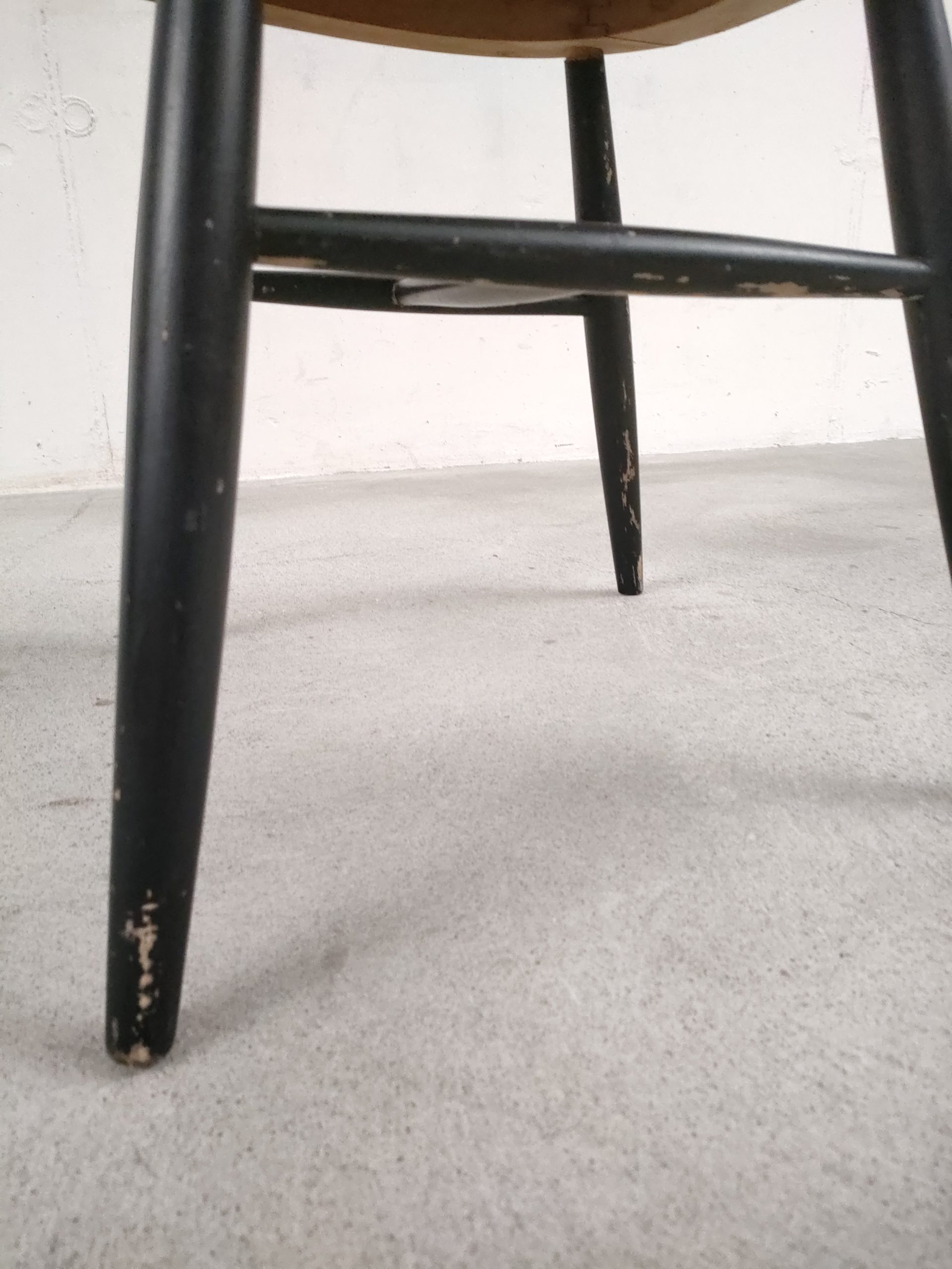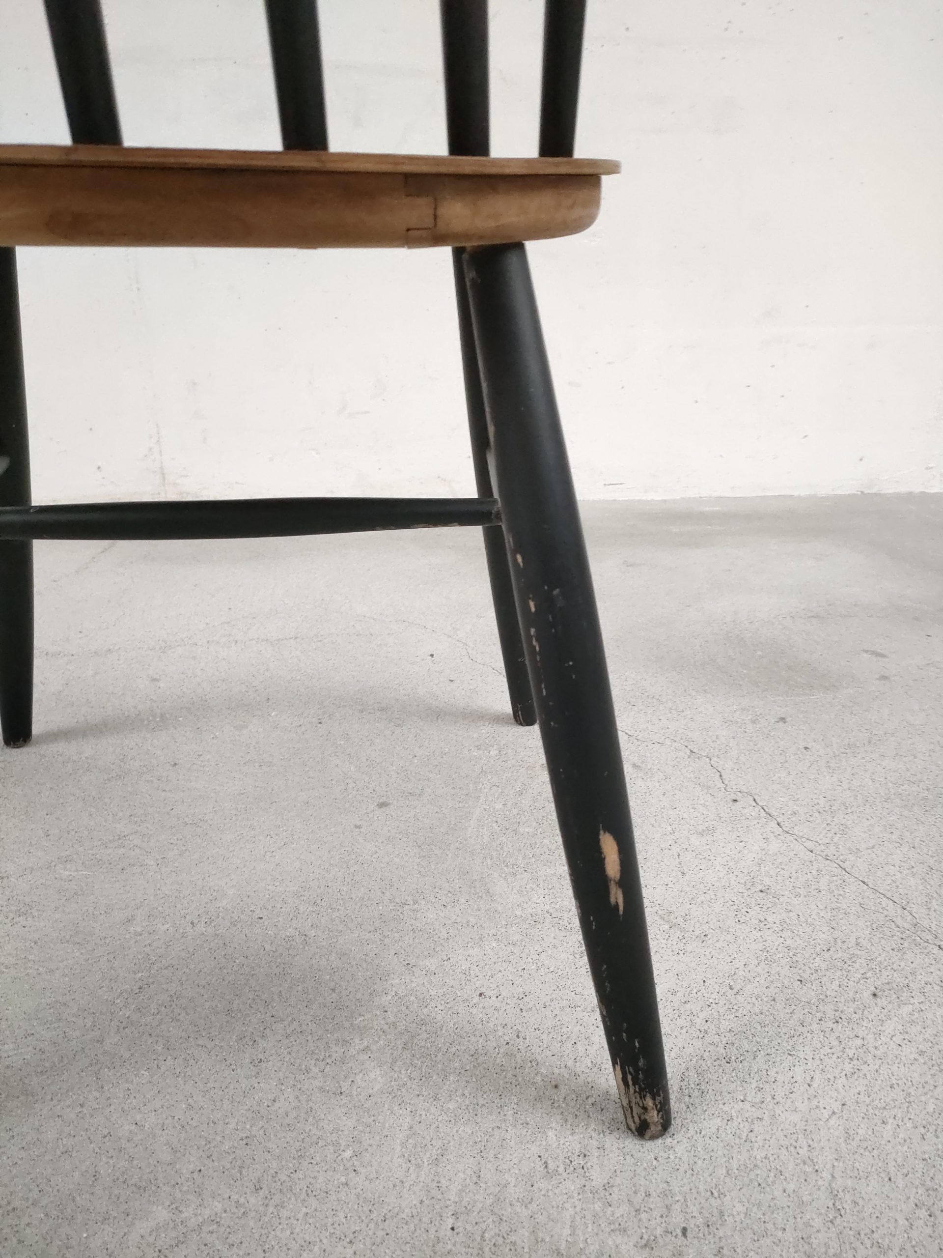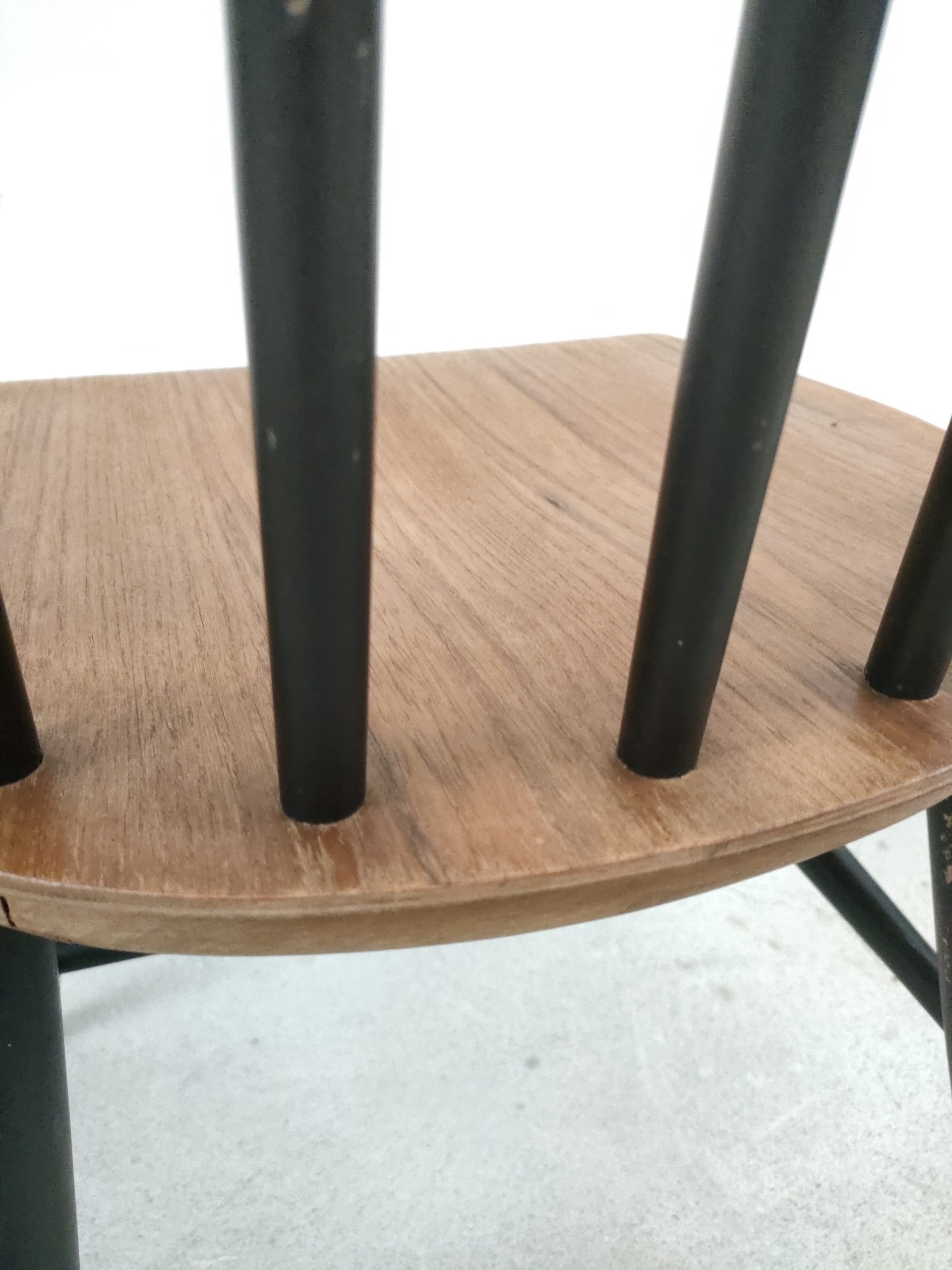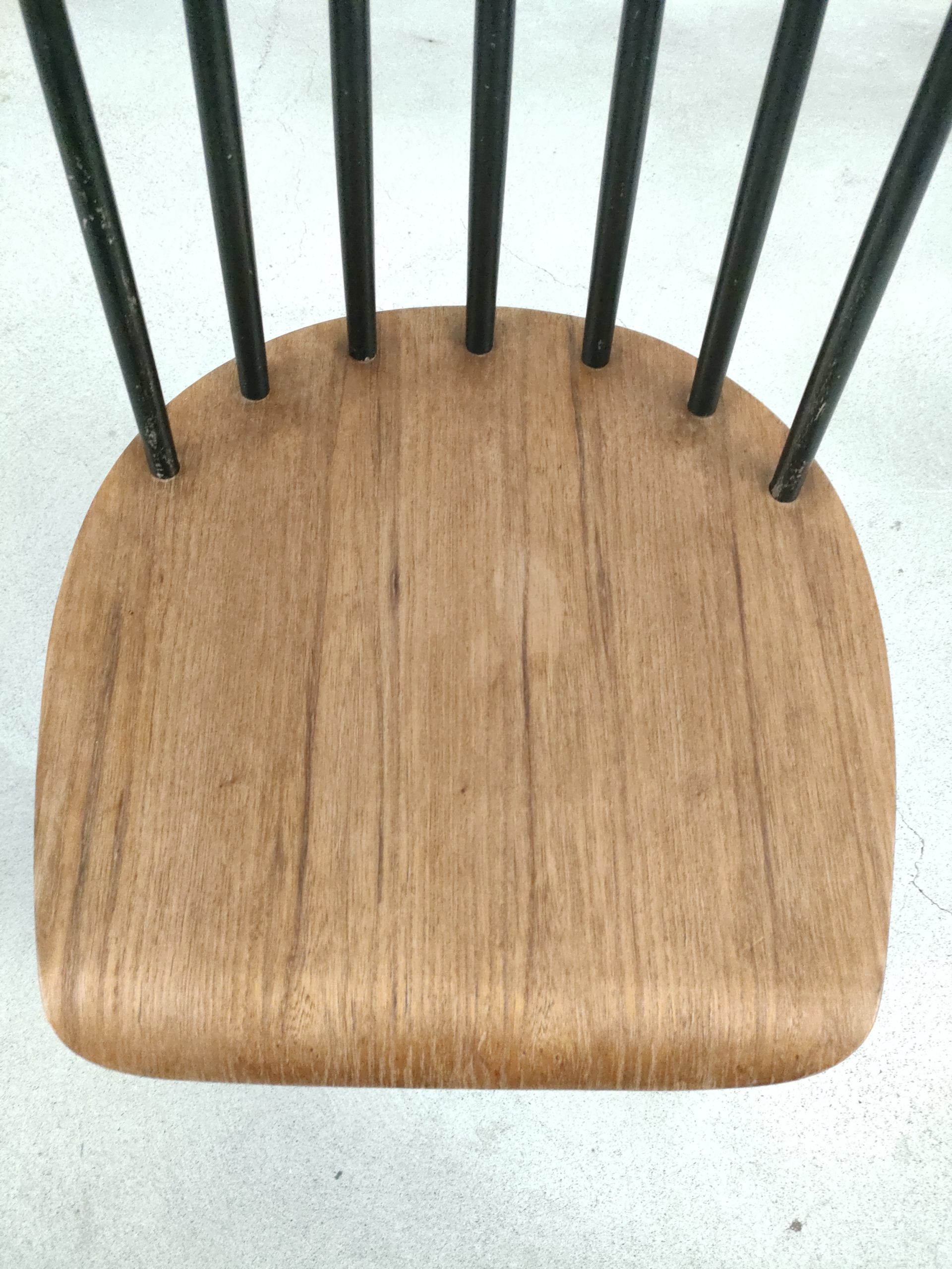 Produit venduChaise à barreaux en bois dans le style des chaises Fanett de Tapiovaara (pas d’étiquettes ni de gravures dans le bois). Des manques de peinture sont présentes sur le dossier et le piétement. Légèrement bancale, elle est parfaitement stable et solide quand on est assis.