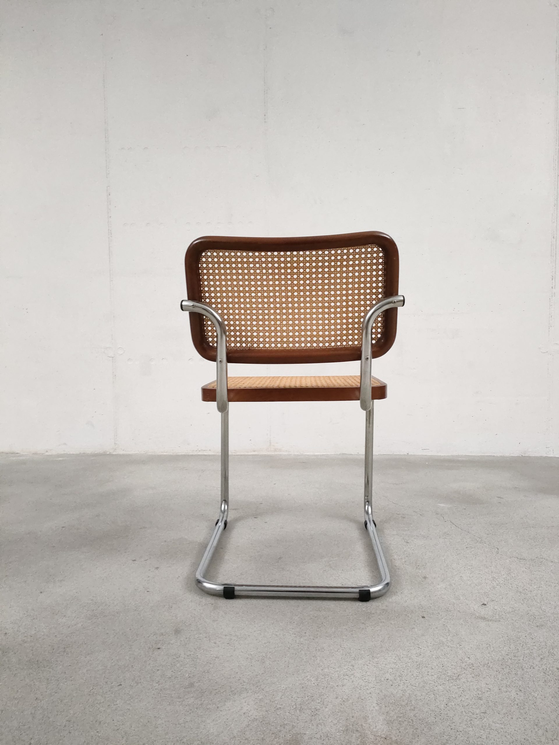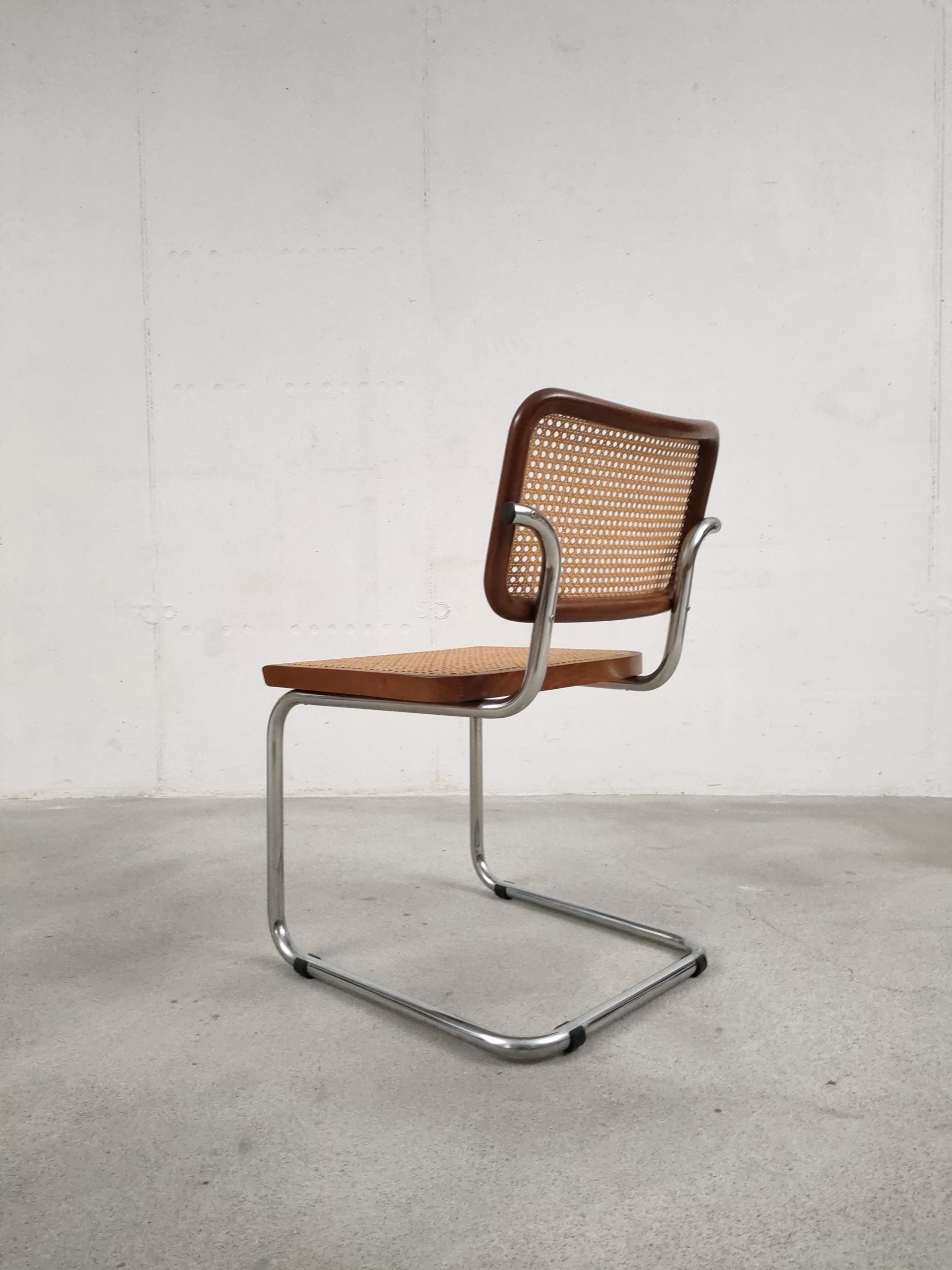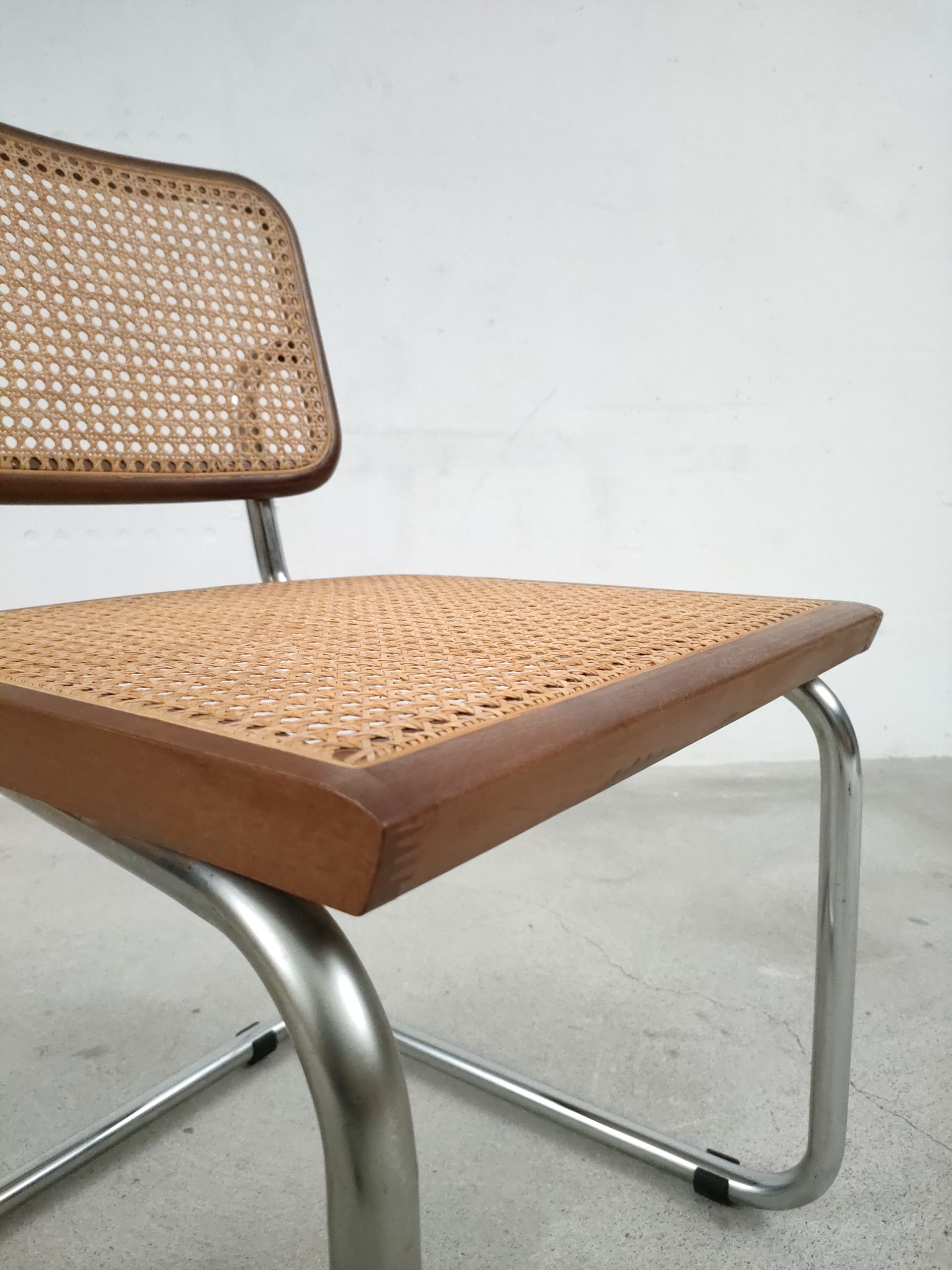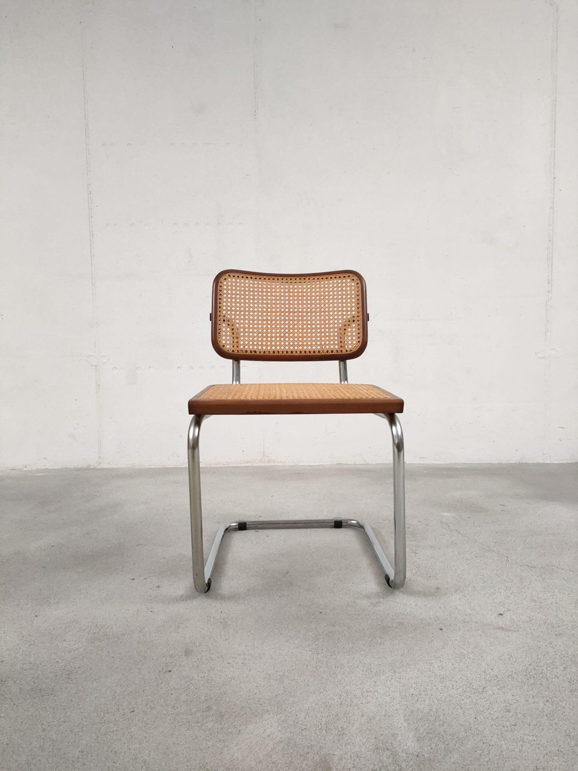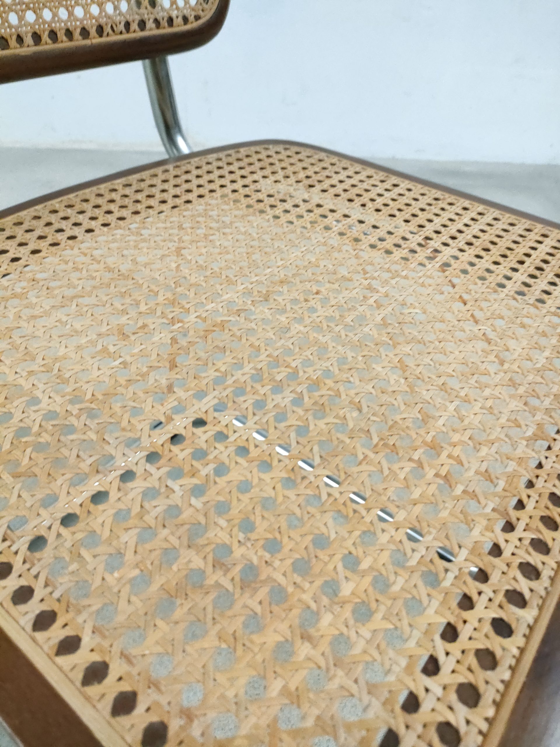 Produit venduChaise vintage avec structure tubulaire en métal et assise et dossier en bois et cannage. Production italienne. Le cannage est en bon état et la chaise est parfaitement fonctionnelle. Hauteur d’assise: 46 cm.
