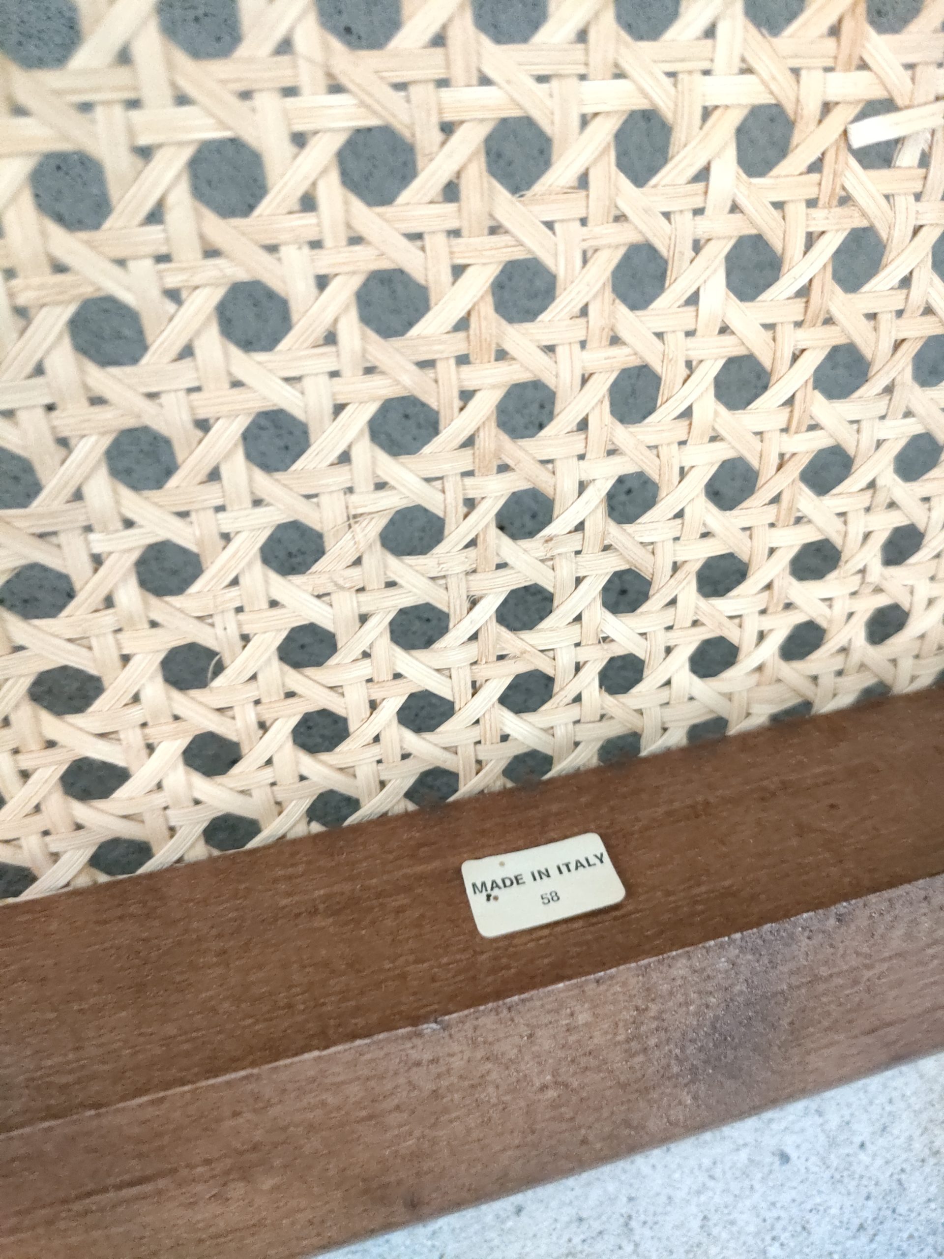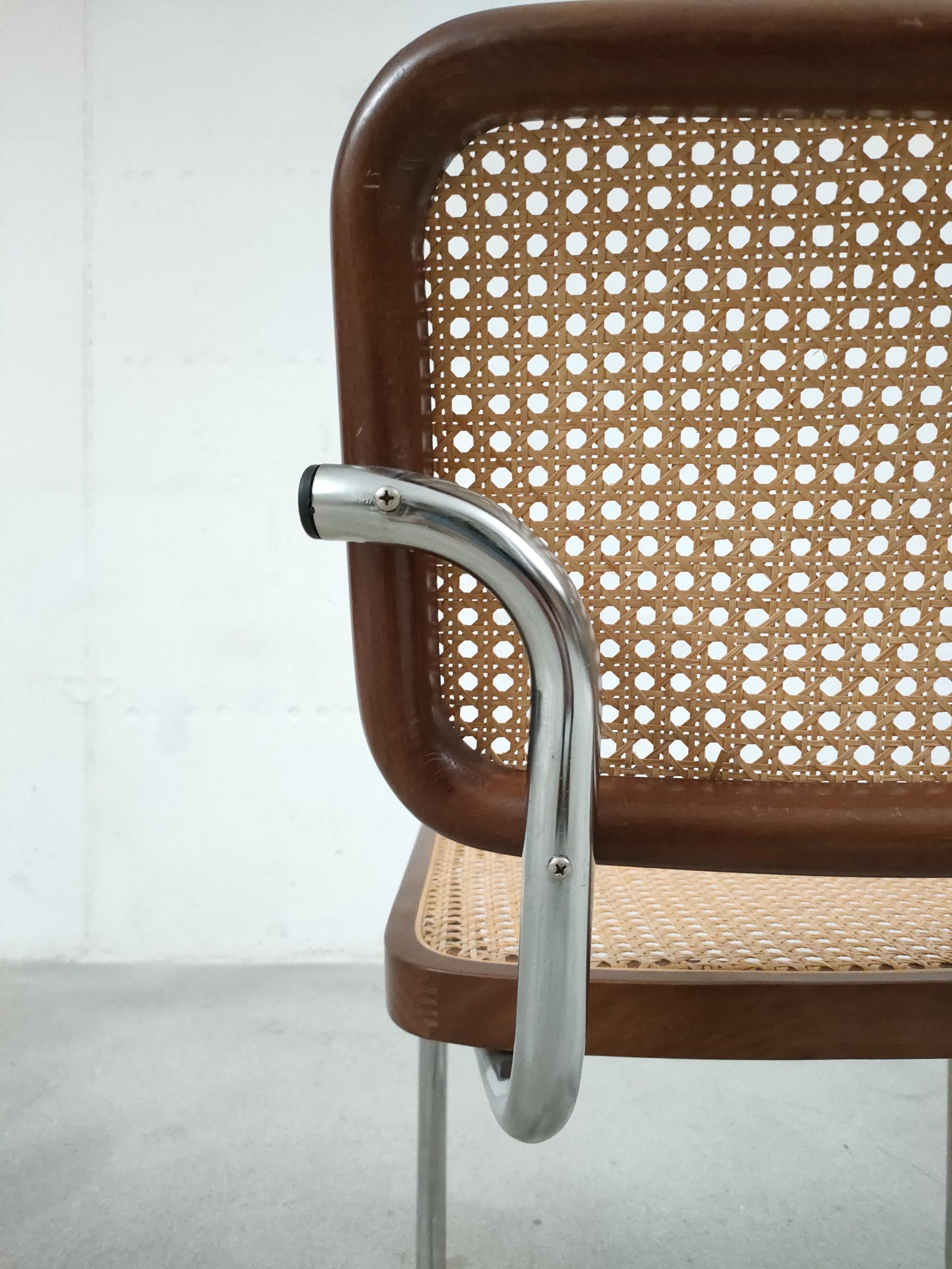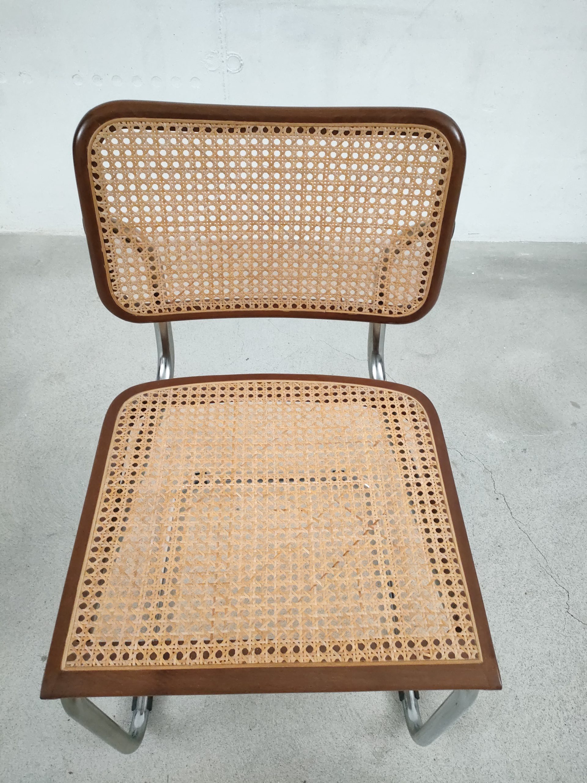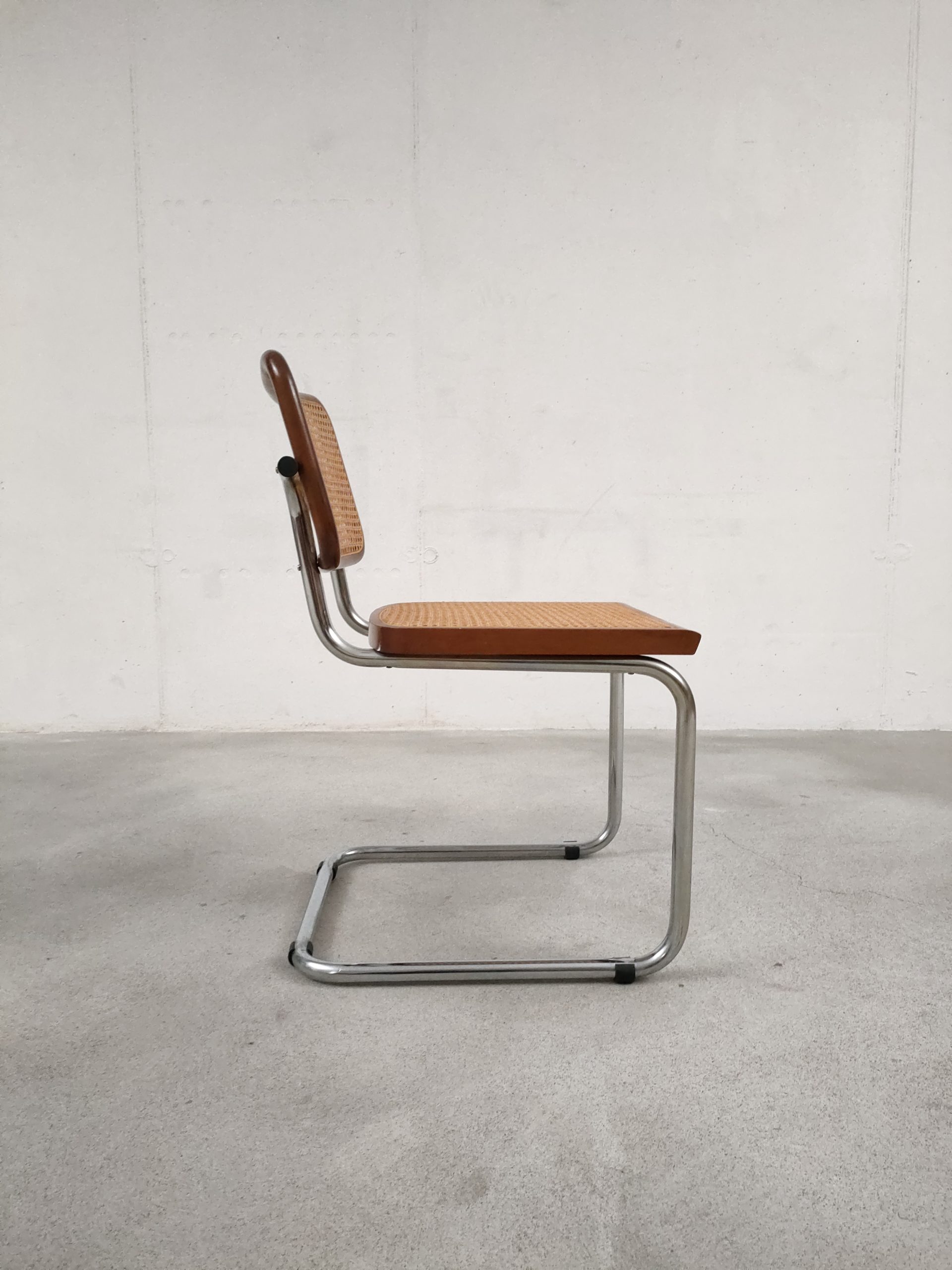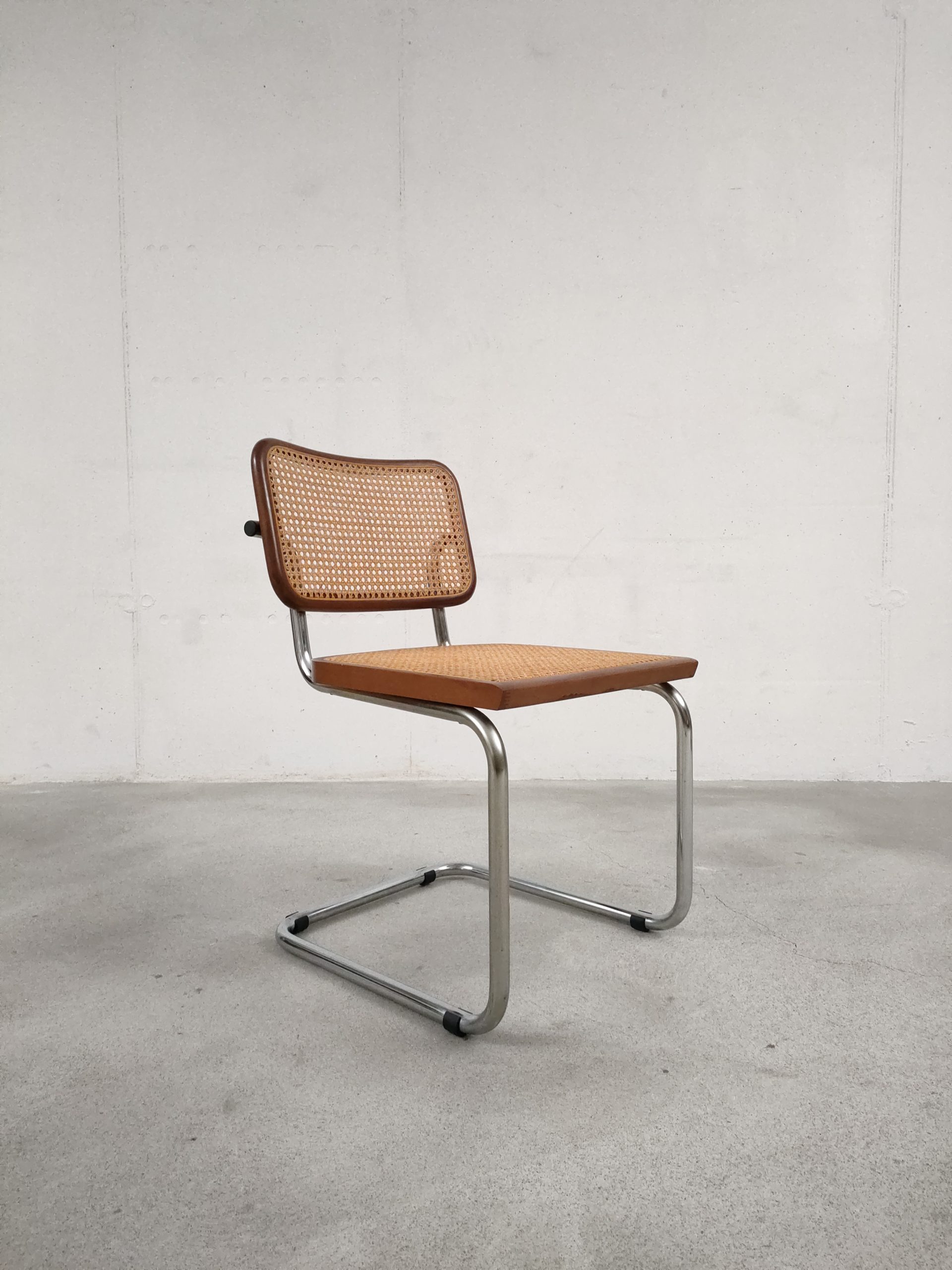 Produit venduChaise vintage avec structure tubulaire en métal et assise et dossier en bois et cannage. Production italienne. Le cannage est en bon état et la chaise est parfaitement fonctionnelle. Hauteur d’assise: 46 cm.