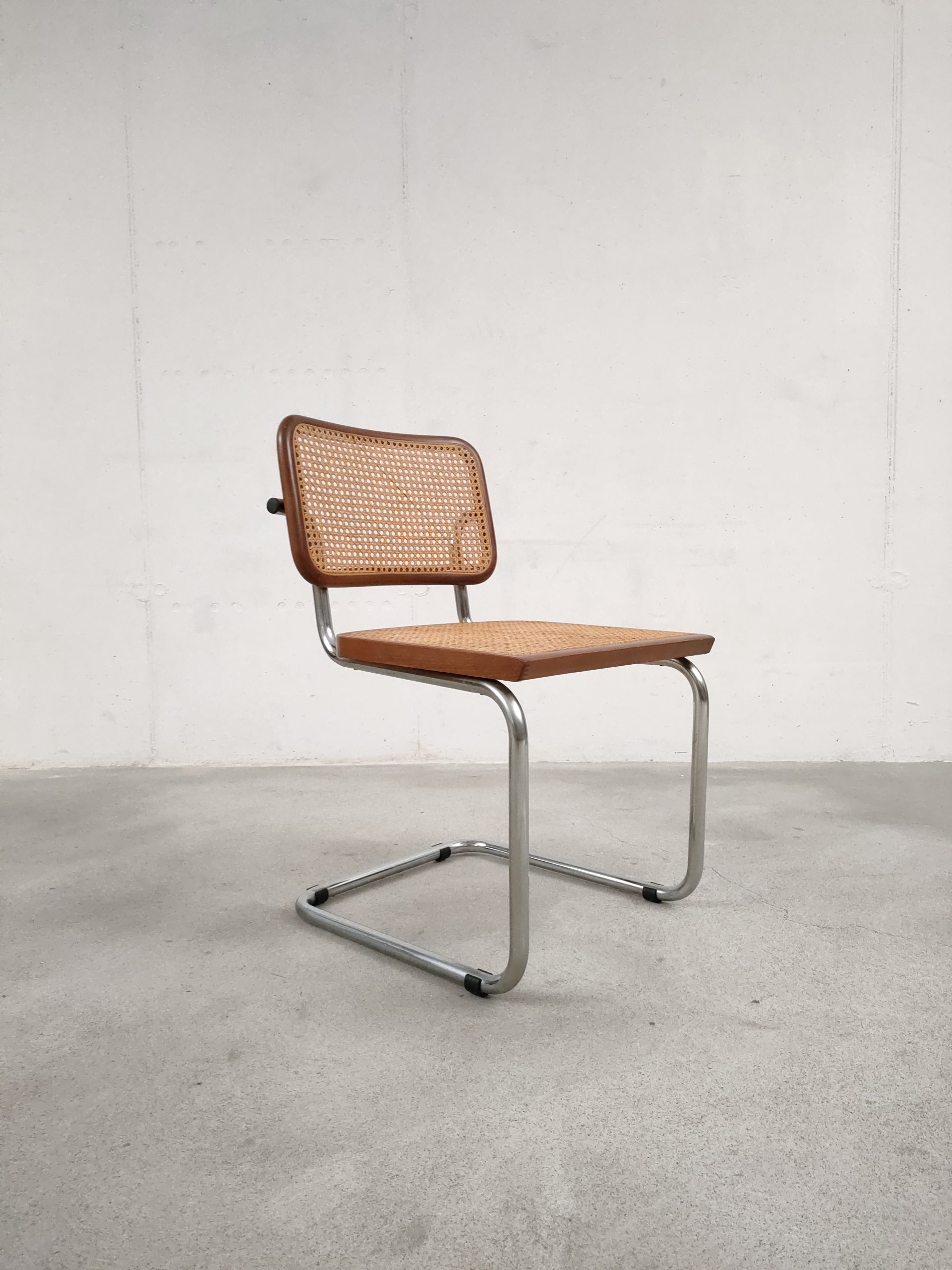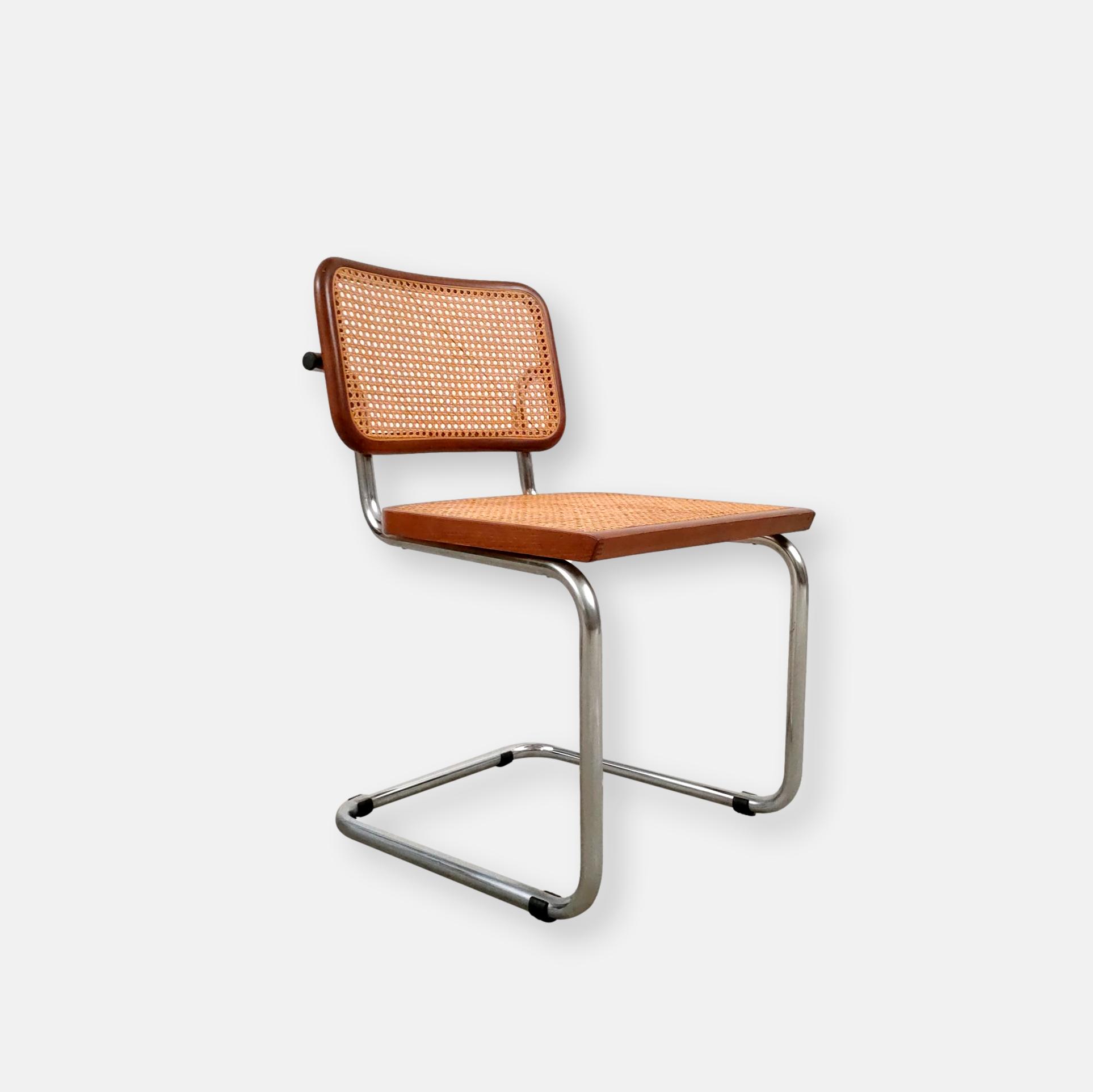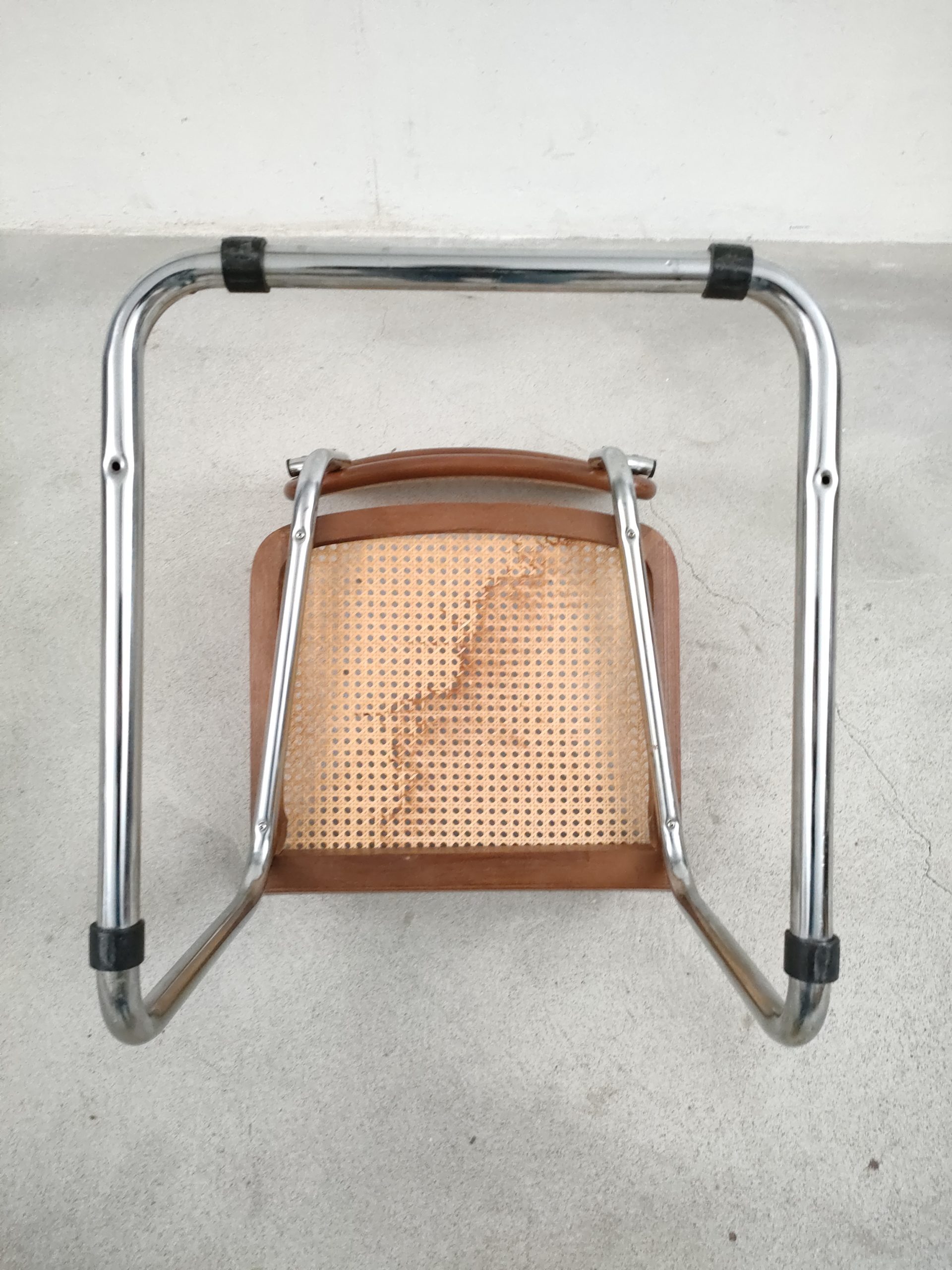 Produit venduChaise vintage avec structure tubulaire en métal et assise et dossier en bois et cannage. Production italienne. Le cannage est en bon état et la chaise est parfaitement fonctionnelle. Une trace et une décoloration au niveau de l’assise sont présentes mais elle sont visibles surtout depuis le bas (voir photos). Hauteur d’assise: 46 cm.