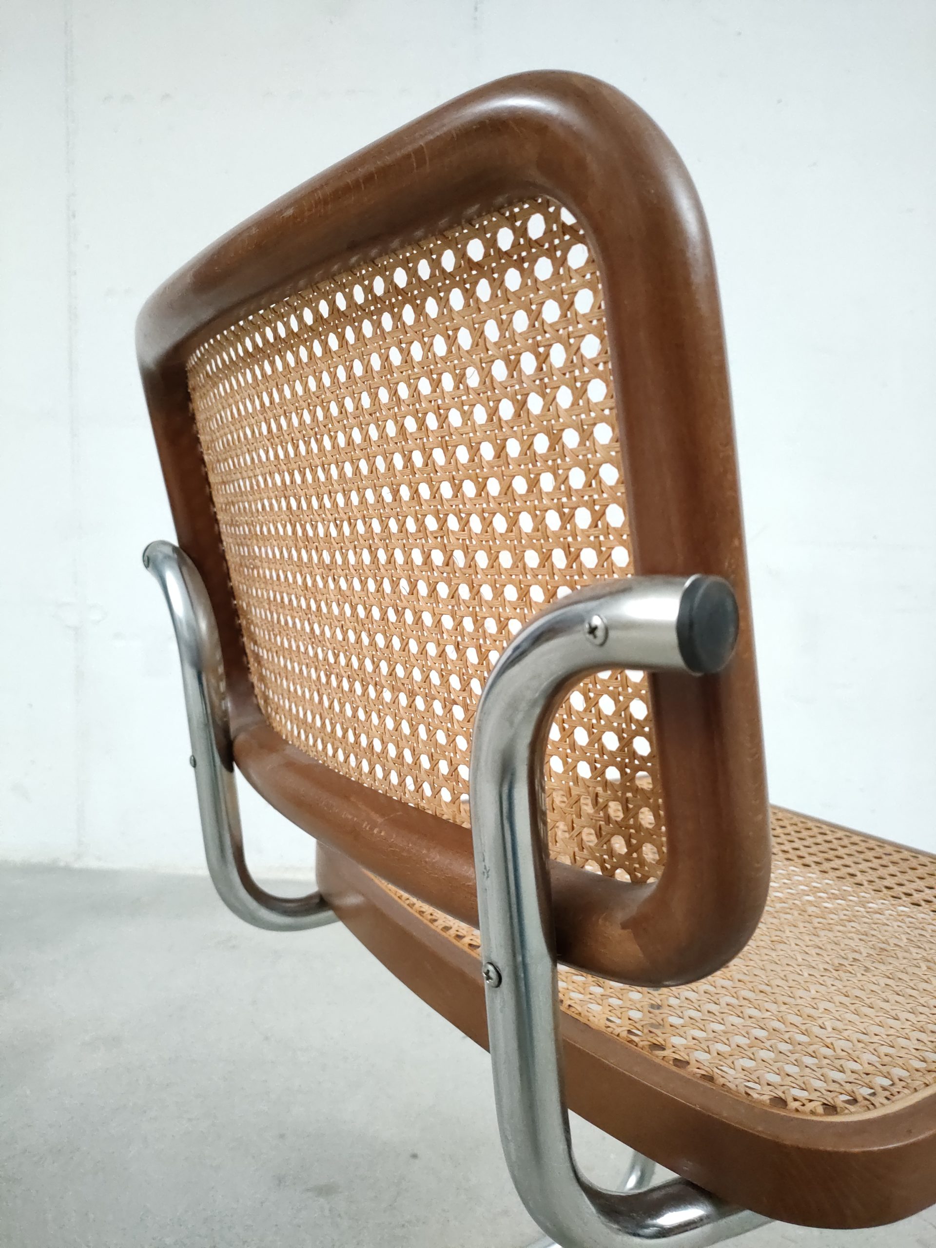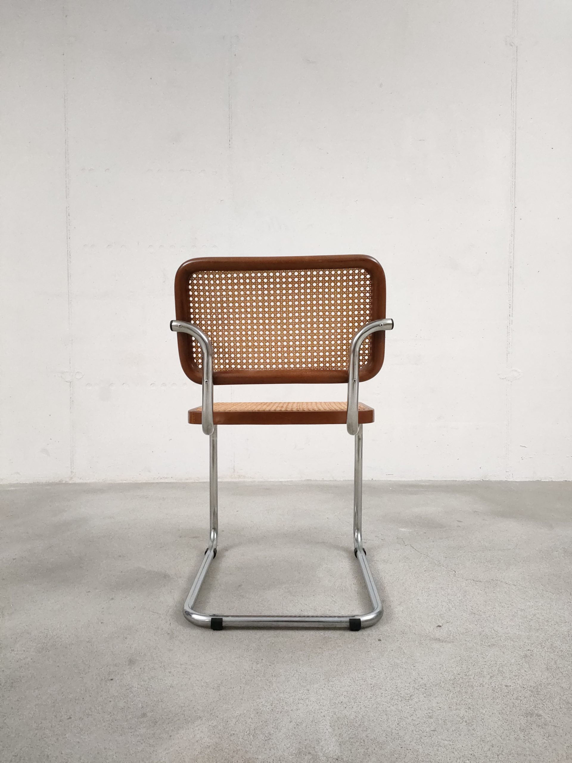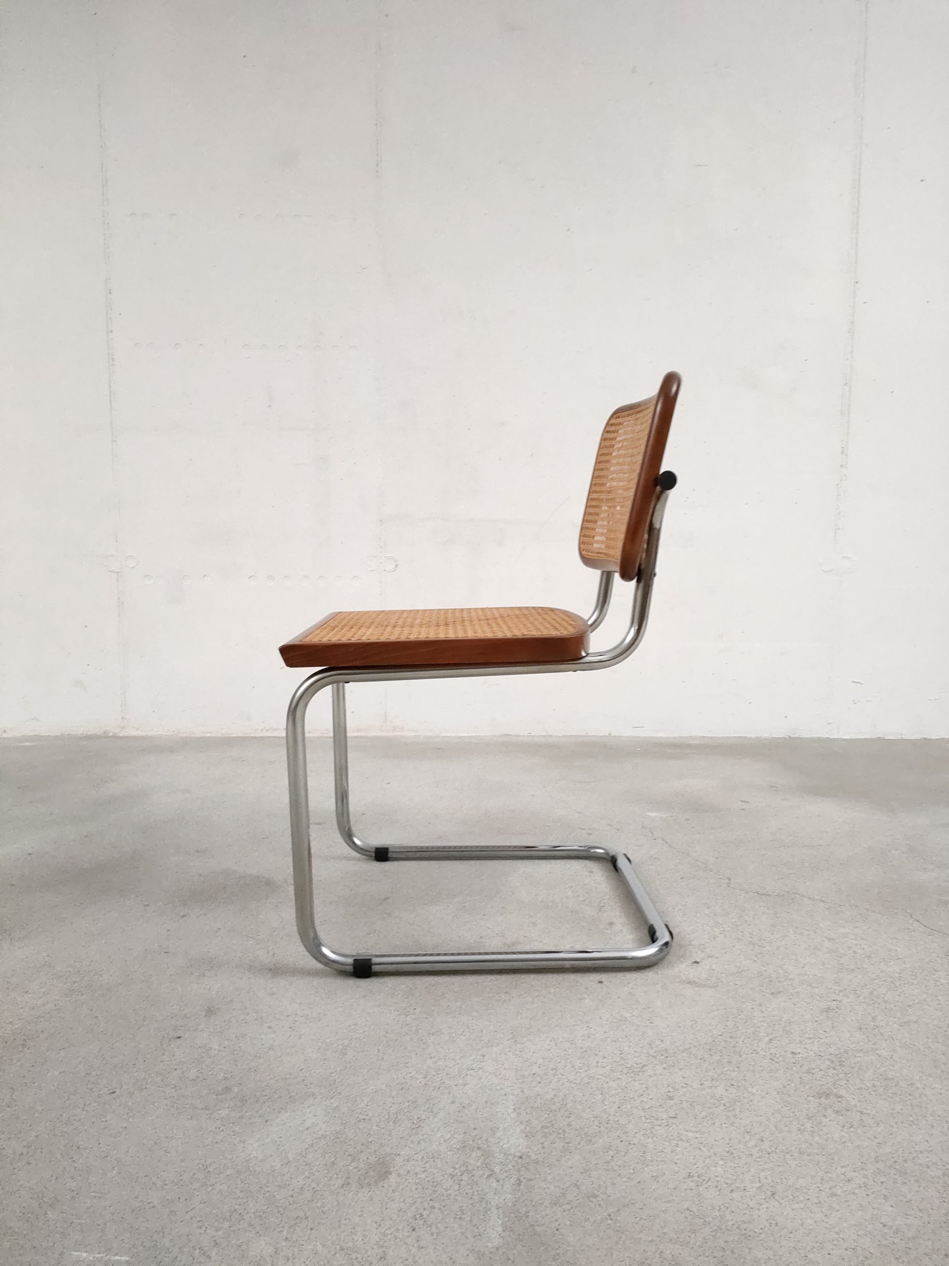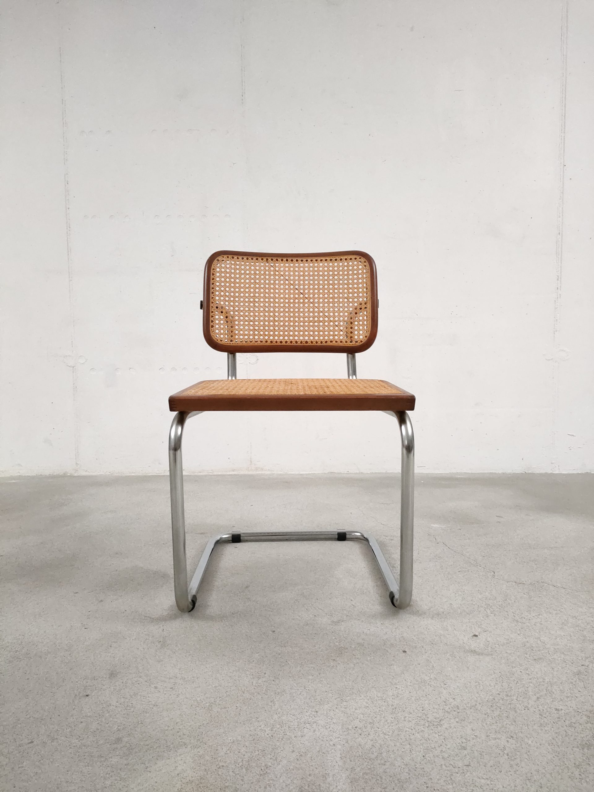 Produit venduChaise vintage avec structure tubulaire en métal et assise et dossier en bois et cannage. Production italienne. Le cannage est en bon état et la chaise est parfaitement fonctionnelle. Une trace et une décoloration au niveau de l’assise sont présentes mais elle sont visibles surtout depuis le bas (voir photos). Hauteur d’assise: 46 cm.