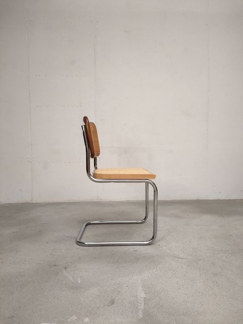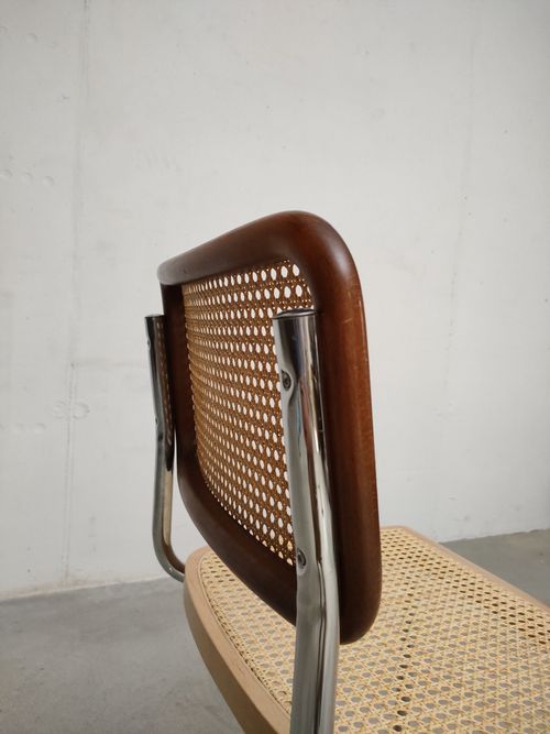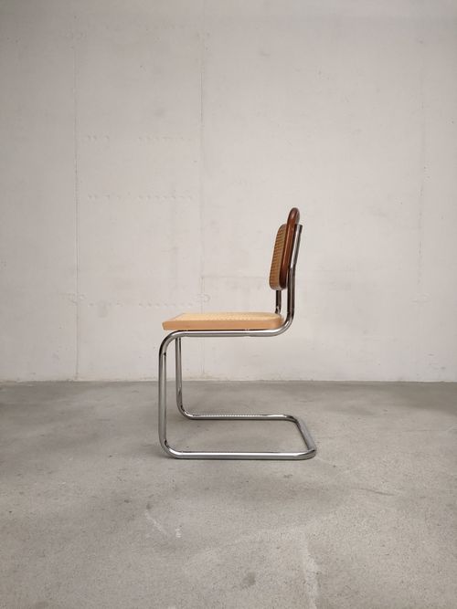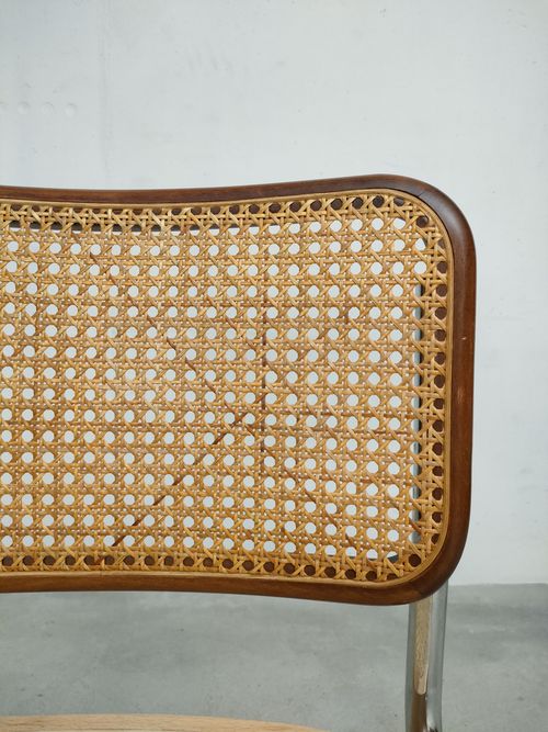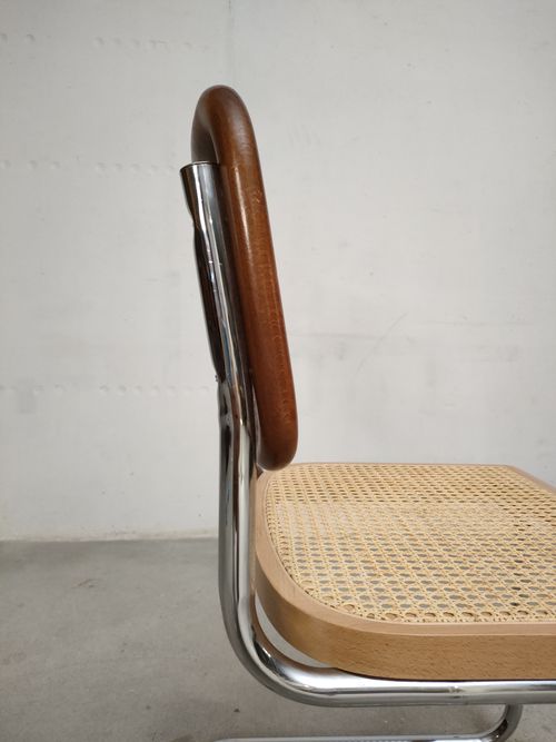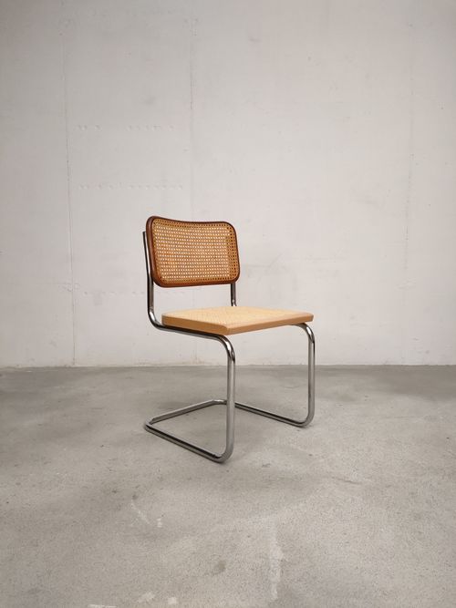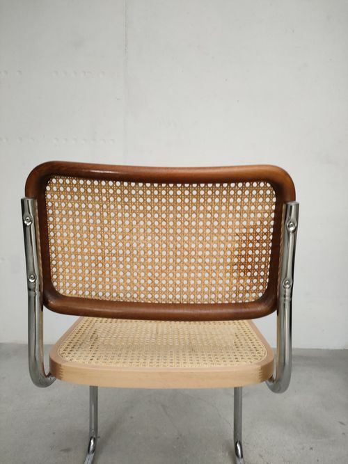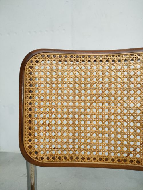 Chaise vintage avec structure en métal tubulaire et assise et dossier en bois et cannage. Quelques traces d’usure sur le bois du dossier (voir photos), cannage en très bon état. Hauteur de l’assise: 44.5 cm.