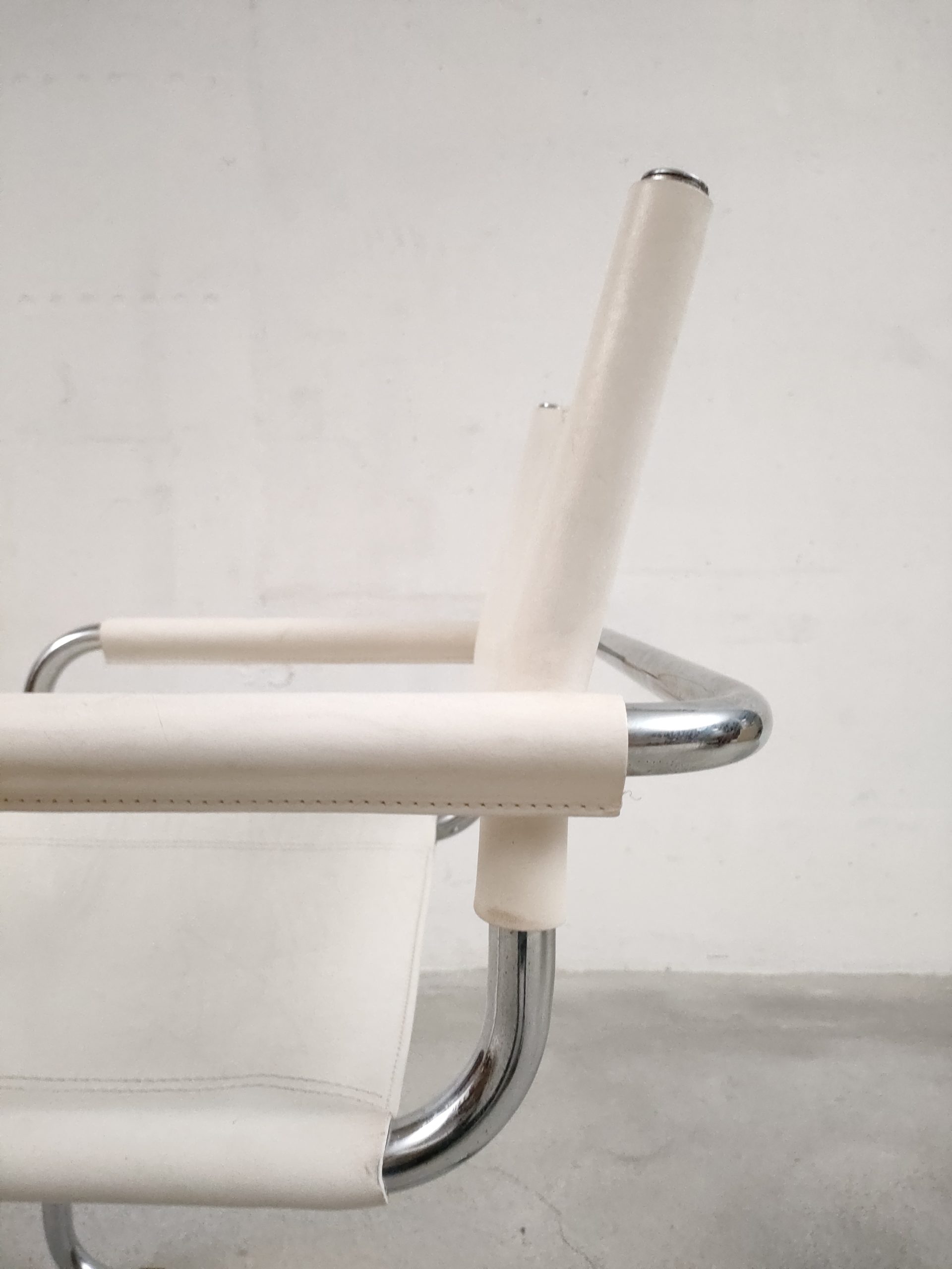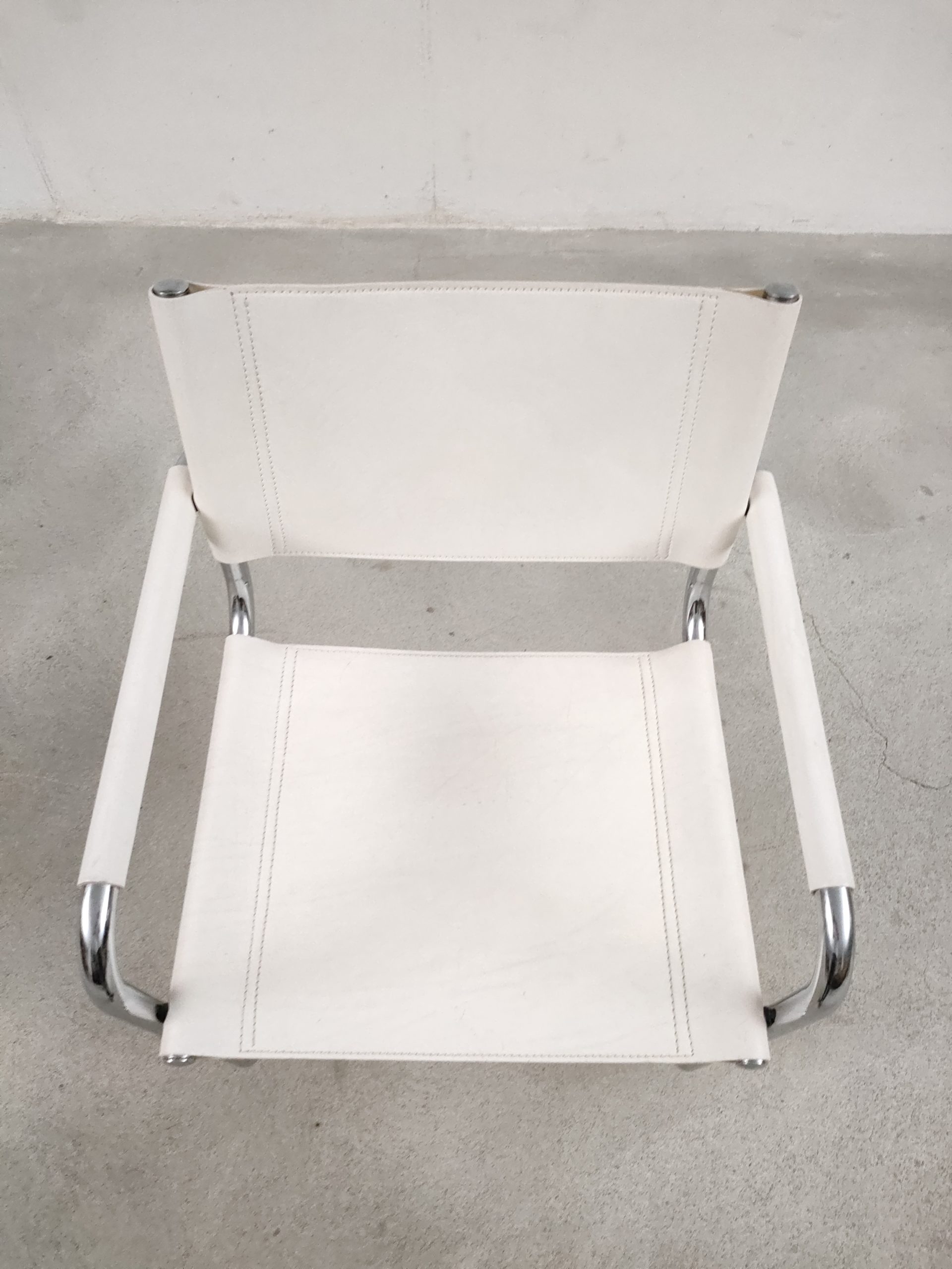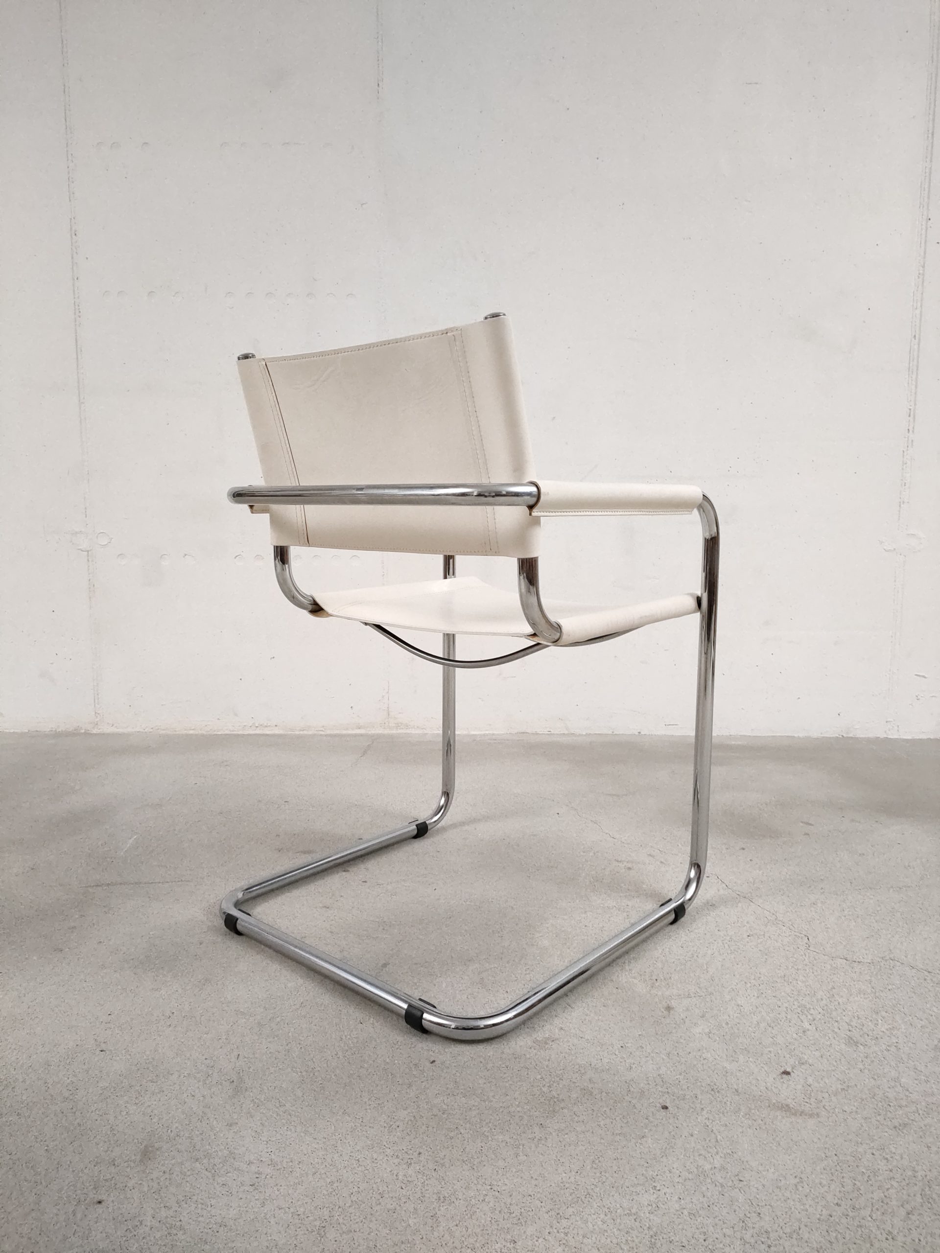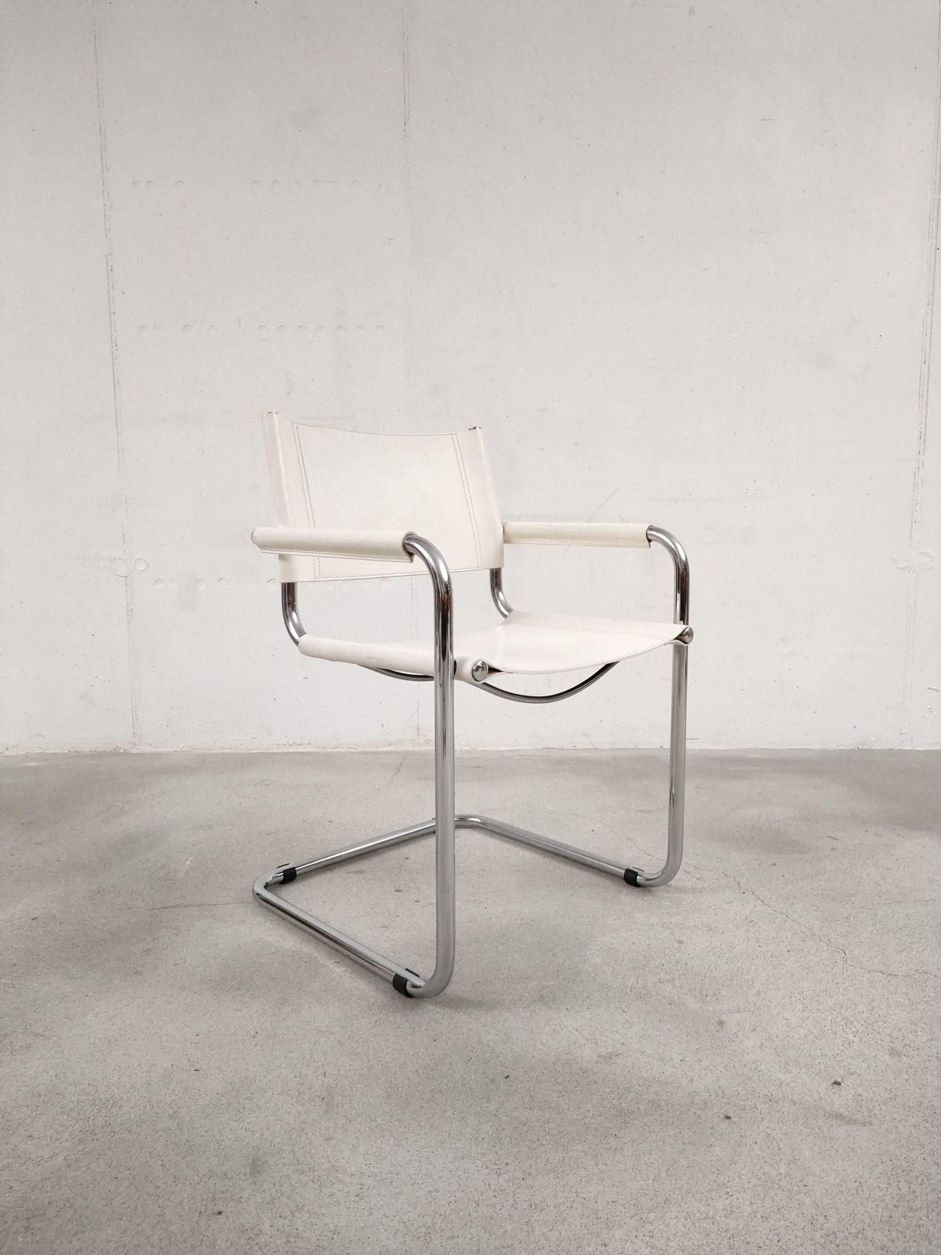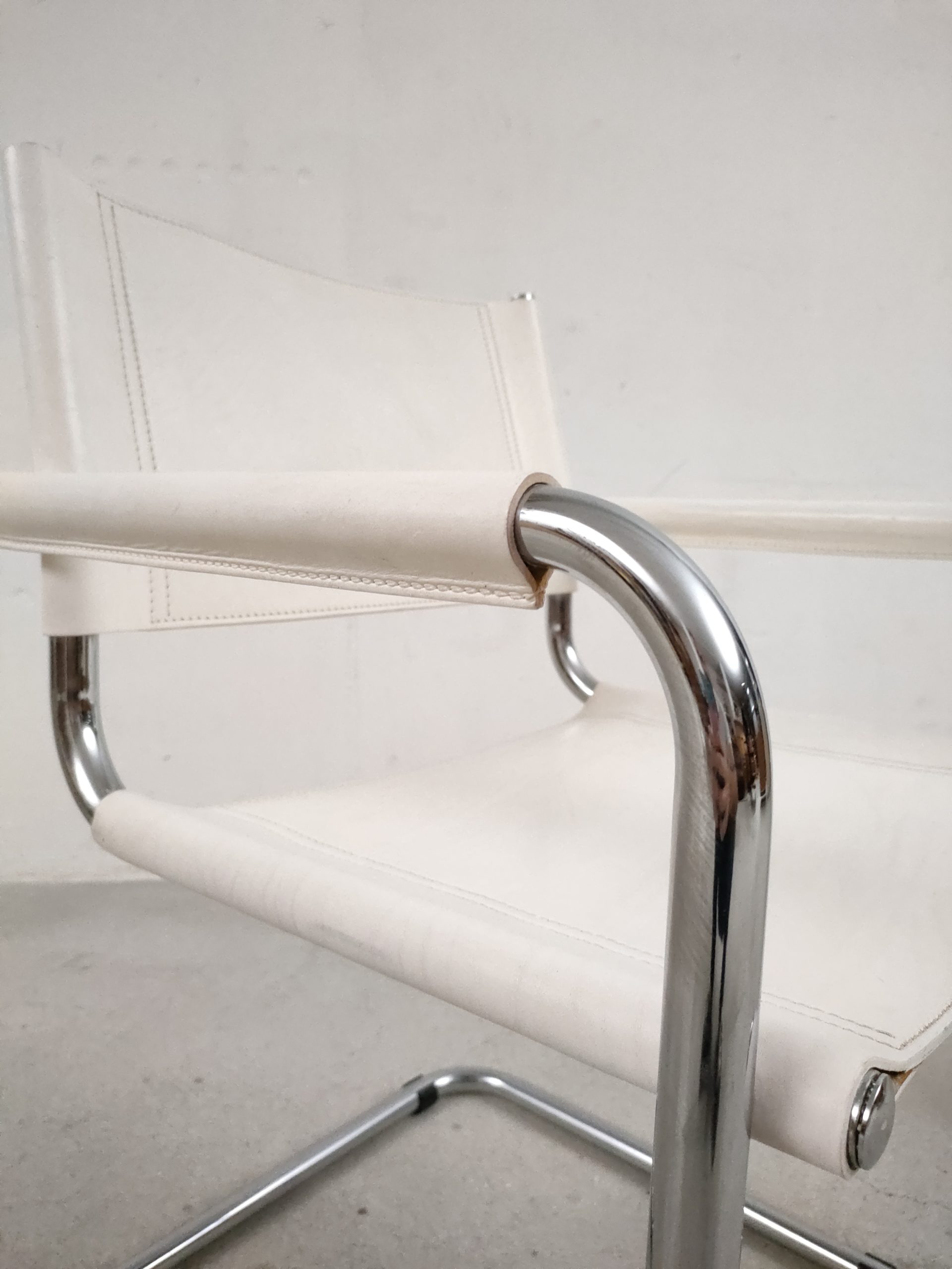 Produit venduChaise avec assise, dossier et accoudoirs en cuir et structure tubulaire en métal. Quelques traces d’usure sur le cuir (voir photos). Stable et solide et parfaitement fonctionnelle.
