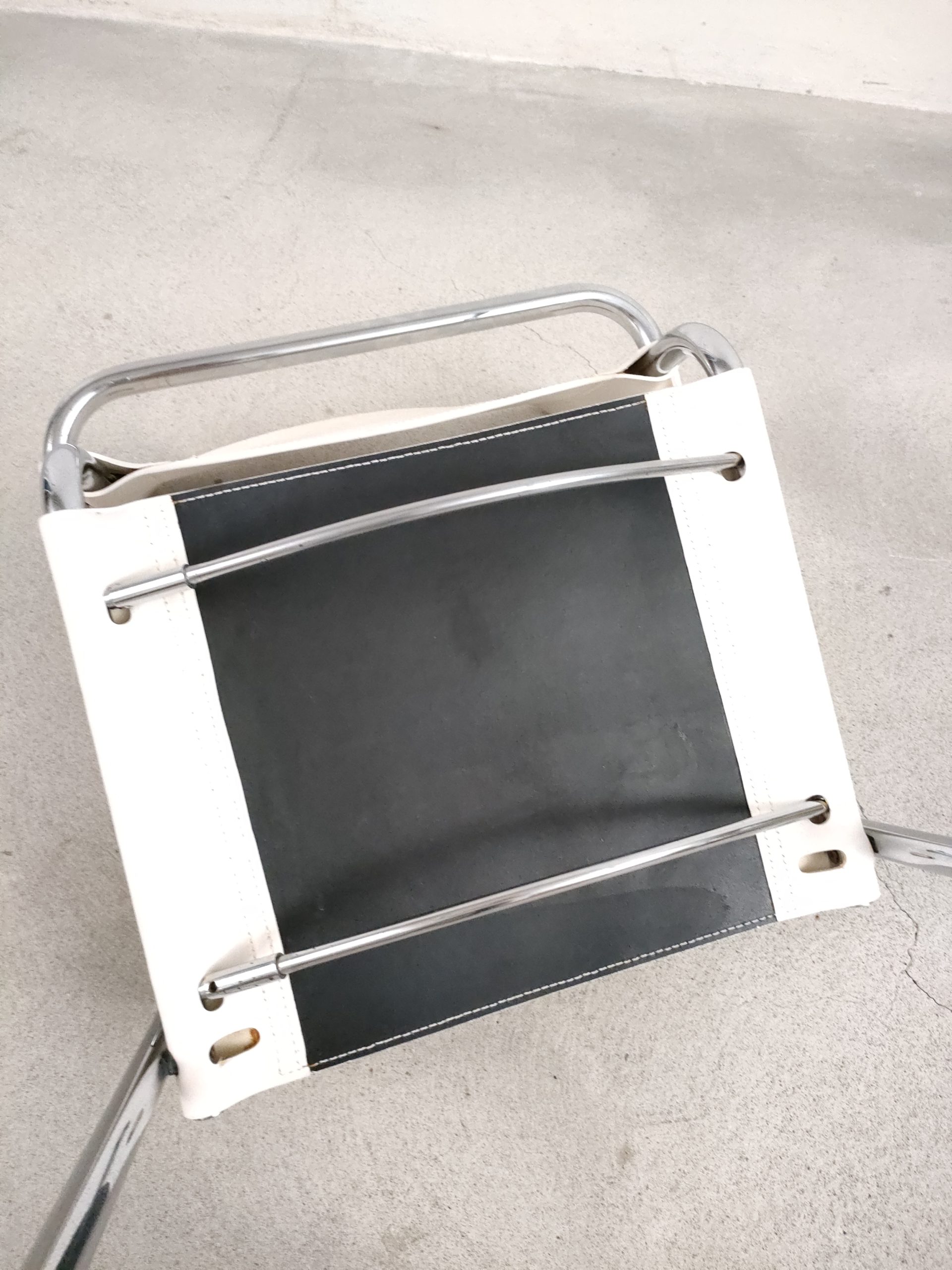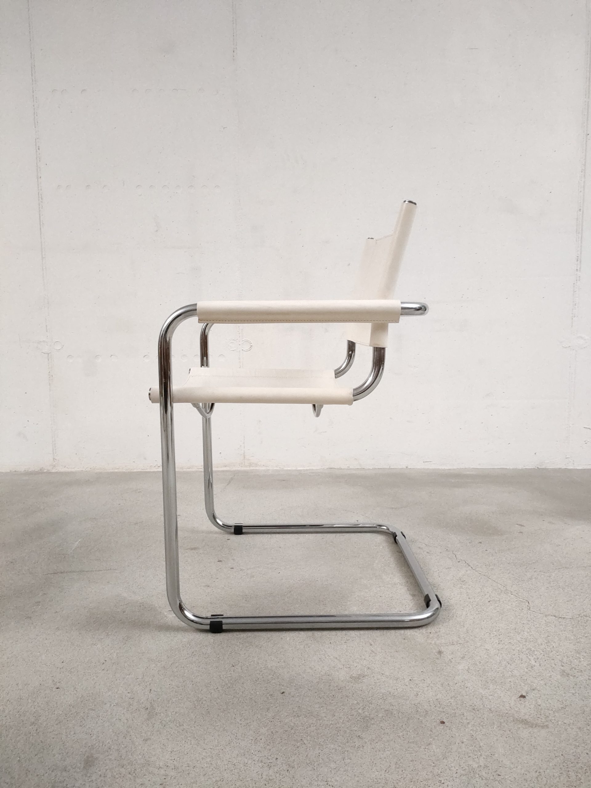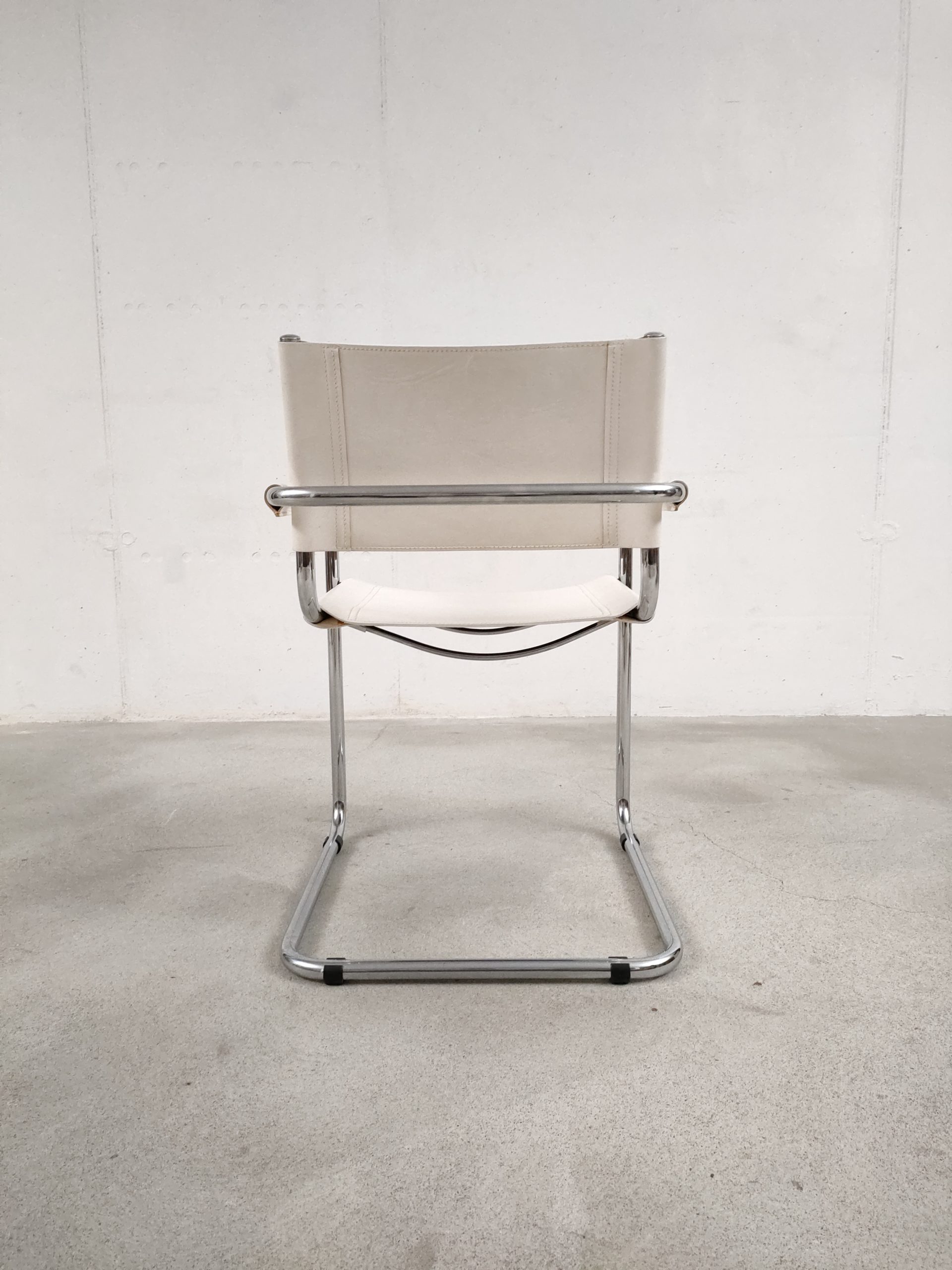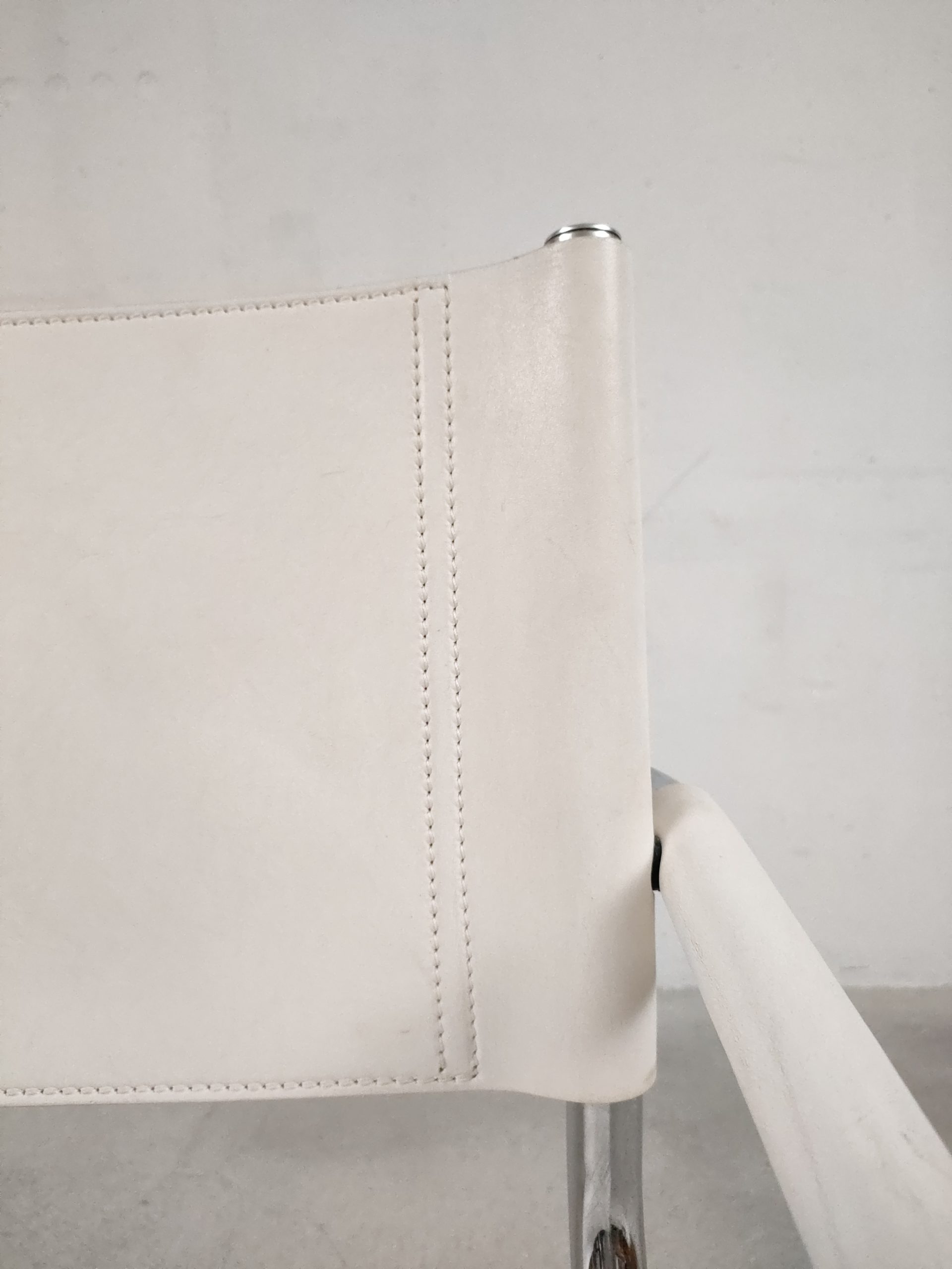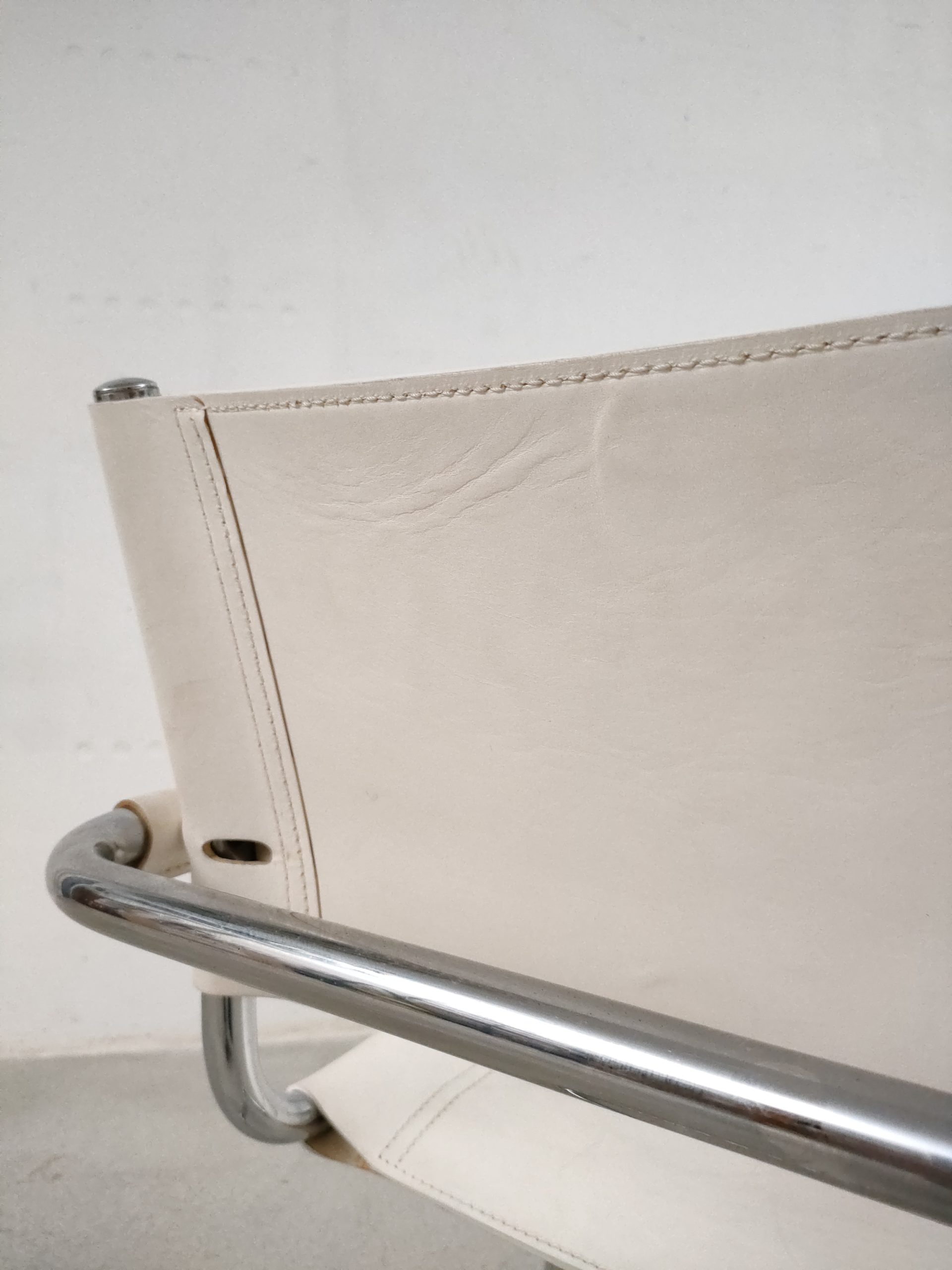 Produit venduChaise avec assise, dossier et accoudoirs en cuir et structure tubulaire en métal. Quelques traces d’usure sur le cuir (voir photos). Stable et solide et parfaitement fonctionnelle.