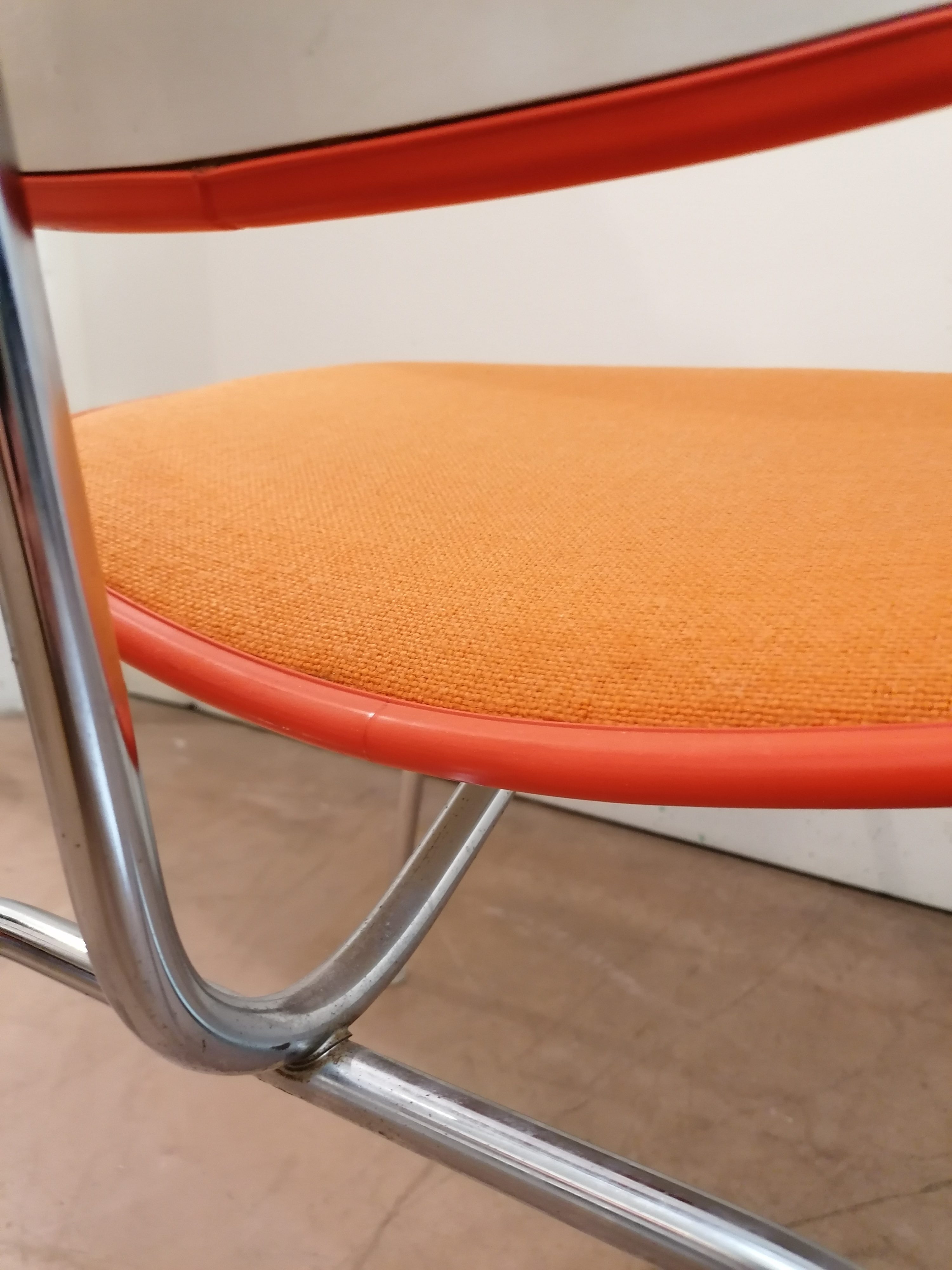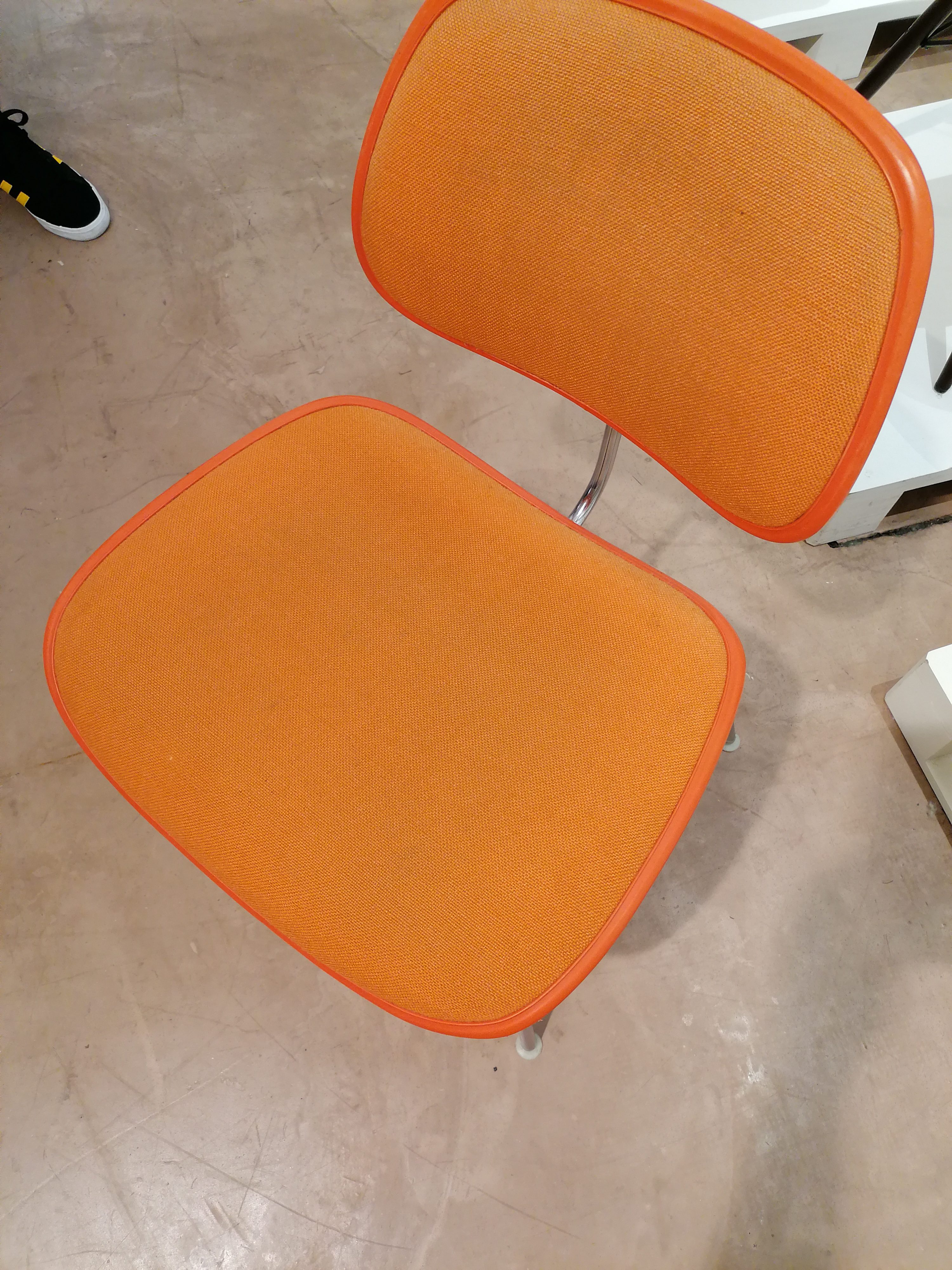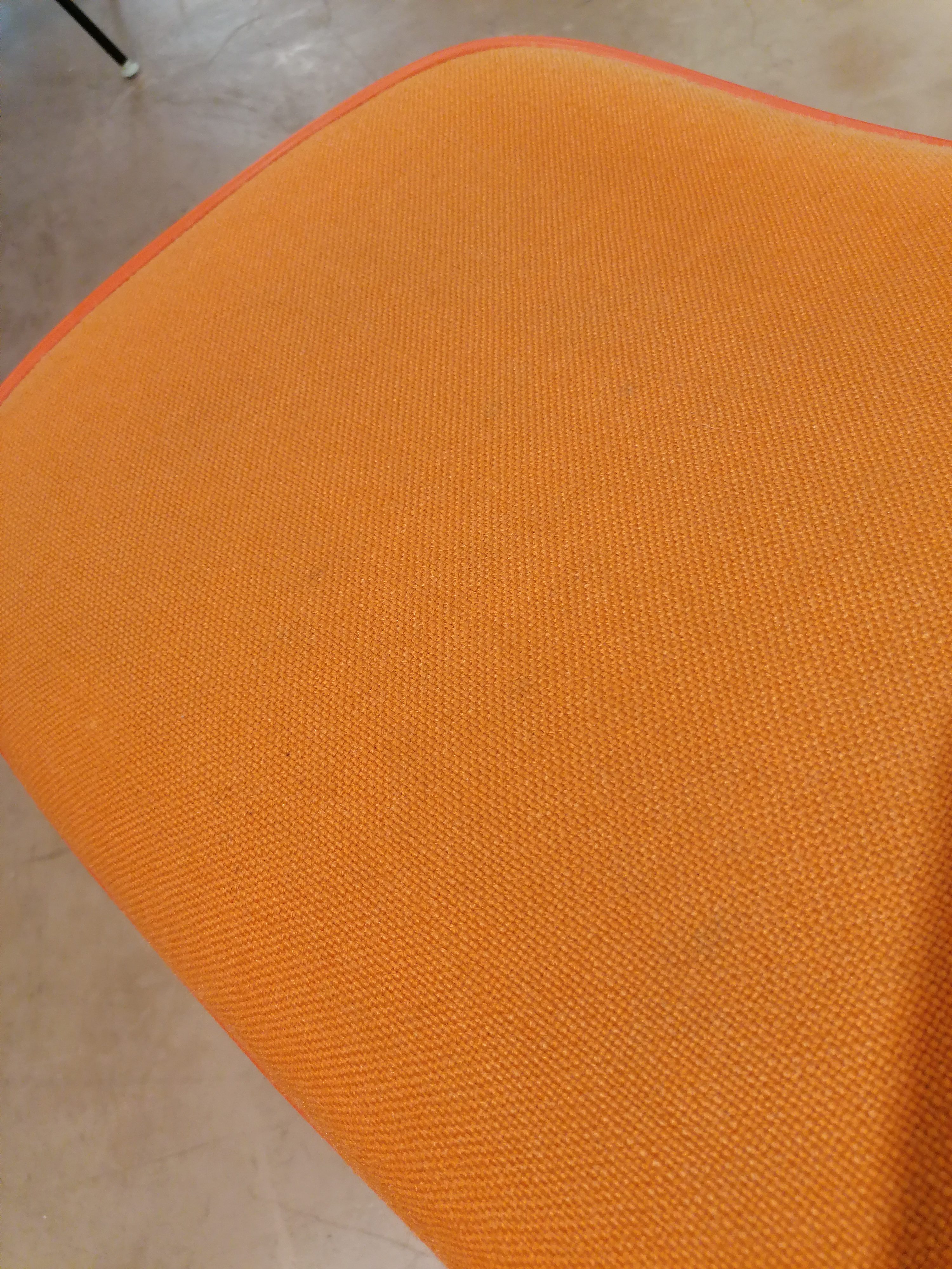 Le pied est en métal. Le plastique de l’assise et du dossier est fait de polyester et de fibre de verre. Les 2 parties plastiques sont rembourrées et recouvertes d’un tissu orange.