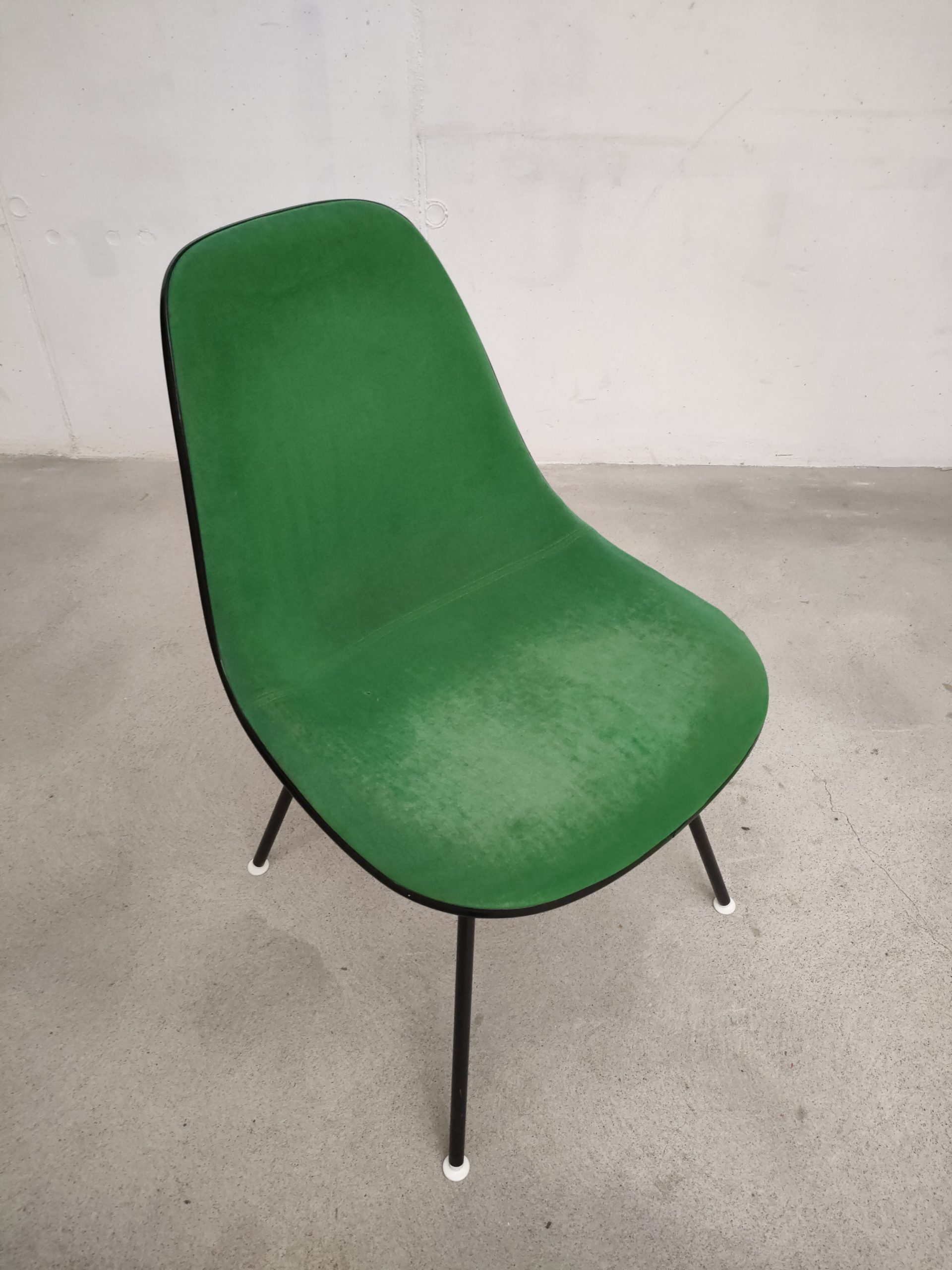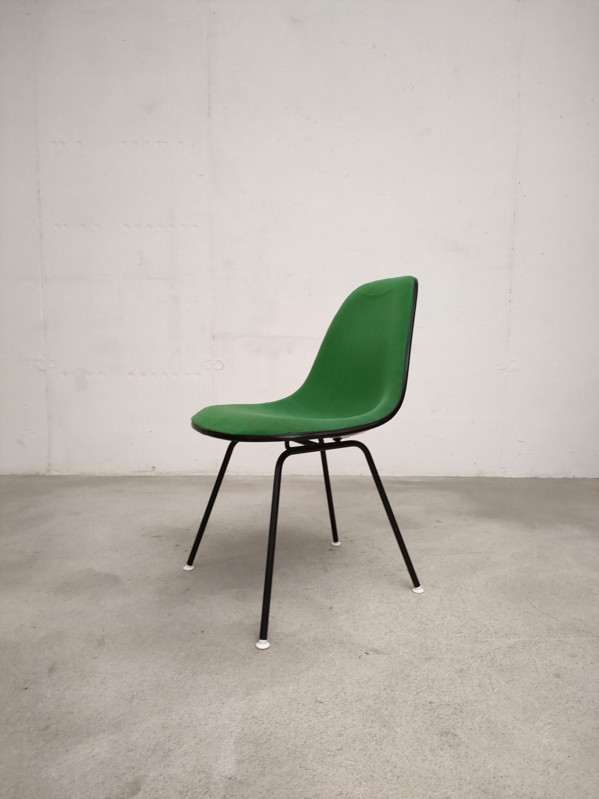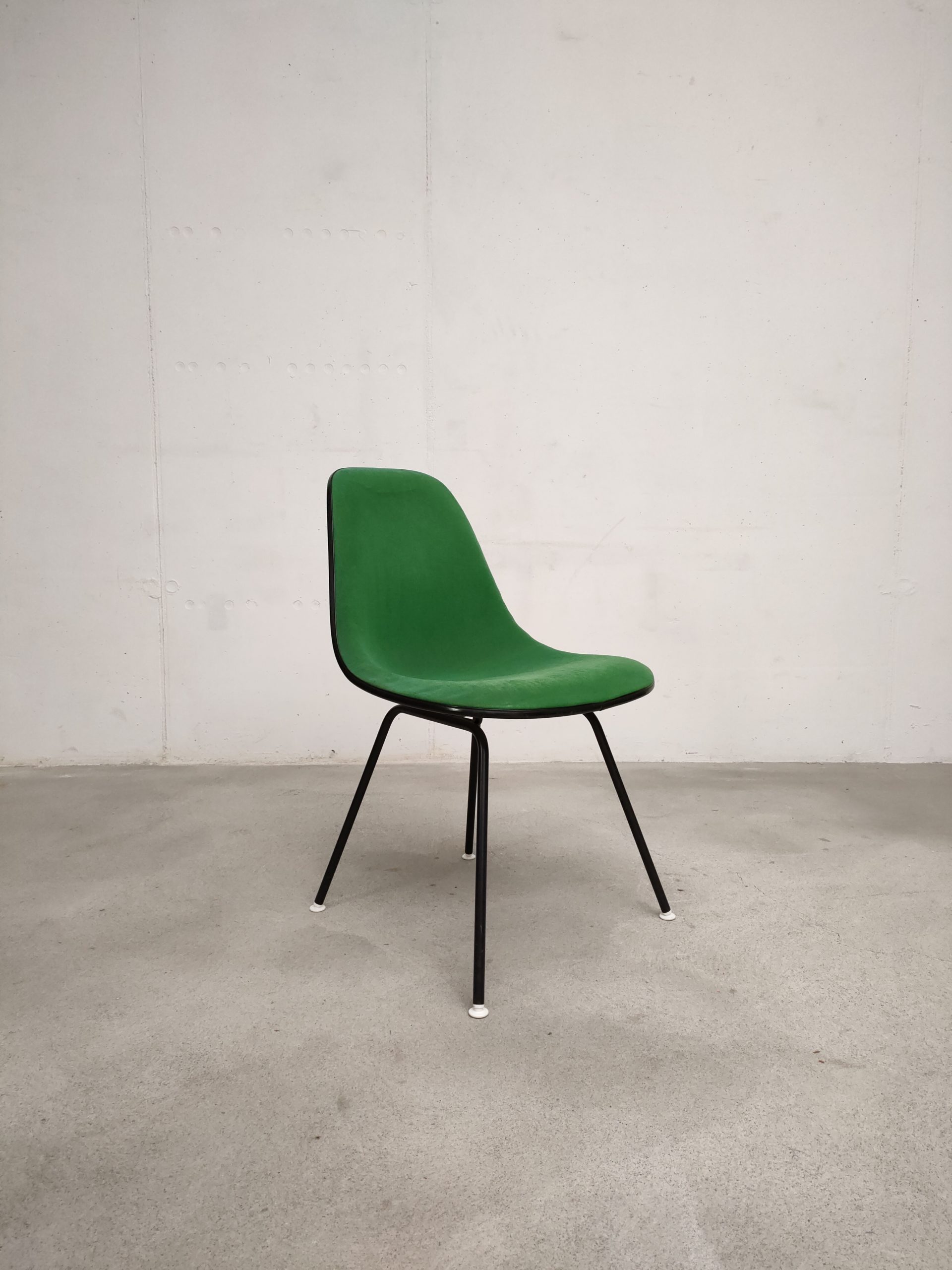 Produit venduChaise avec piètement en métal noir et coque en fibre de verre recouverte de tissu vert. Modèle DSX dessiné par Ray et Charles Eames et produite par Vitra dans les années 70. Le tissu est usé au niveau de l’assise (voir photos) et présente quelques imperfections, la mousse ainsi qua la structure sont toujours en bon état. Hauteur de l’assise: 47 cm.