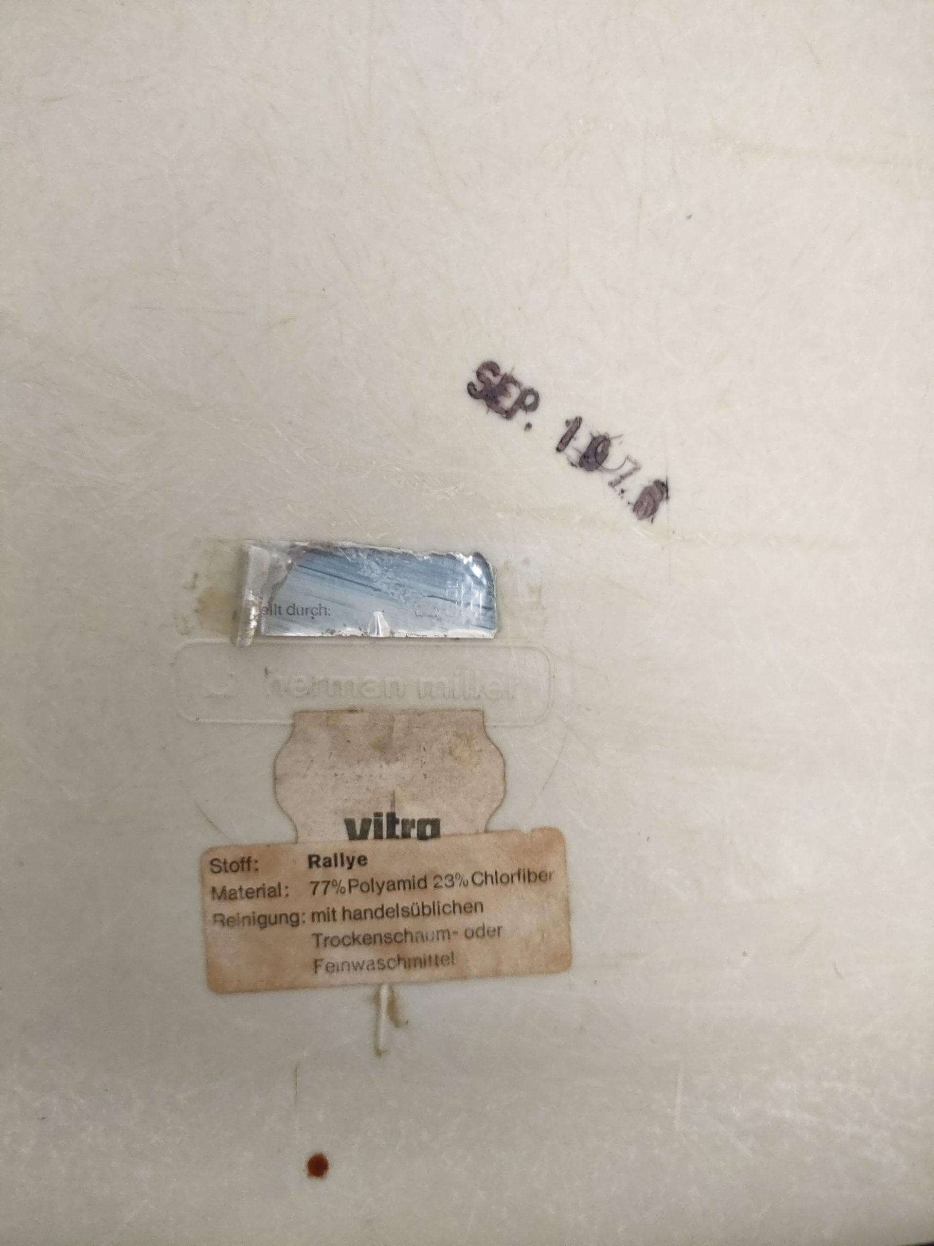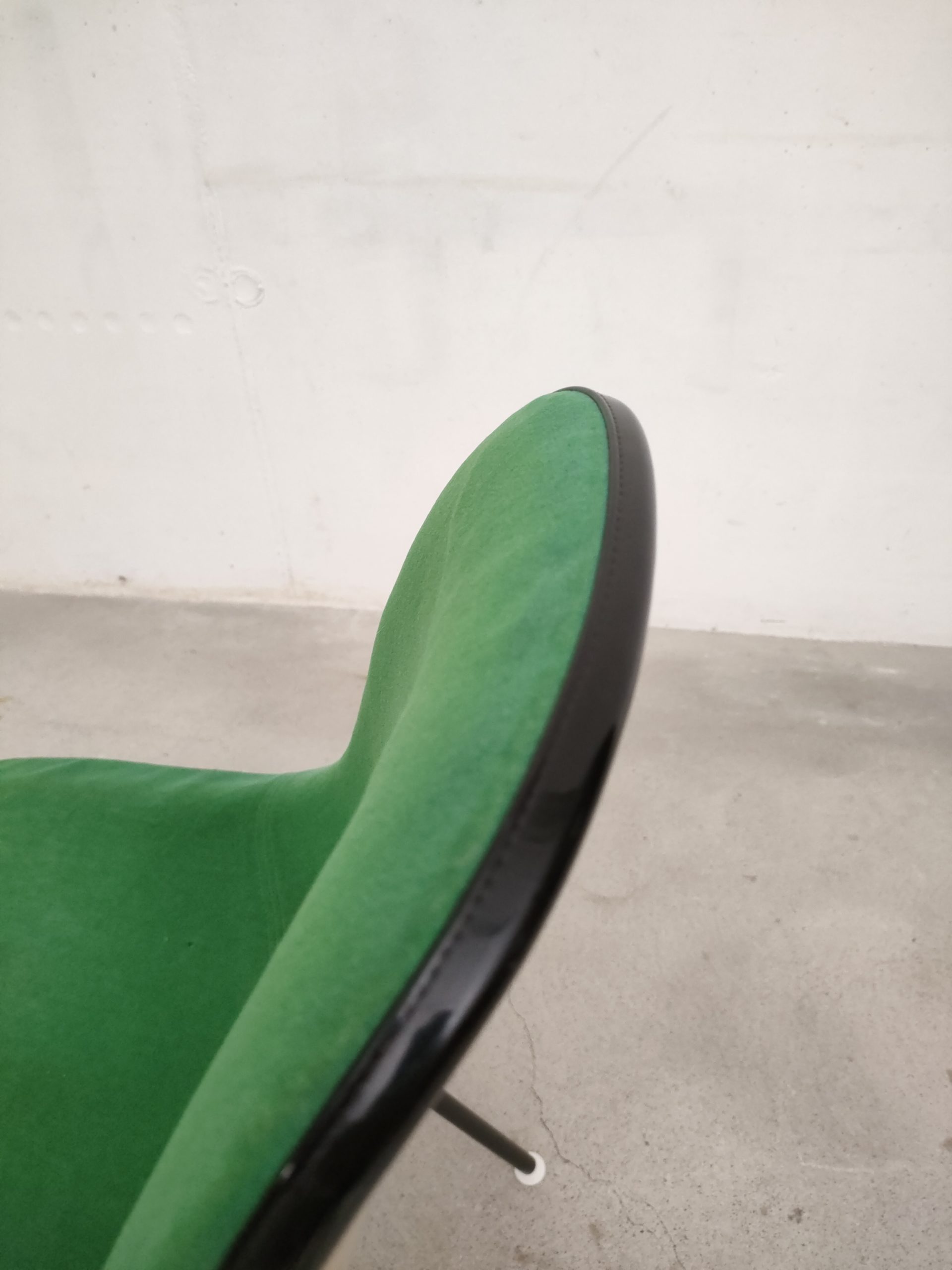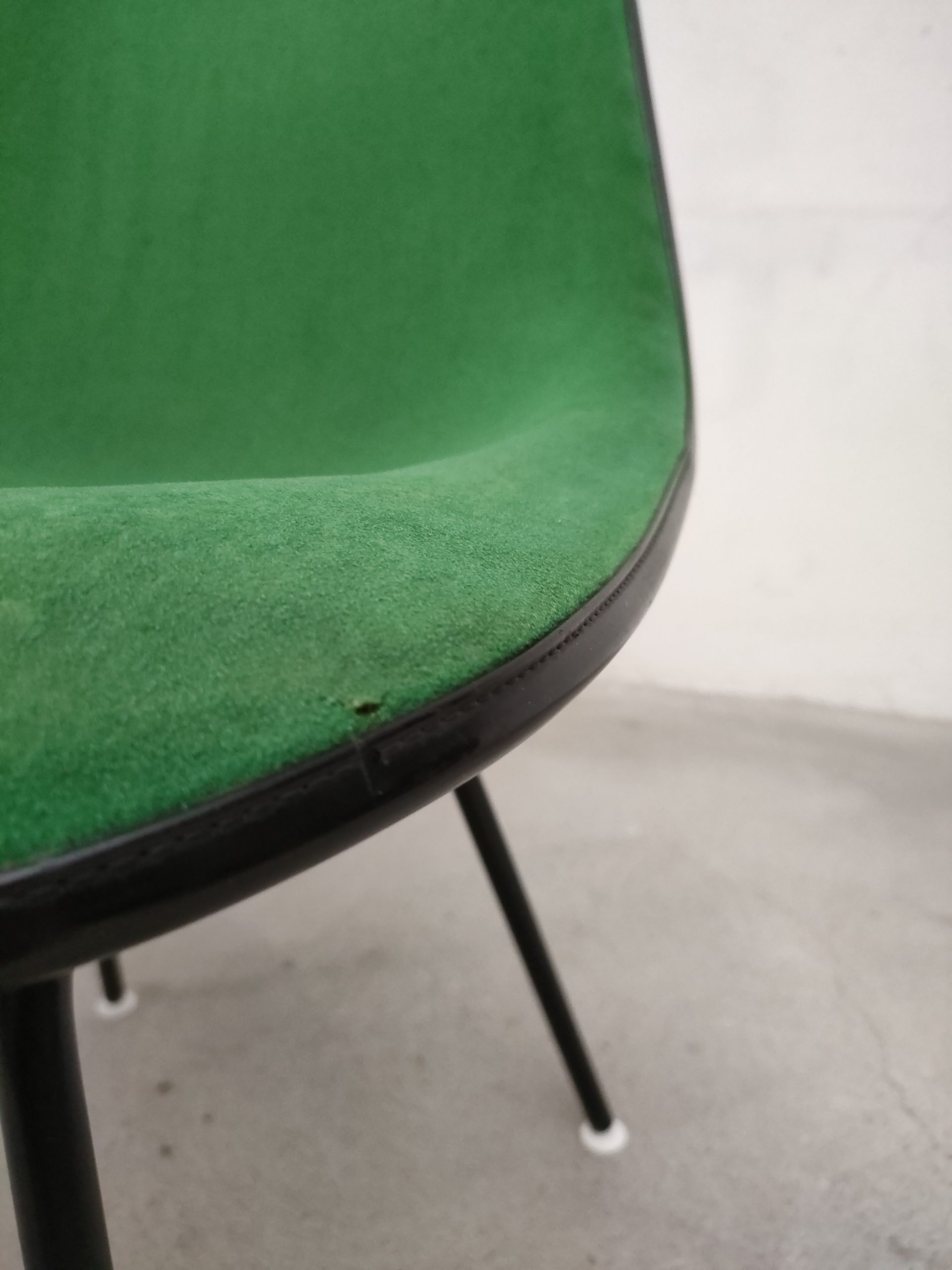 Produit venduChaise avec piètement en métal noir et coque en fibre de verre recouverte de tissu vert. Modèle DSX dessiné par Ray et Charles Eames et produite par Vitra dans les années 70. Le tissu est usé au niveau de l’assise (voir photos) et présente quelques imperfections, la mousse ainsi qua la structure sont toujours en bon état. Hauteur de l’assise: 47 cm.