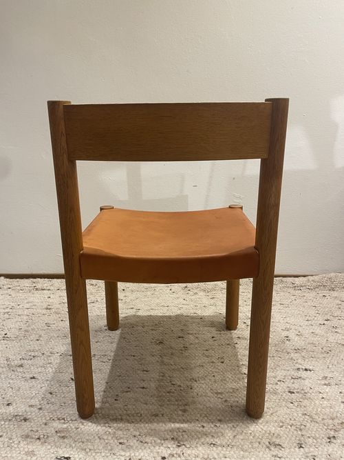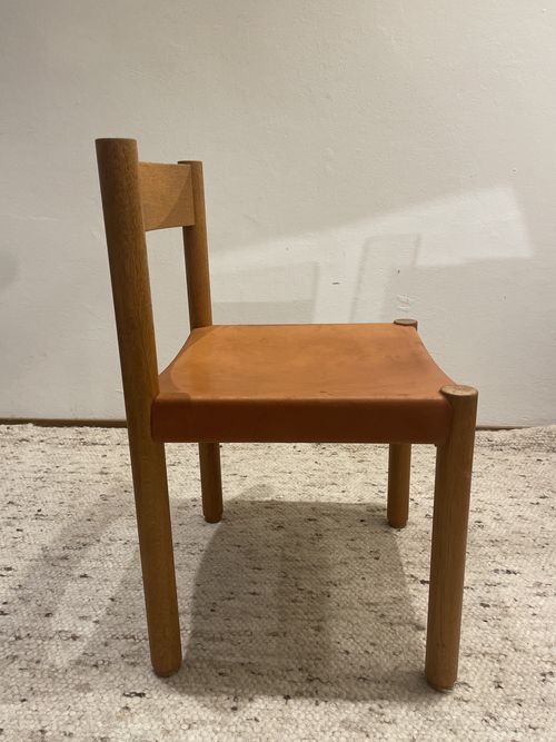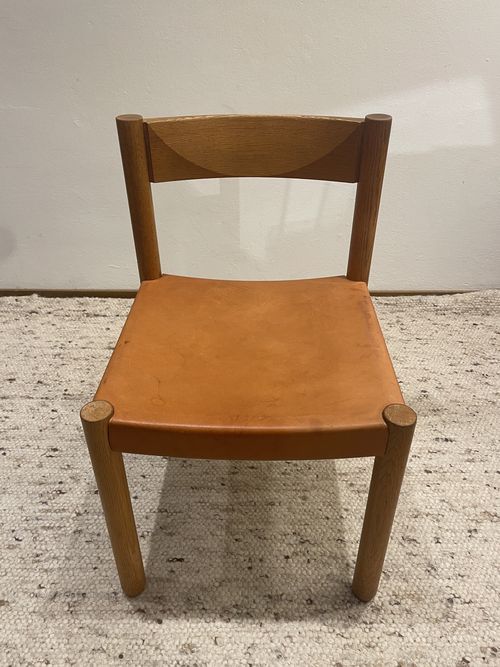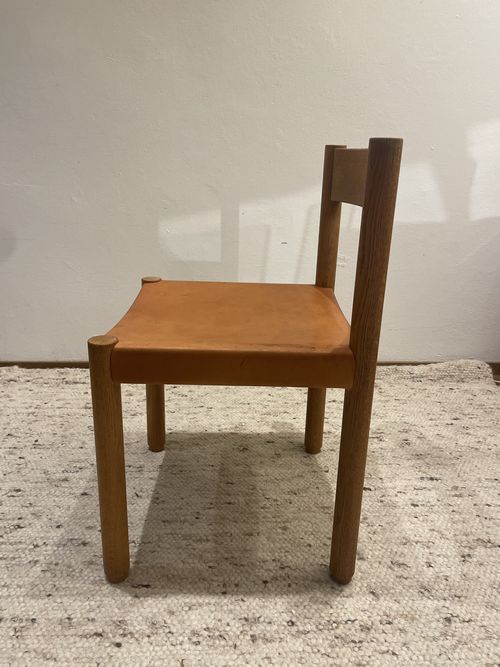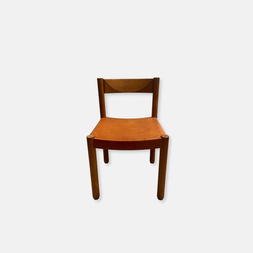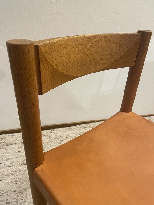 Produit venduChaise en bois et cuir de couleur camel, fabrication Suisse des années 60, dans le goût de Pierre Chapo.