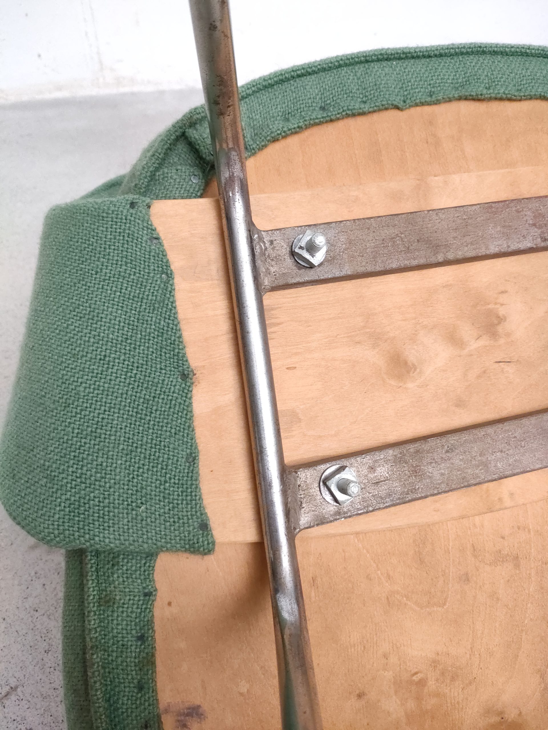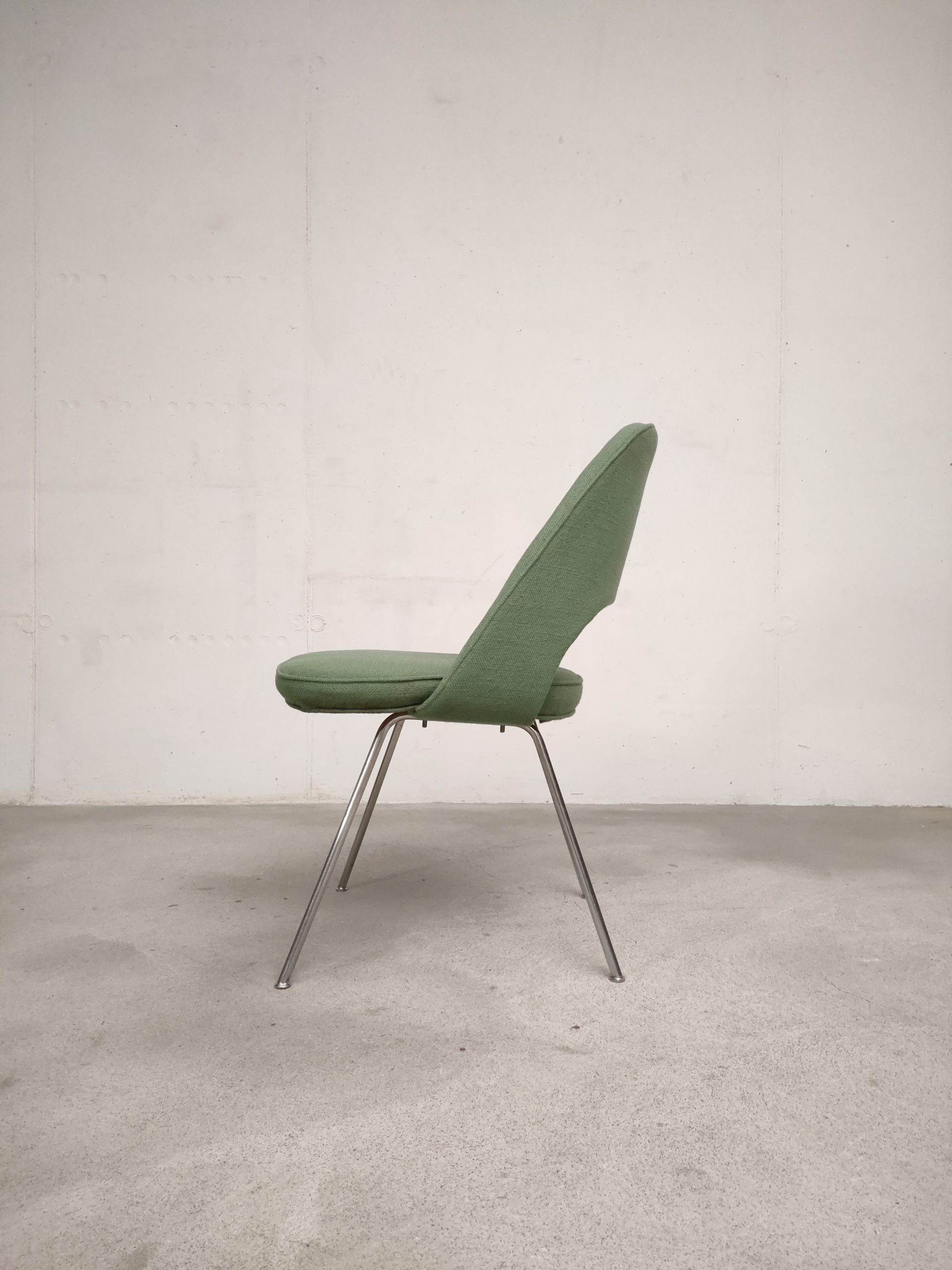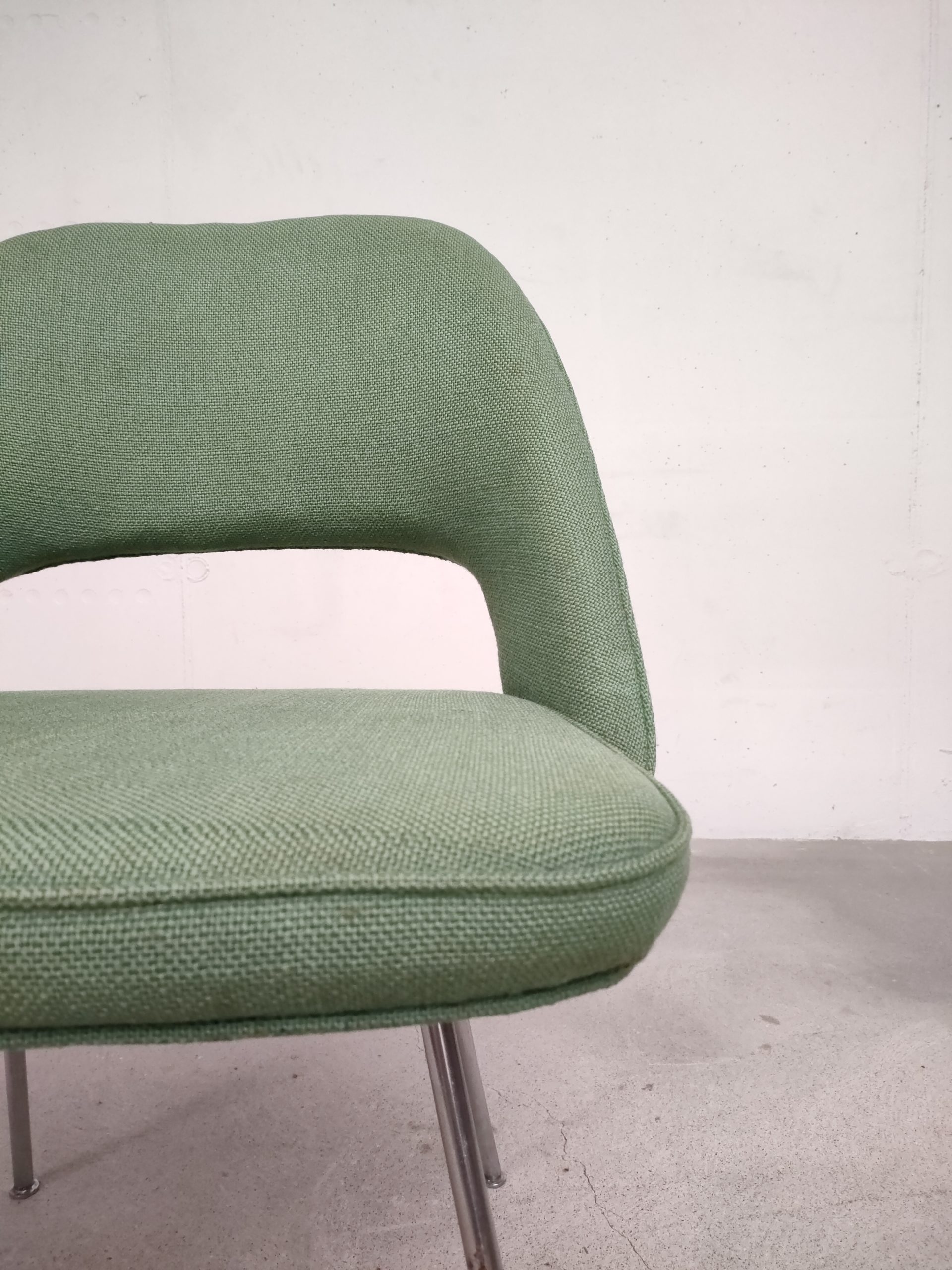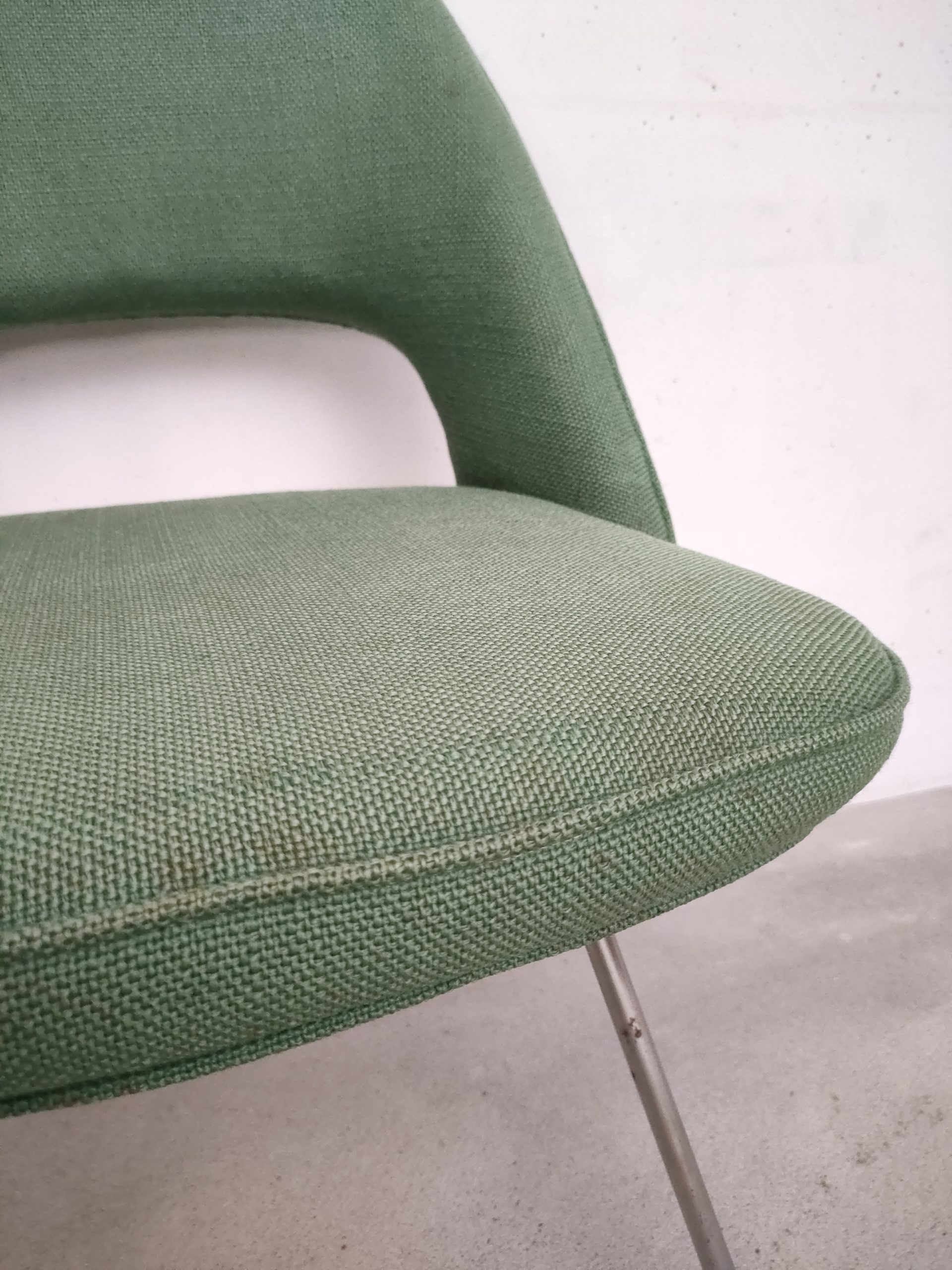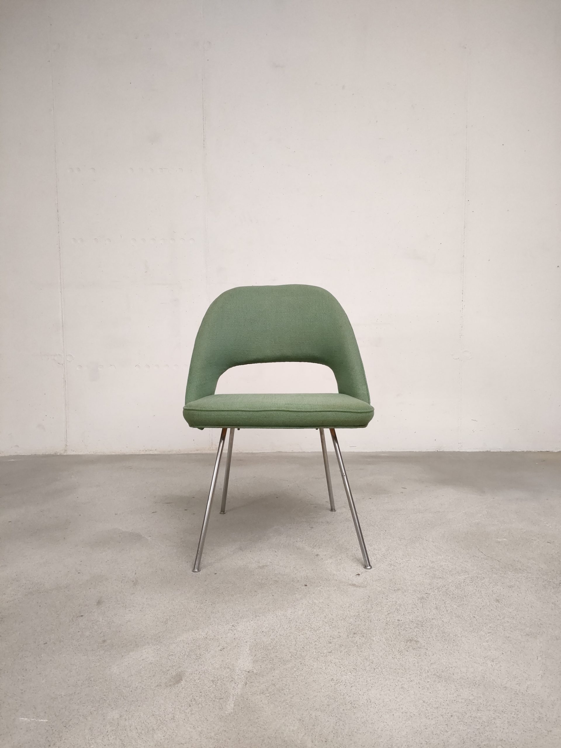 Produit venduChaise Executive avec piètement en métal est assise en bois avec tissu vert. Attribuée à Eero Saarinen pour Knoll (pas d’étiquette du fabricant). La chaise est stable et solide, le tissu ainsi que la mousse en bon état. Hauteur de l’assise: 45 cm.