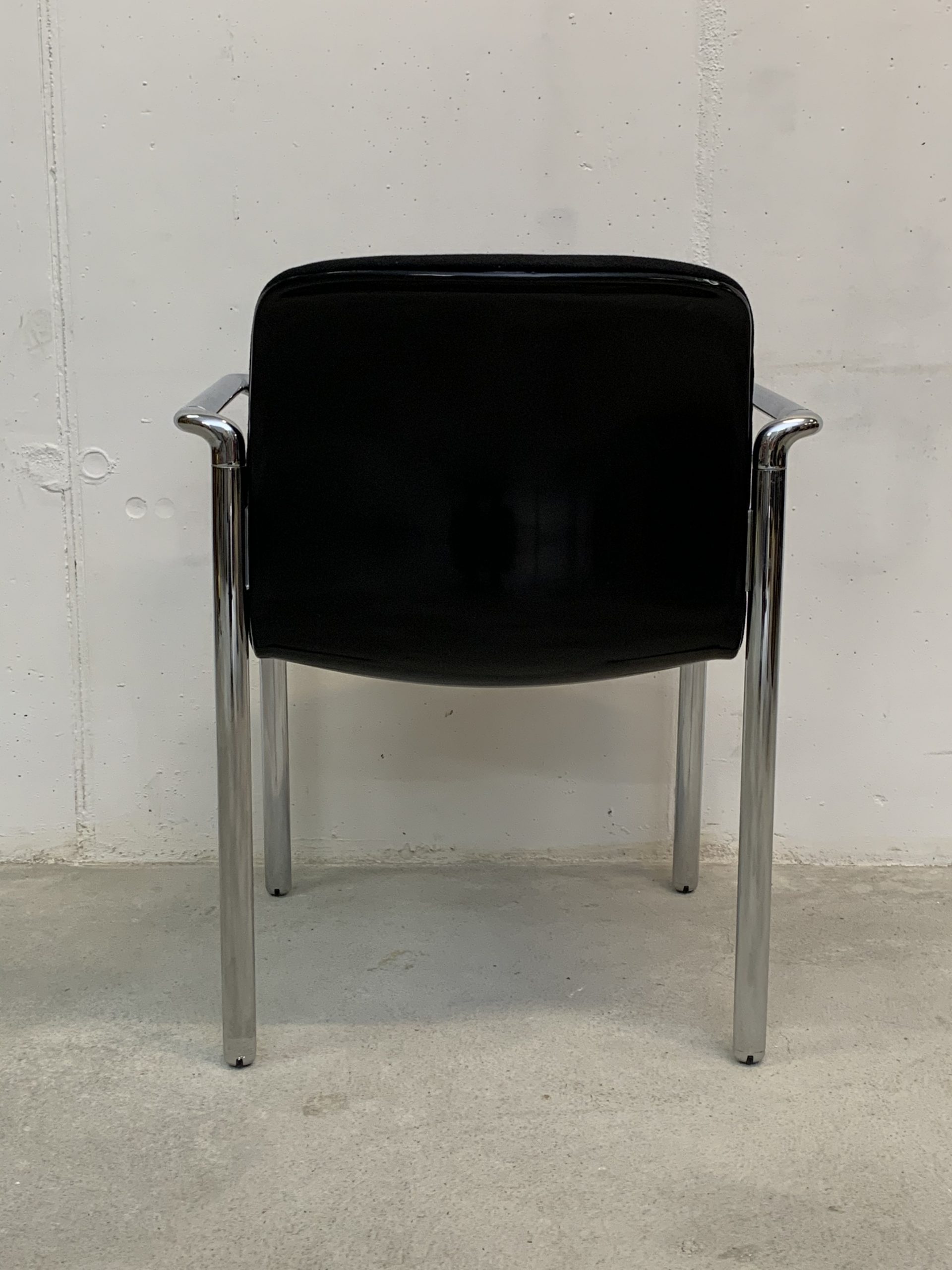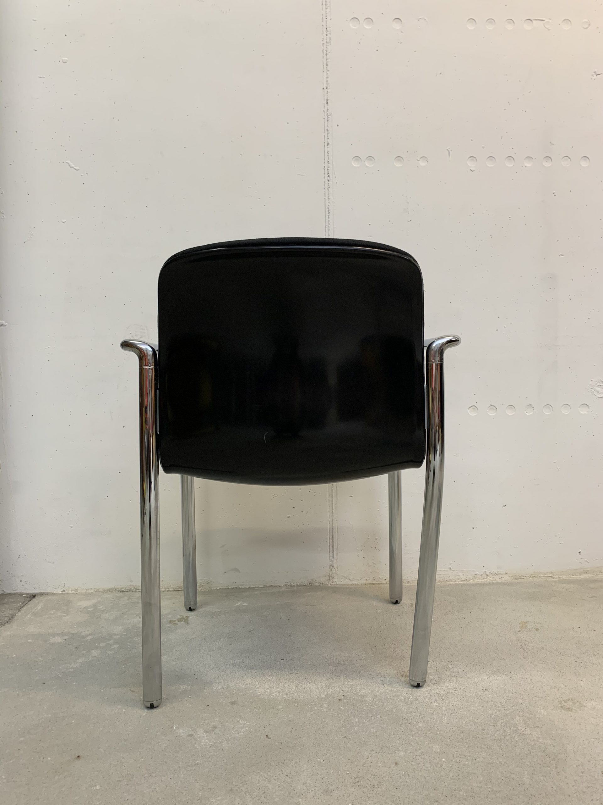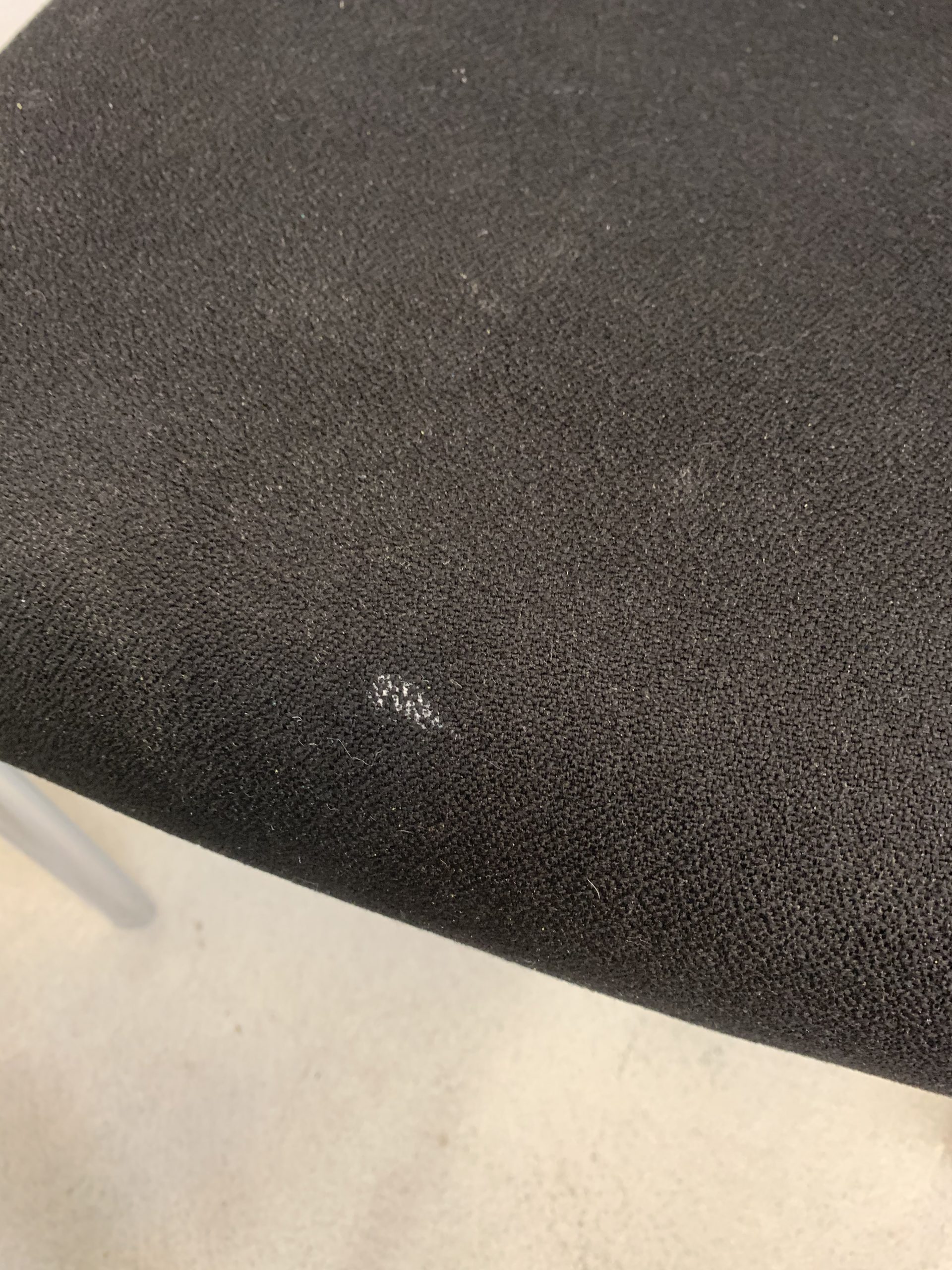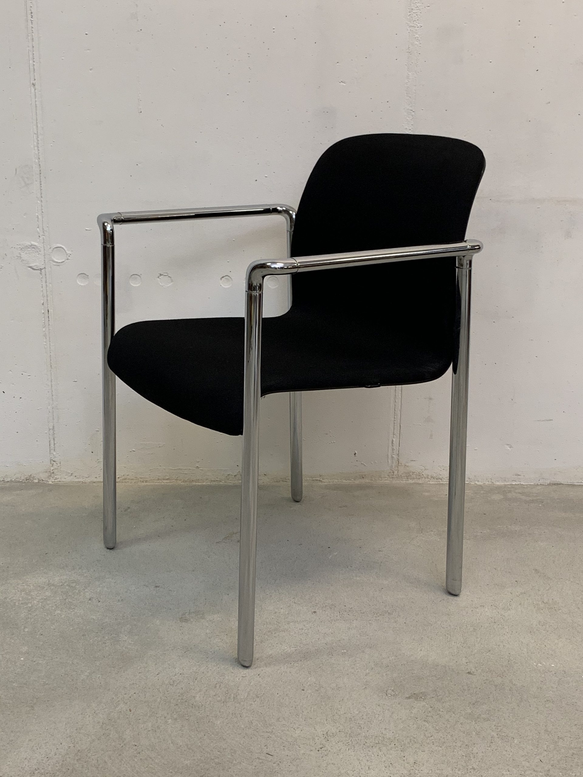 Le piétement en métal chromé est en très bon état, il brille presque comme au premier jour. La coque est en plastique et l’assise en textile très résistant qui présente quelques légères taches. La chaise est ergonomique et légèrement rembourrée. Les pieds ont des petits patins en plastique intégrés. Hauteur de l’assise: 45 cm.
