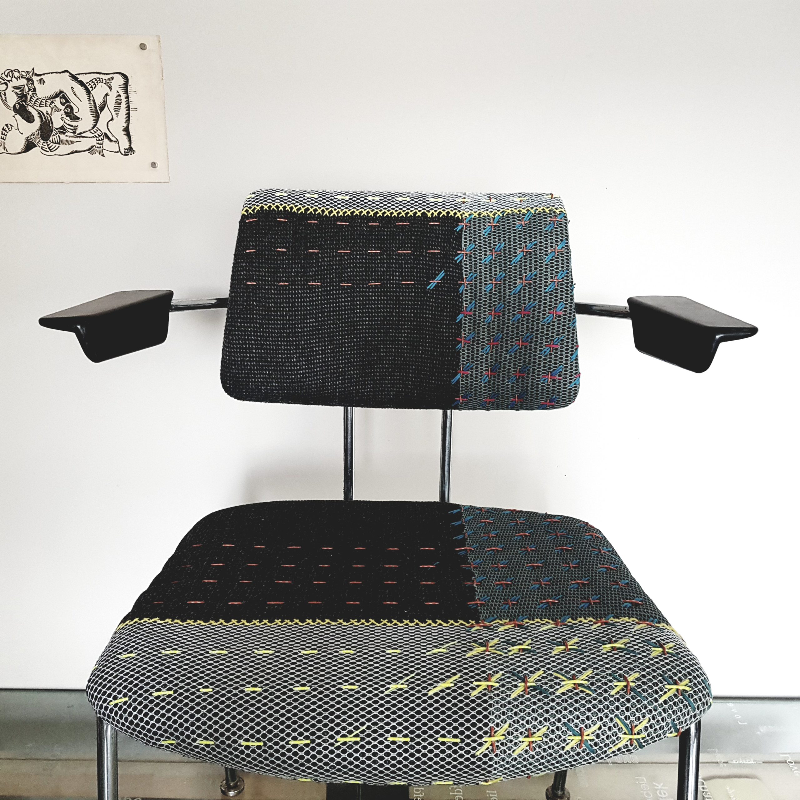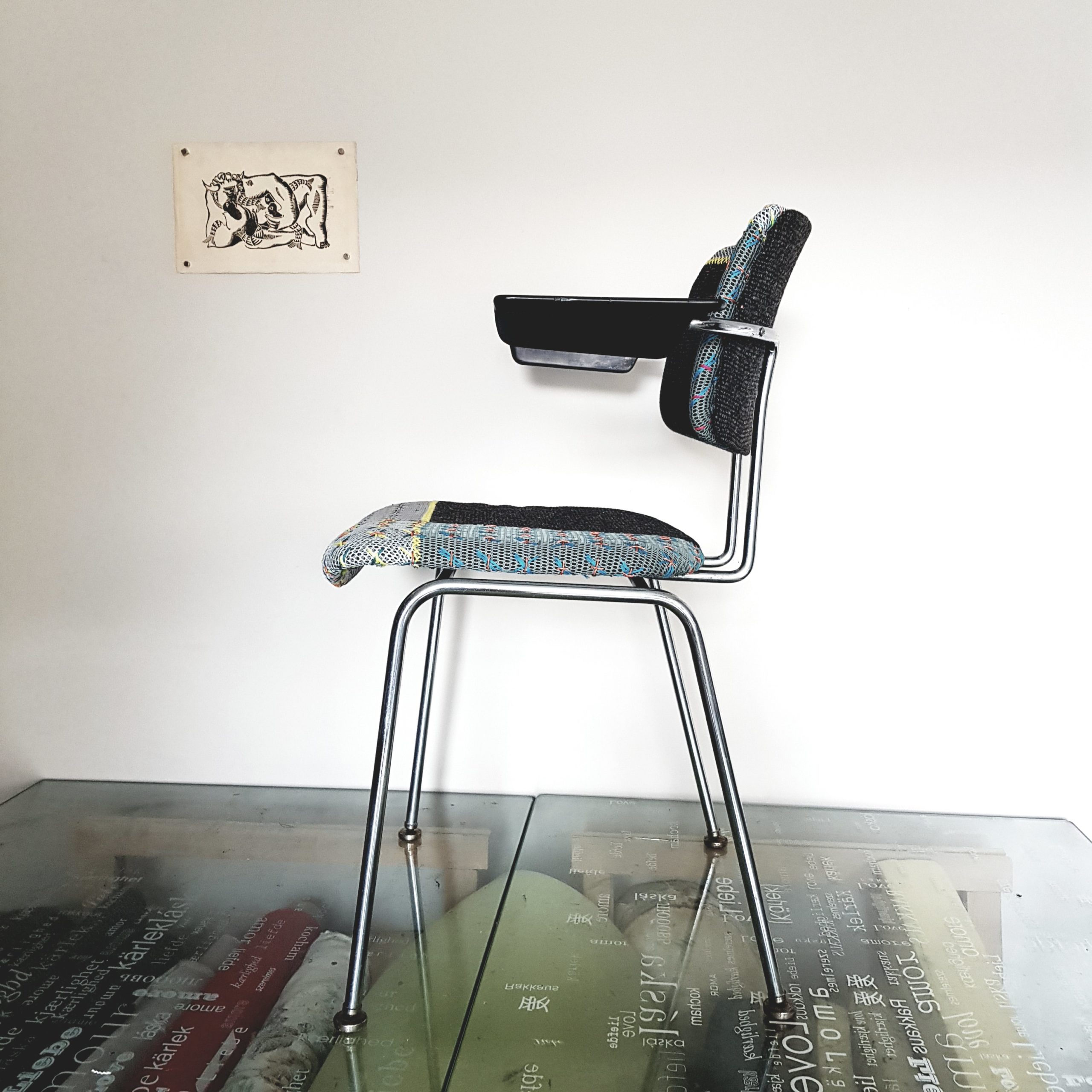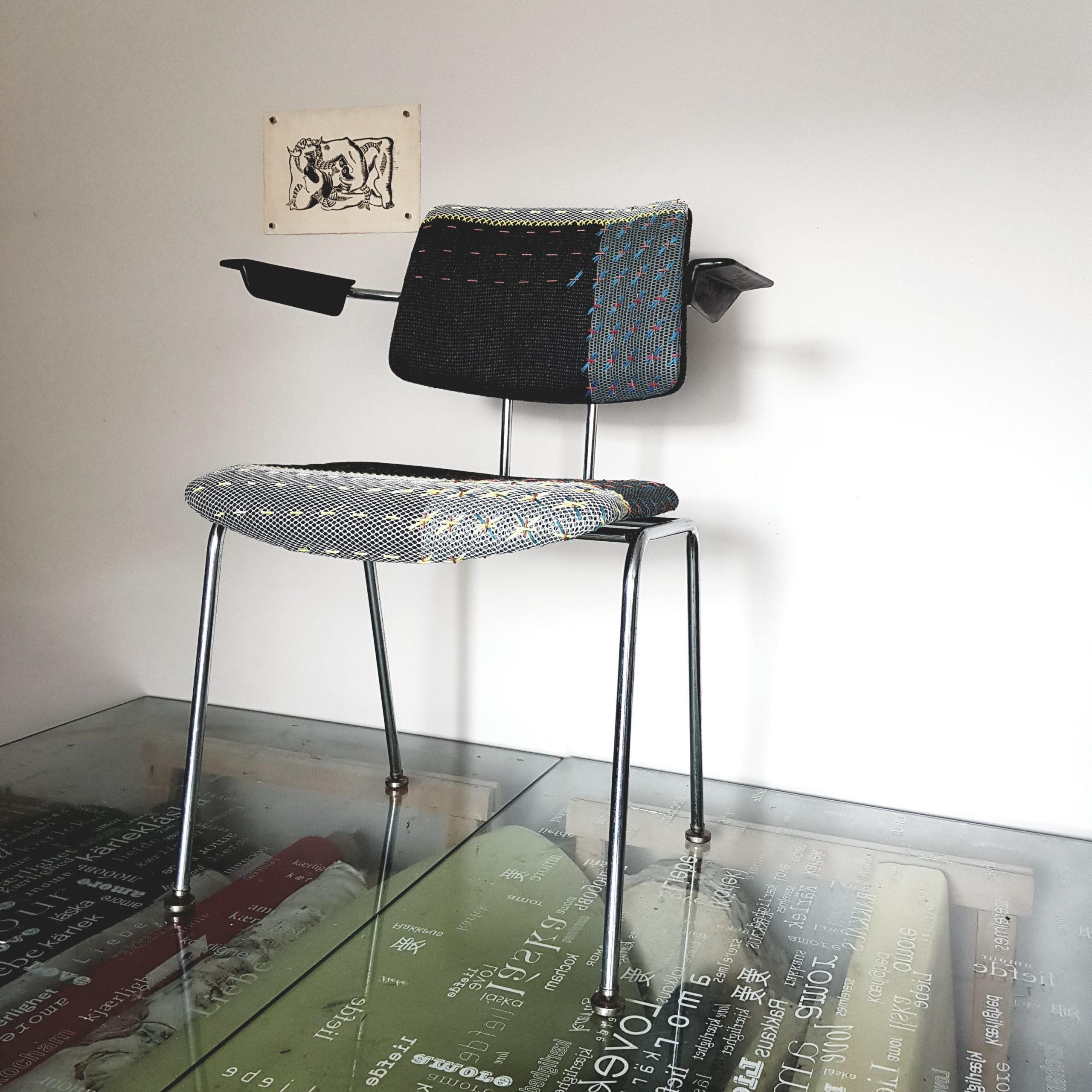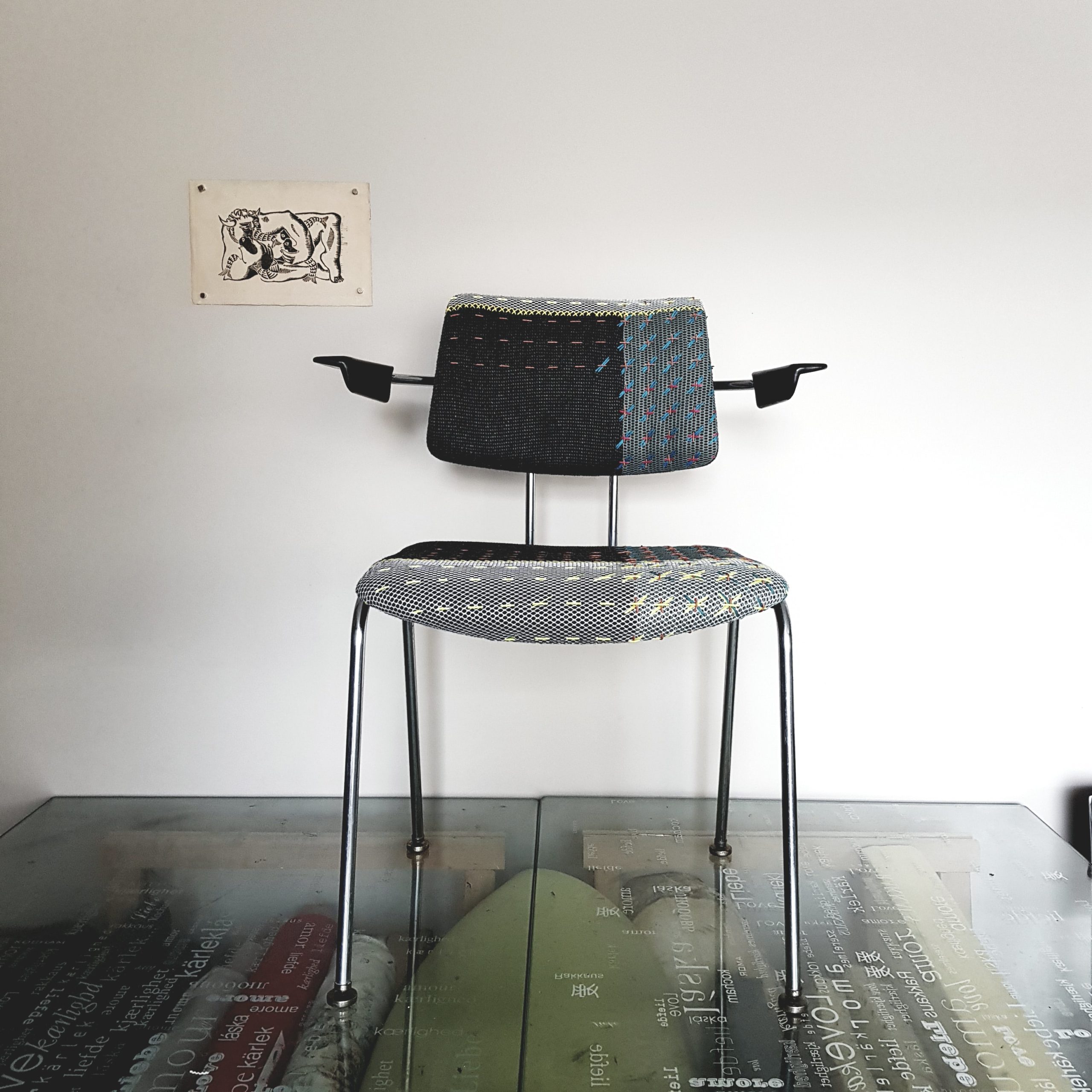 Superbe chaise industrielle d’origine suisse rappelant le fauteuil industriel de Friso Krammer pour Arhend de Cirkel édité dans les années 50 (voir dernière photo). La chaise est en acier chromé et le dessus des accoudoirs en bakélite. La base de l’assise et du dossier est en bois courbé. Ils sont recouverts d’une mousse neuve et d’un tissu en laine anthracite. Celui-ci est rehaussé de tissus tissés ajourés sur lesquels une broderie en coton mercerisé et fines cordes de marin dessine un motif géométrique original créé par l’artiste Heike Schildhauer et réalisé entièrement à la main. La qualité du matériel, les finitions et les pieds en rotule font de cette chaise un objet haut de gamme.