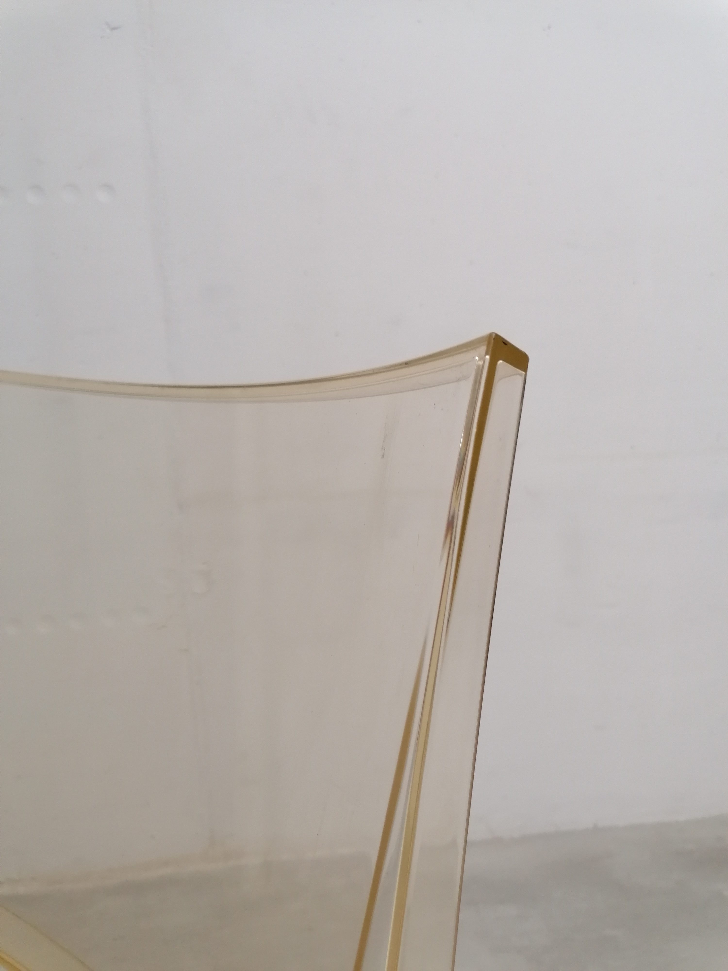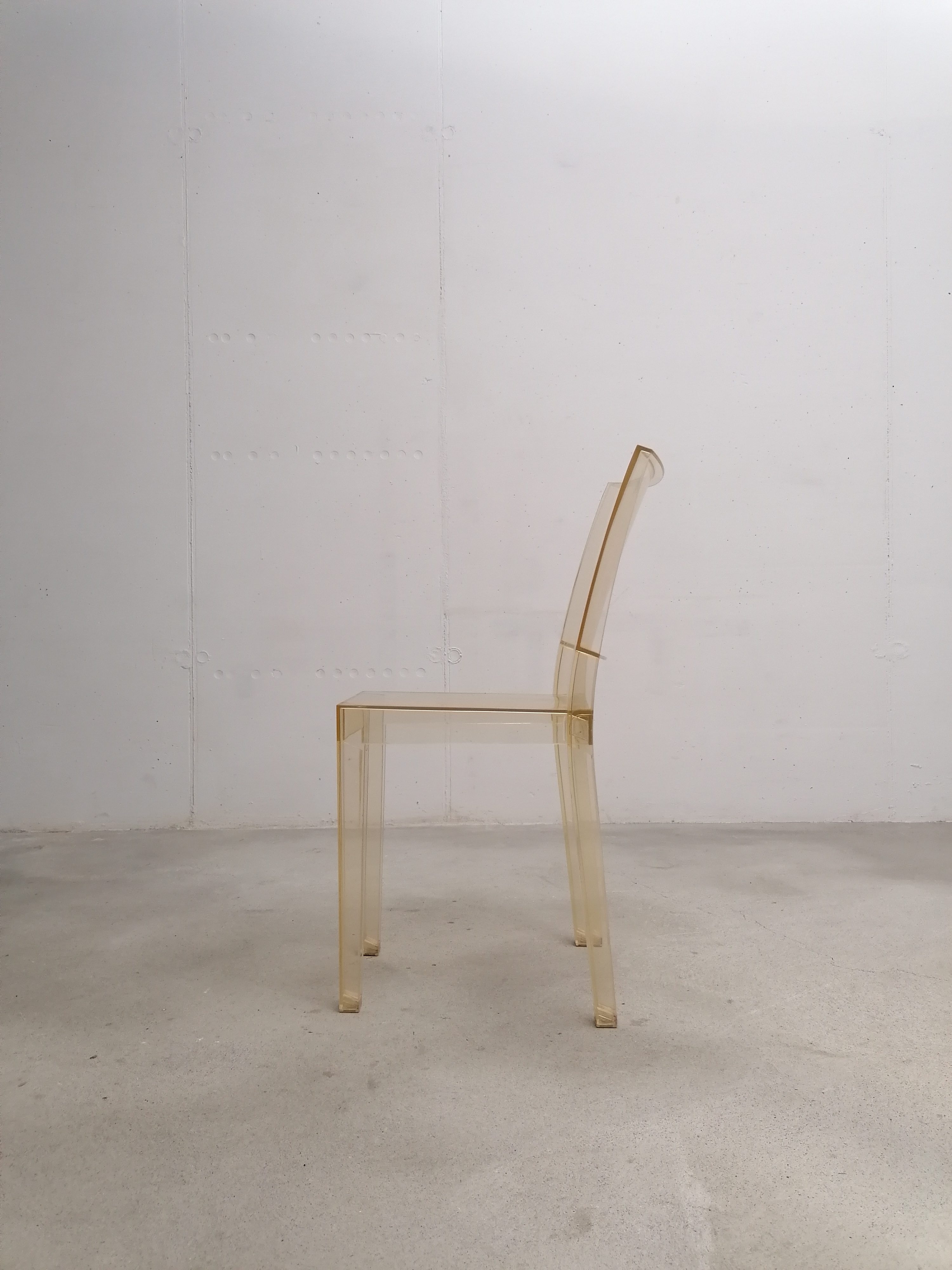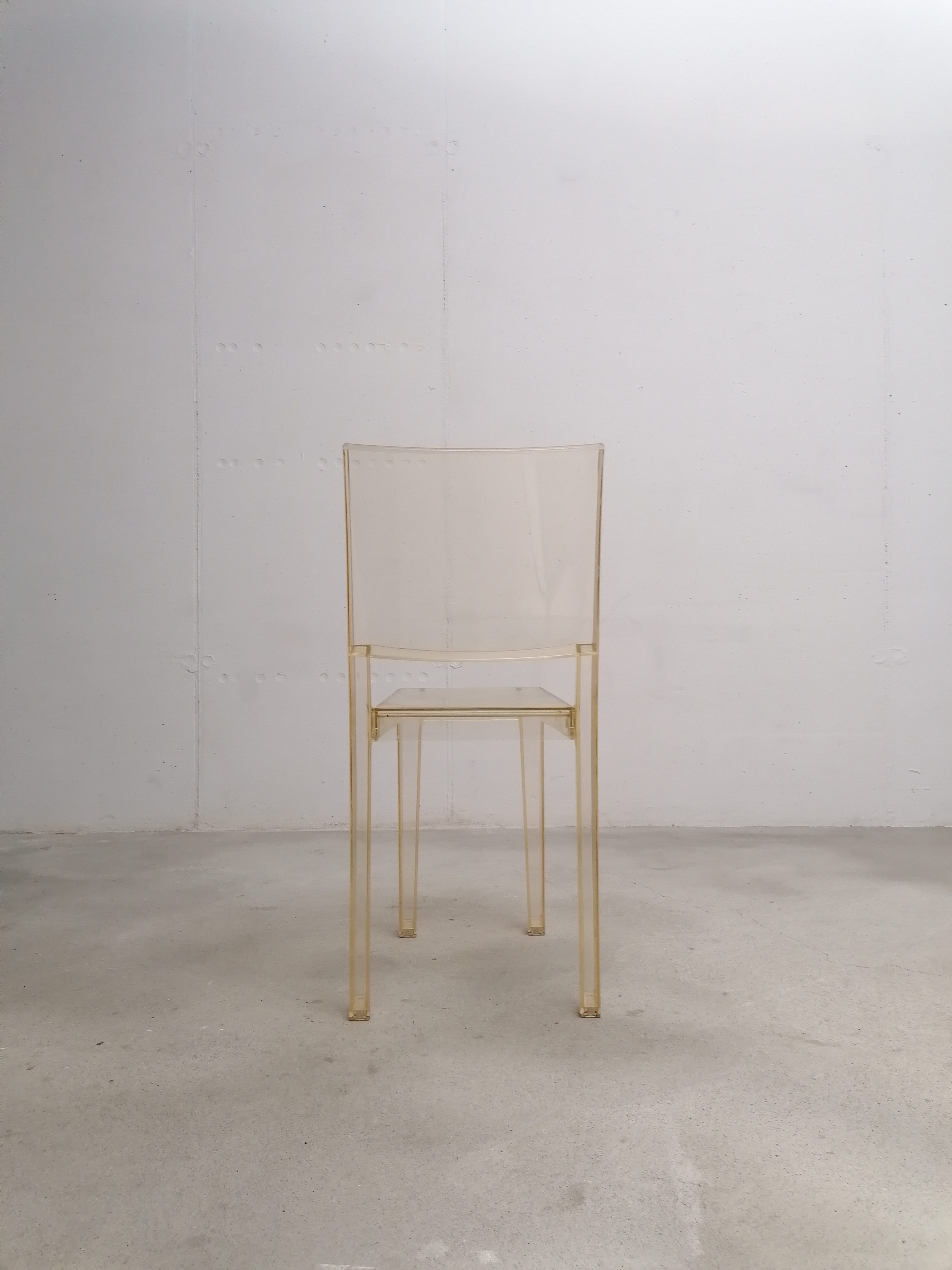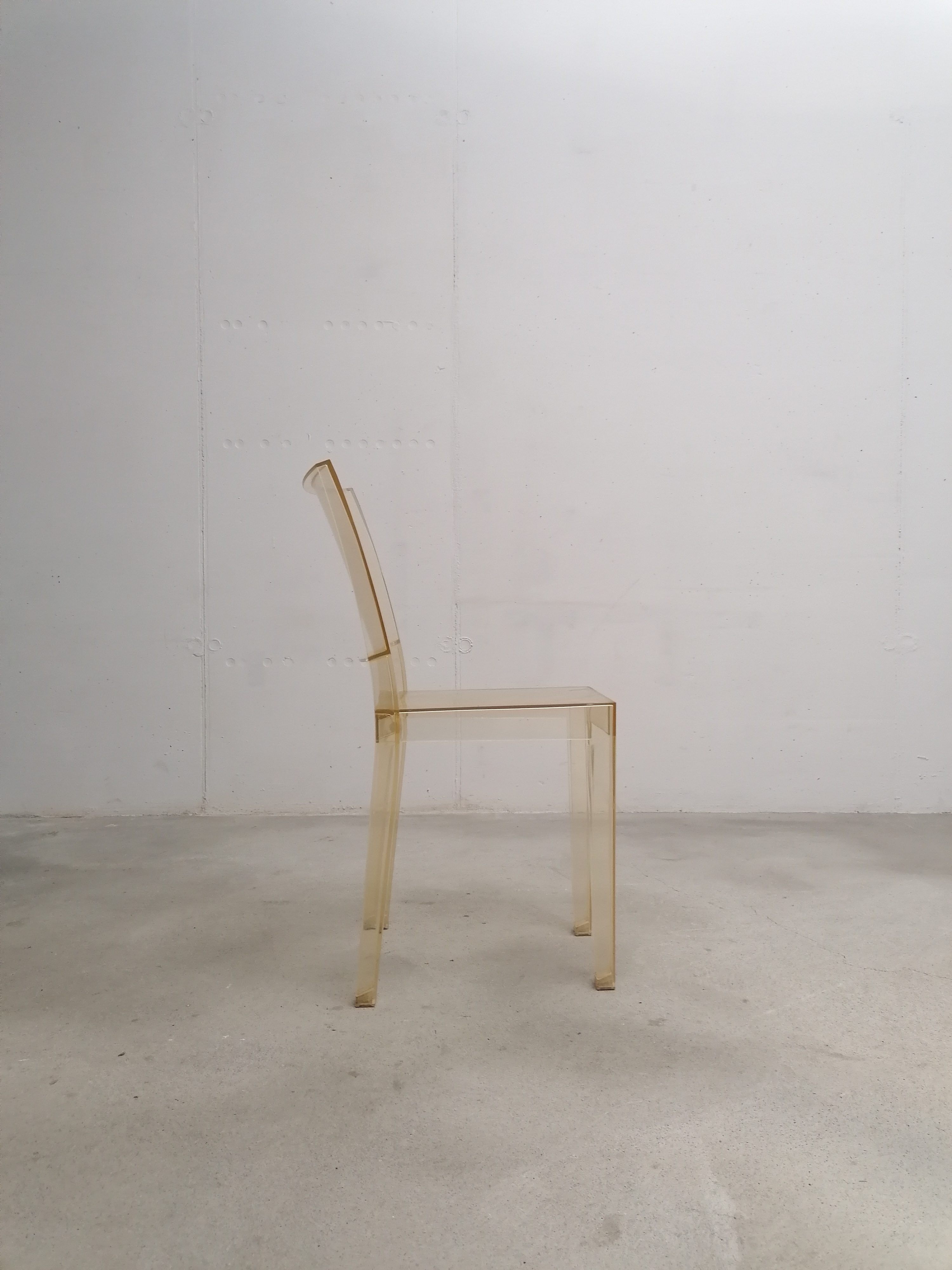 Produit venduChaise en polycarbonate dessinée par Philippe Starck pour Kartell. Made in Italy. Quelques traces d”usures (voir photos). Le plastique transparent a jauni avec le temps. Stable et solide. Hauteur de l’assise: 47 cm.