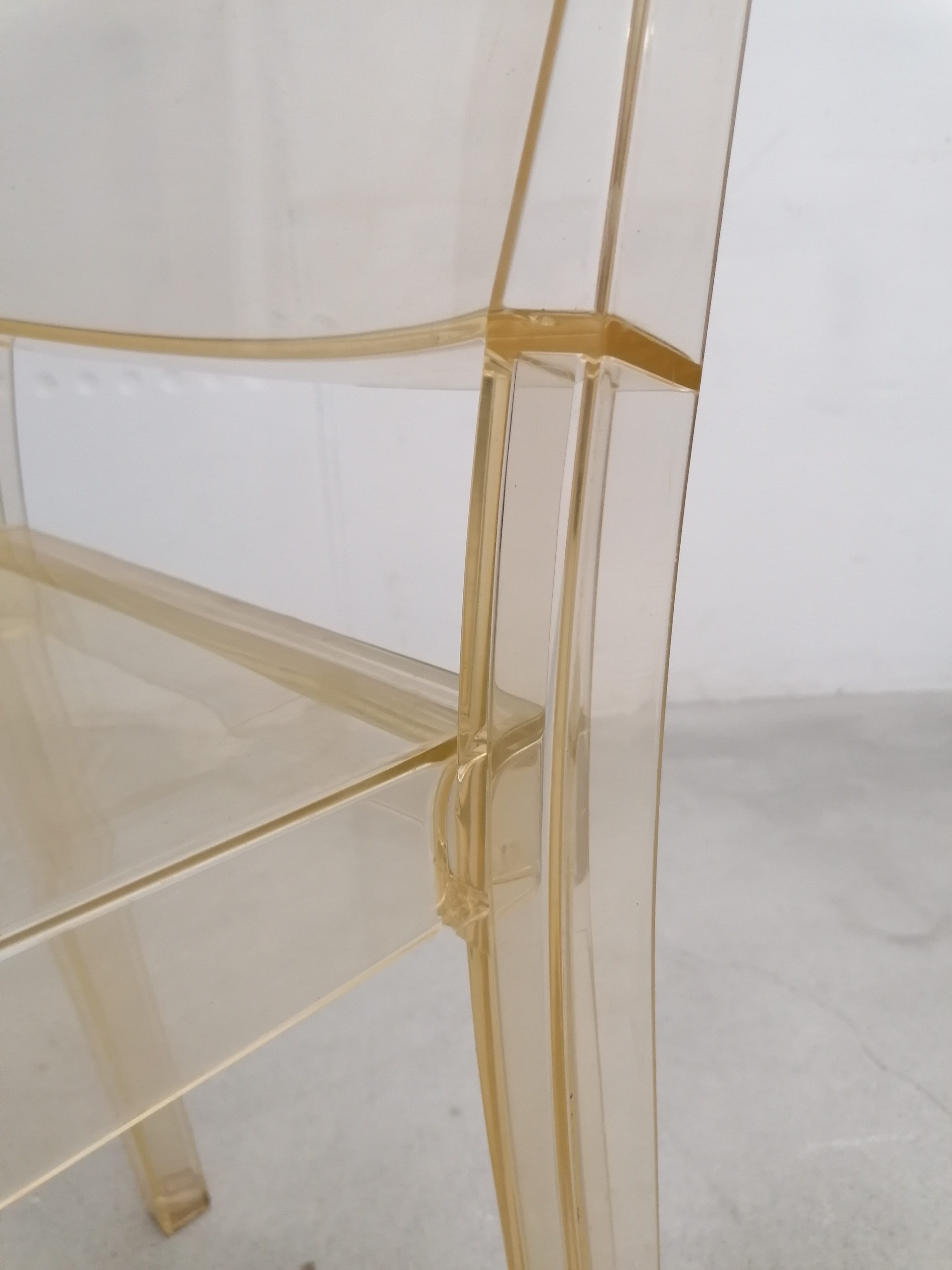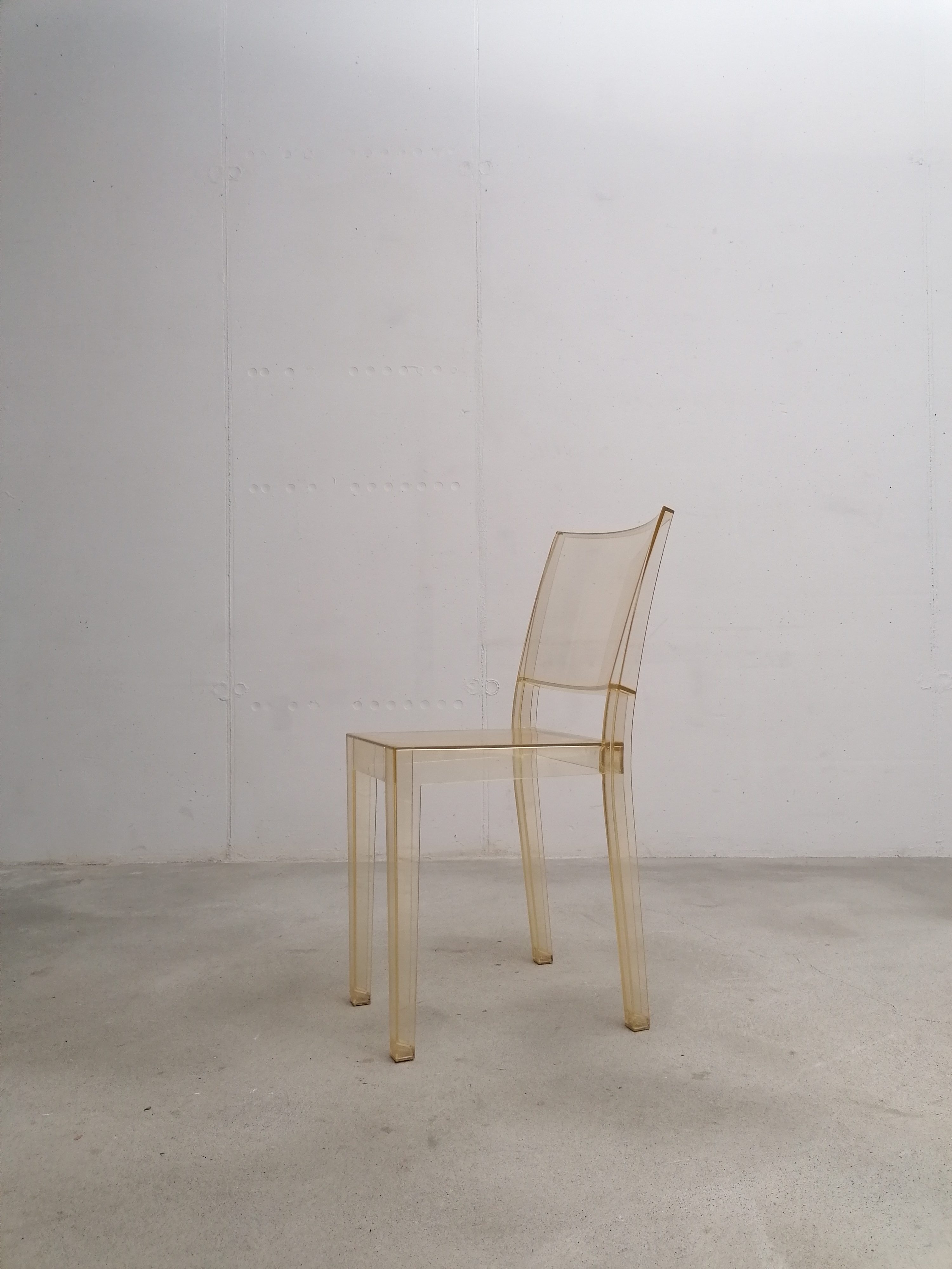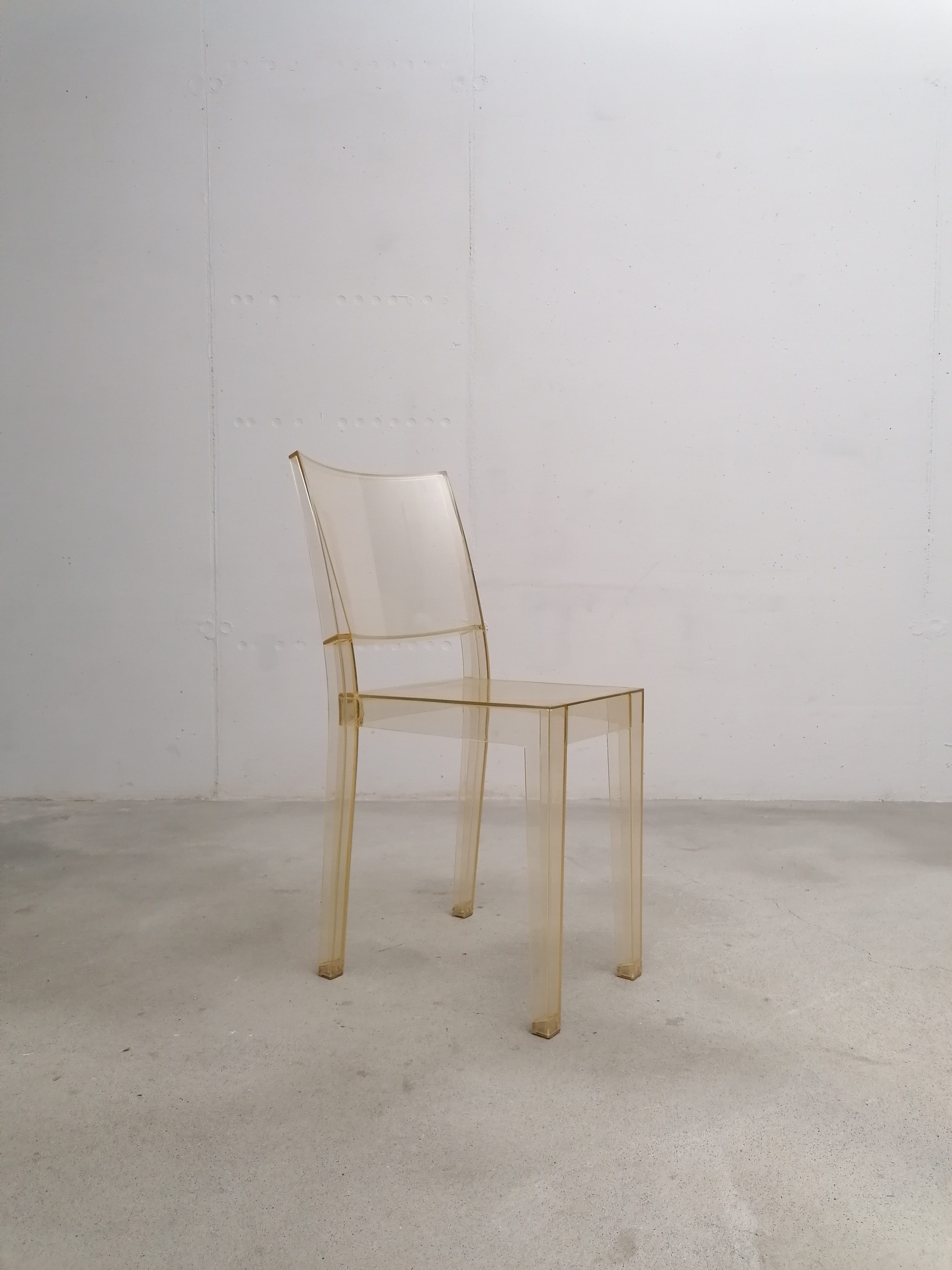 Produit venduChaise en polycarbonate dessinée par Philippe Starck pour Kartell. Made in Italy. Quelques traces d”usures (voir photos). Le plastique transparent a jauni avec le temps. Stable et solide. Hauteur de l’assise: 47 cm.