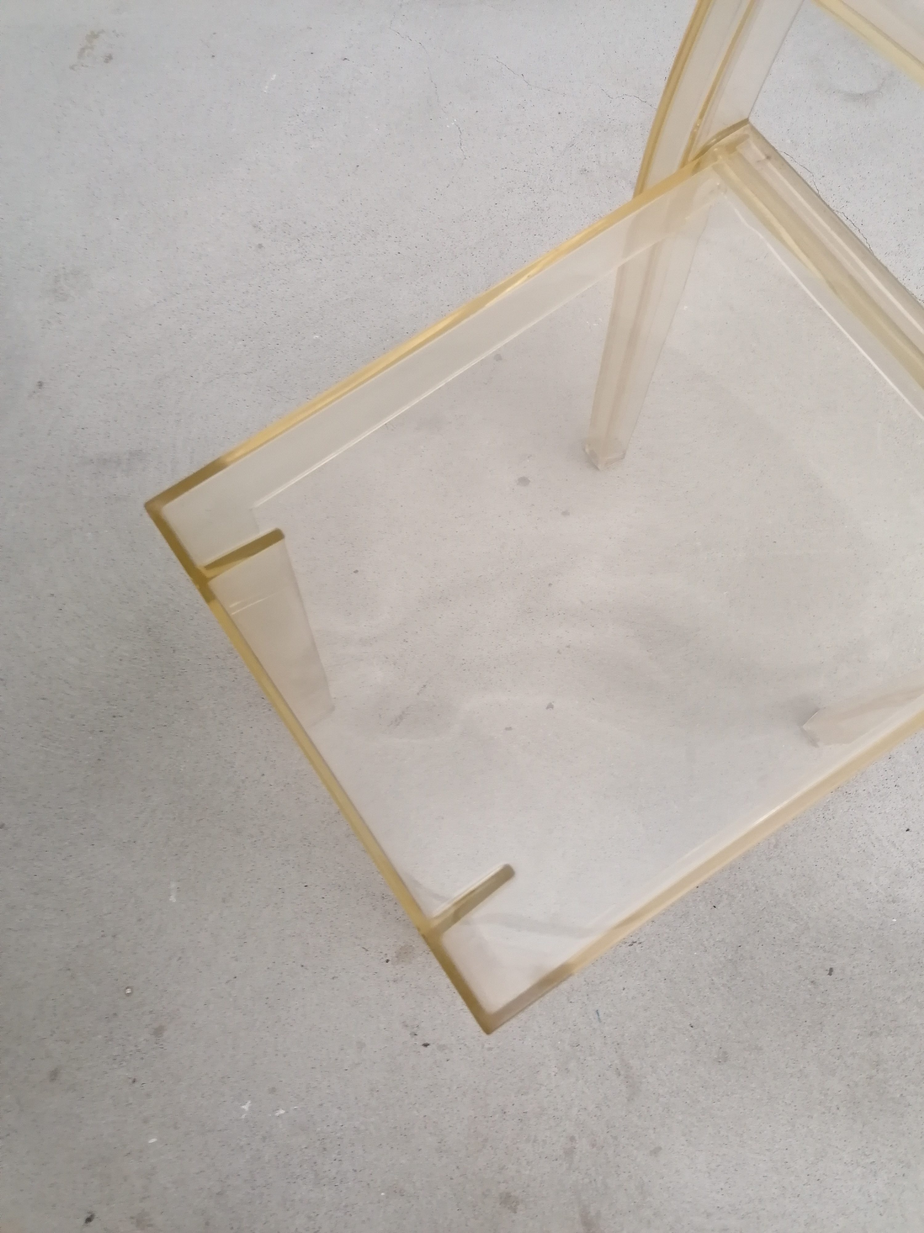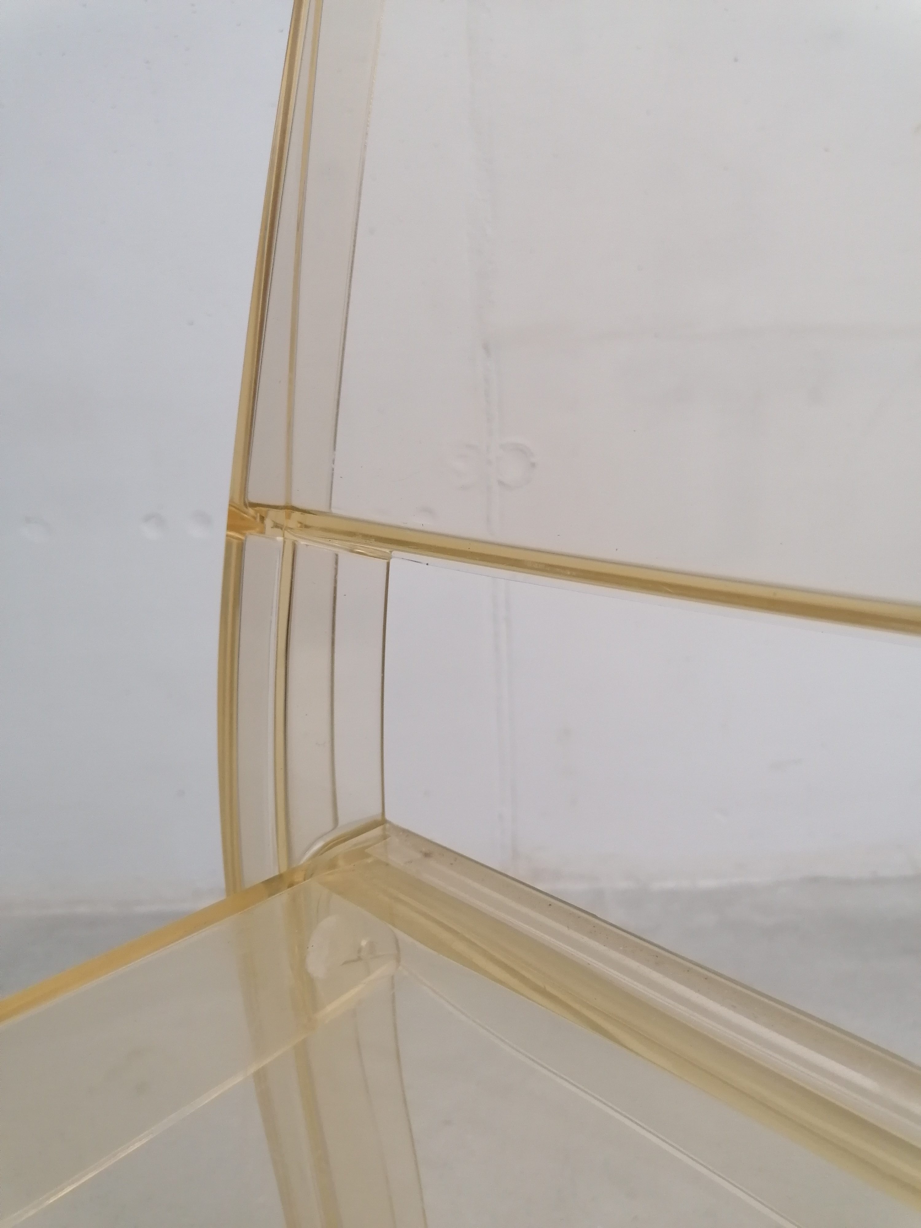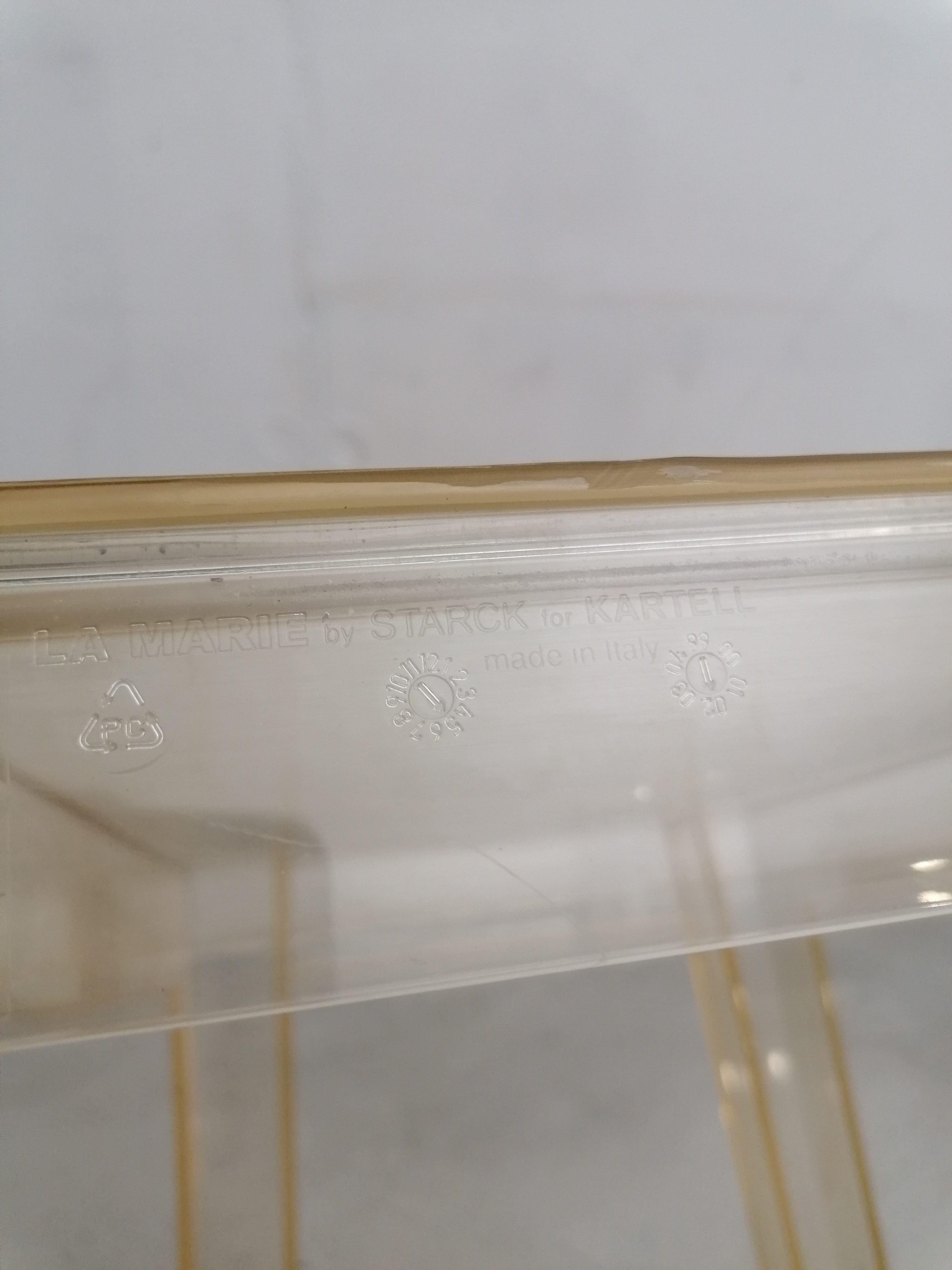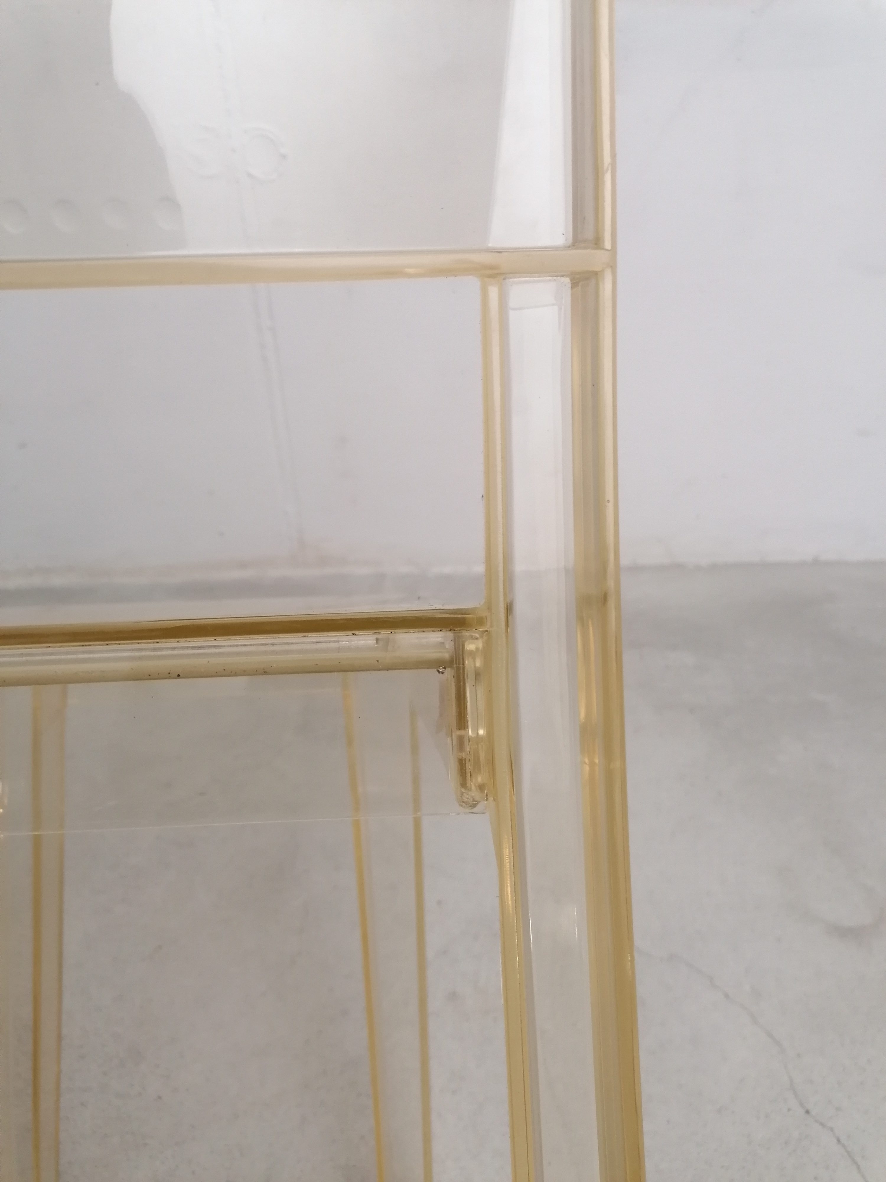 Produit venduChaise en polycarbonate dessinée par Philippe Starck pour Kartell. Made in Italy. Quelques traces d”usures (voir photos). Le plastique transparent a jauni avec le temps. Stable et solide. Hauteur de l’assise: 47 cm.