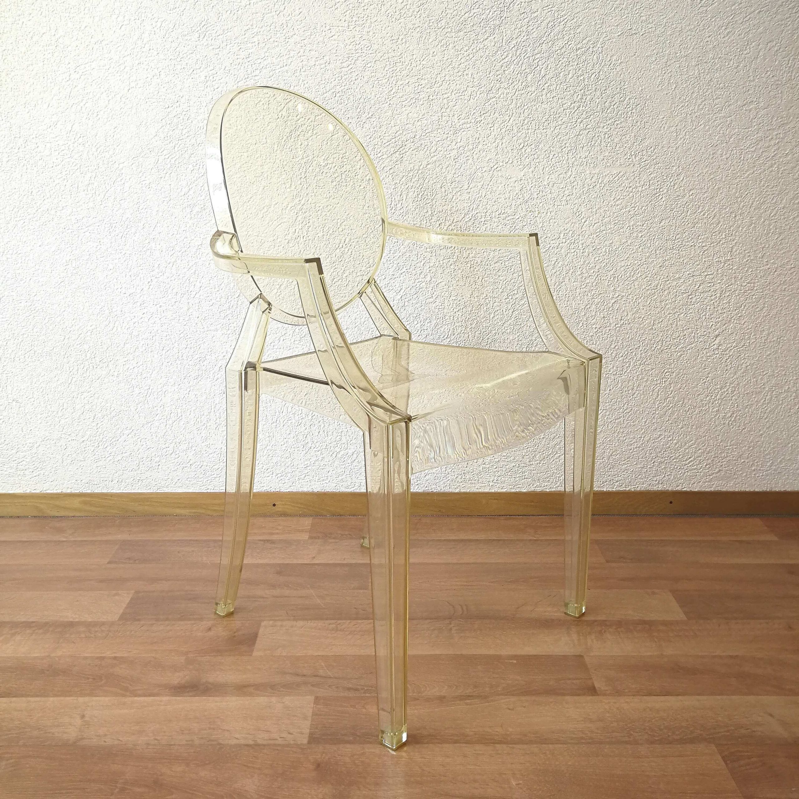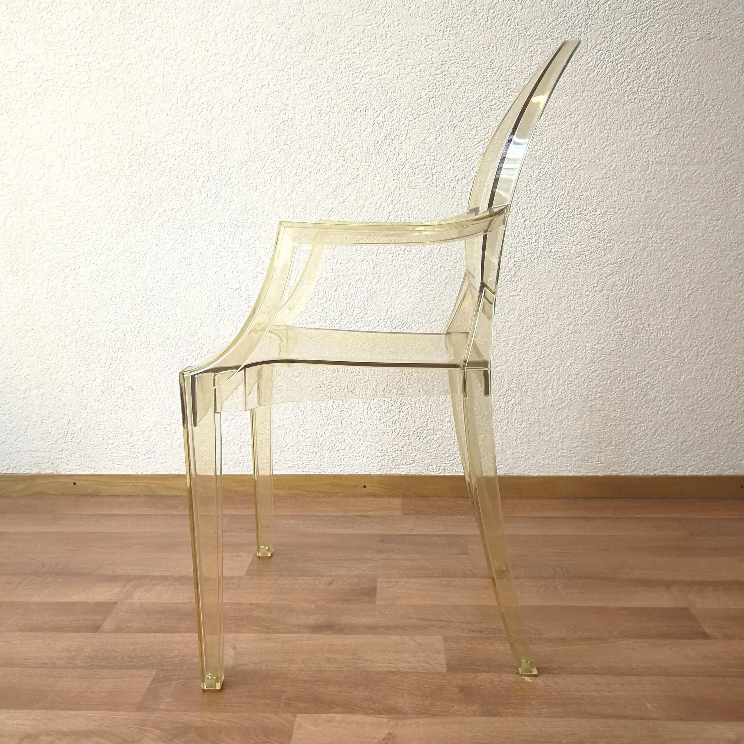 Produit venduChaise Louis Ghost de Philippe Starck pour Kartell. En polycarbonate de couleur jaune transparente. Hauteur assise: 47 cm.