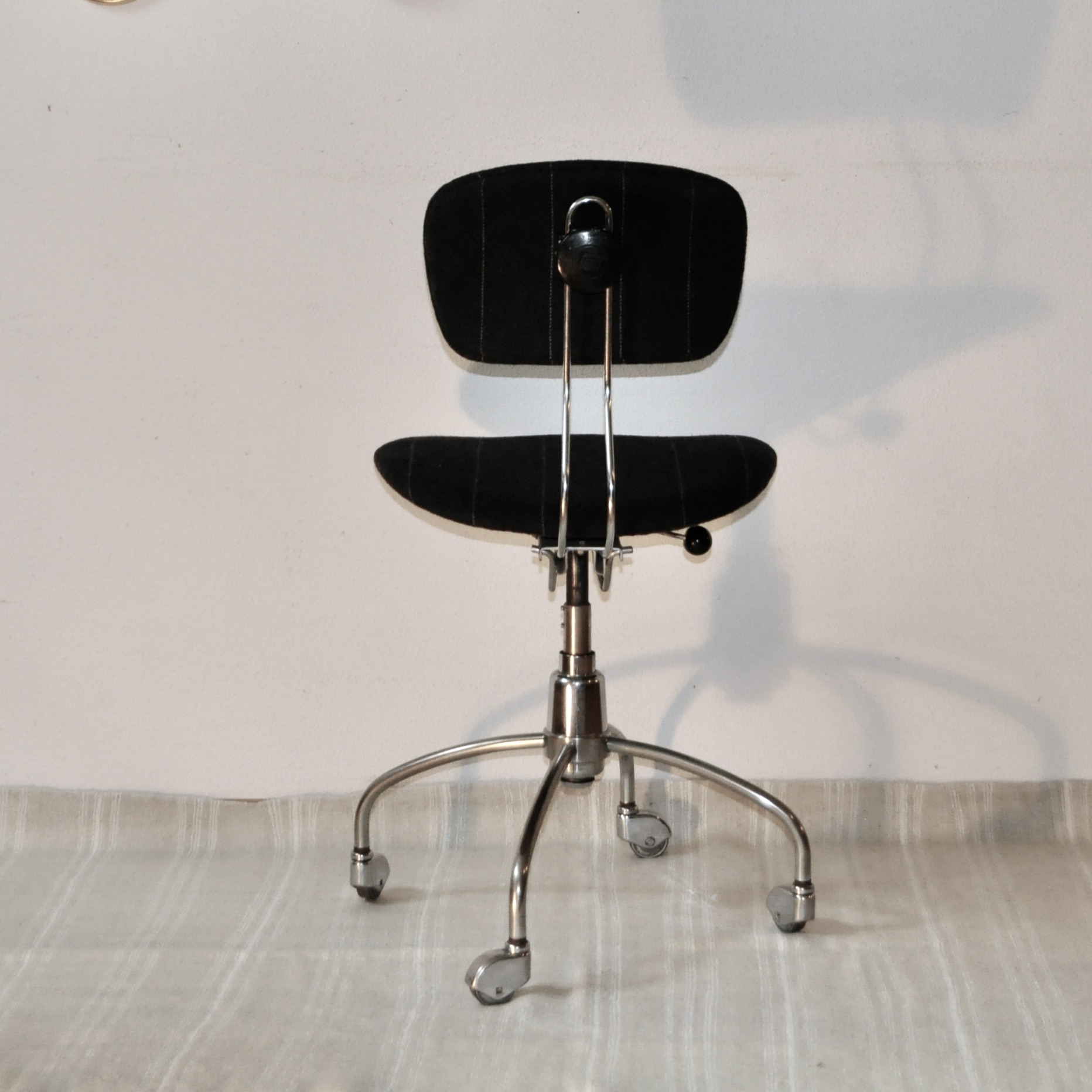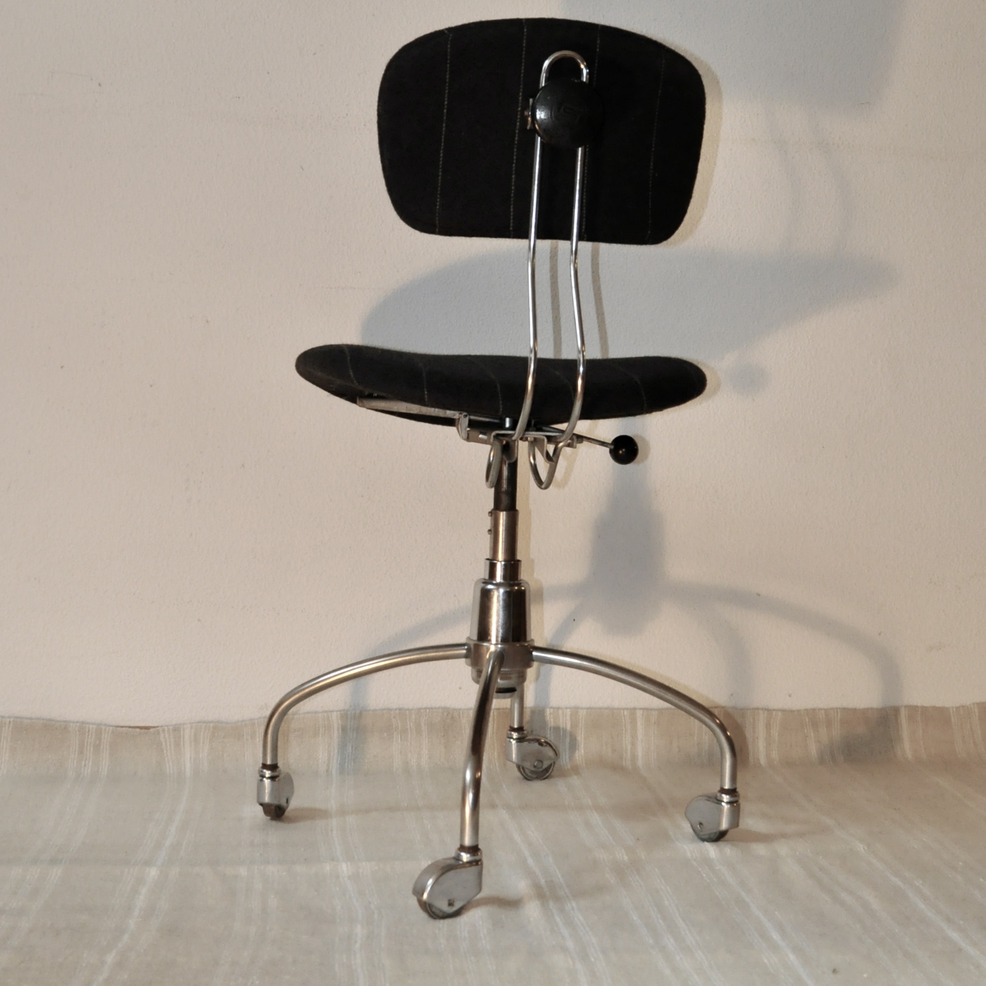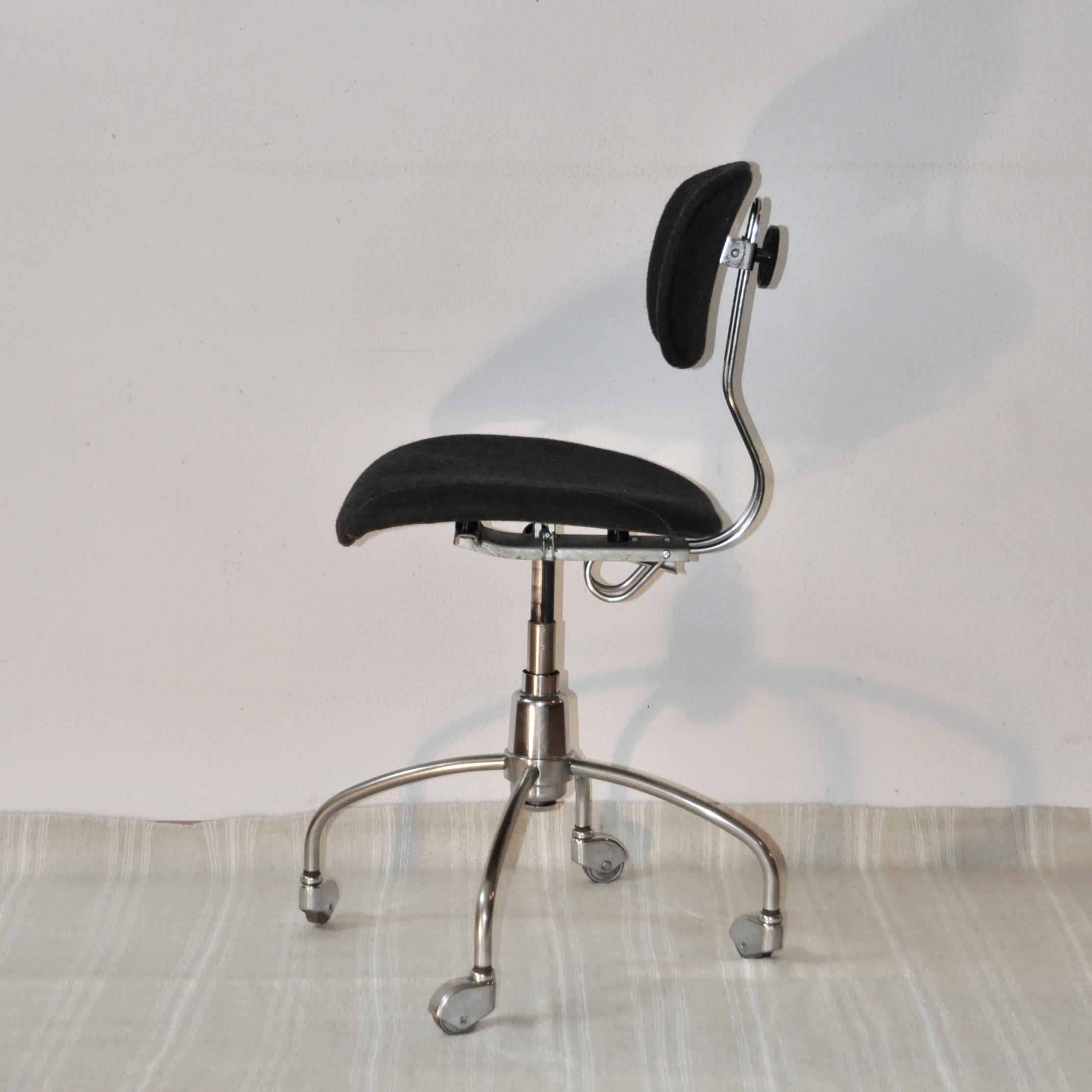 Chaise de bureau d’Egon Eiermann, modèle SE40, éditée dans les années 60 par la firme allemande Wilde und Spieth. Cette chaise en bois contre-plaqué cintré est réglable en hauteur, pivotante sur elle-même et mobile. Le piètement en tube d’acier chromé reproduit au niveau de la distribution des pieds les formes d’une fusée et se finit par 4 roulettes en métal chromé.