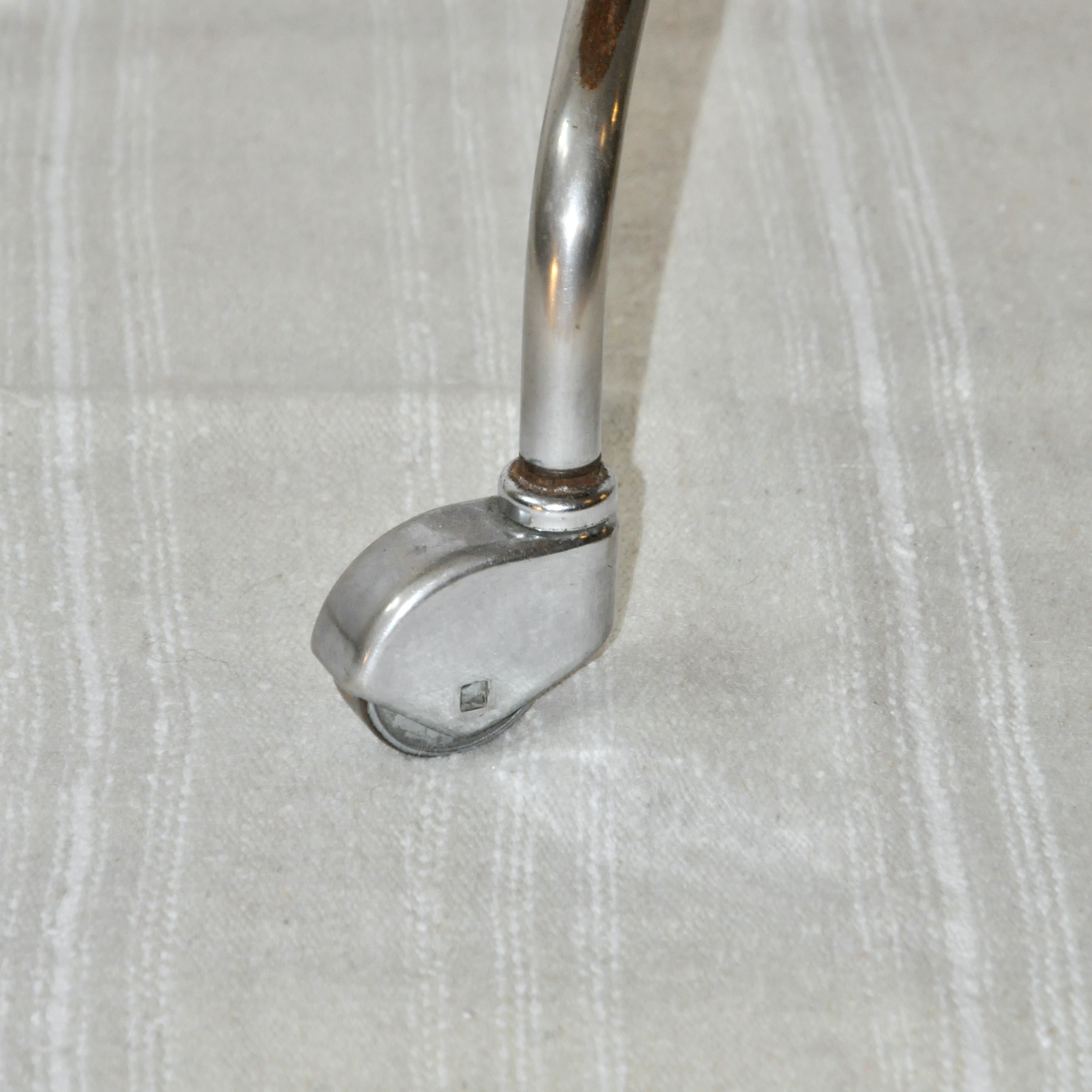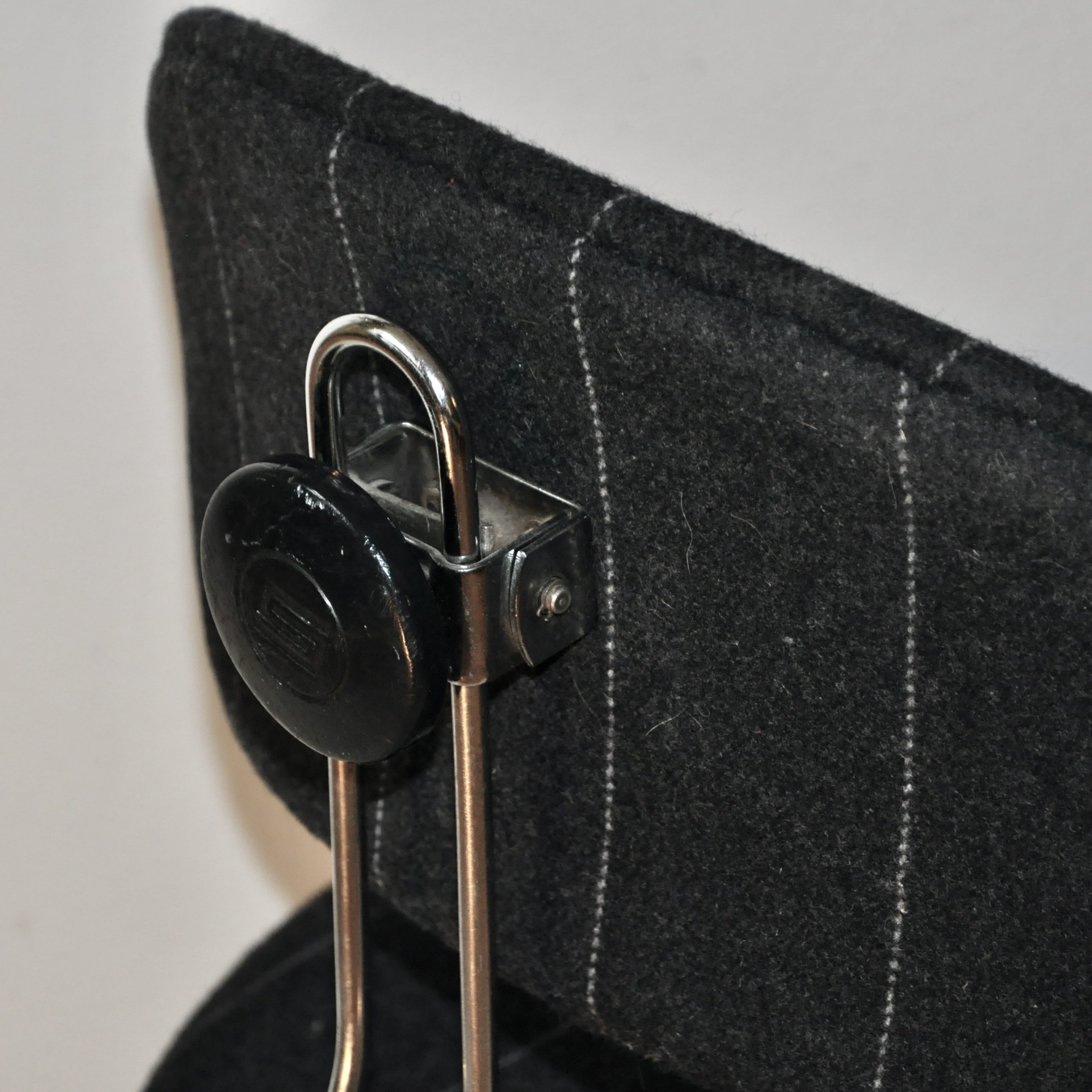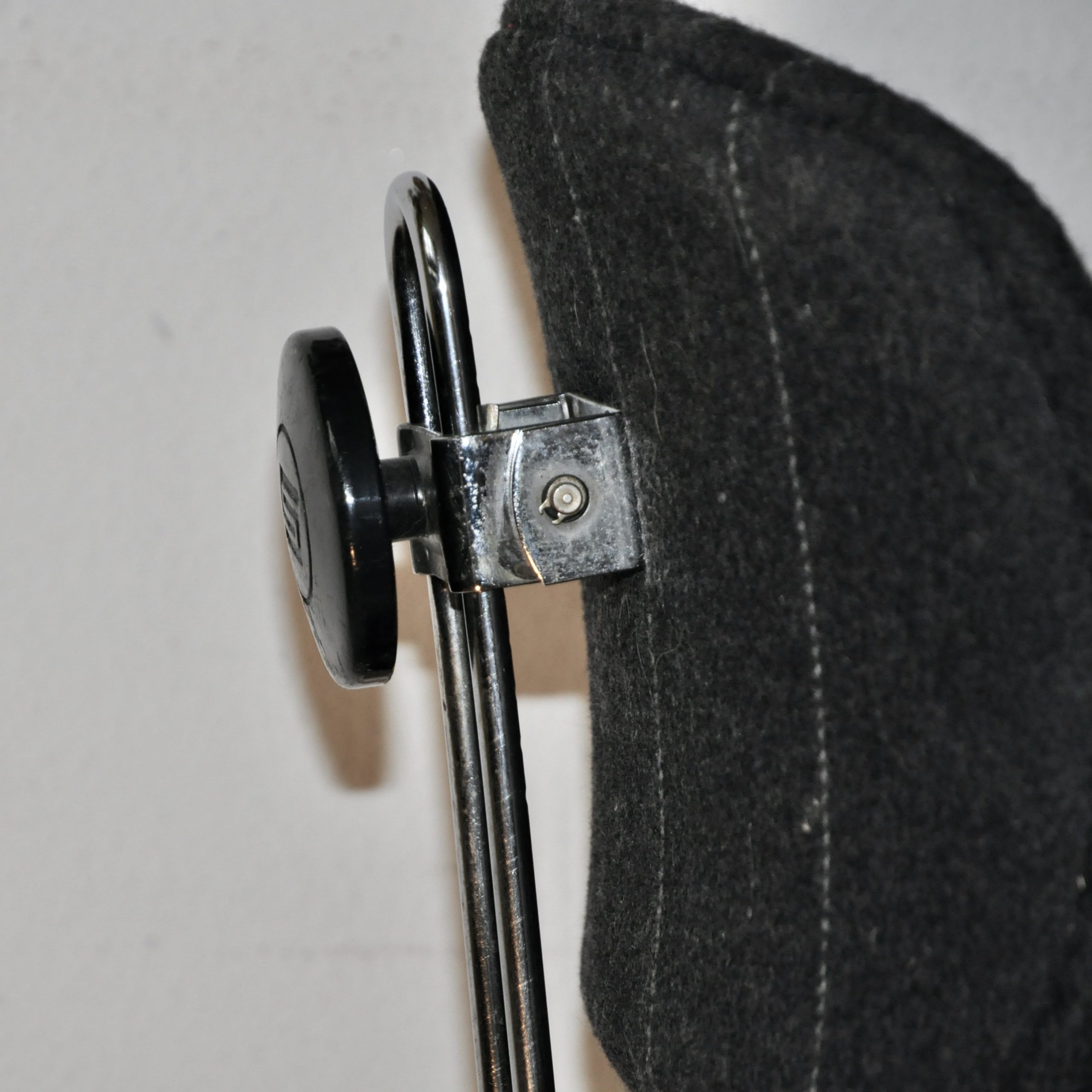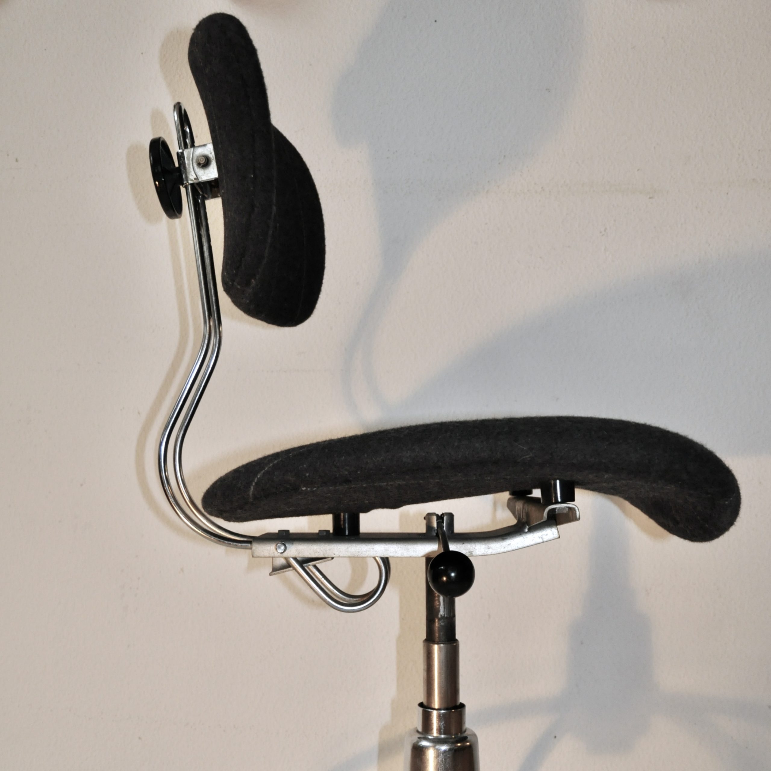 Chaise de bureau d’Egon Eiermann, modèle SE40, éditée dans les années 60 par la firme allemande Wilde und Spieth. Cette chaise en bois contre-plaqué cintré est réglable en hauteur, pivotante sur elle-même et mobile. Le piètement en tube d’acier chromé reproduit au niveau de la distribution des pieds les formes d’une fusée et se finit par 4 roulettes en métal chromé.