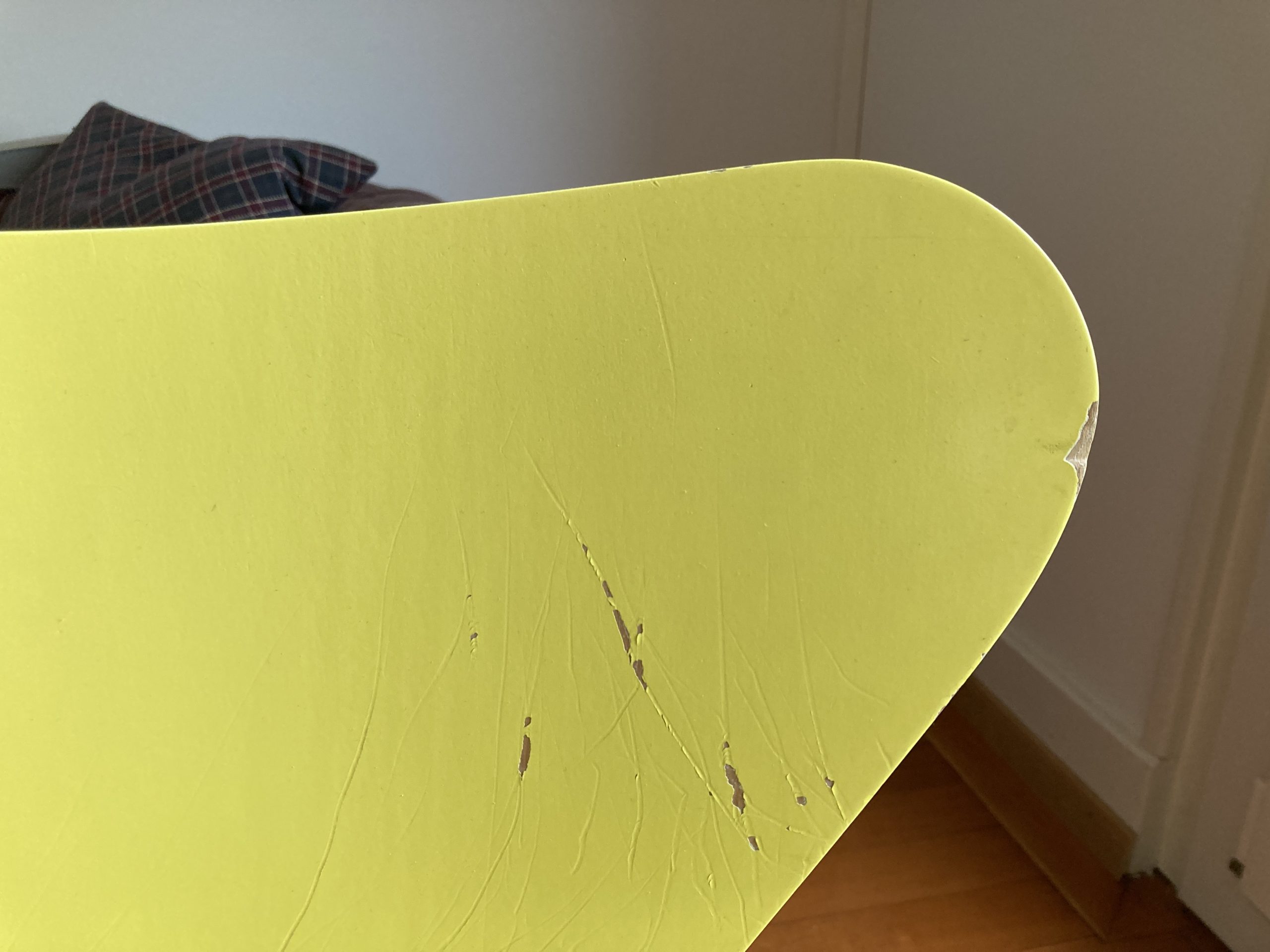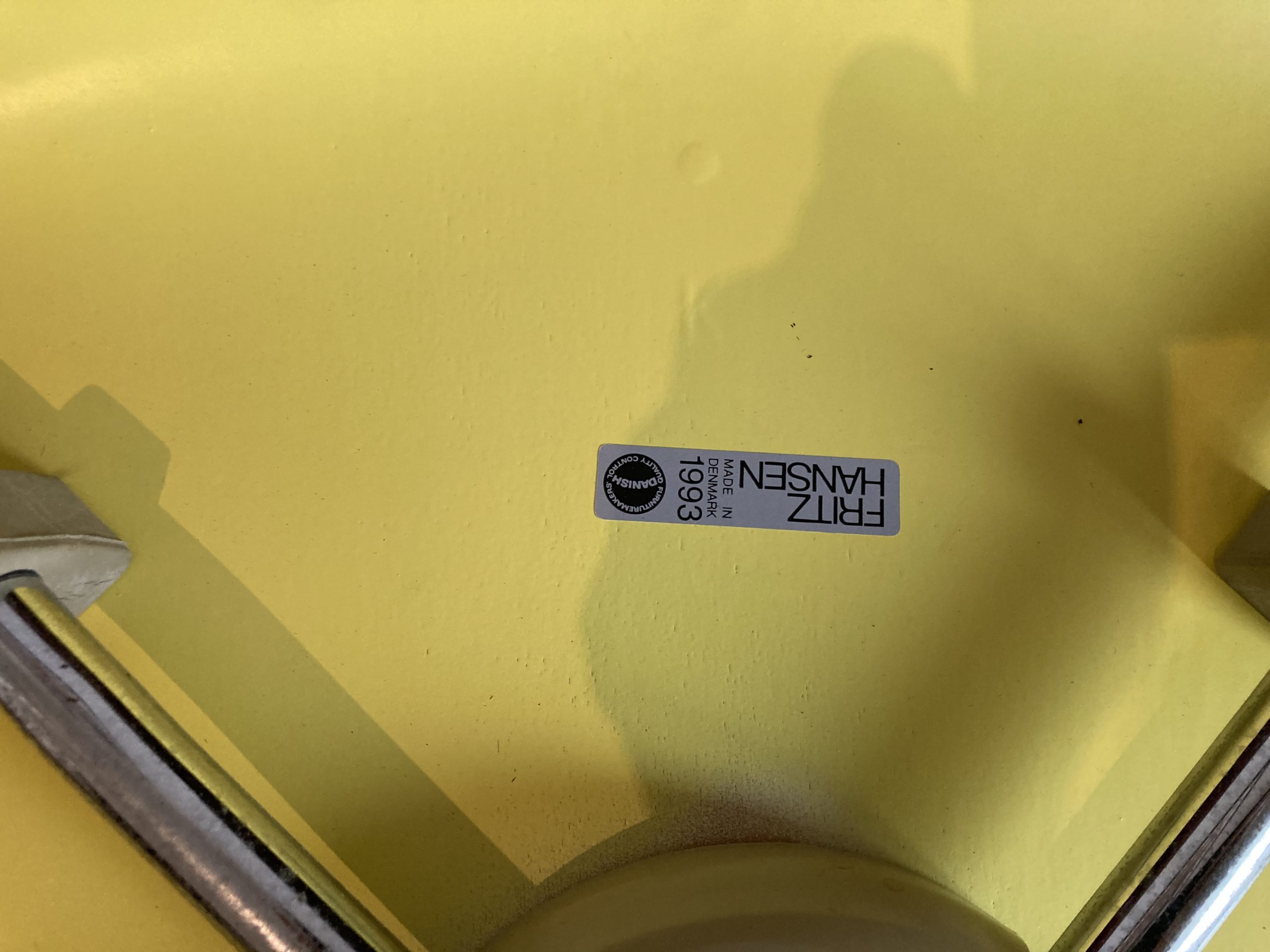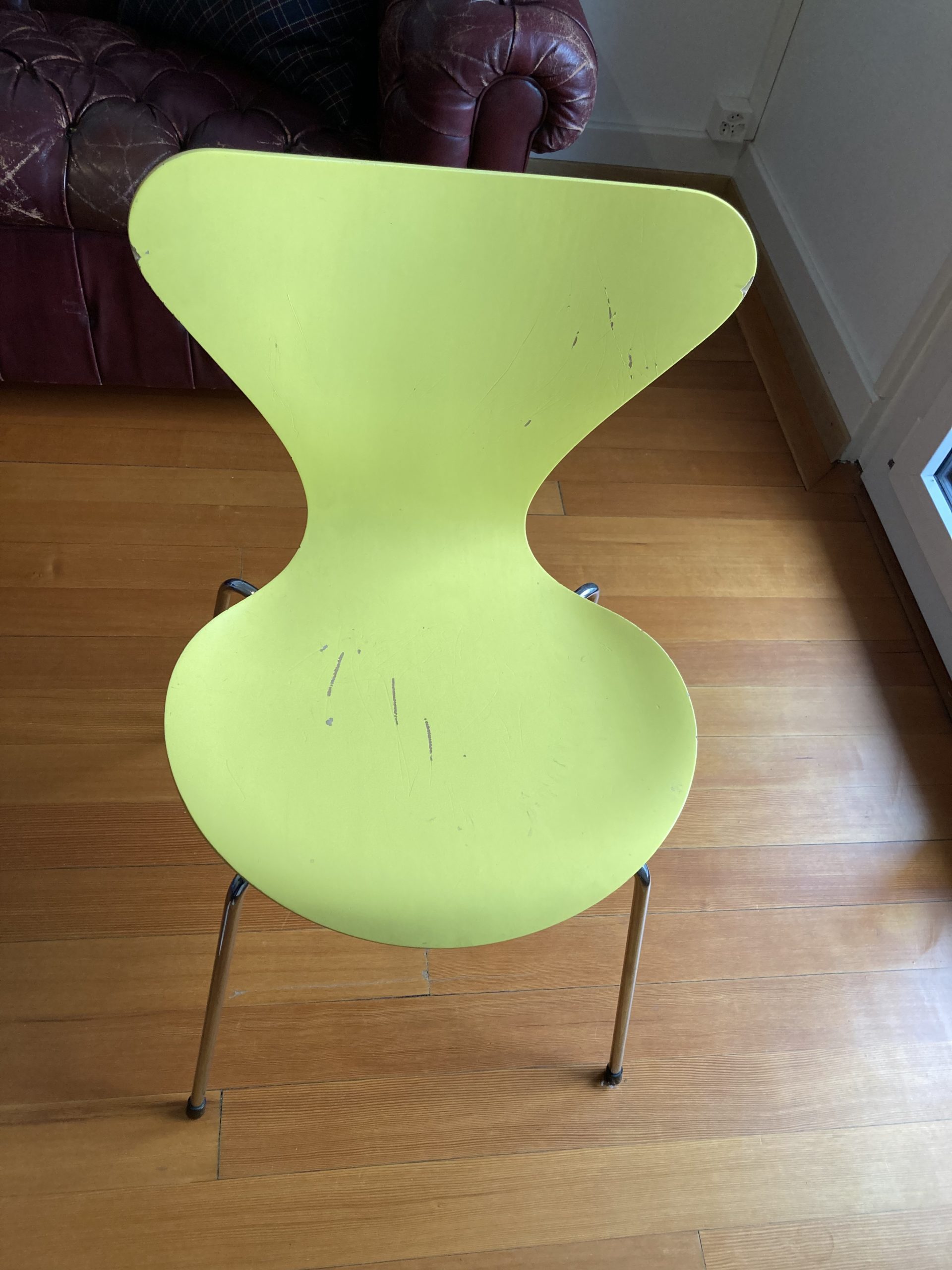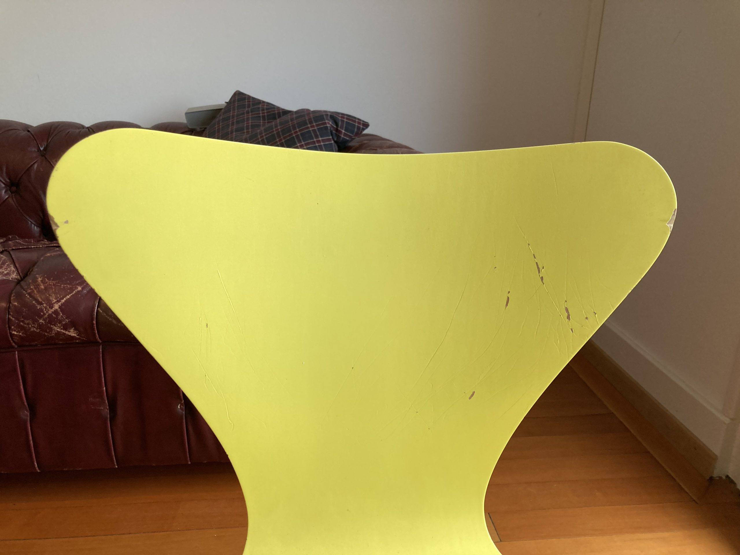 Produit venduChaise Série 7 conçue par Arne Jacobsen pour Fritz Hansen. De couleur jaune avec quelques griffures.