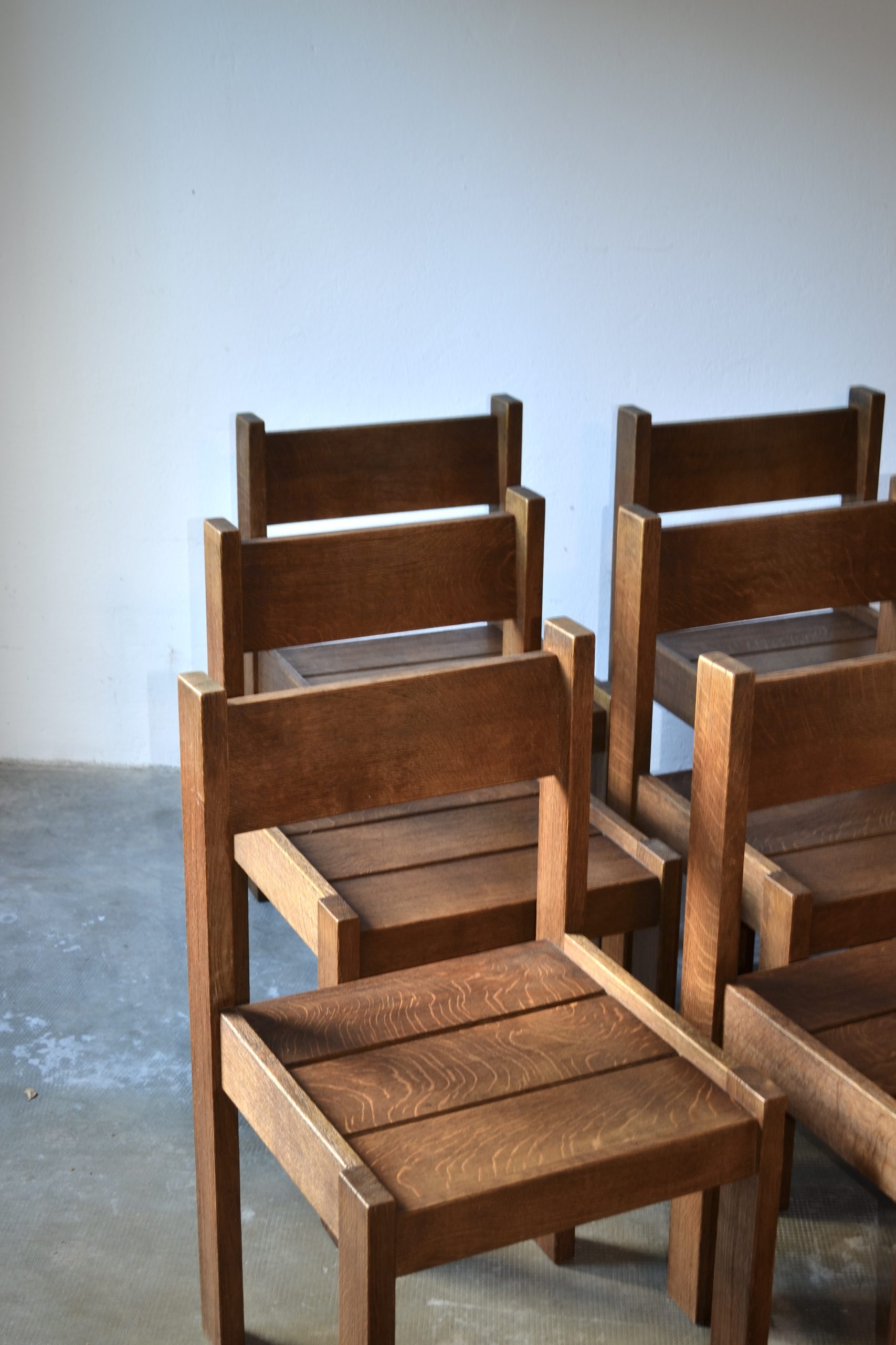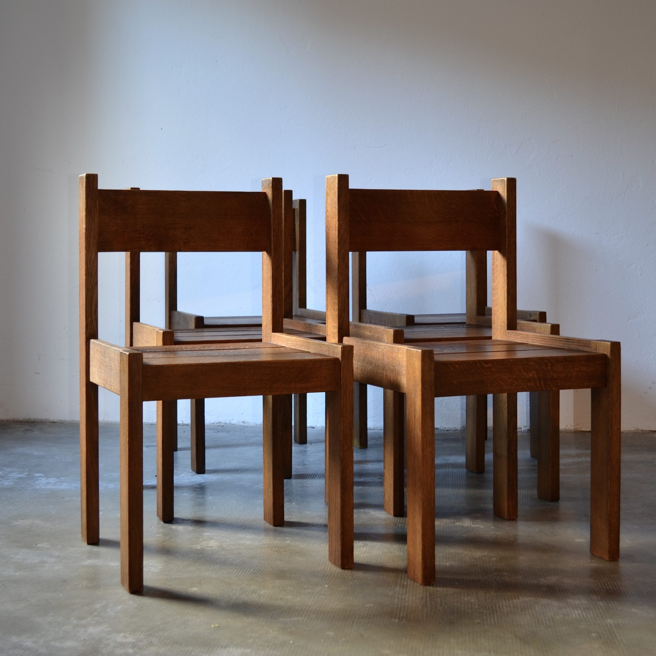 Produit venduEnsemble de 6 chaises brutalistes en chêne fabriquées en Suisse vers les années 1960.