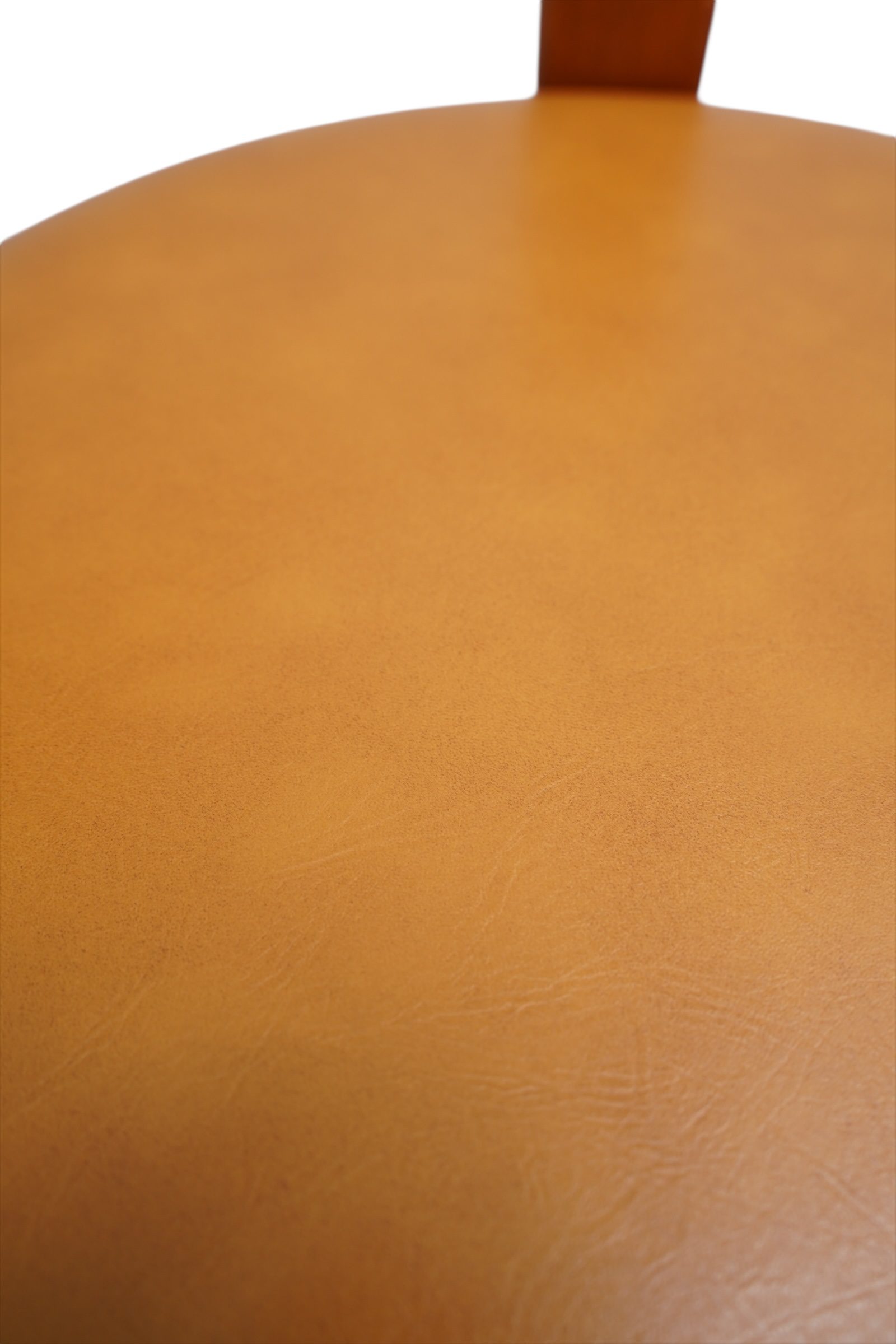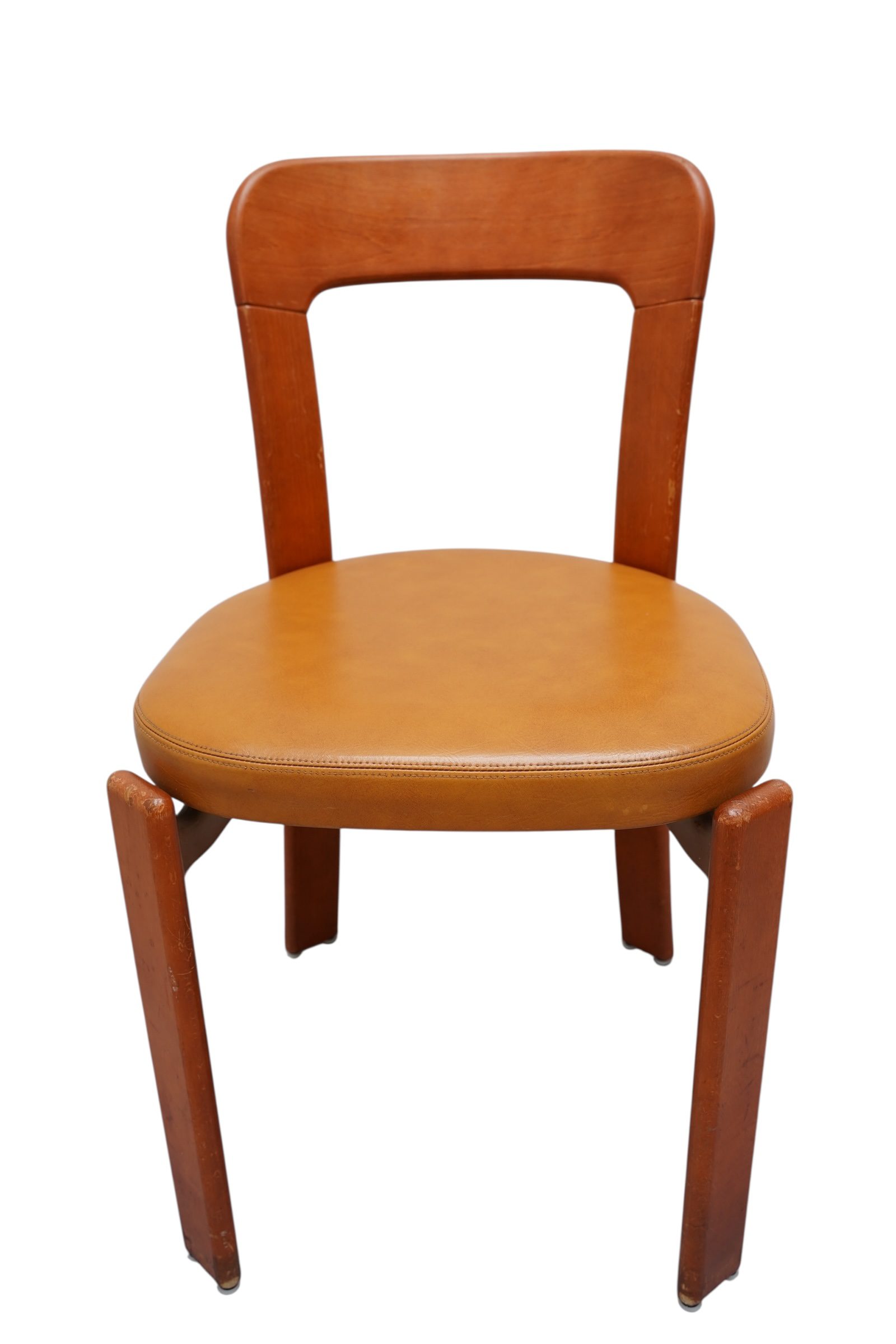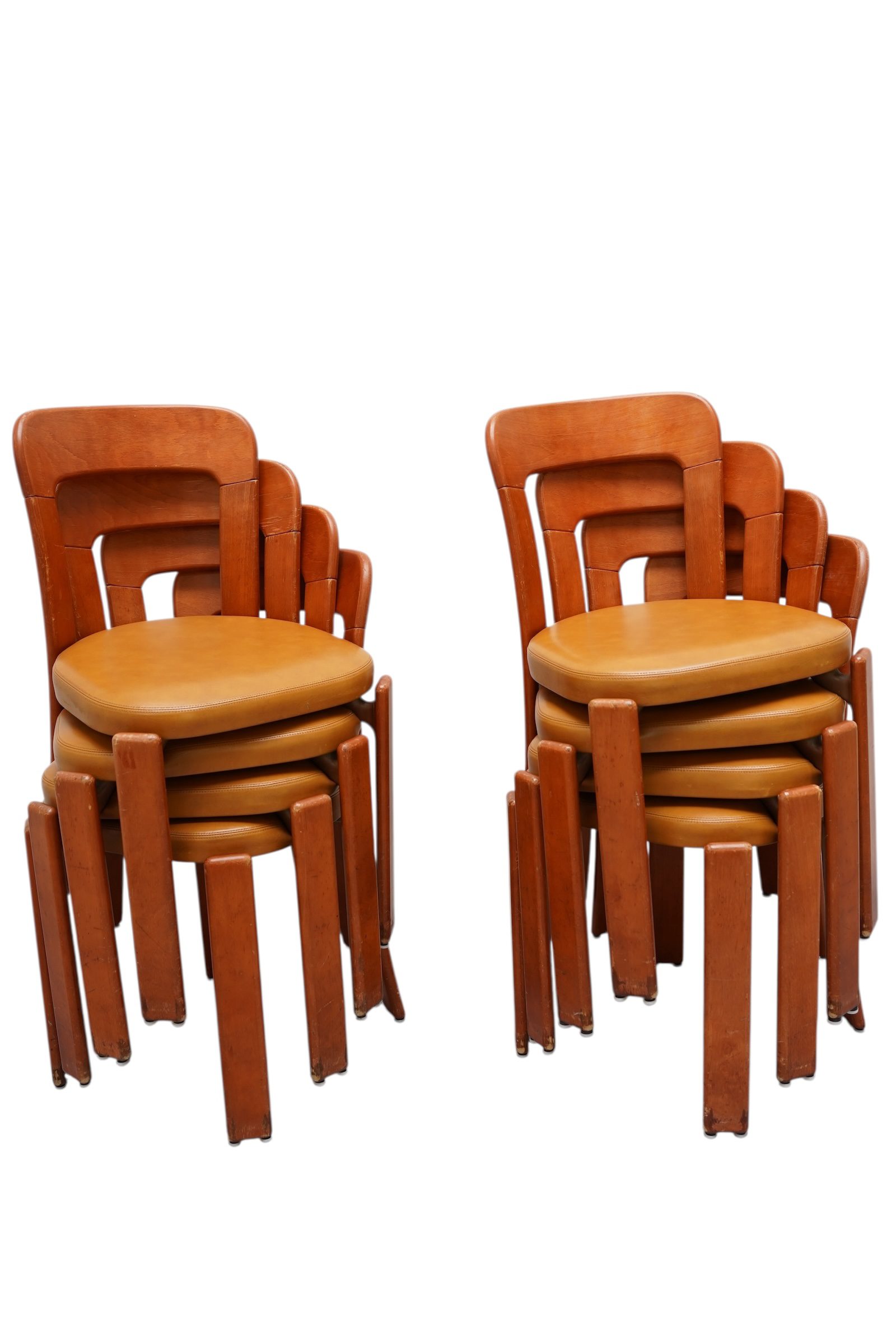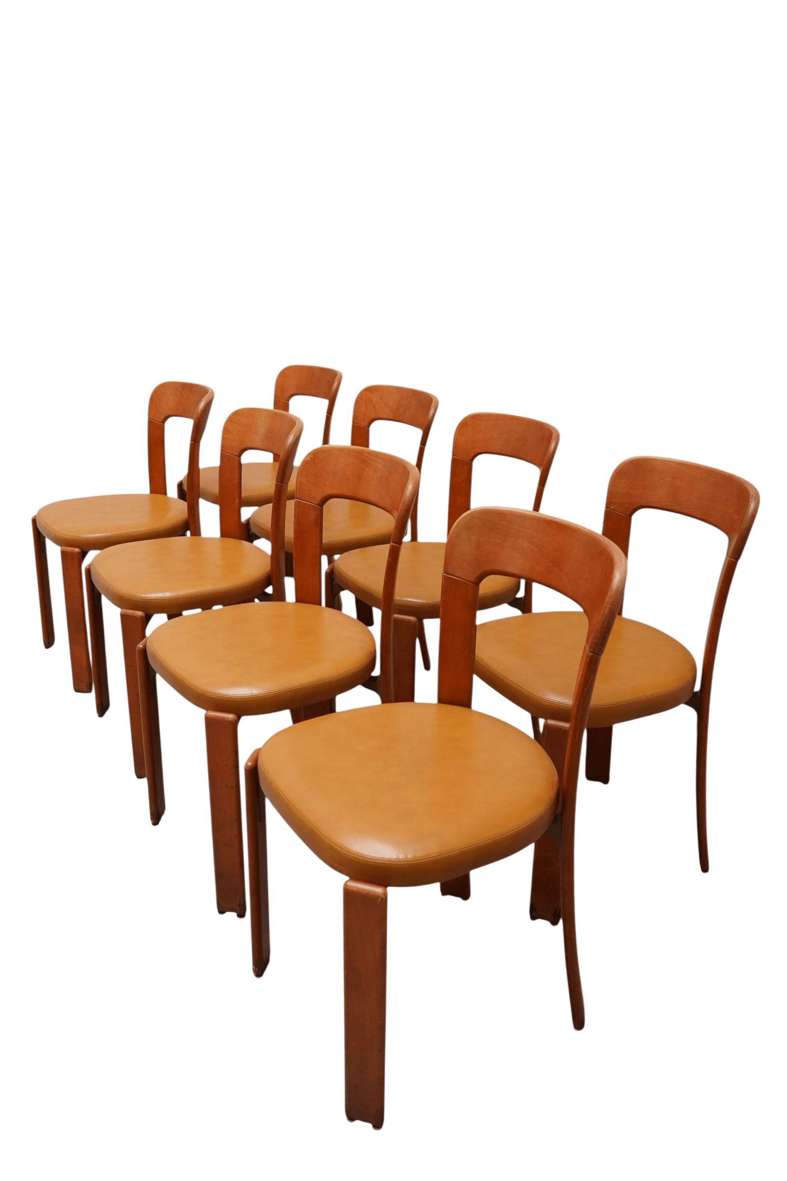 Ensemble de 8 chaises de Bruno Rey fabriquées par la maison Suisse « Dietiker » vers 1970’s. Les chaises sont en bois de hêtre de couleur brunes et habillées d’une assise en similicuir de haute qualité.
