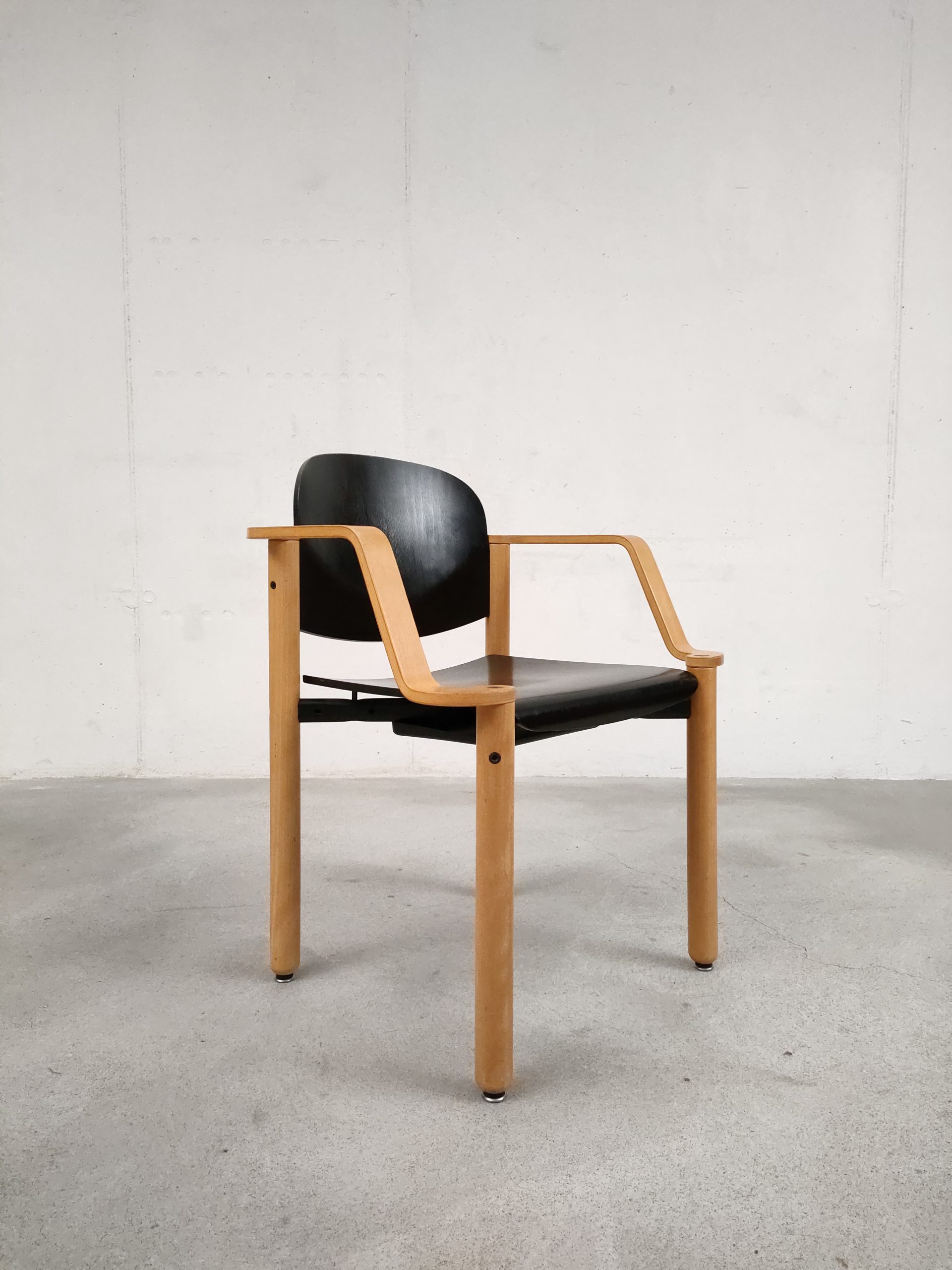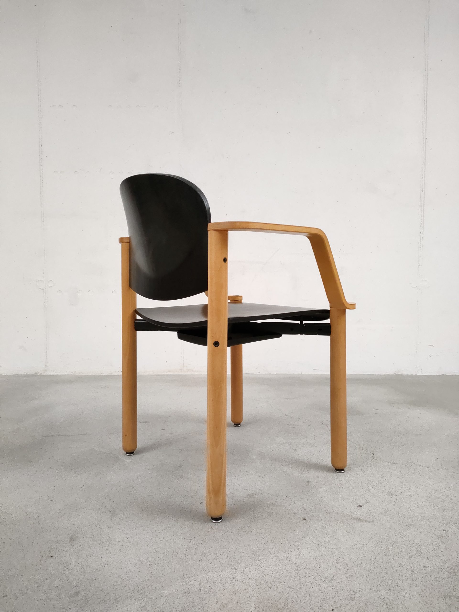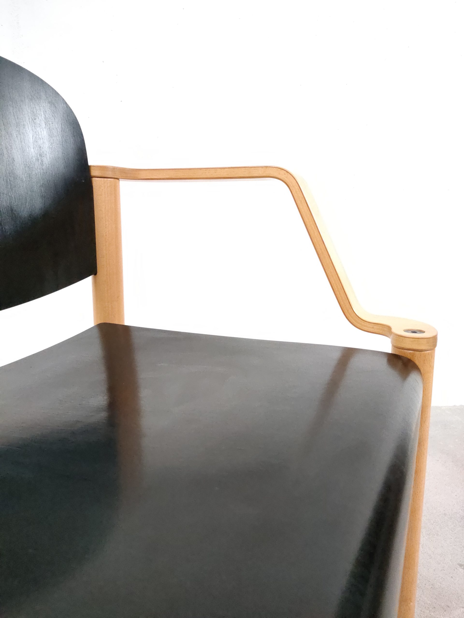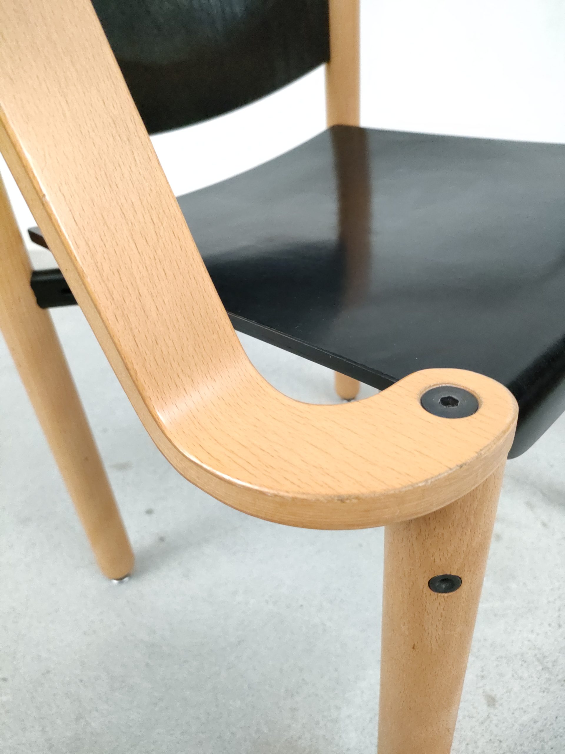 Produit venduChaise empilable avec structure en bois clair et assise et dossier en bois peint en noir. Produite par le fabricant suisse Dietiker.
