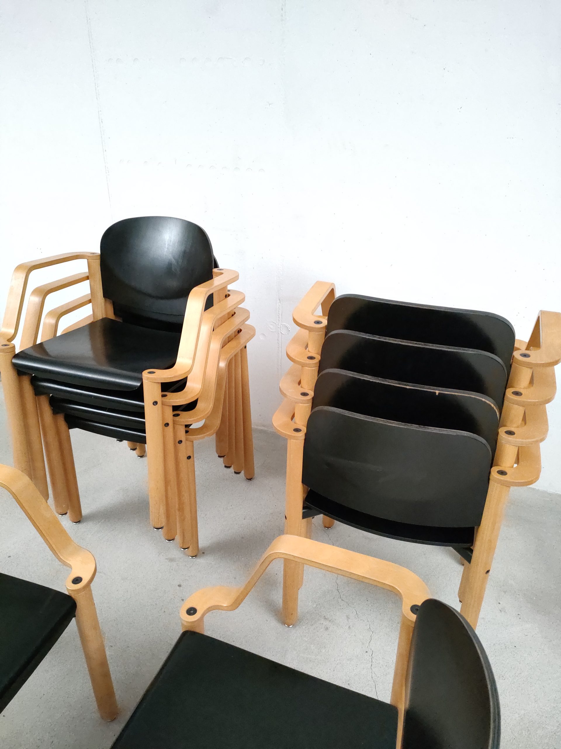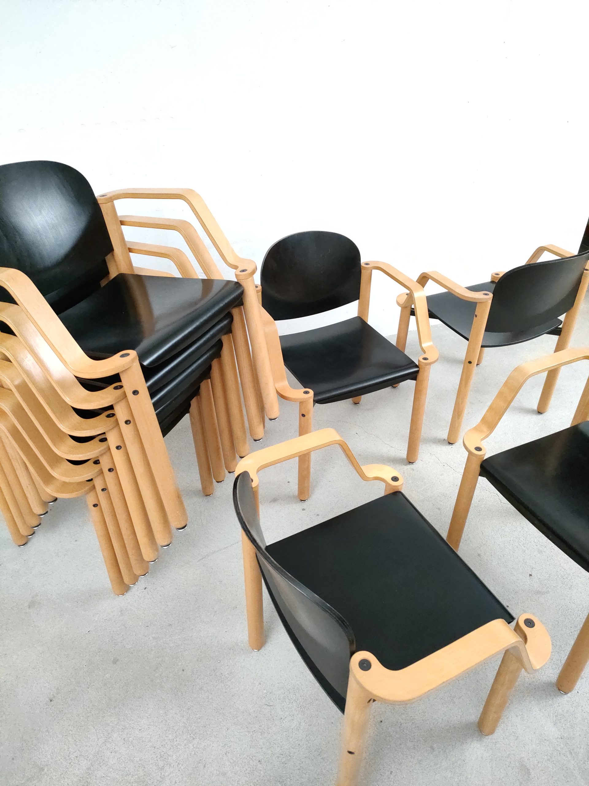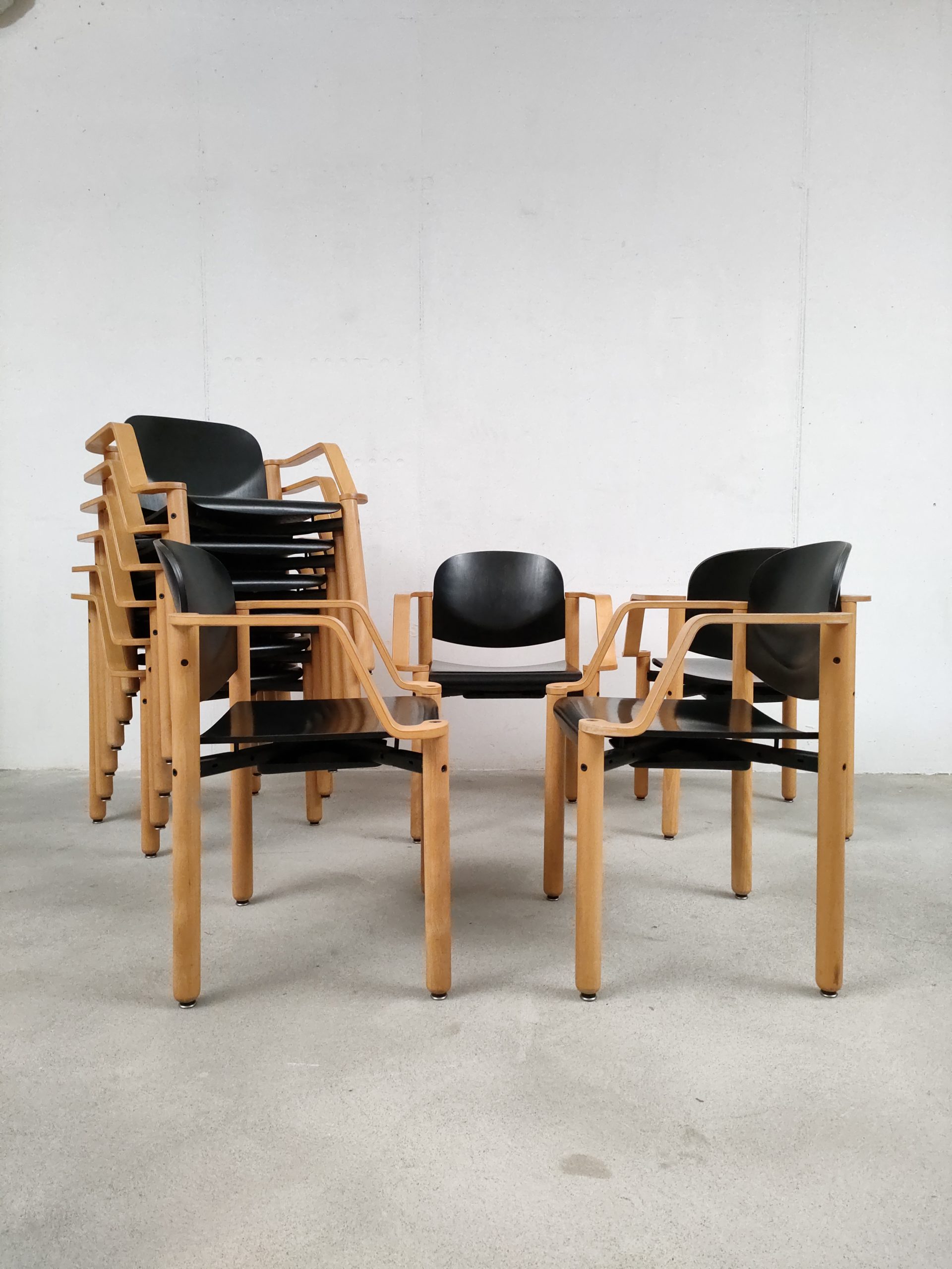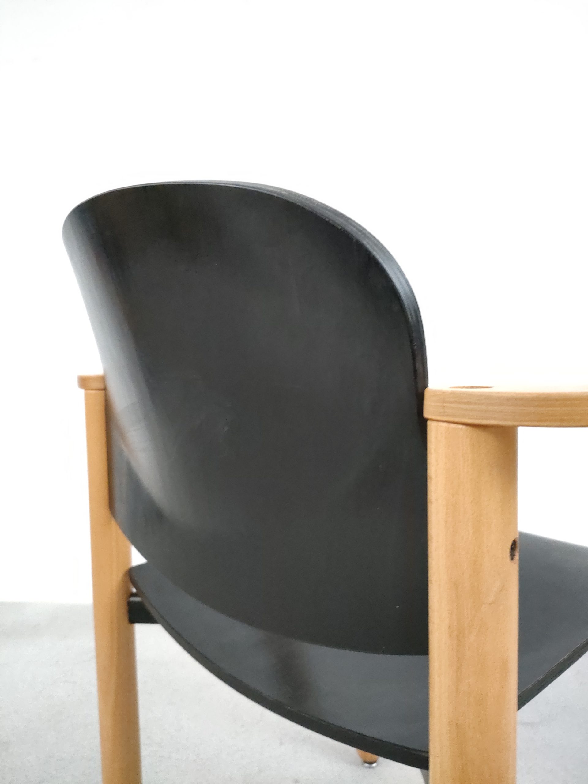 Produit venduChaise empilable avec structure en bois clair et assise et dossier en bois peint en noir. Produite par le fabricant suisse Dietiker.