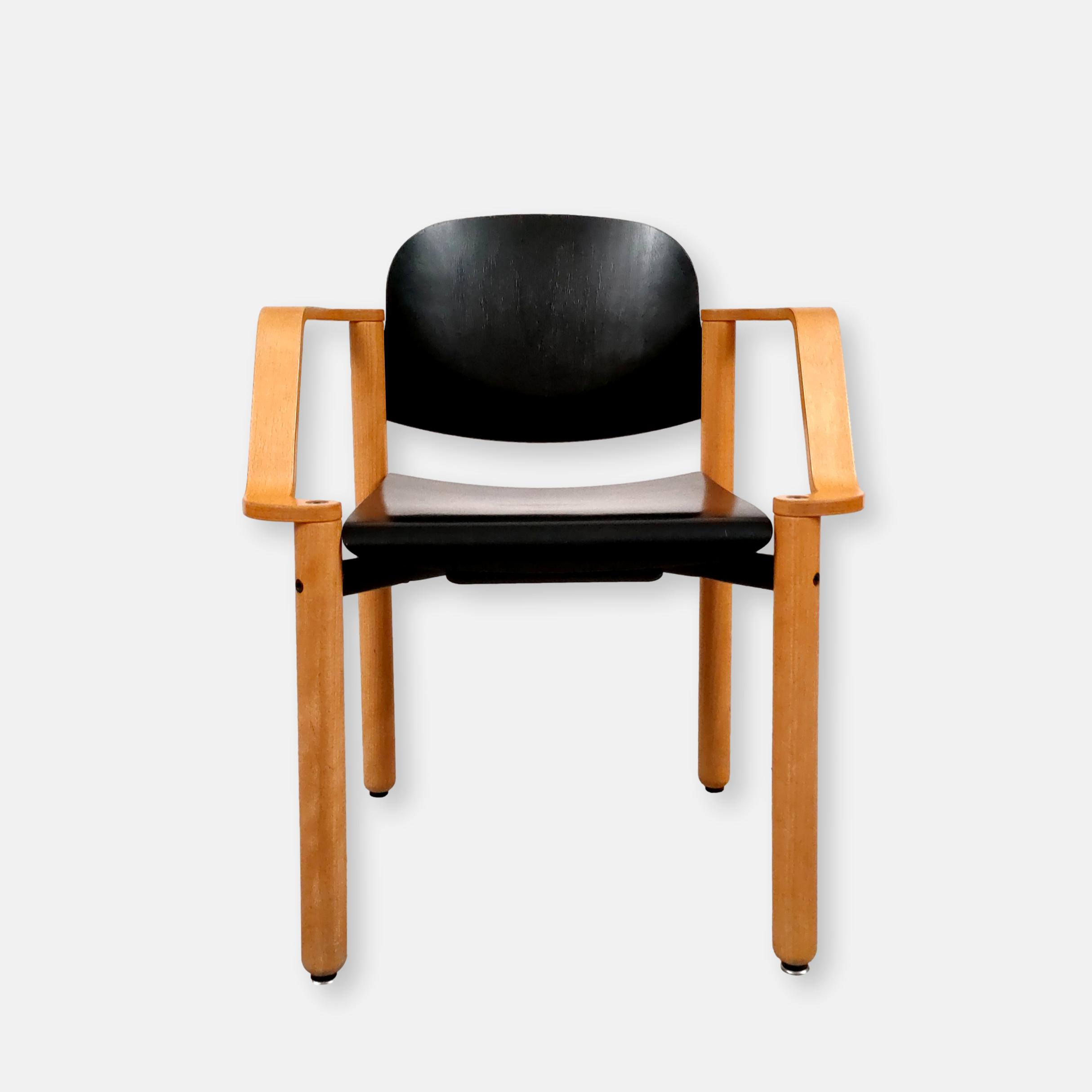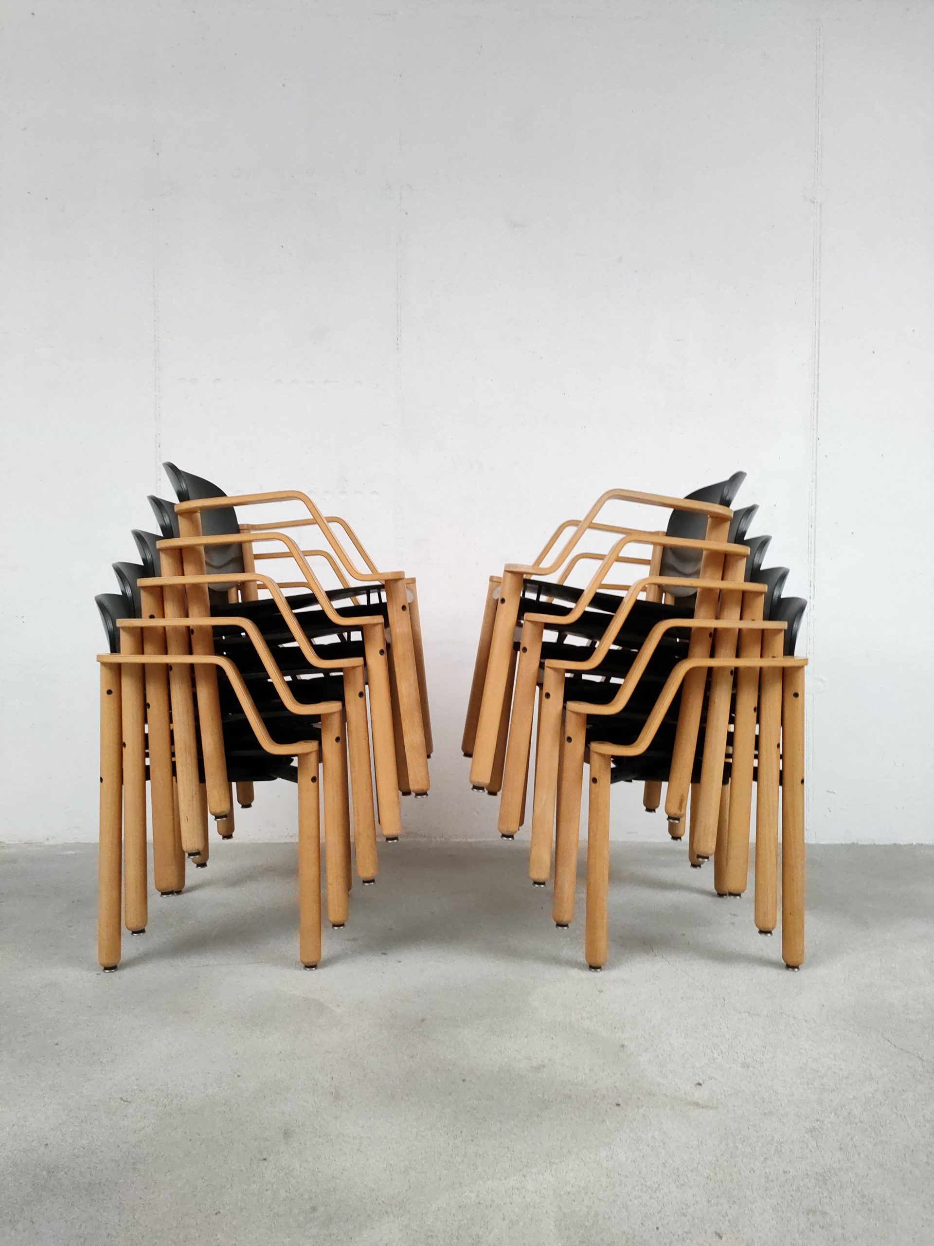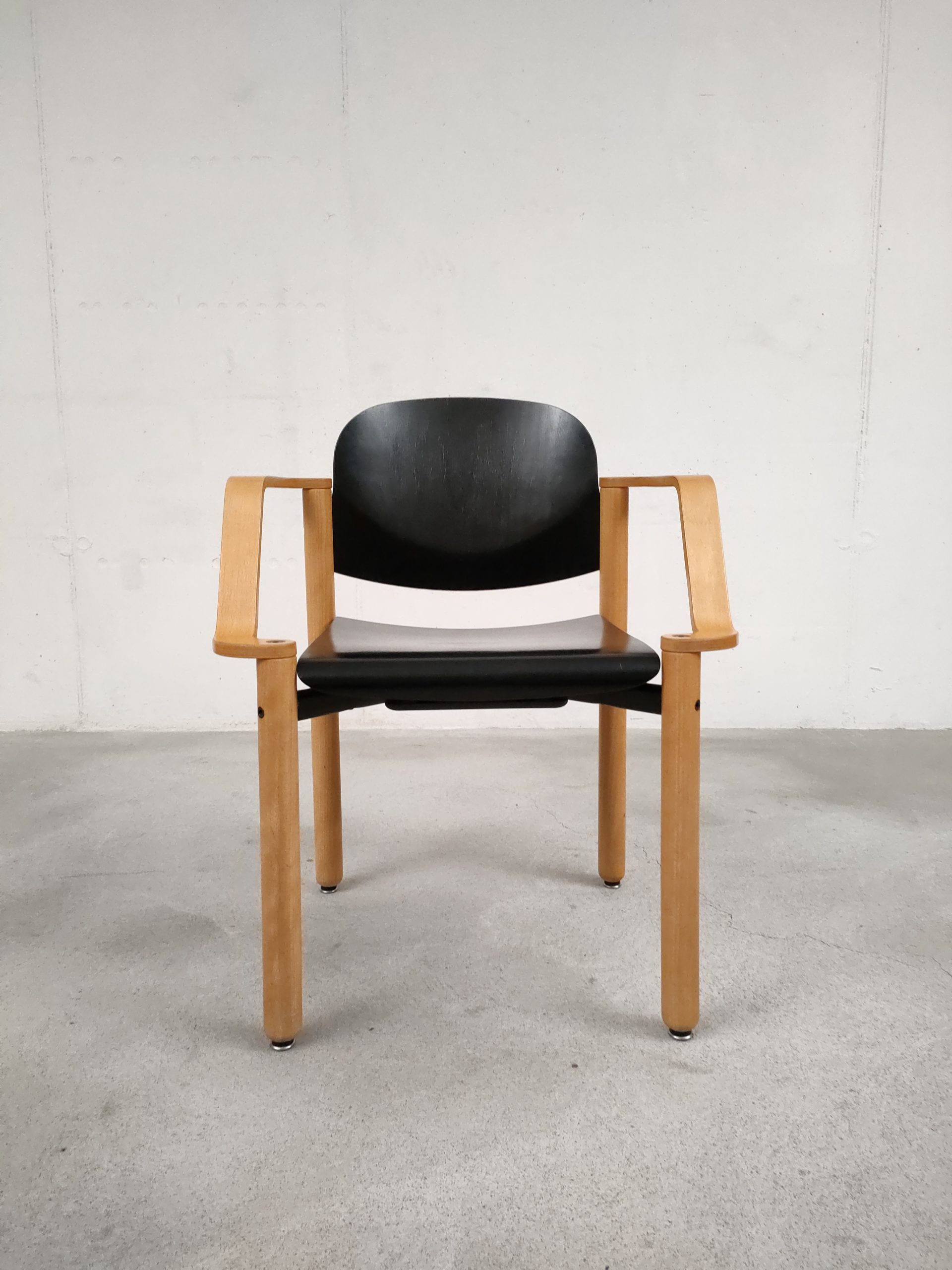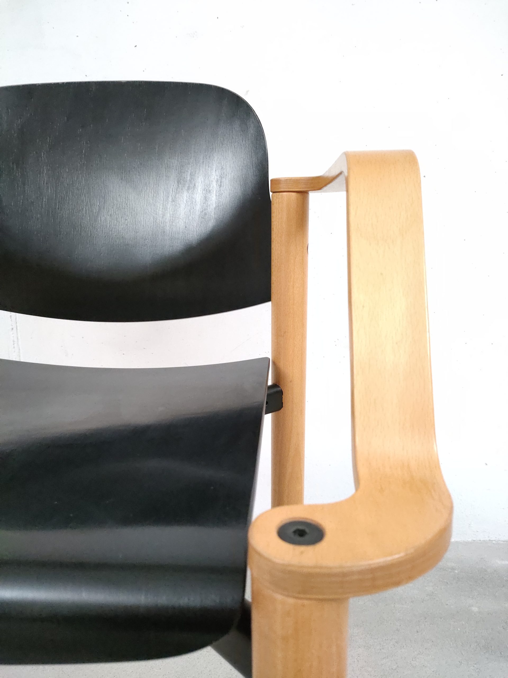 Produit venduChaise empilable avec structure en bois clair et assise et dossier en bois peint en noir. Produite par le fabricant suisse Dietiker.