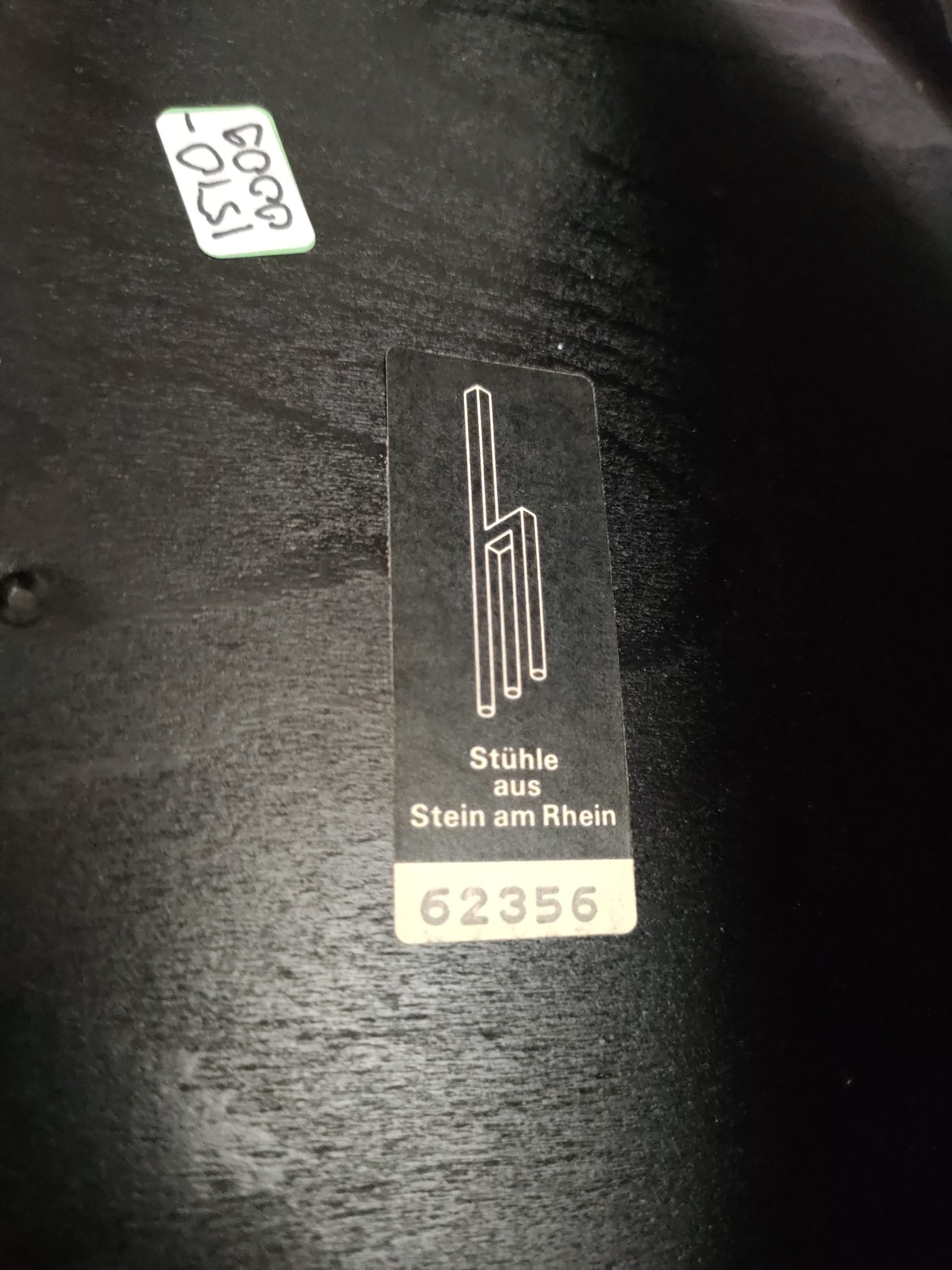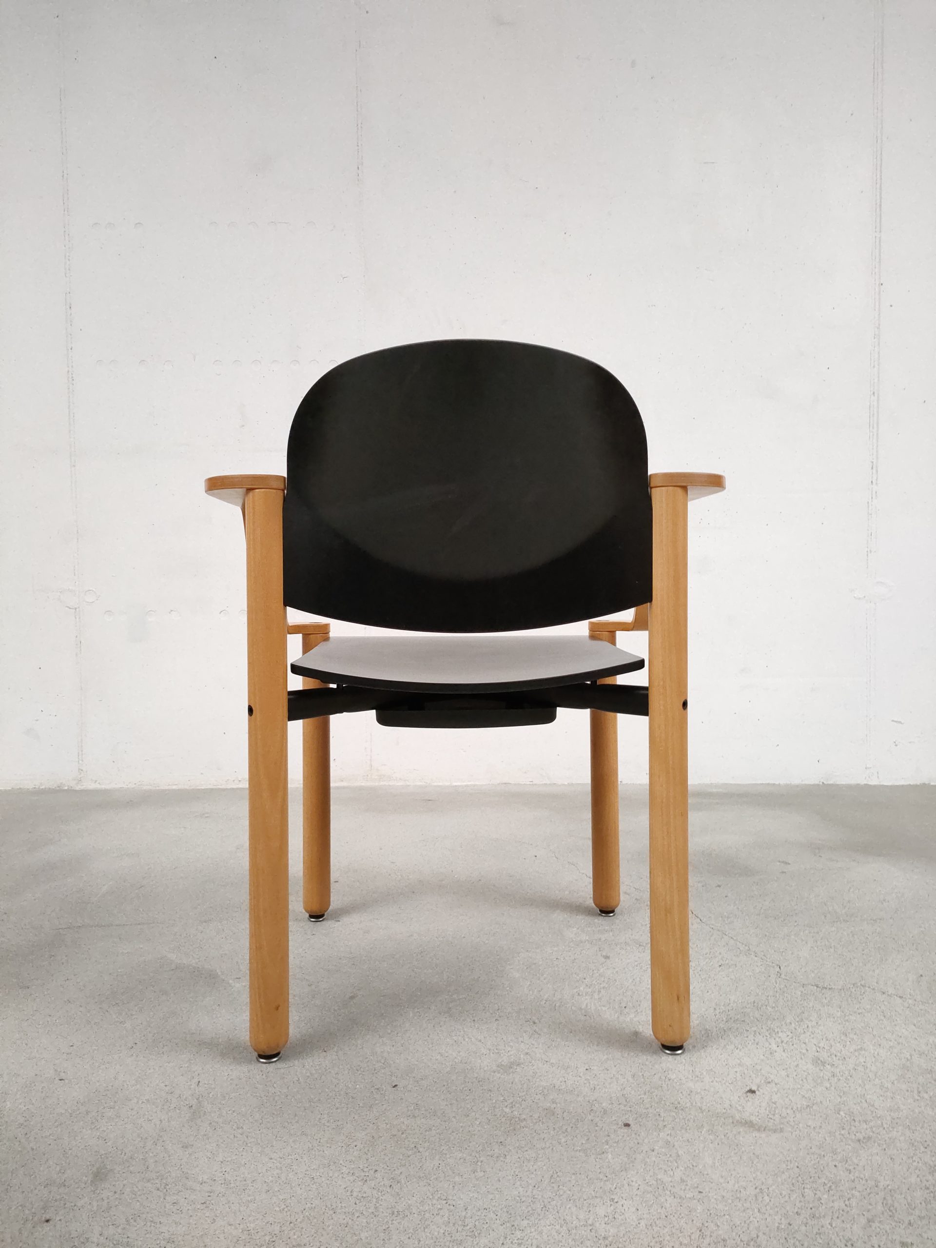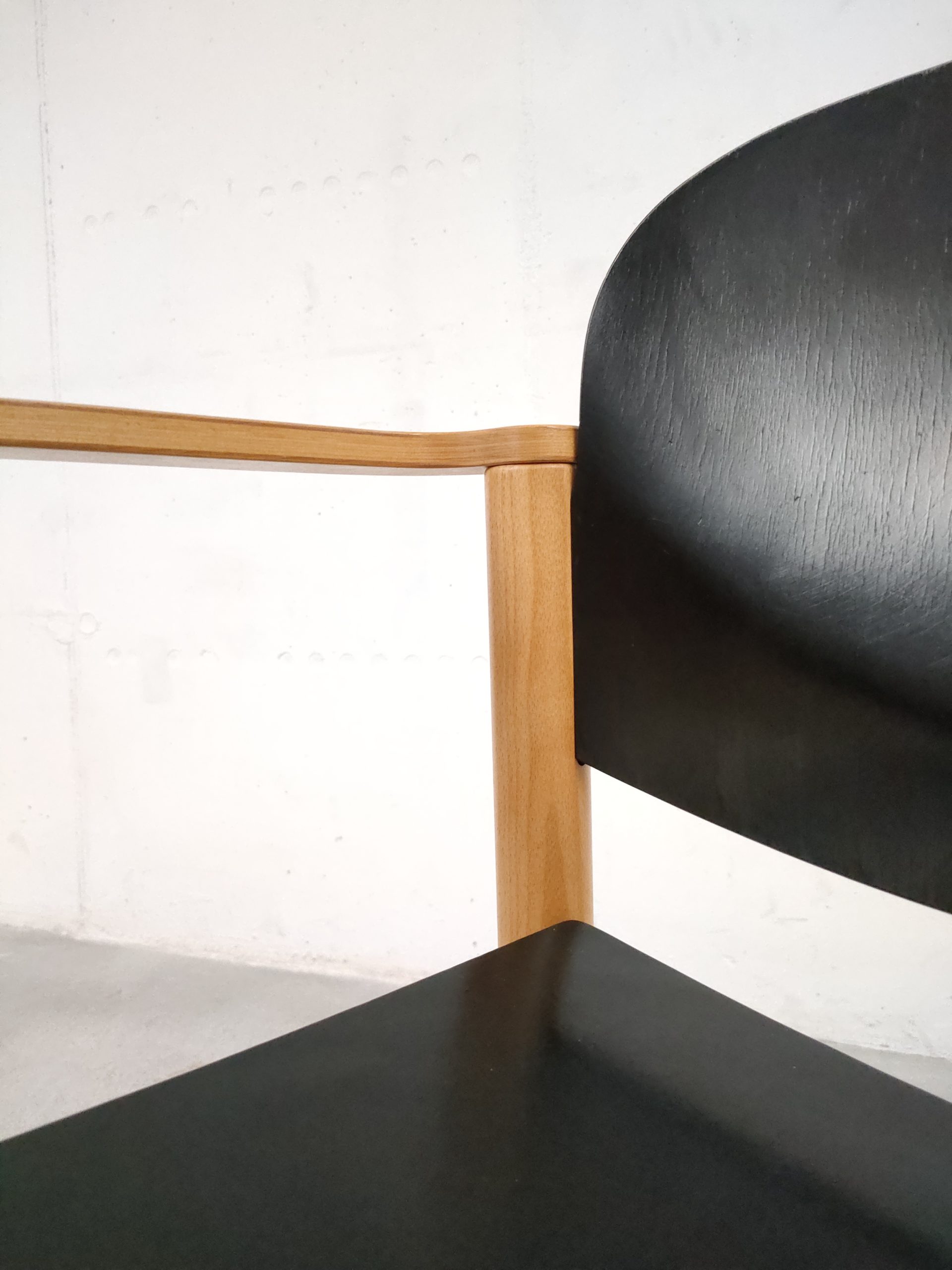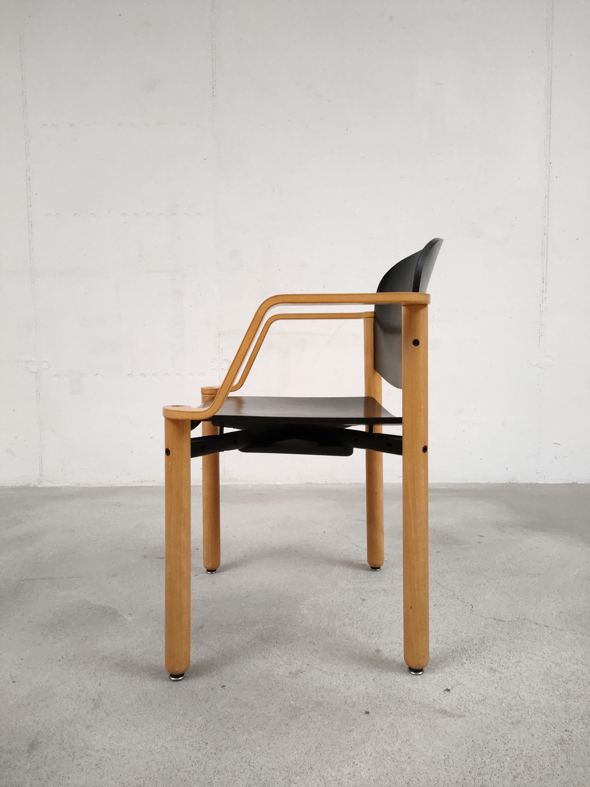 Produit venduChaise empilable avec structure en bois clair et assise et dossier en bois peint en noir. Produite par le fabricant suisse Dietiker.