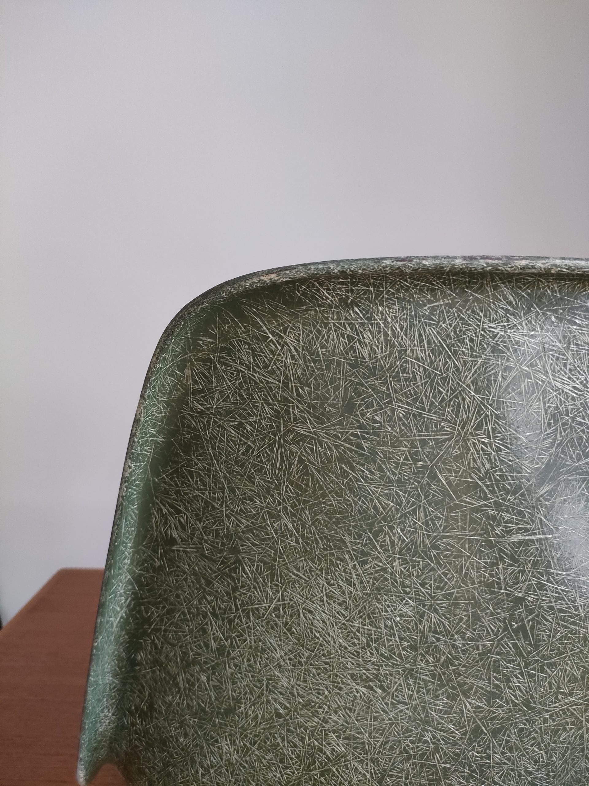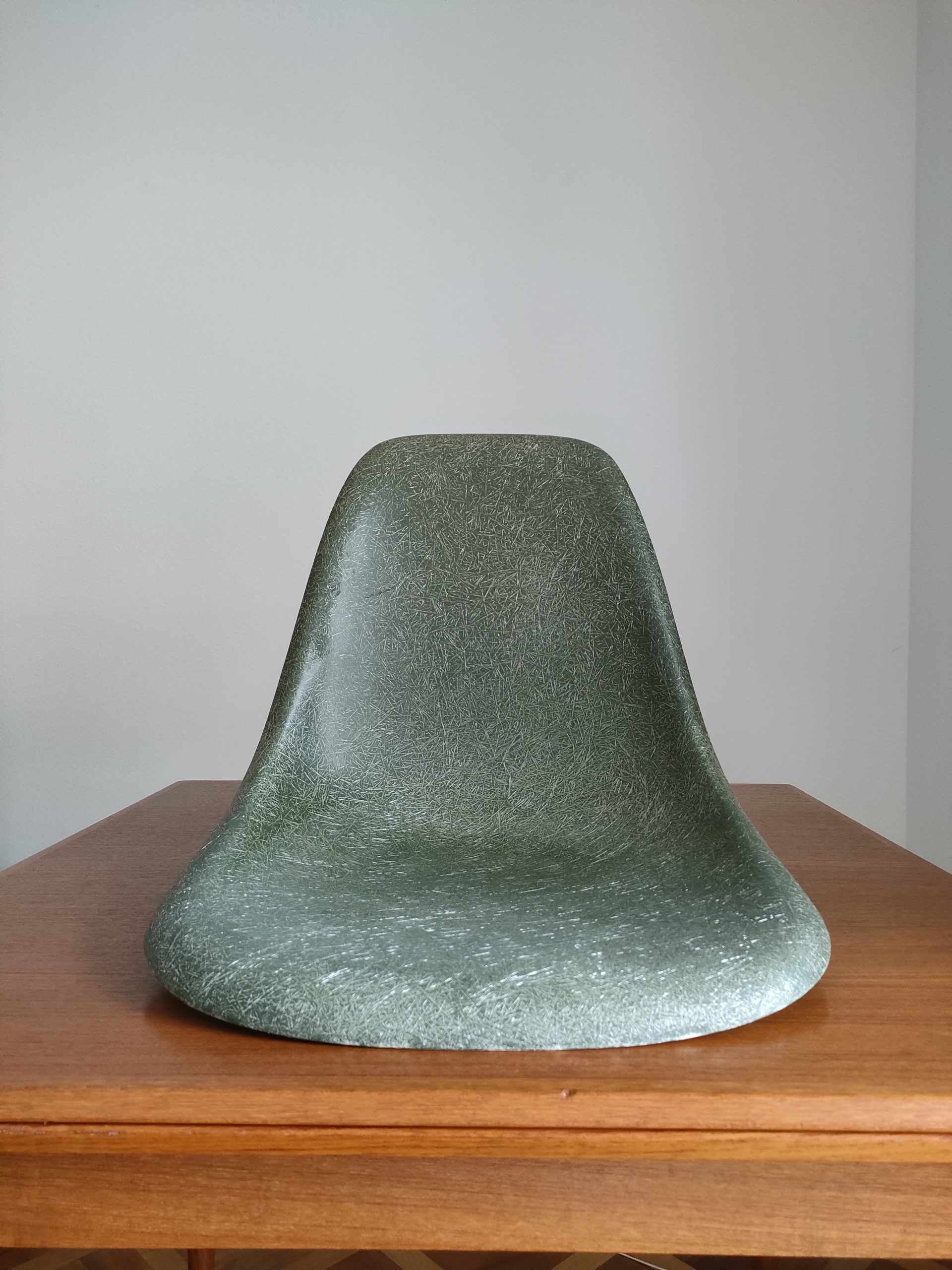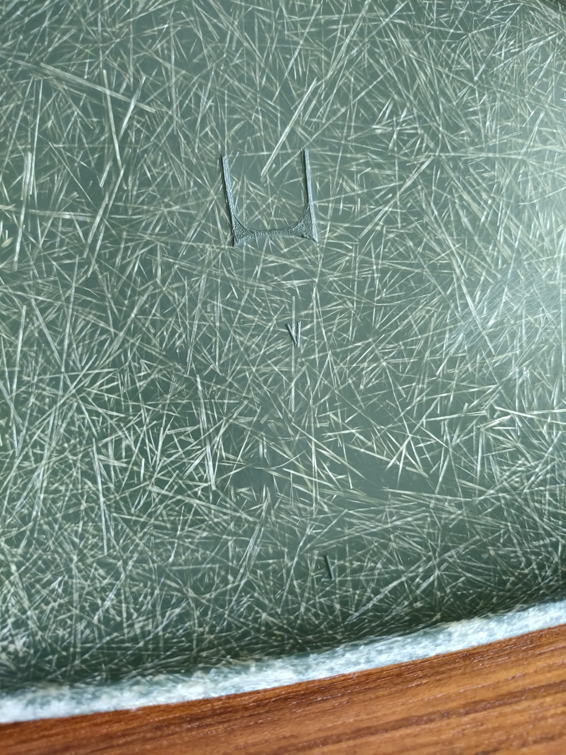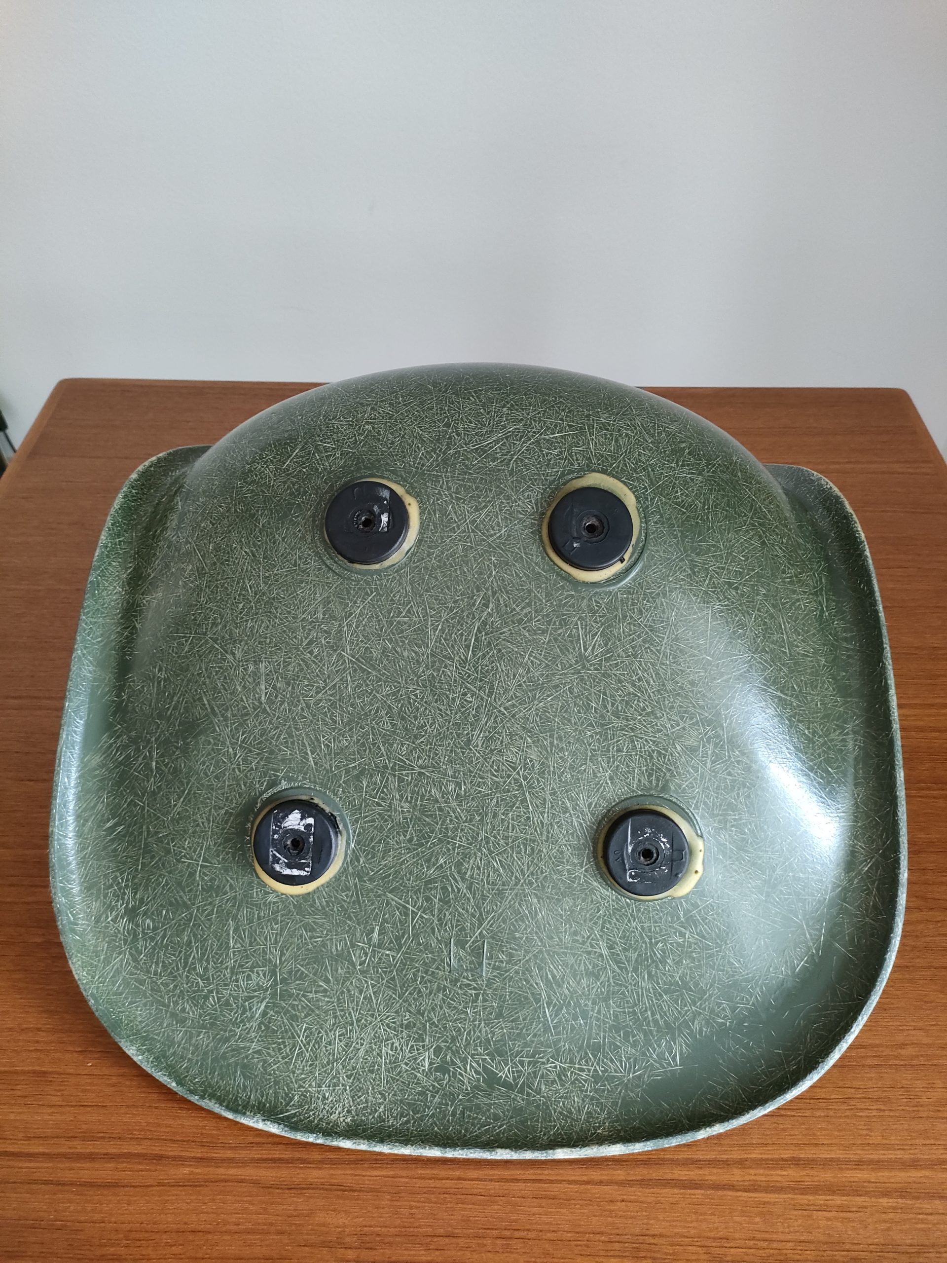 Coque en fibre de verre dessinée par Ray et Charles Eames. Version avec le logo Herman Miller et le V de Vitra. La couleur est forest green. La coque n’est pas fissurée et les schockmounts sont bien collés. Elle comportent des très légères traces du temps (voir photos) mais elles sont stables, solides et parfaitement fonctionnelles.