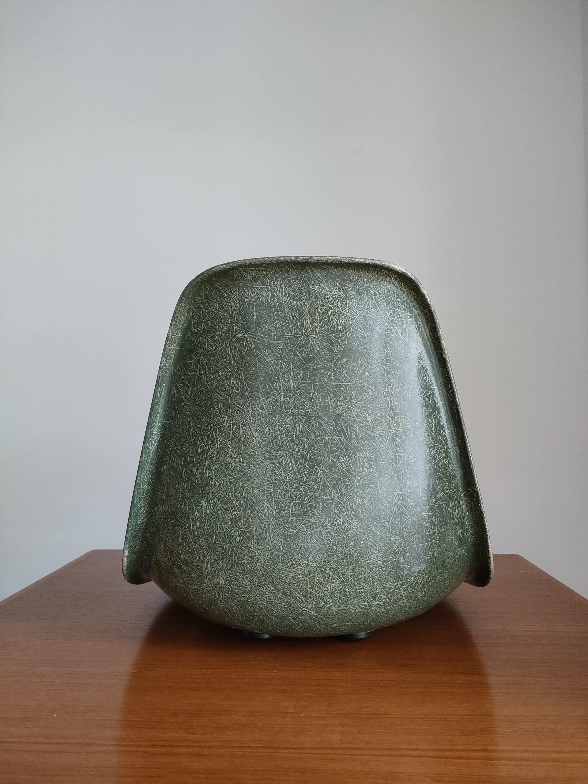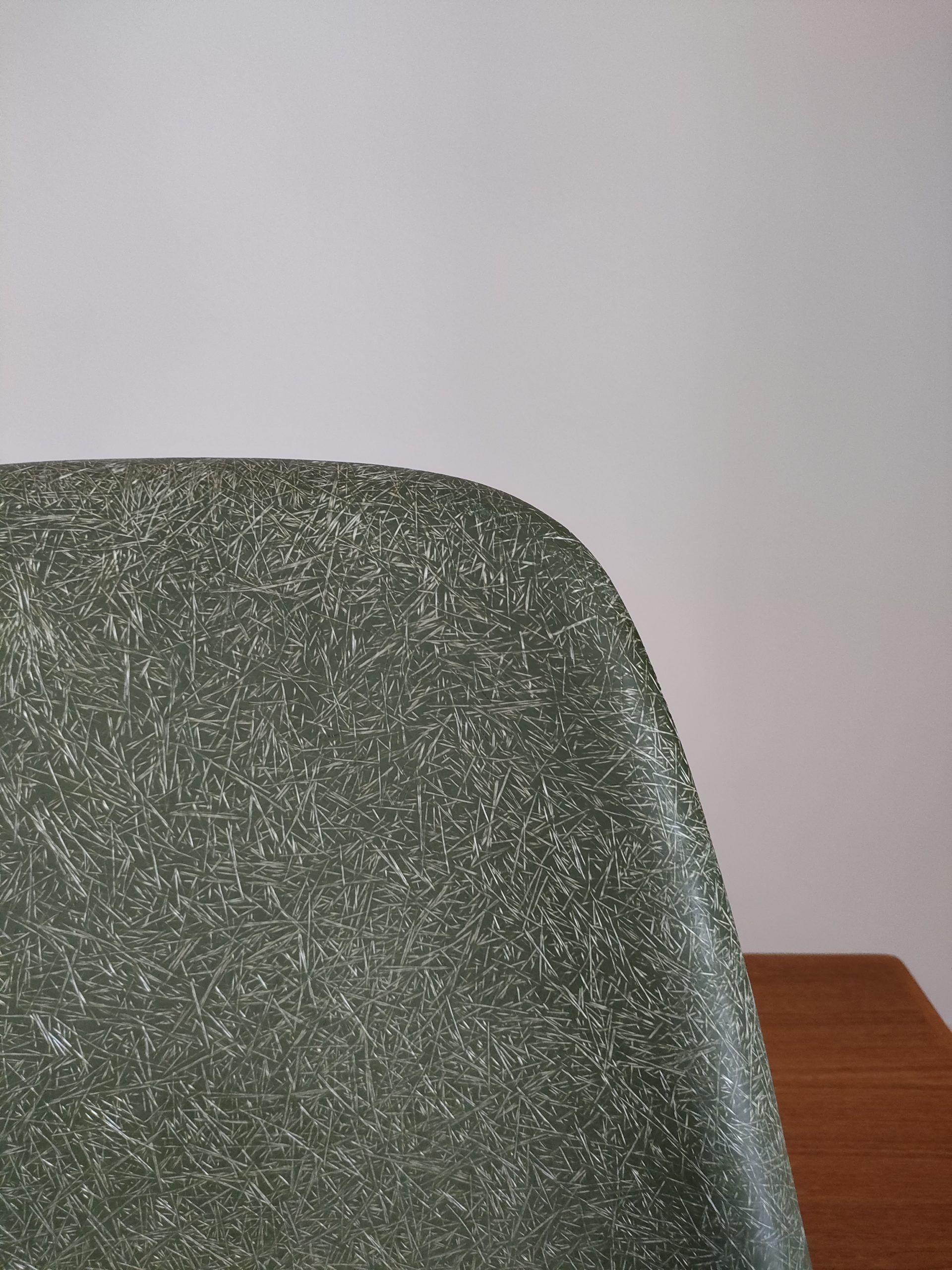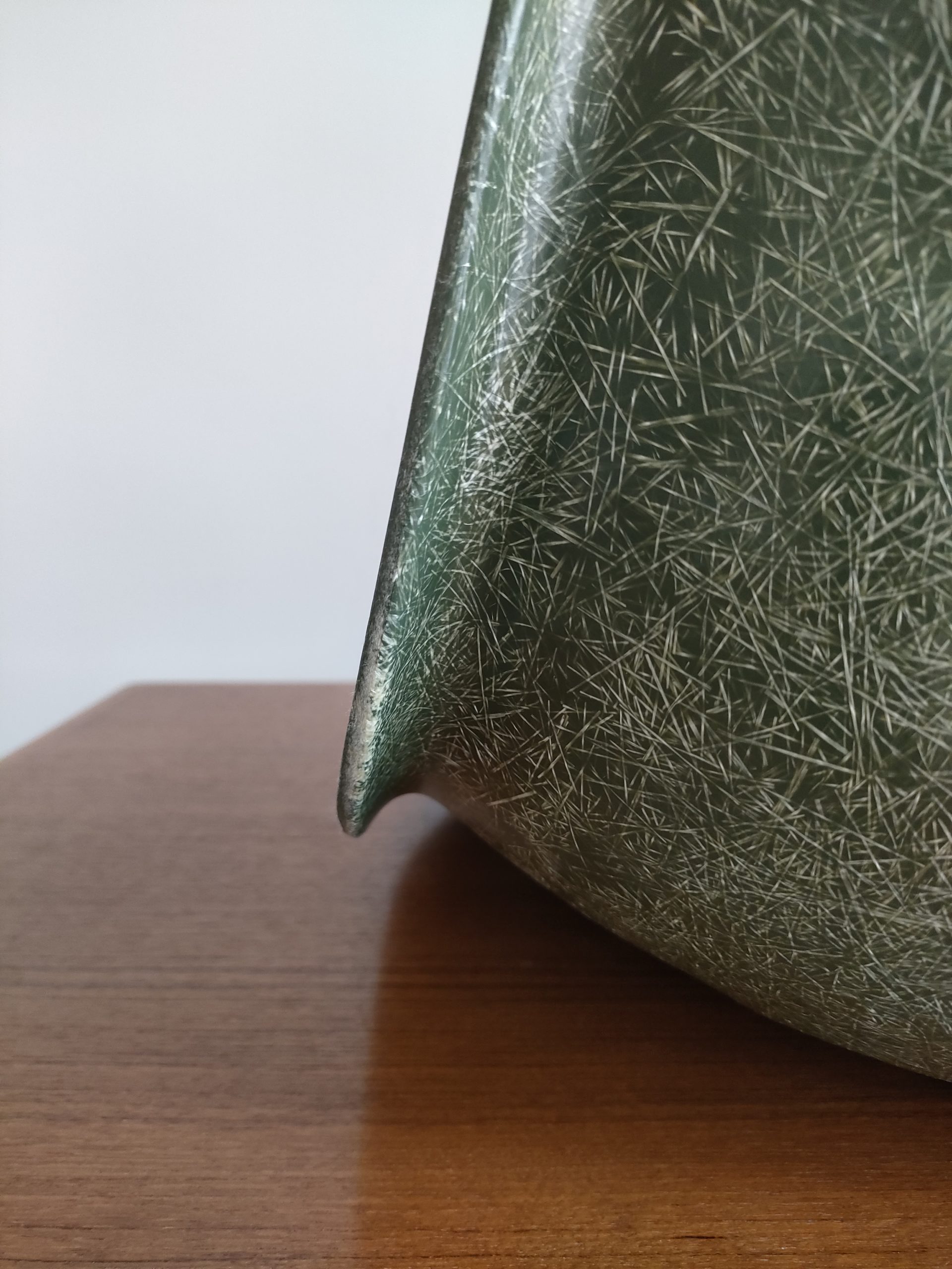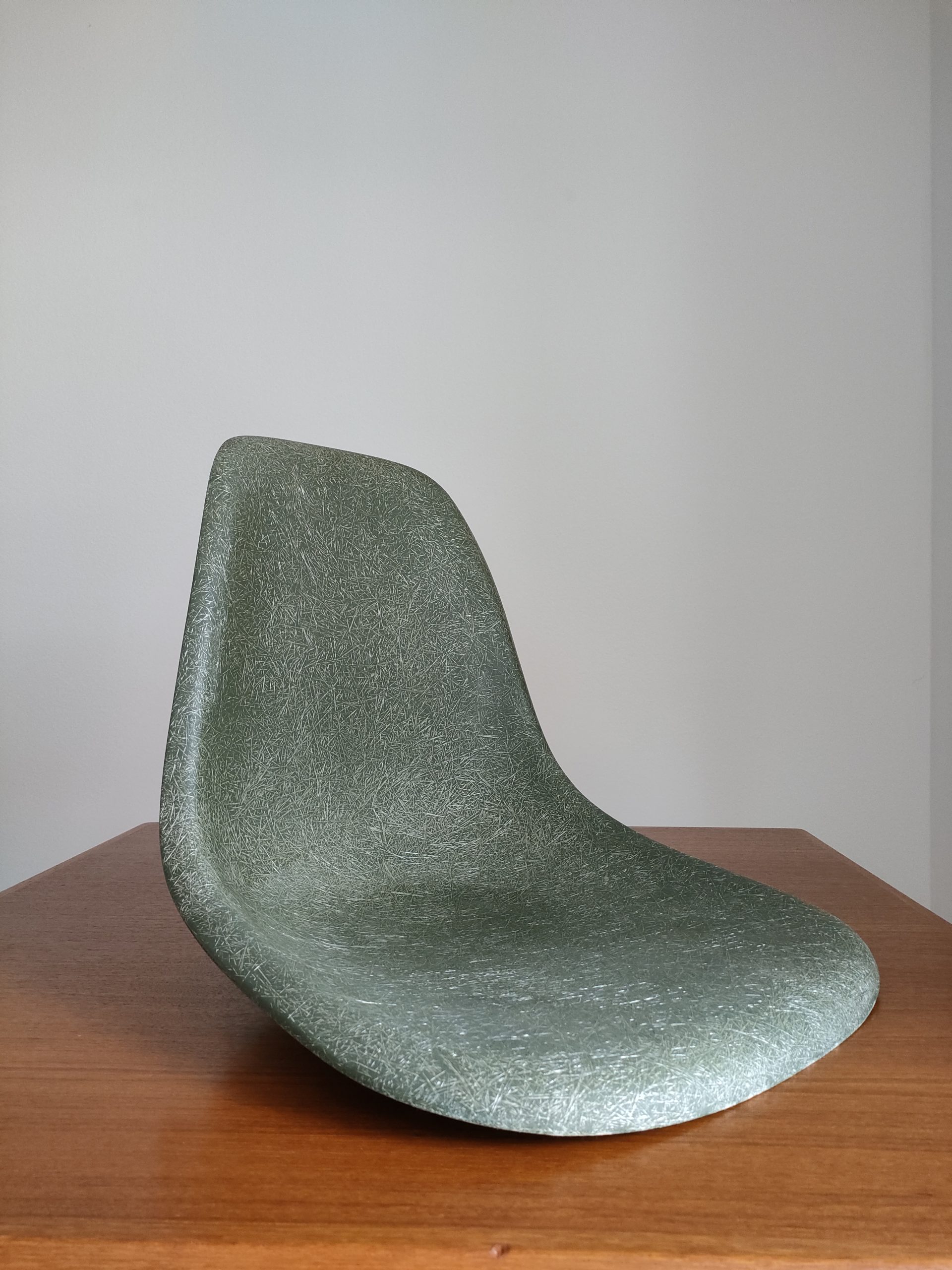 Coque en fibre de verre dessinée par Ray et Charles Eames. Version avec le logo Herman Miller et le V de Vitra. La couleur est forest green. La coque n’est pas fissurée et les schockmounts sont bien collés. Elle comportent des très légères traces du temps (voir photos) mais elles sont stables, solides et parfaitement fonctionnelles.