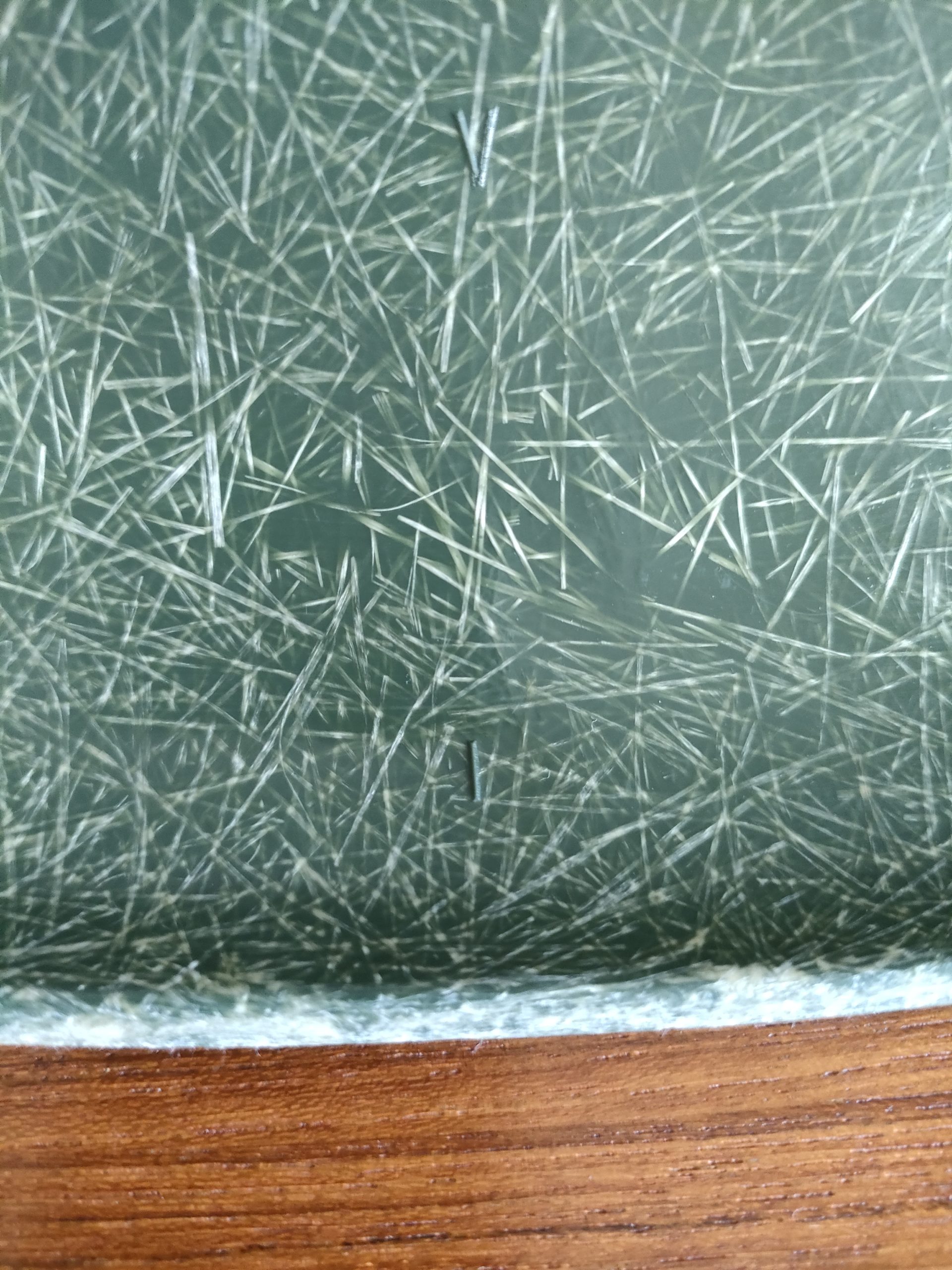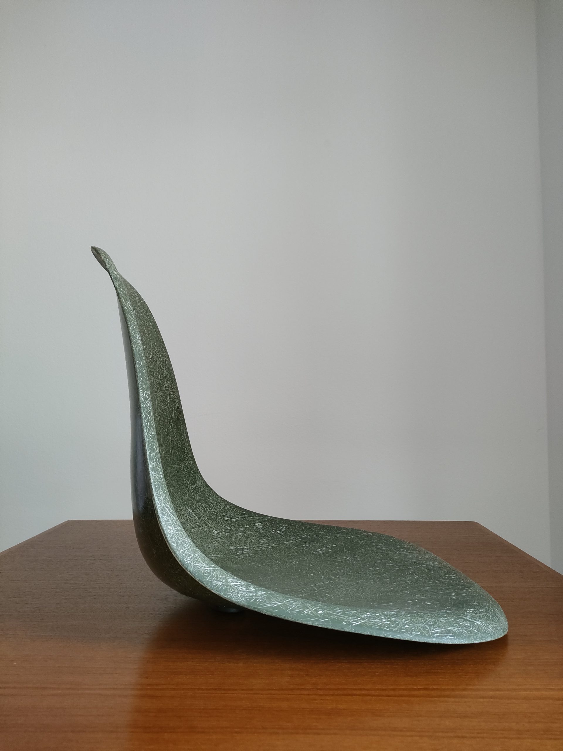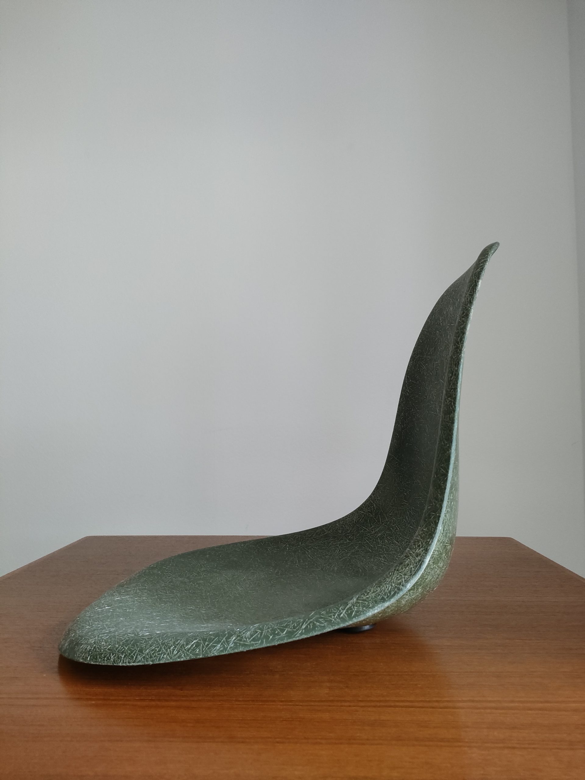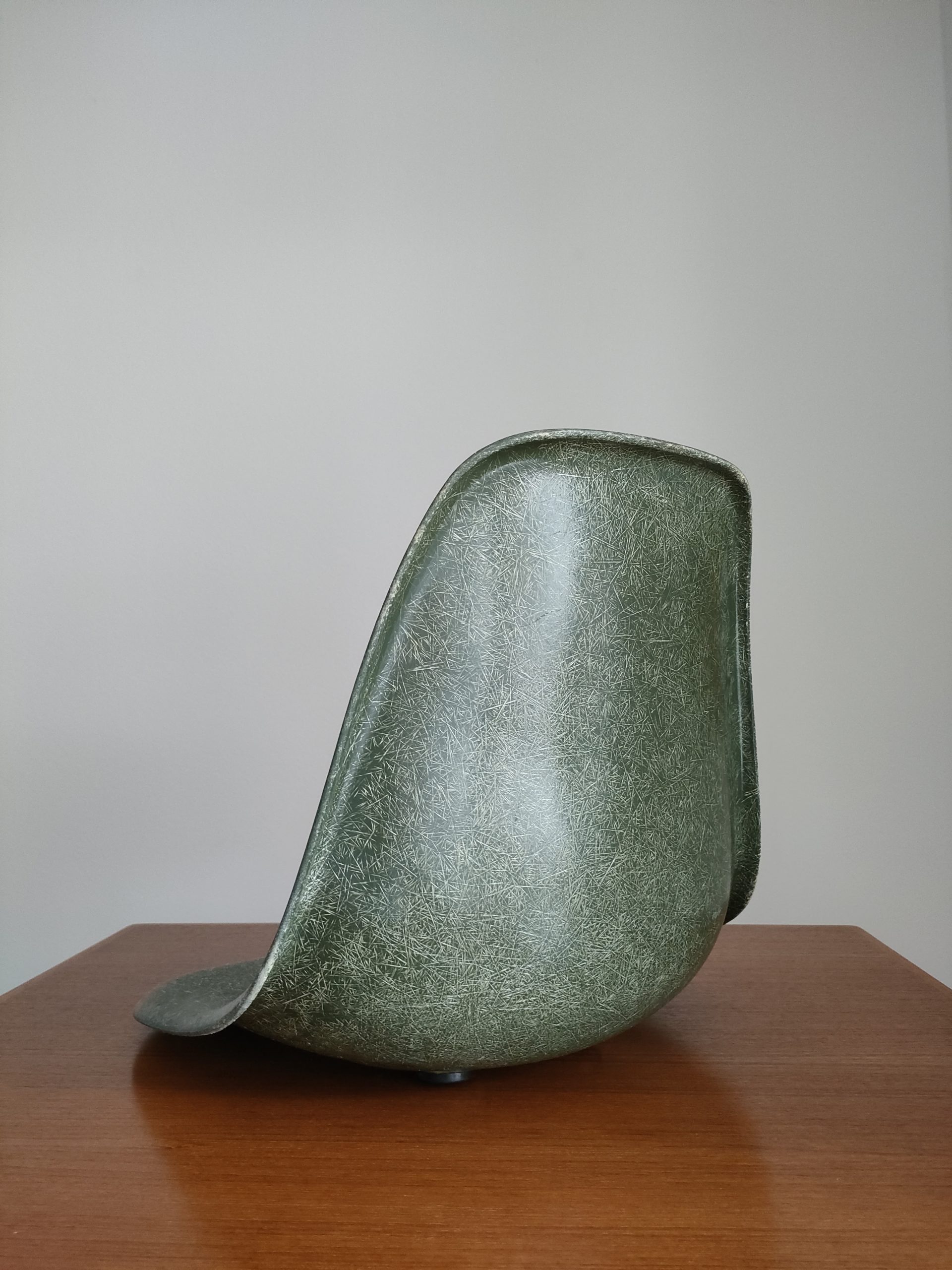 Coque en fibre de verre dessinée par Ray et Charles Eames. Version avec le logo Herman Miller et le V de Vitra. La couleur est forest green. La coque n’est pas fissurée et les schockmounts sont bien collés. Elle comportent des très légères traces du temps (voir photos) mais elles sont stables, solides et parfaitement fonctionnelles.