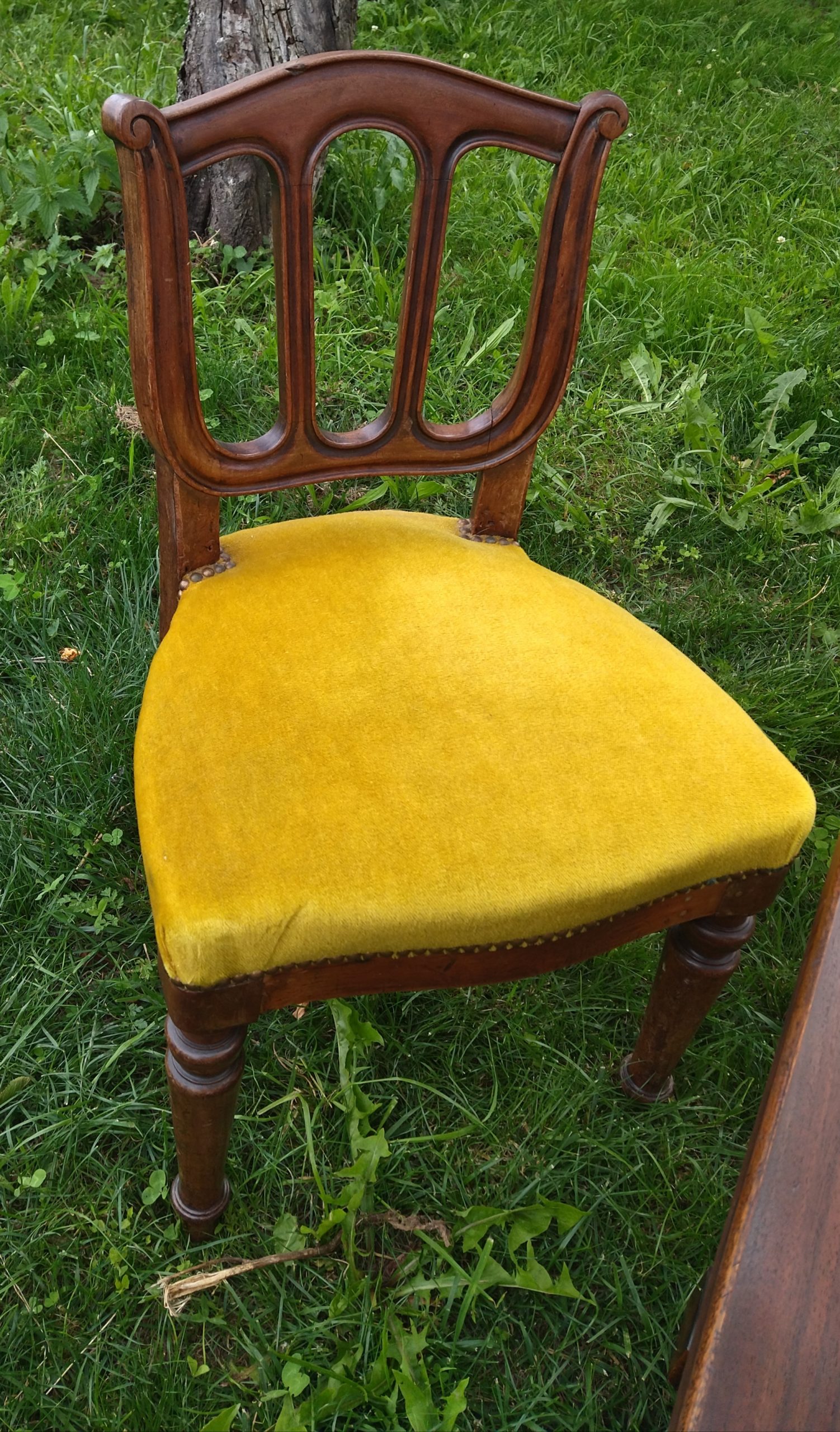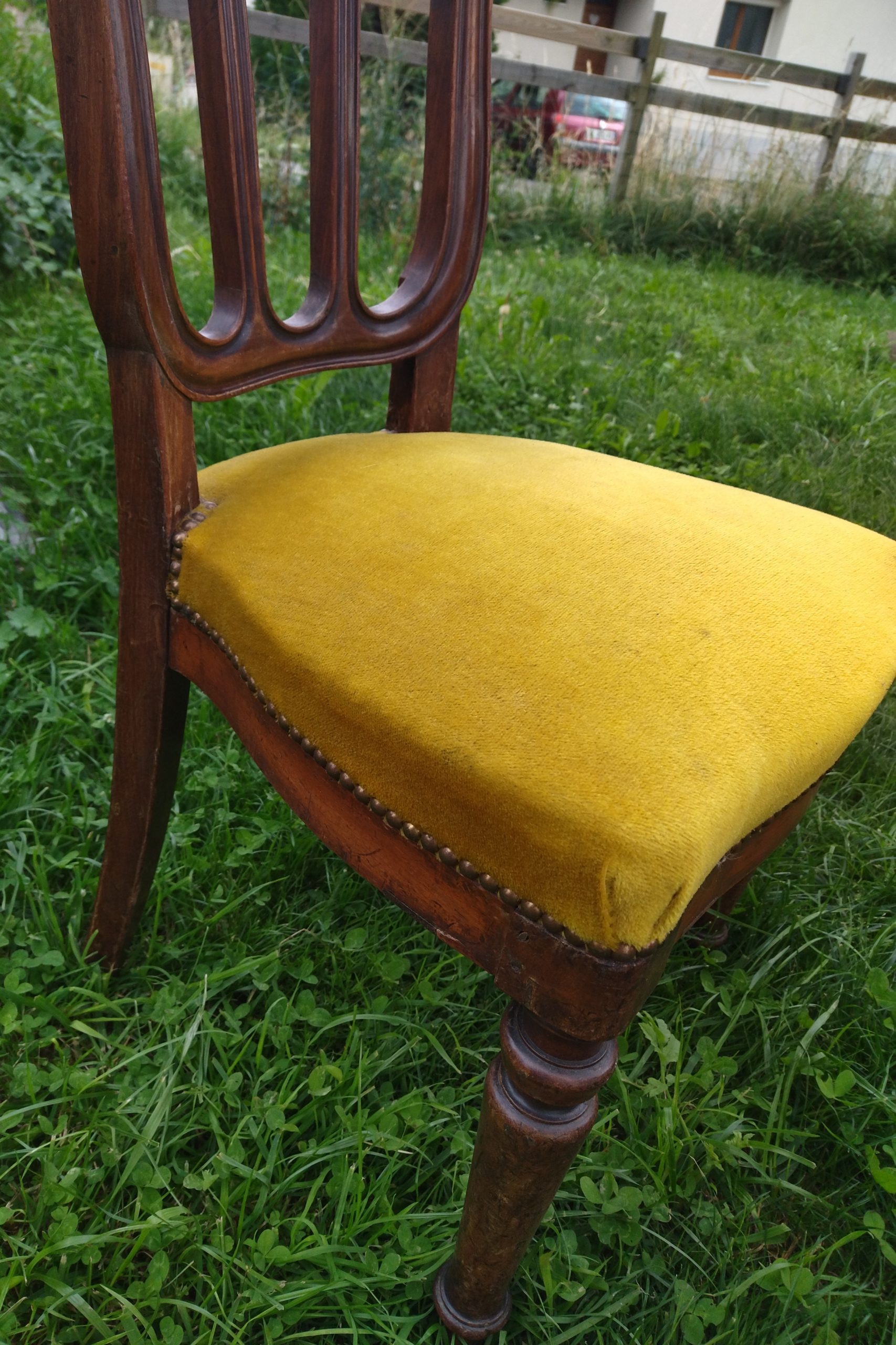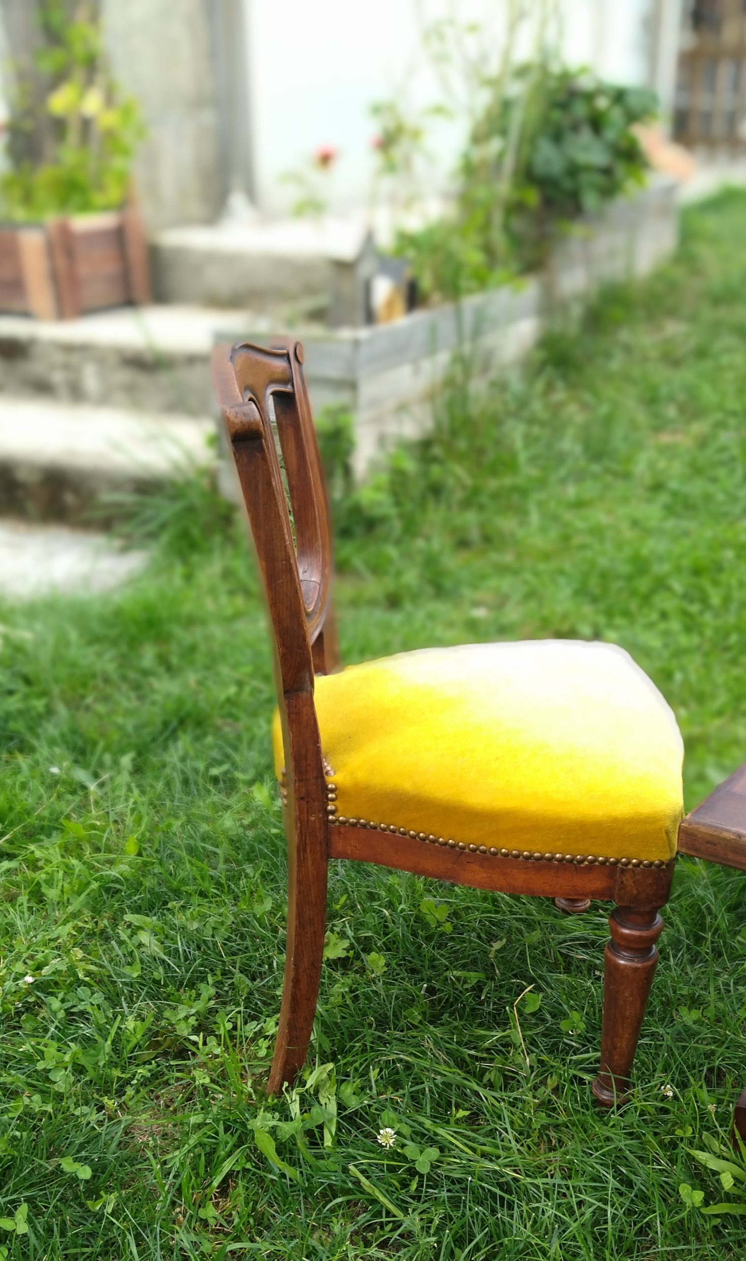 Produit venduLot de 4 chaises anciennes en bois avec assise de couleur vert jaune anis.