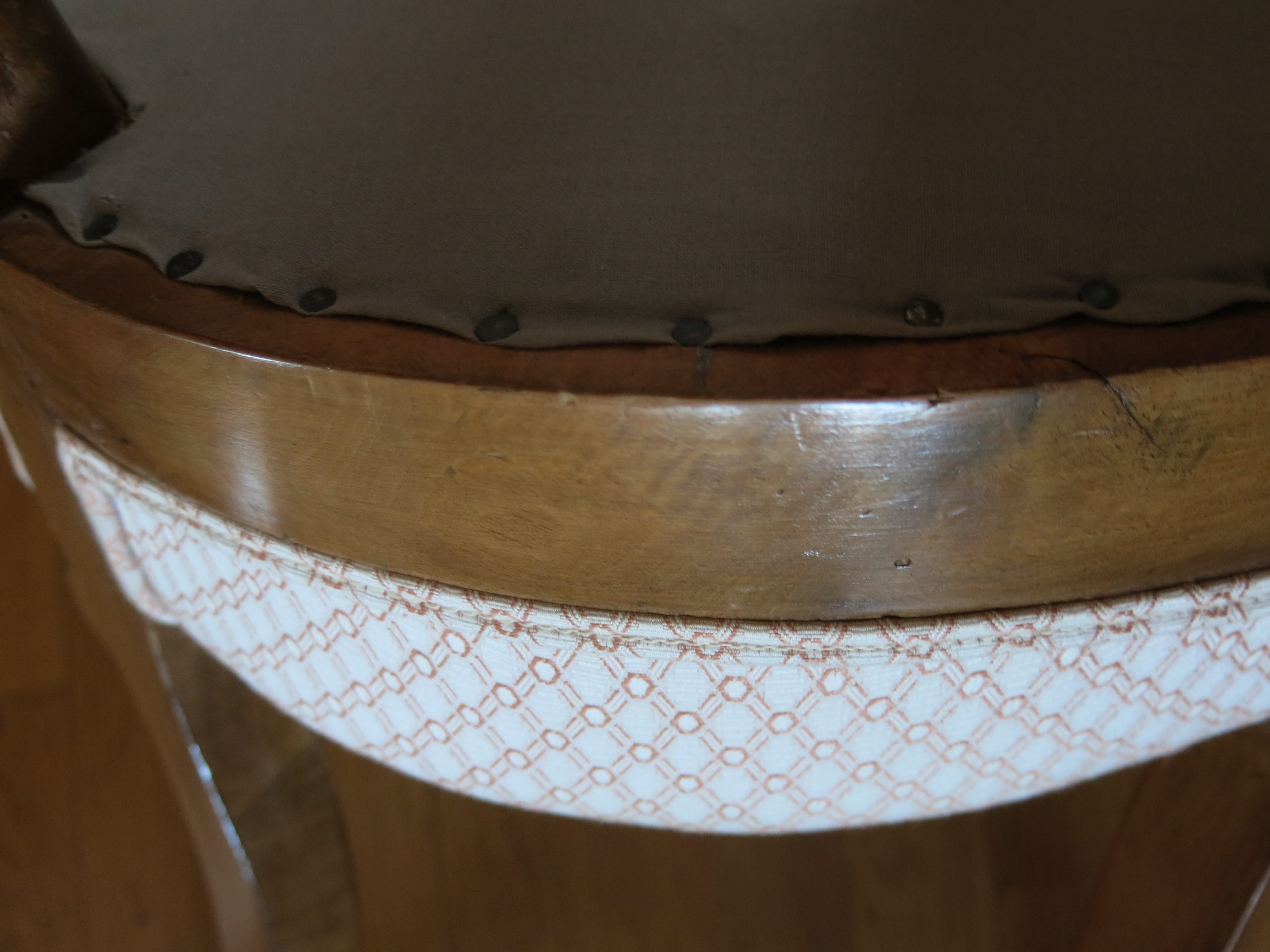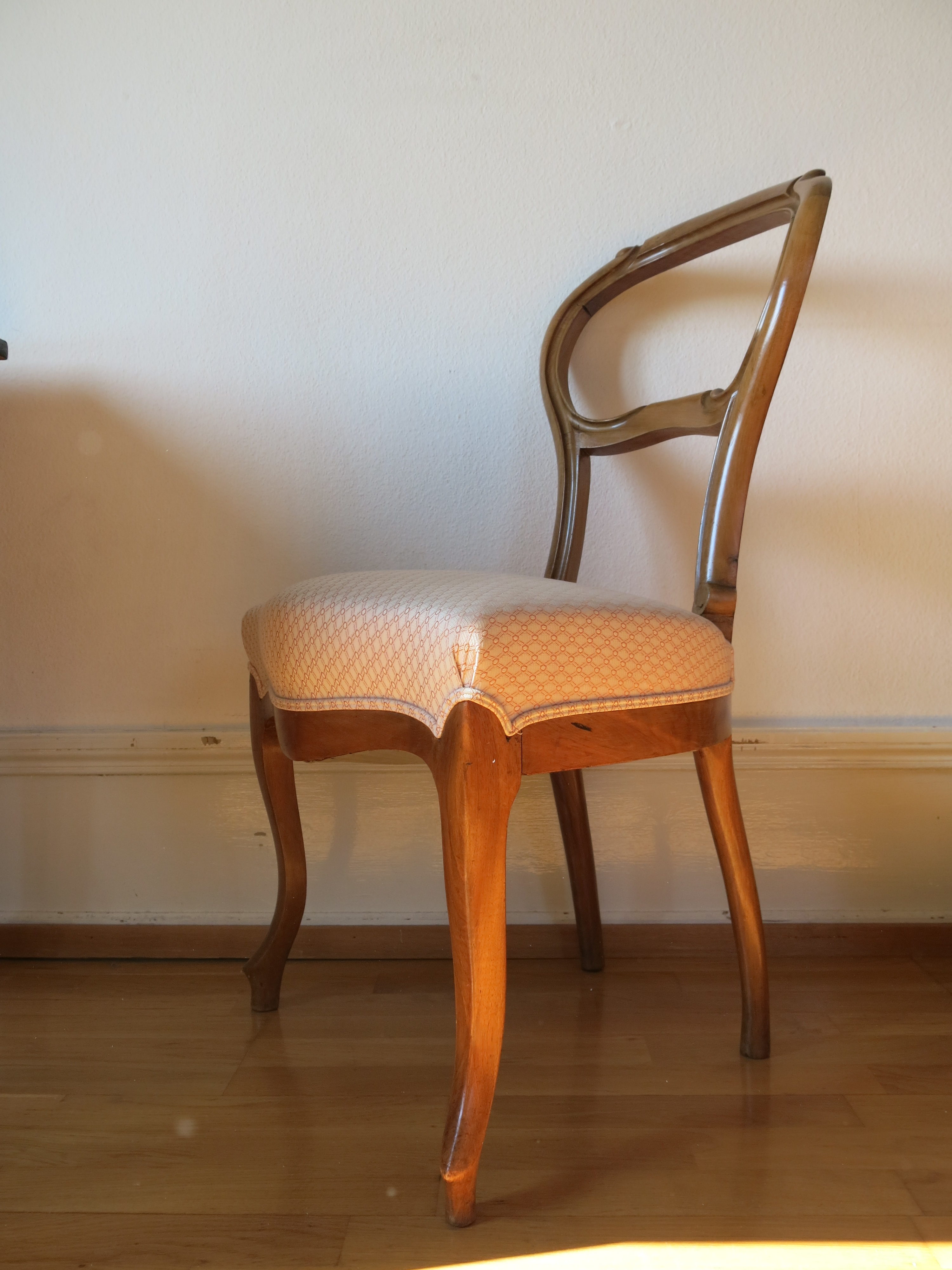 Lot de 4 chaises en bois, tissu de l’assise refait à neuf. Les chaises (structure et tissu) sont en excellent état.