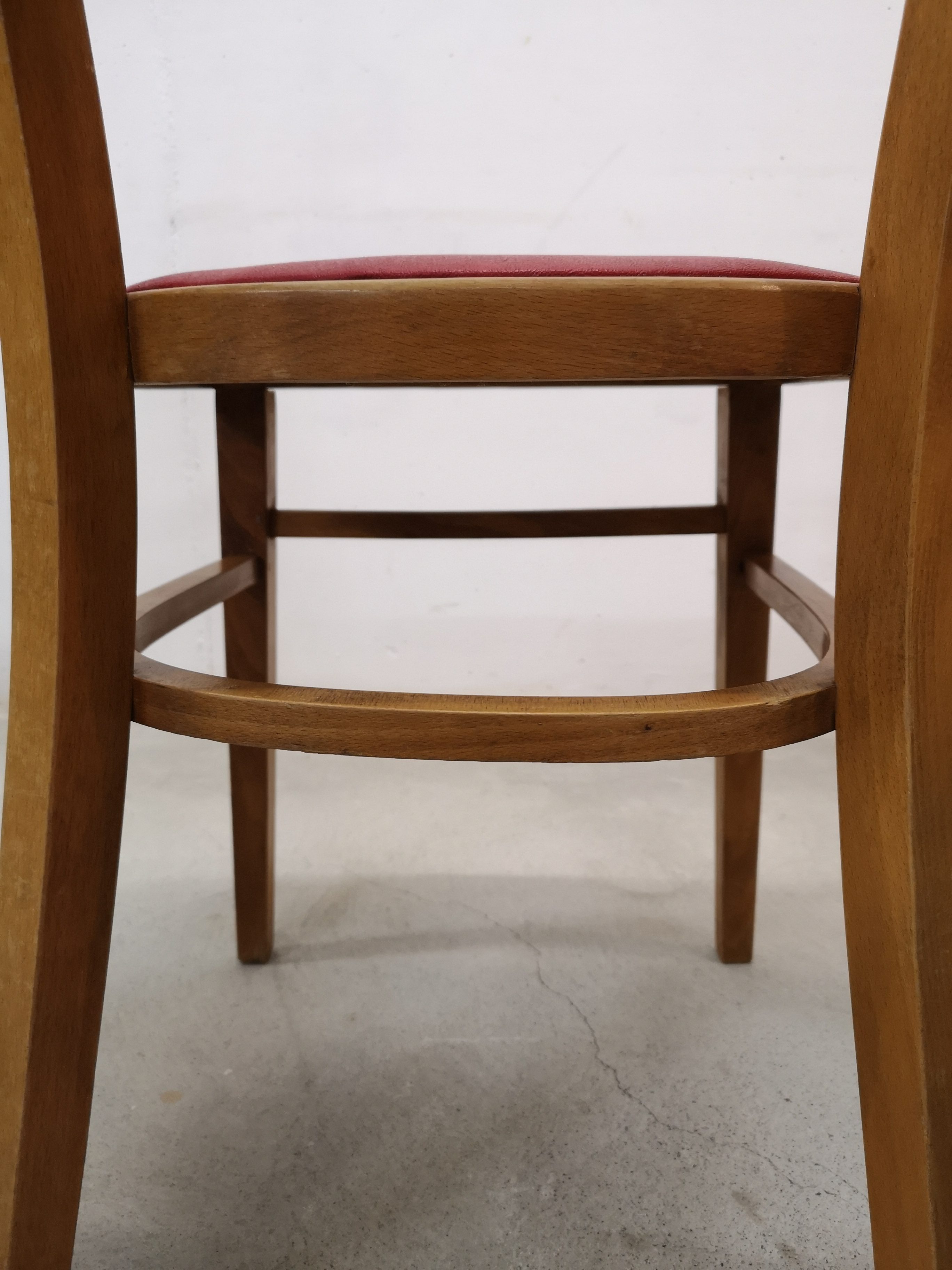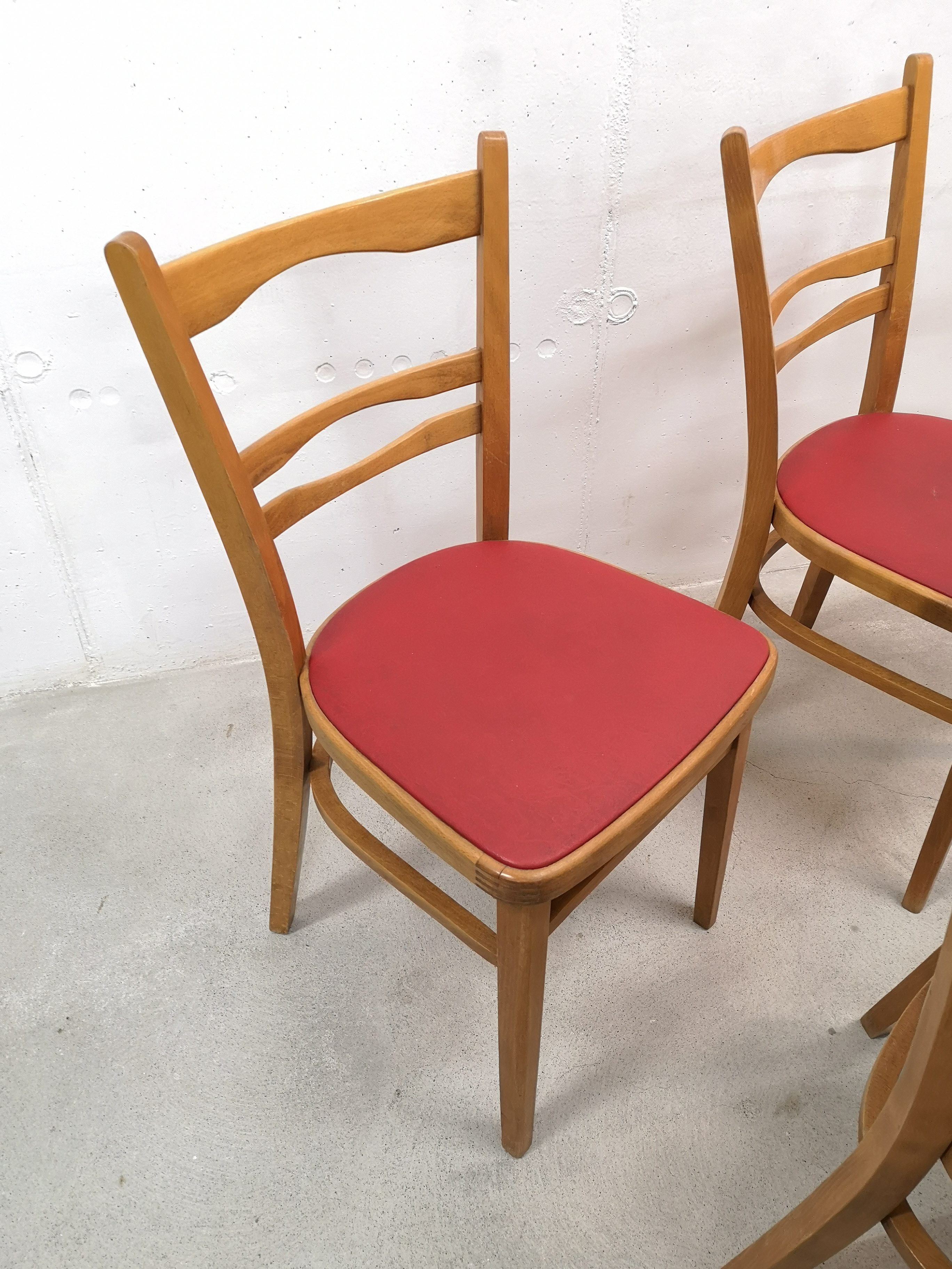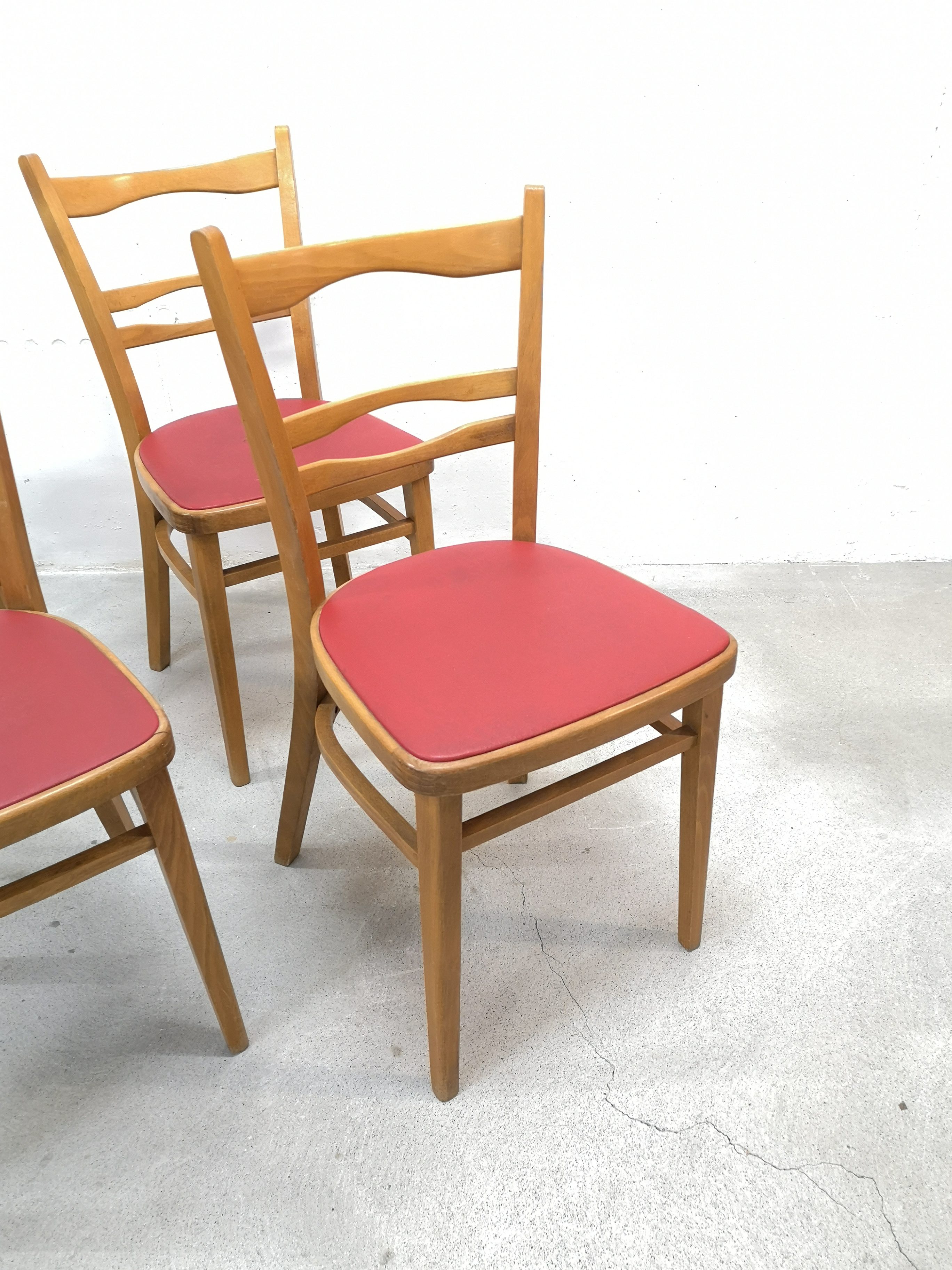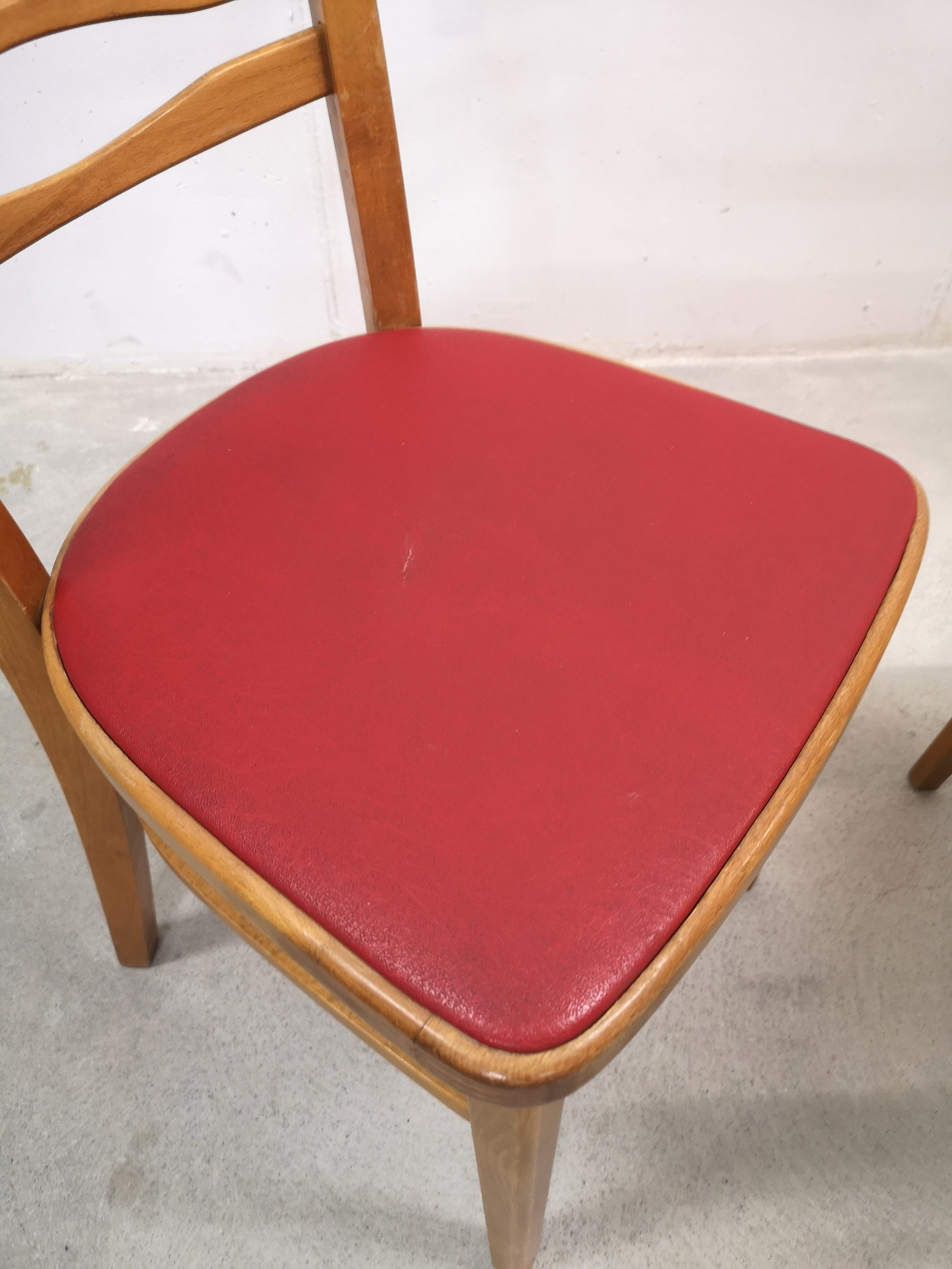 Le placet rouge est en similicuir. Pour une des chaises, il y a une petite coupure (voir photo).