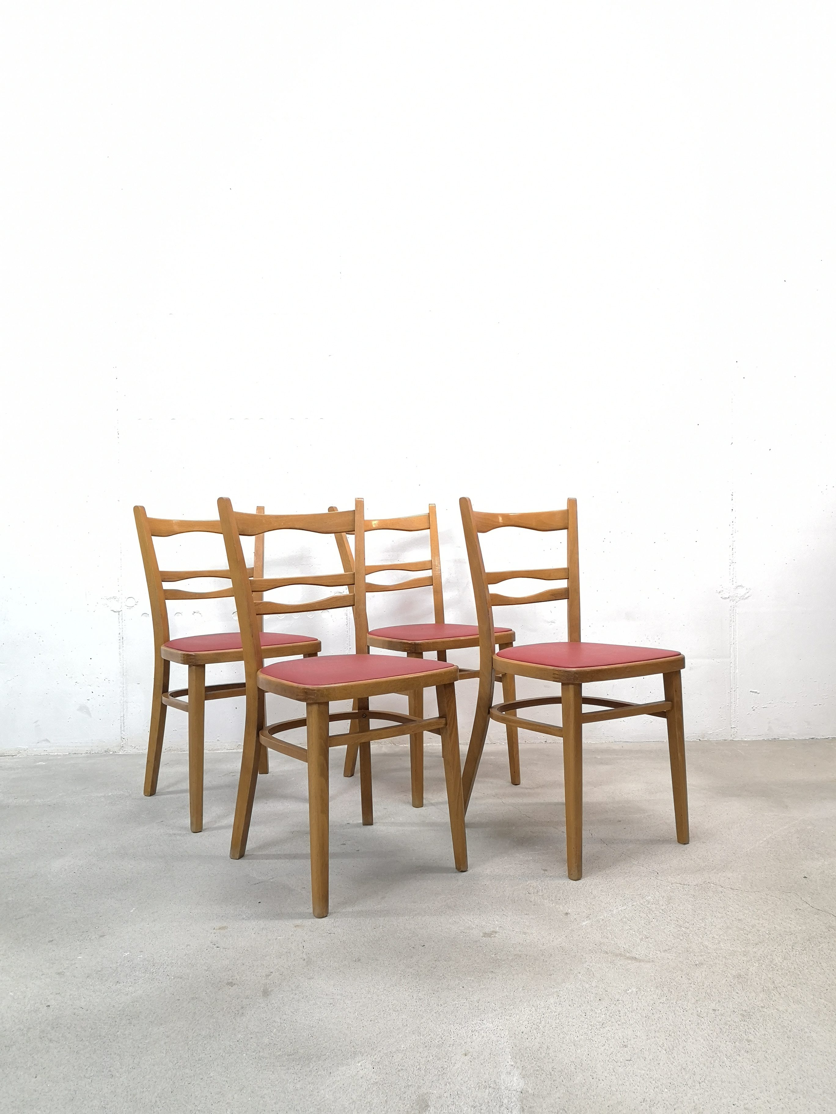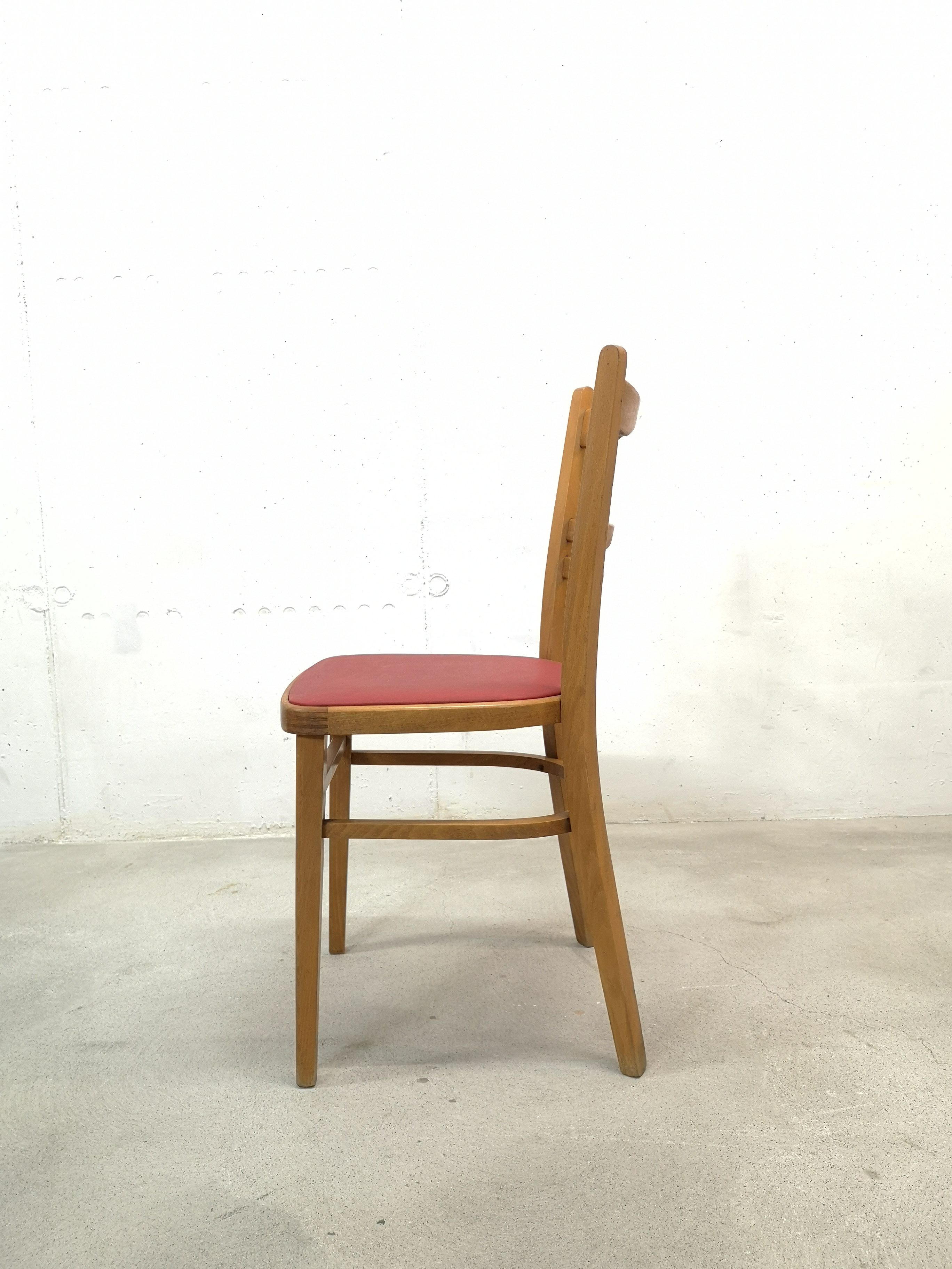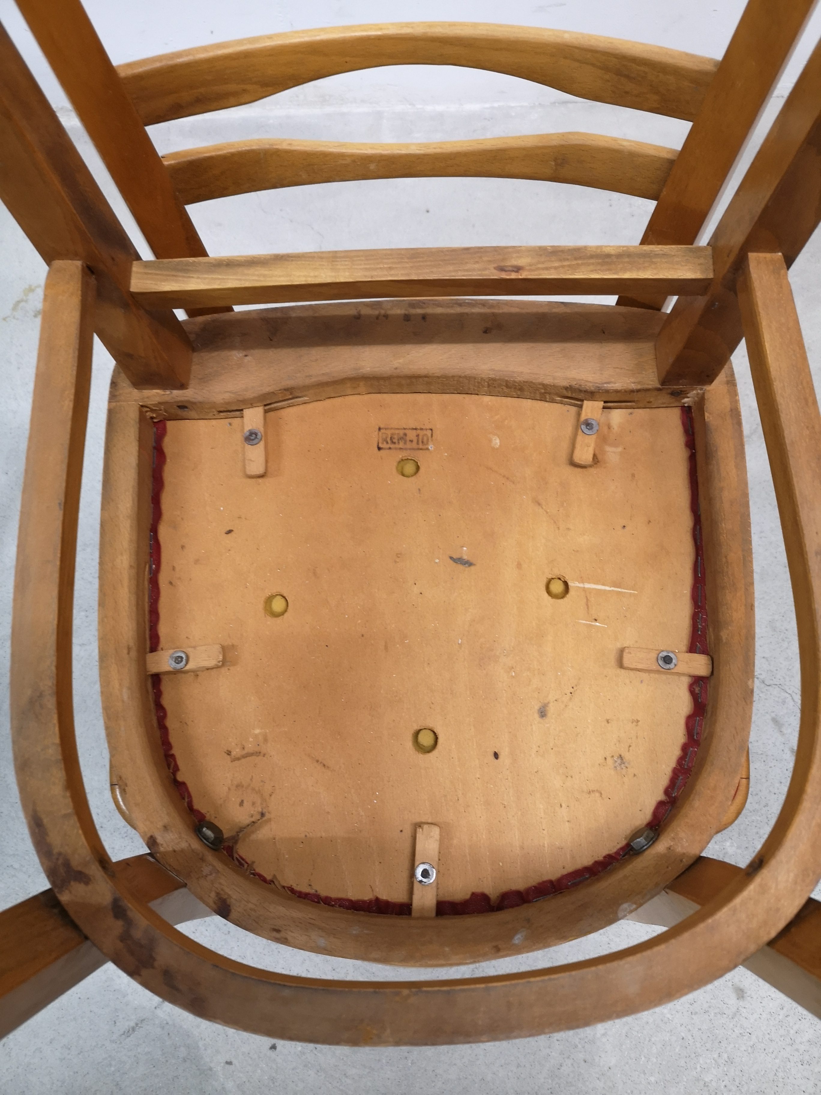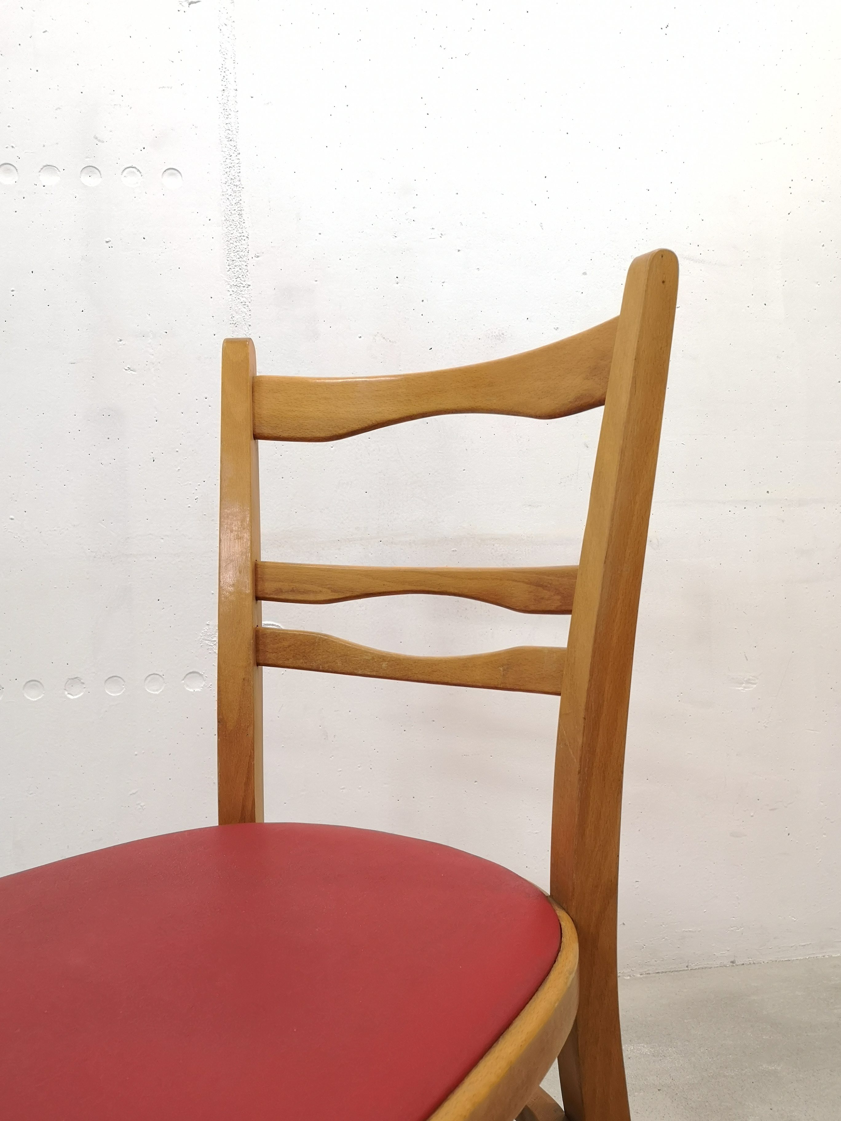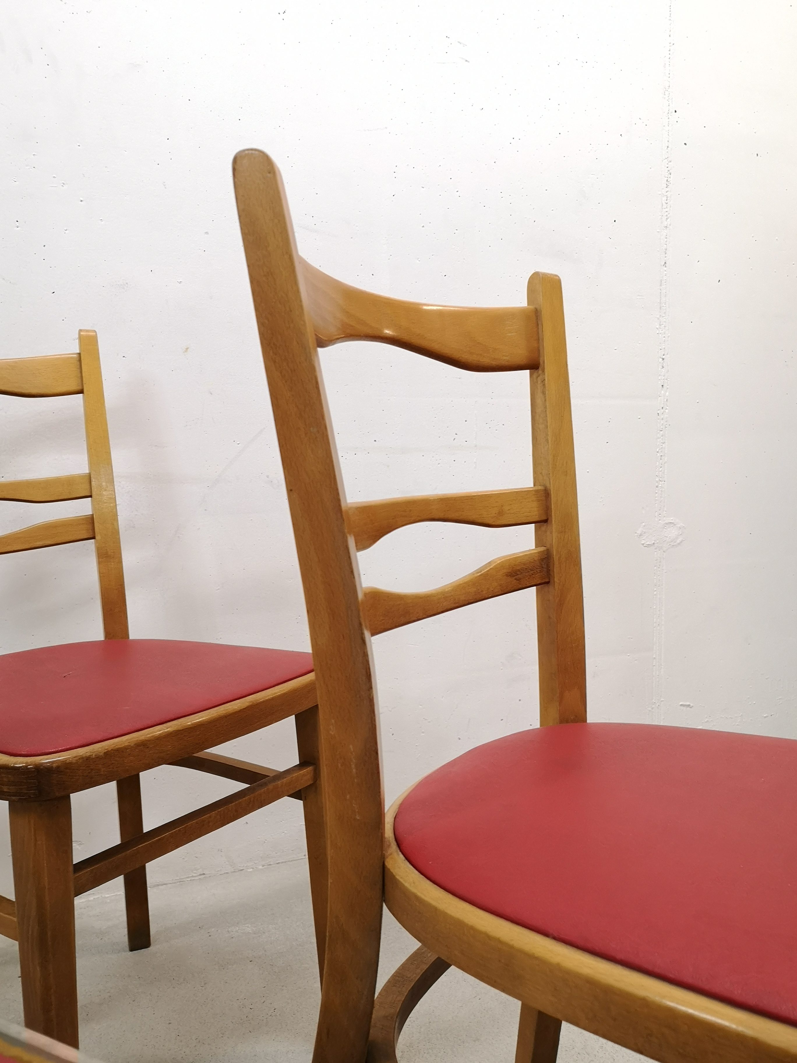 Le placet rouge est en similicuir. Pour une des chaises, il y a une petite coupure (voir photo).