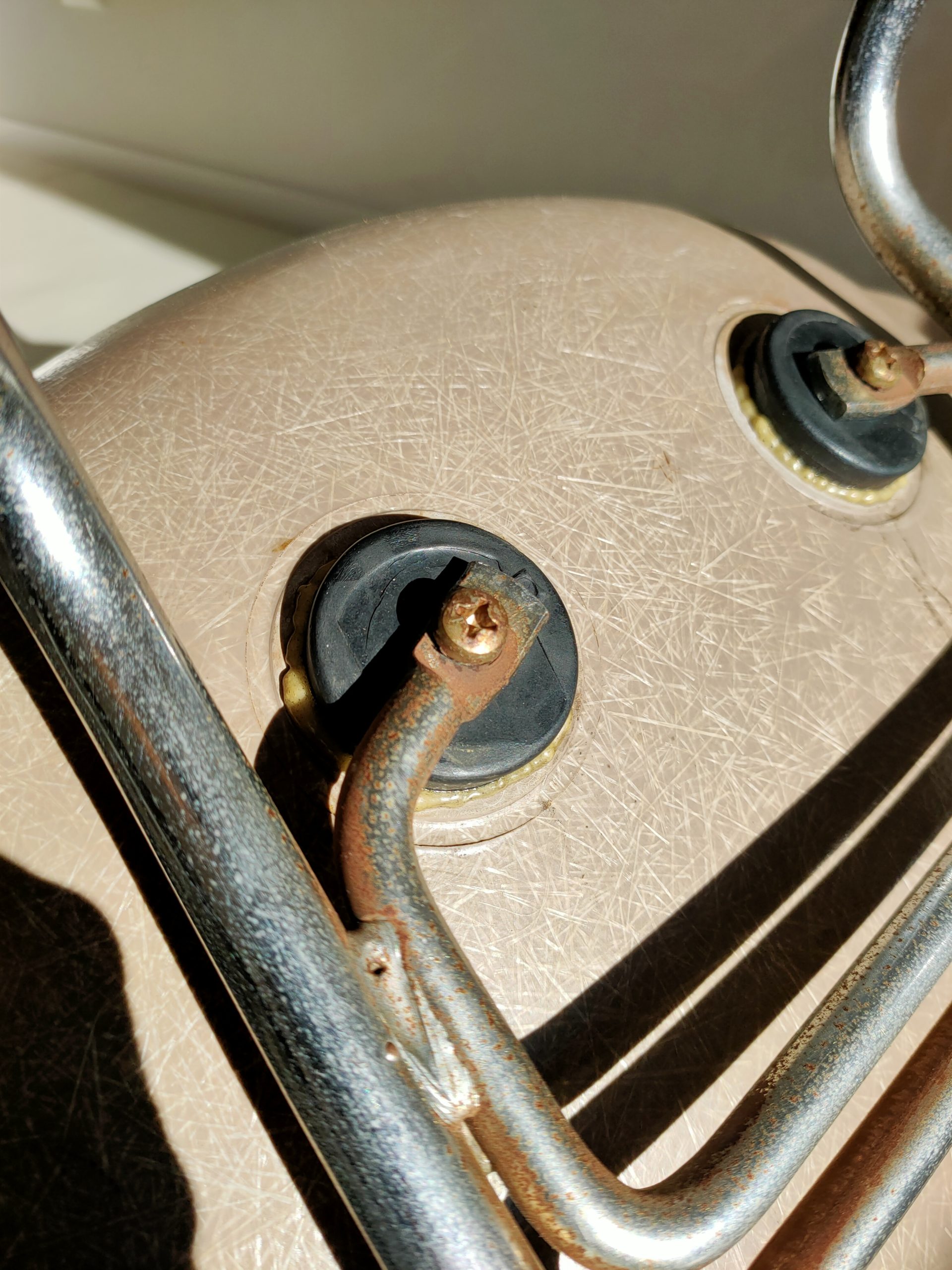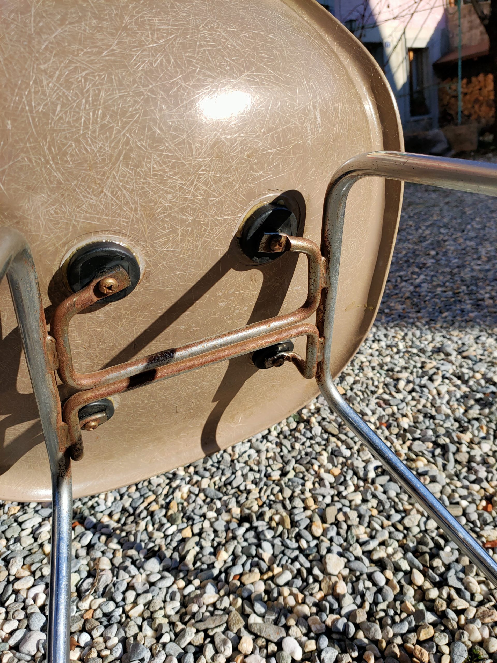 Pas de fissures, shockmounts en bon état, piétements métalliques un peu rouillés sous l’assise (voir photos).