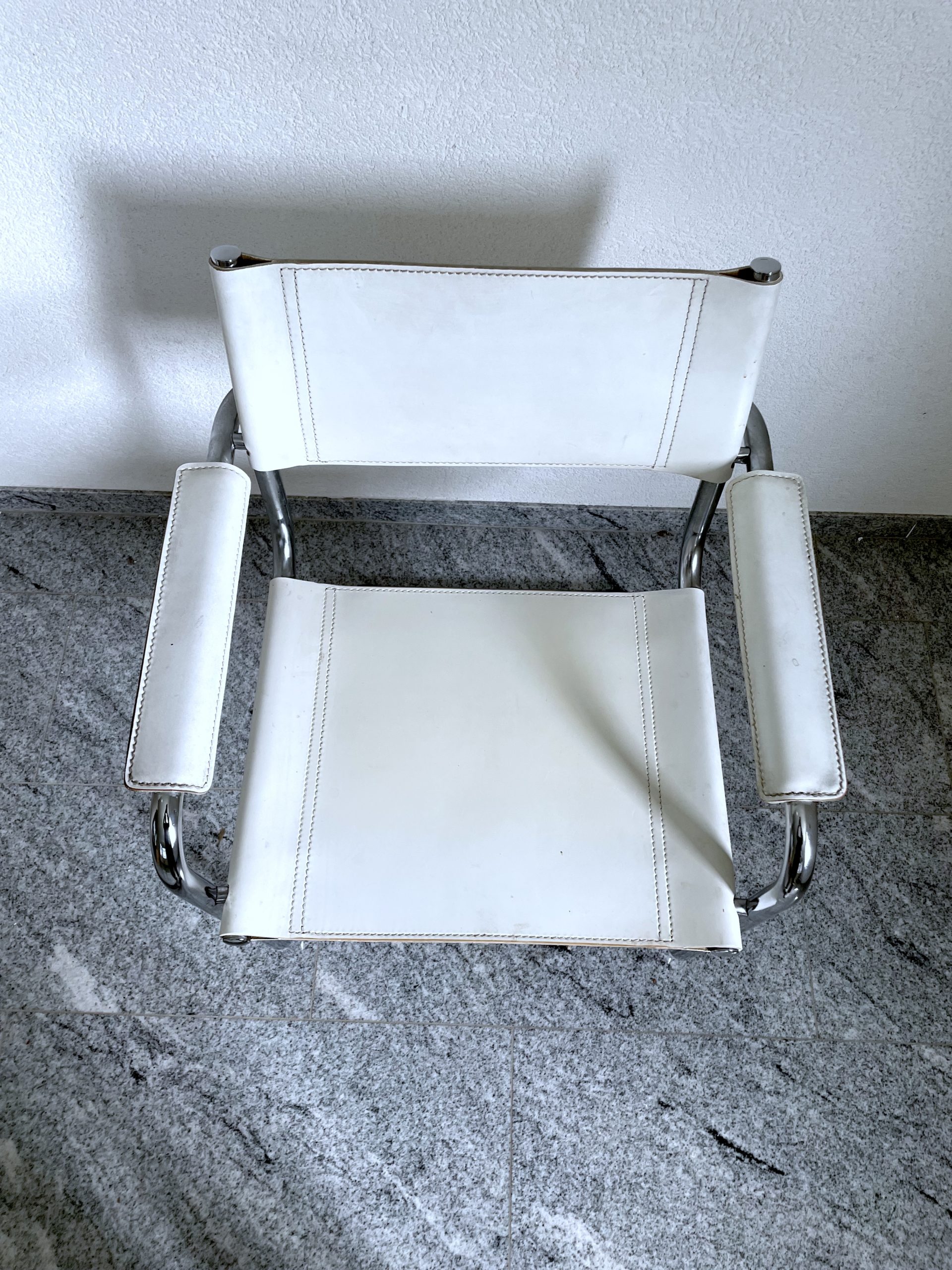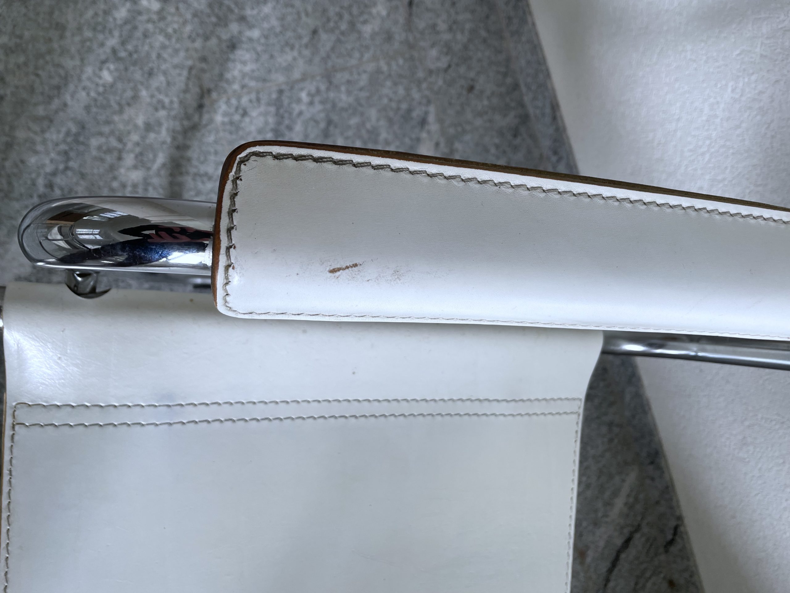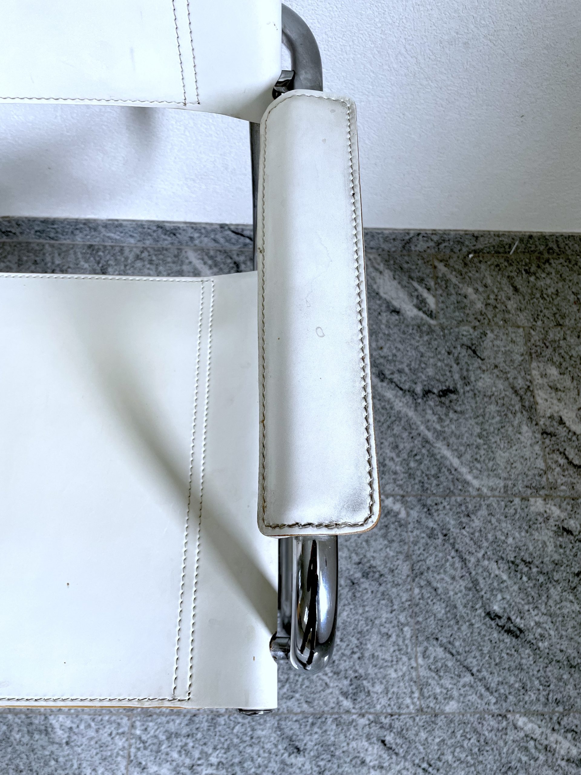Produit venduLot de 4 chaises en métal tubulaire chromé, assises, dossiers et accoudoirs en cuir blanc surpiqué.