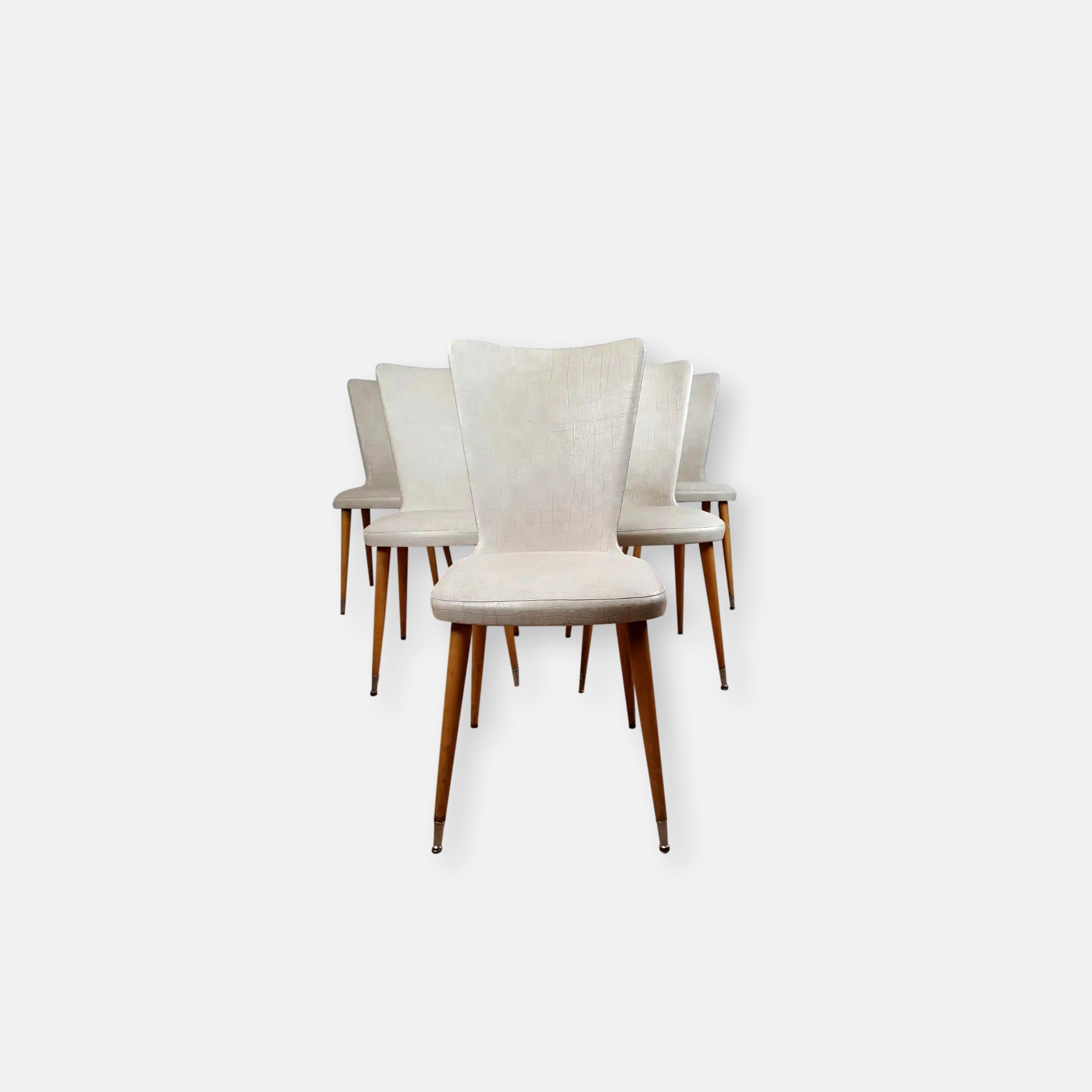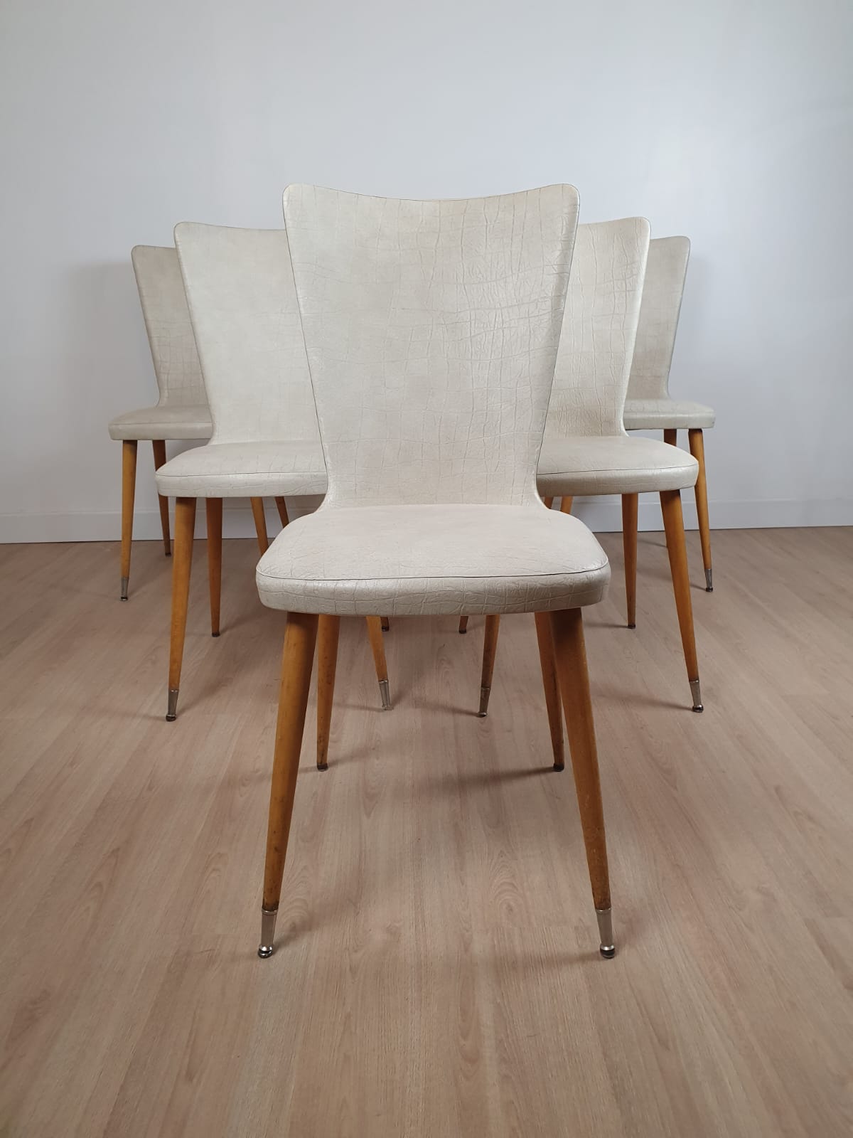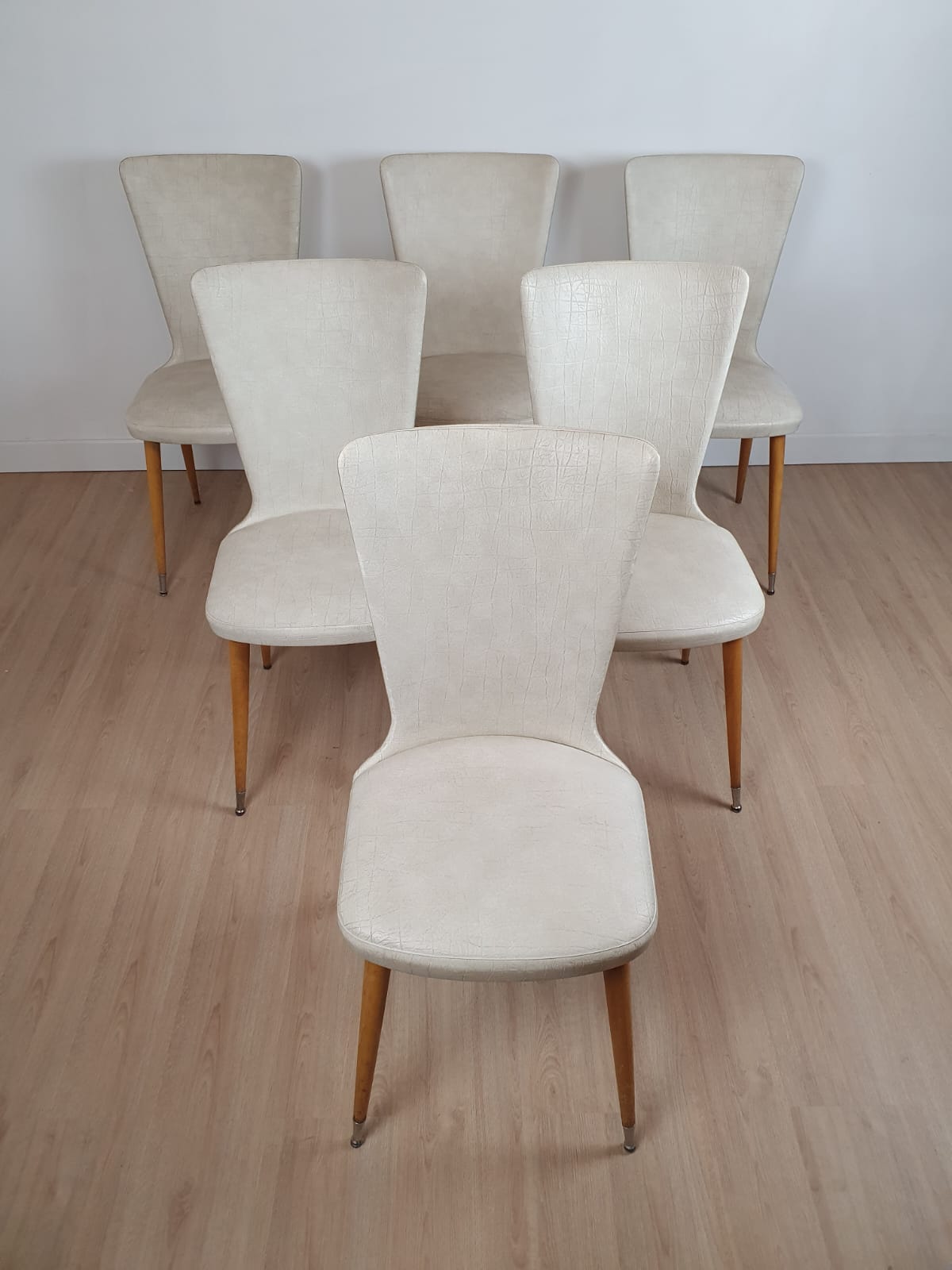 Produit venduLot de 6 chaises simili cuir imitation croco crème, pieds compas avec détail sur les pied avant en chromé.