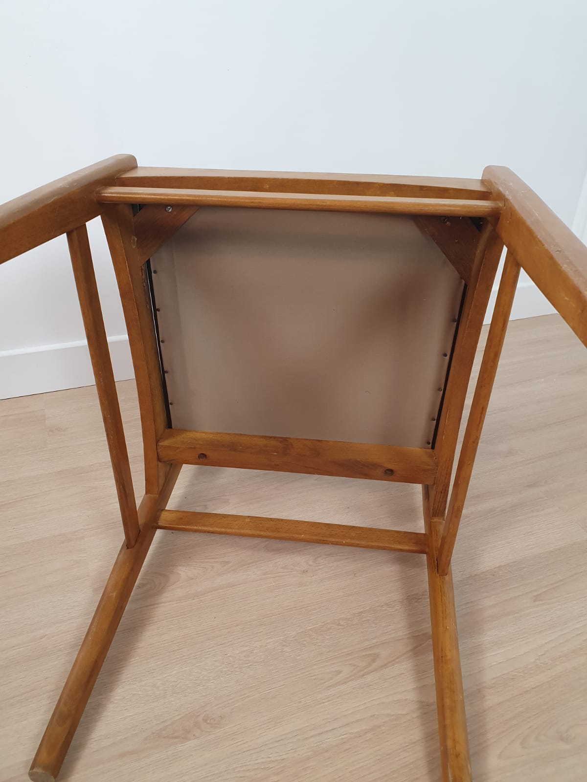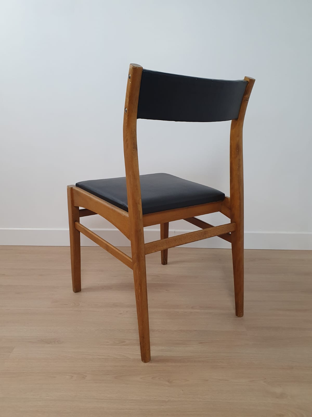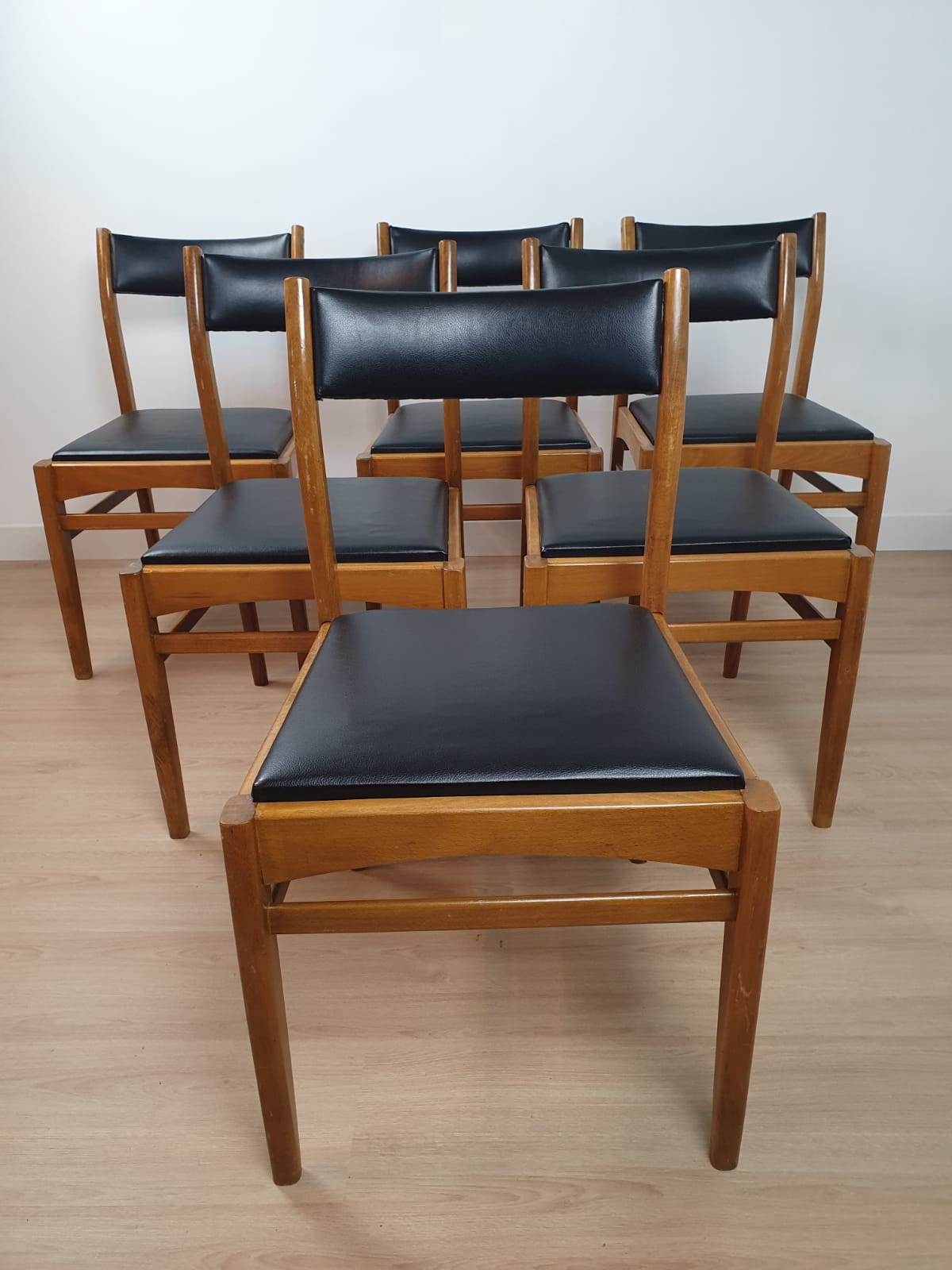 Produit venduLot de 6 chaises des années 60 avec structure en bois et assise en skaï.