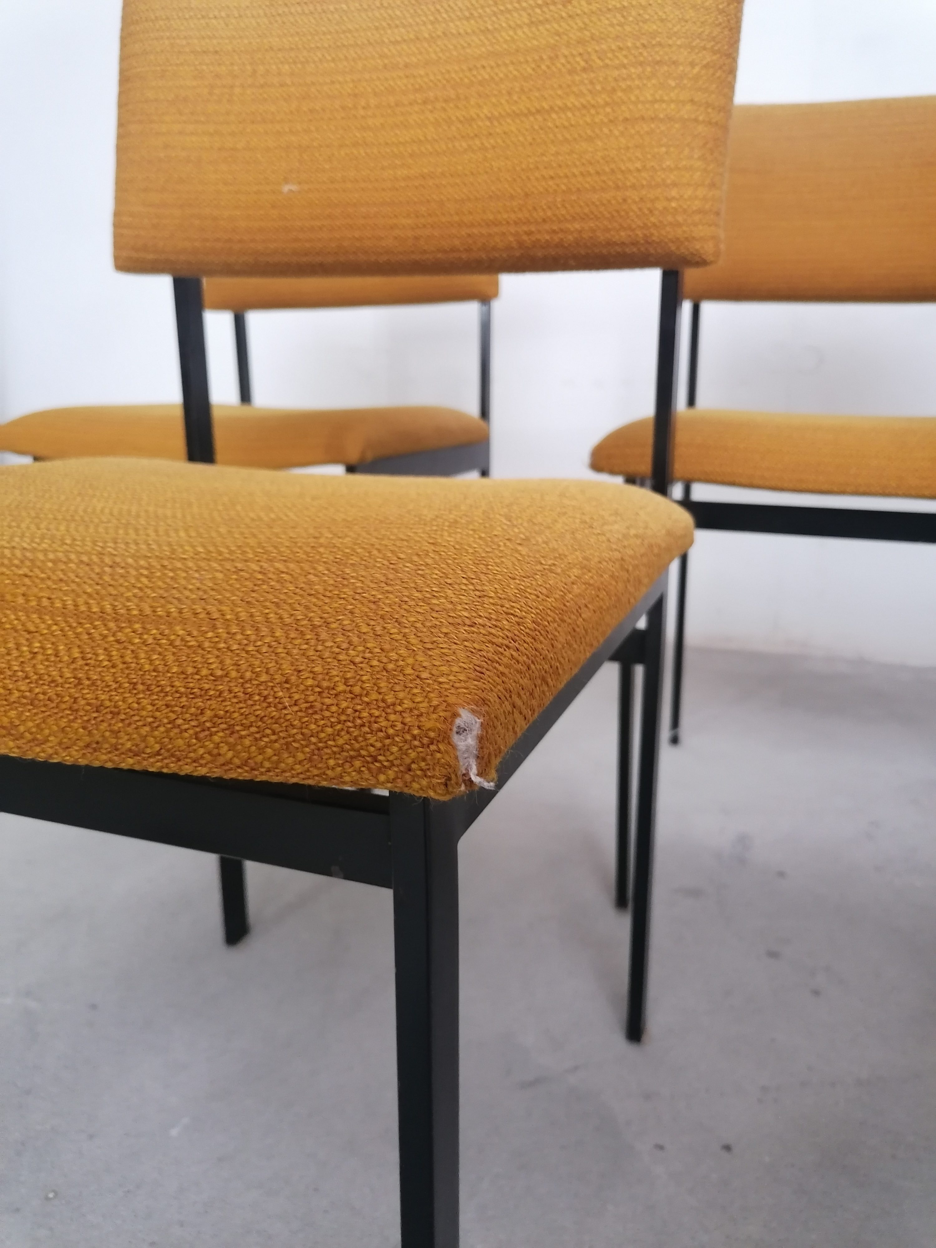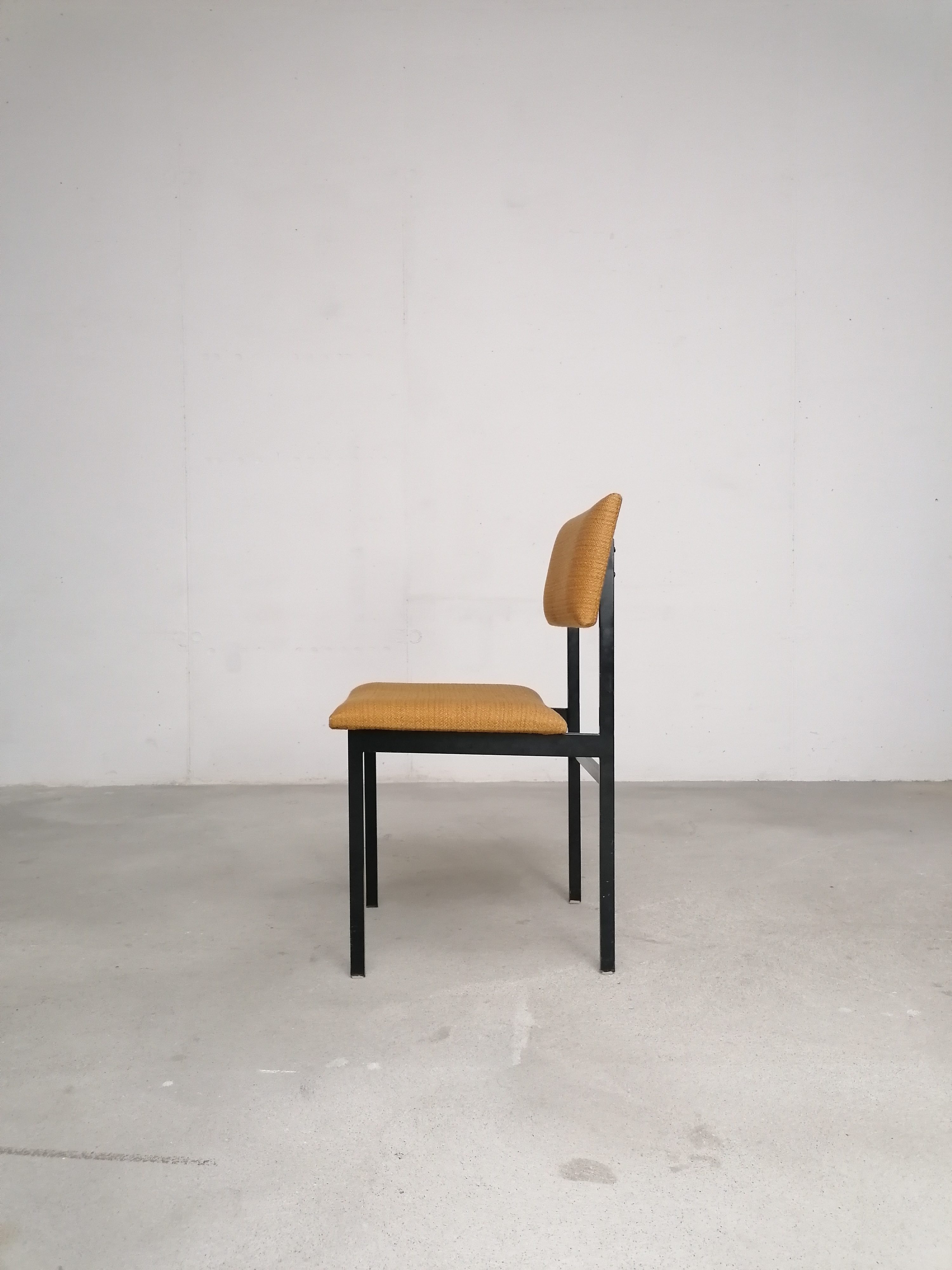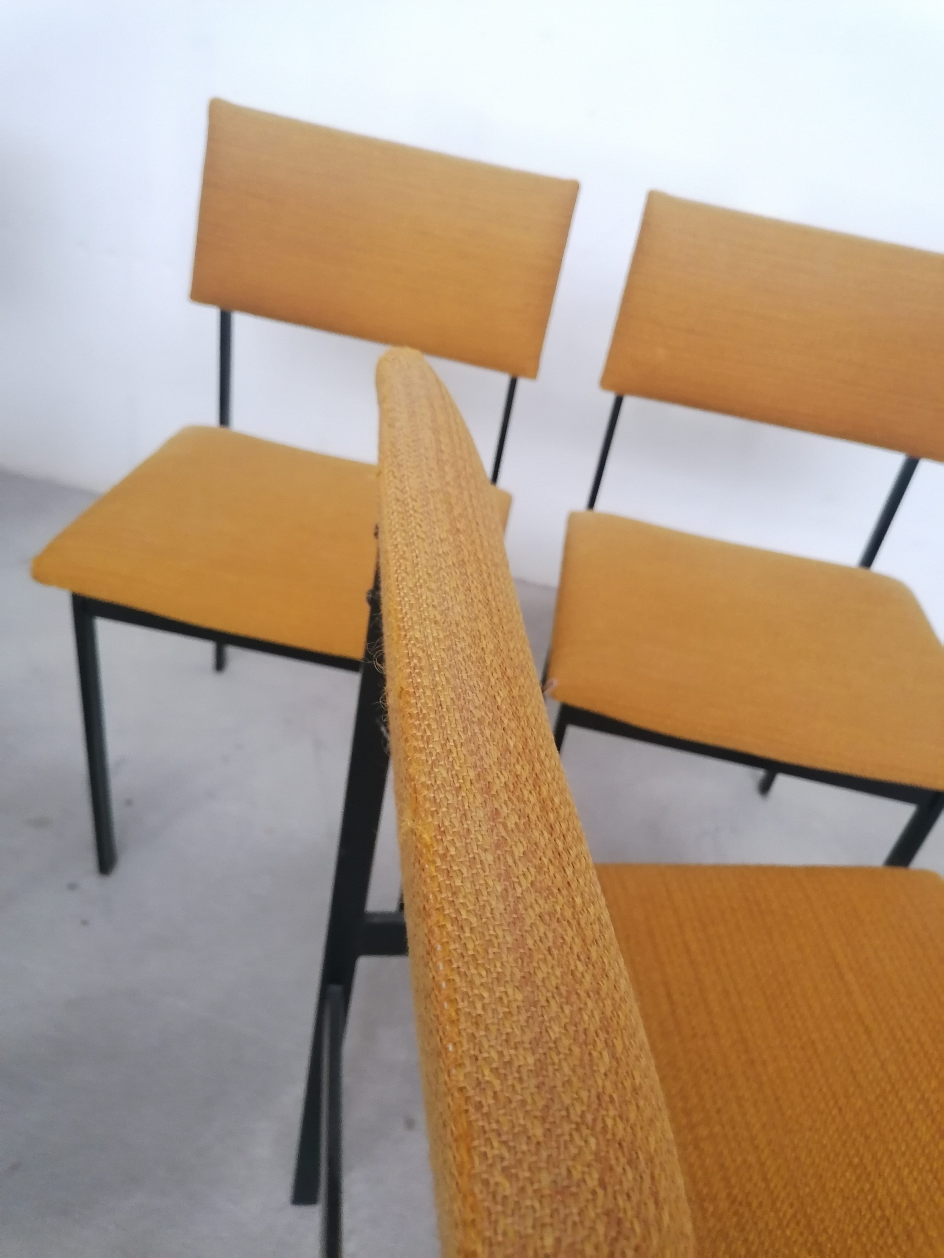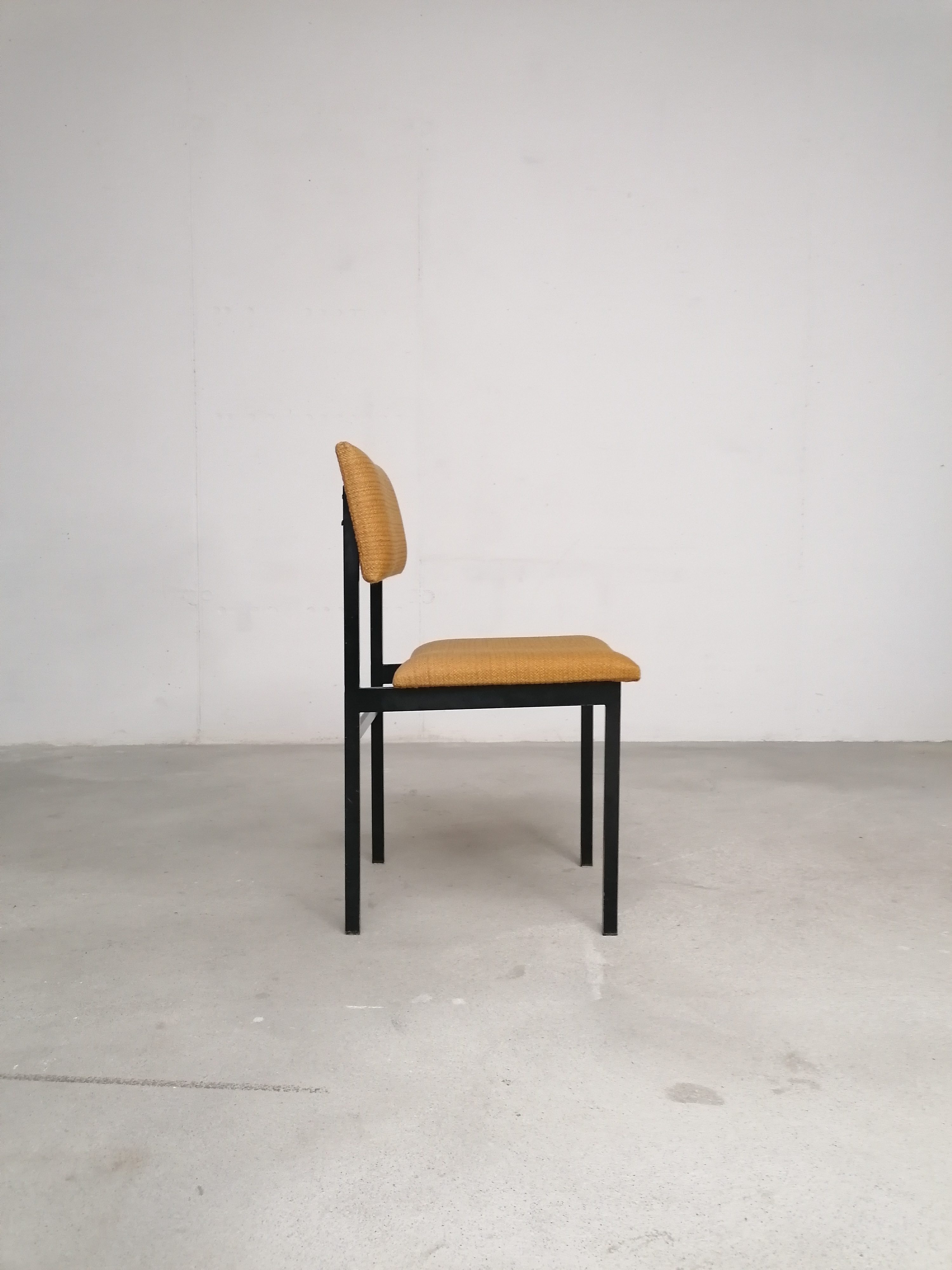 Lot de 6 chaises avec structure en métal et assise en mousse et tissu de couleur moutarde.