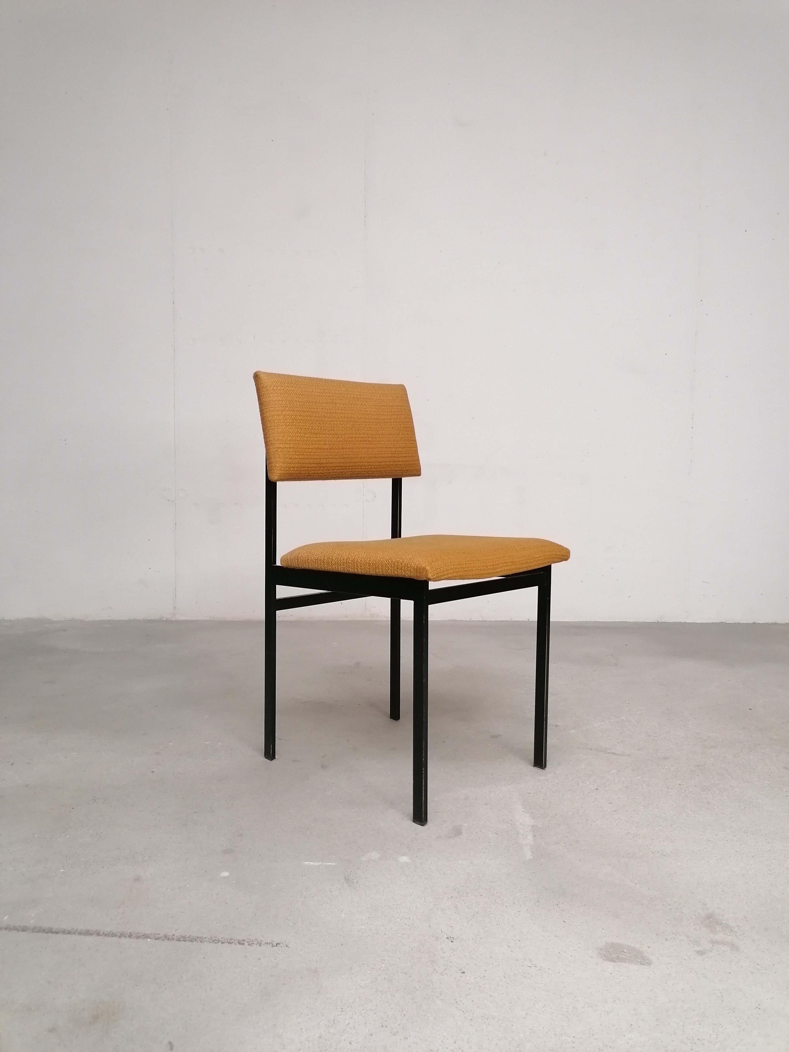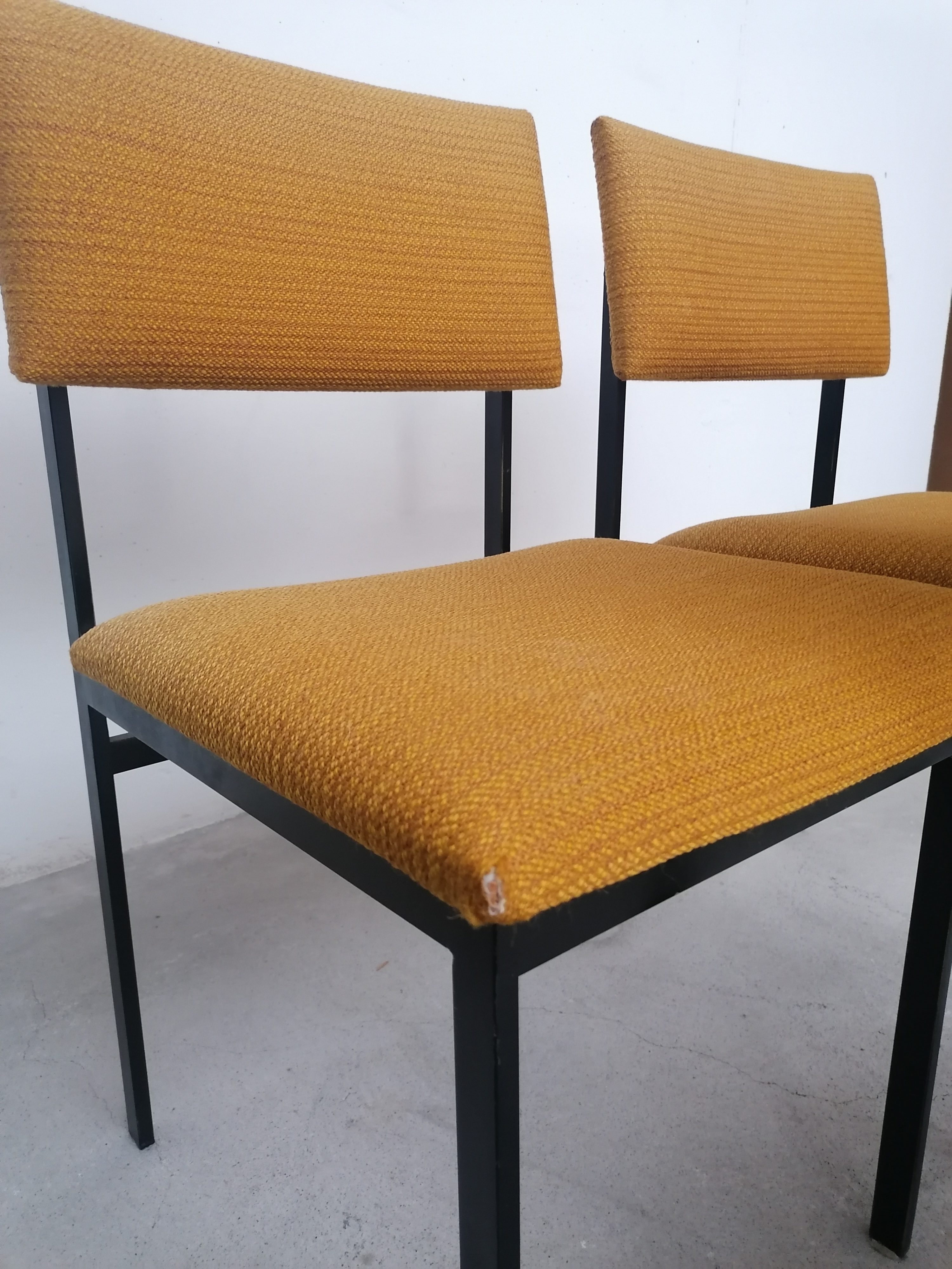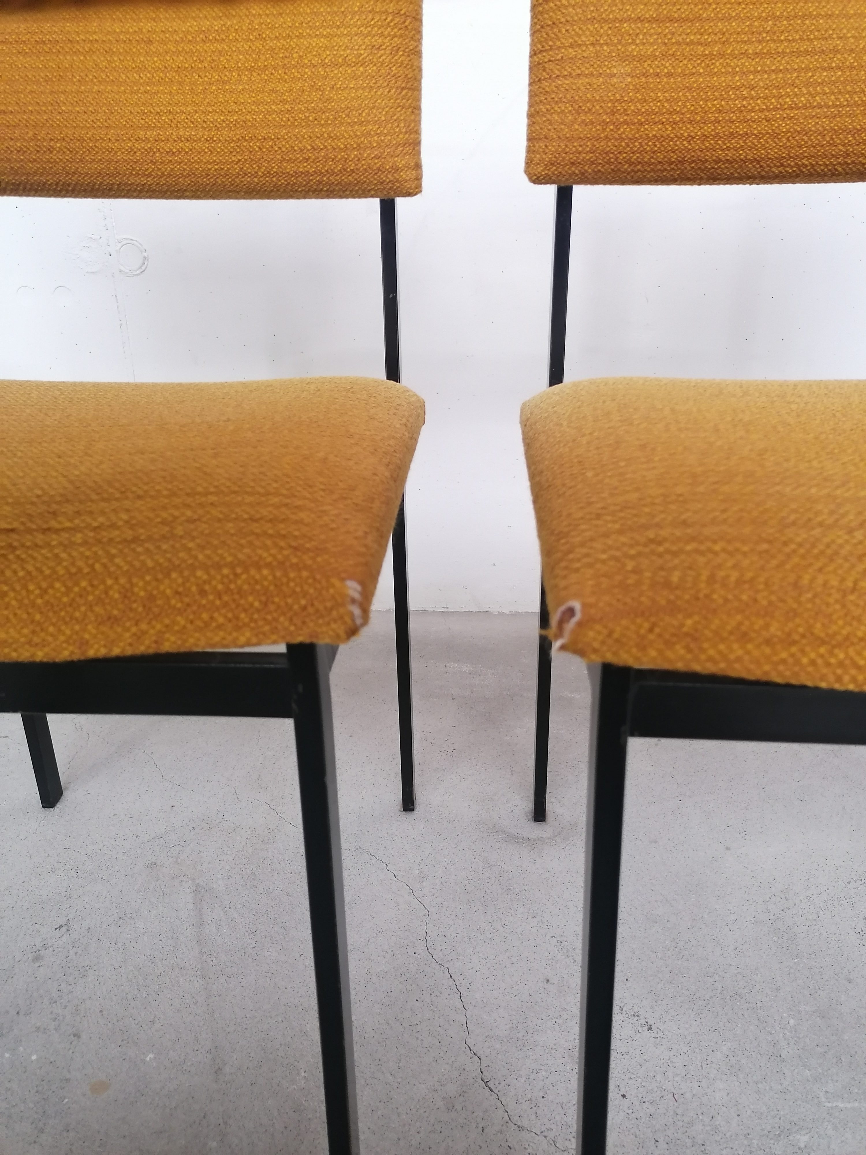 Lot de 6 chaises avec structure en métal et assise en mousse et tissu de couleur moutarde.