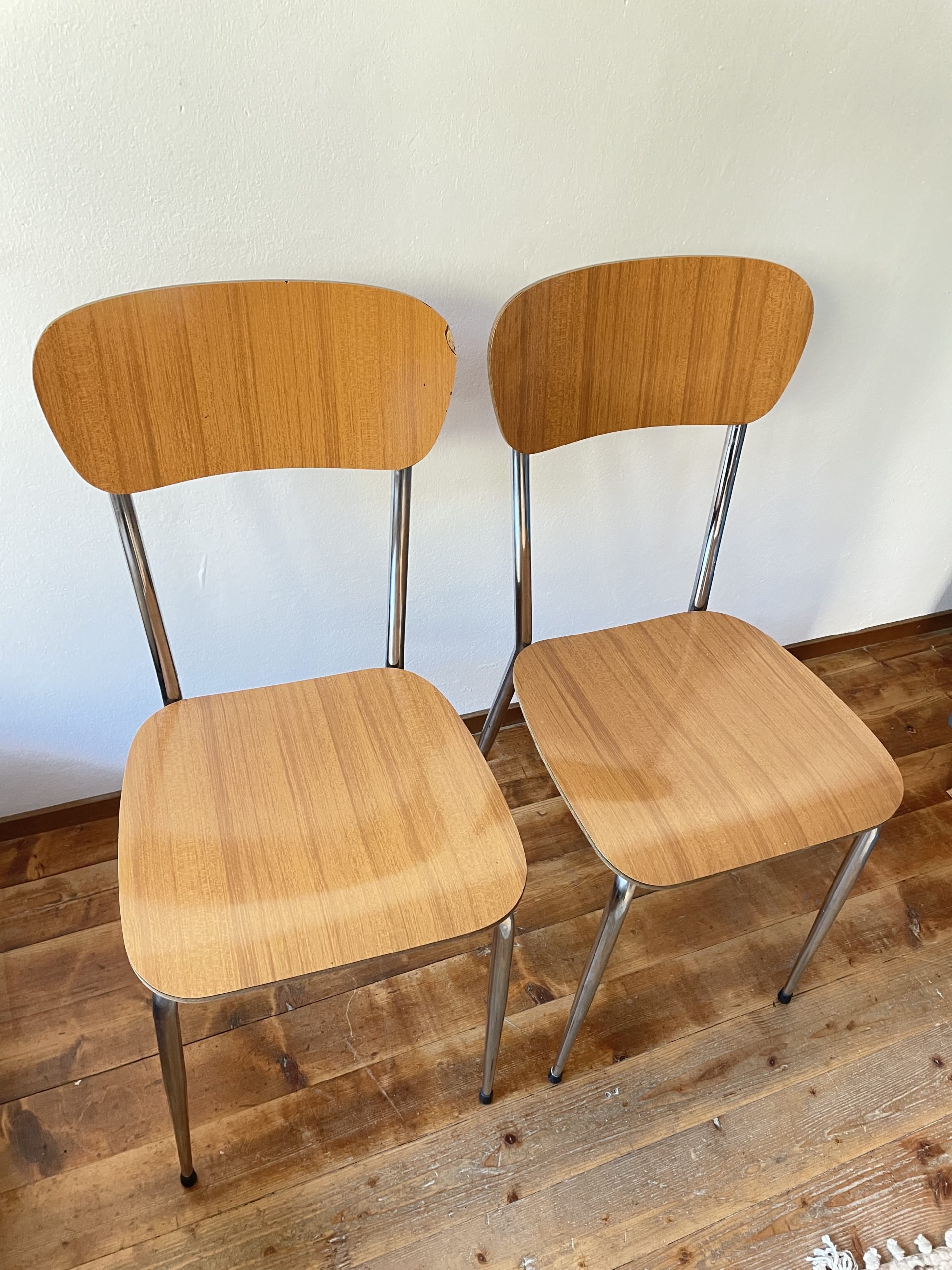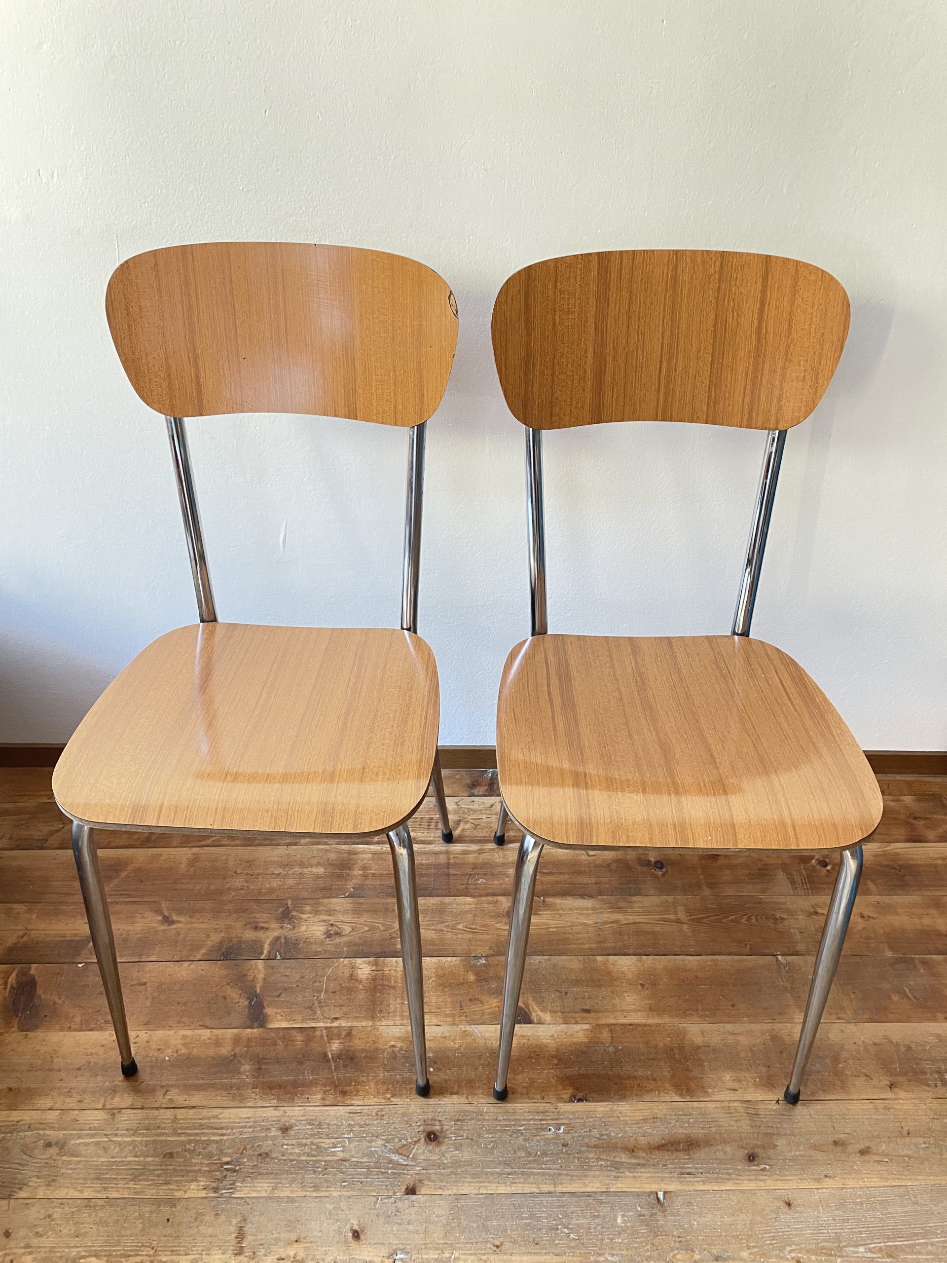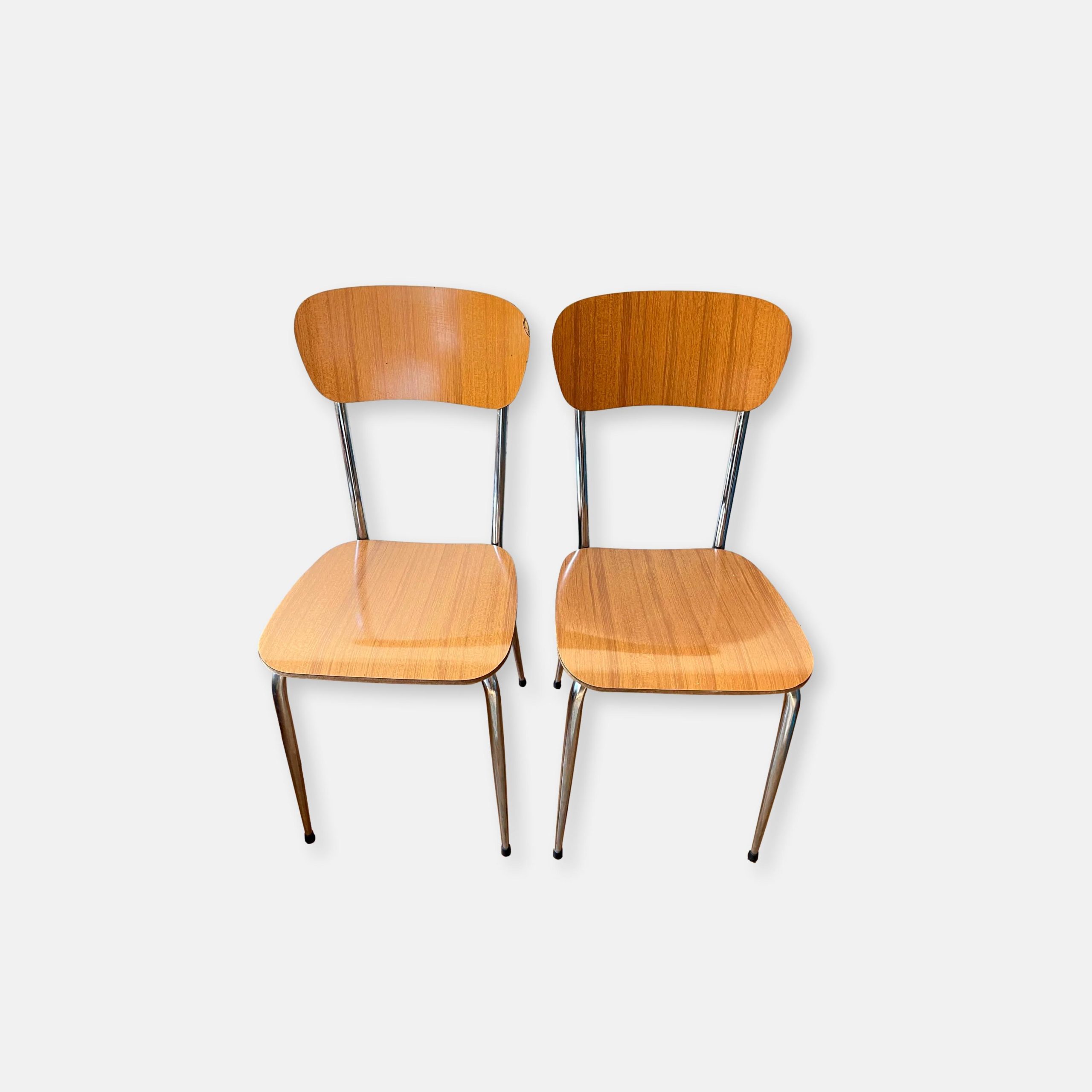 Produit venduPaire de chaises en formica de couleur marron clair, avec sa structure en métal argenté.
